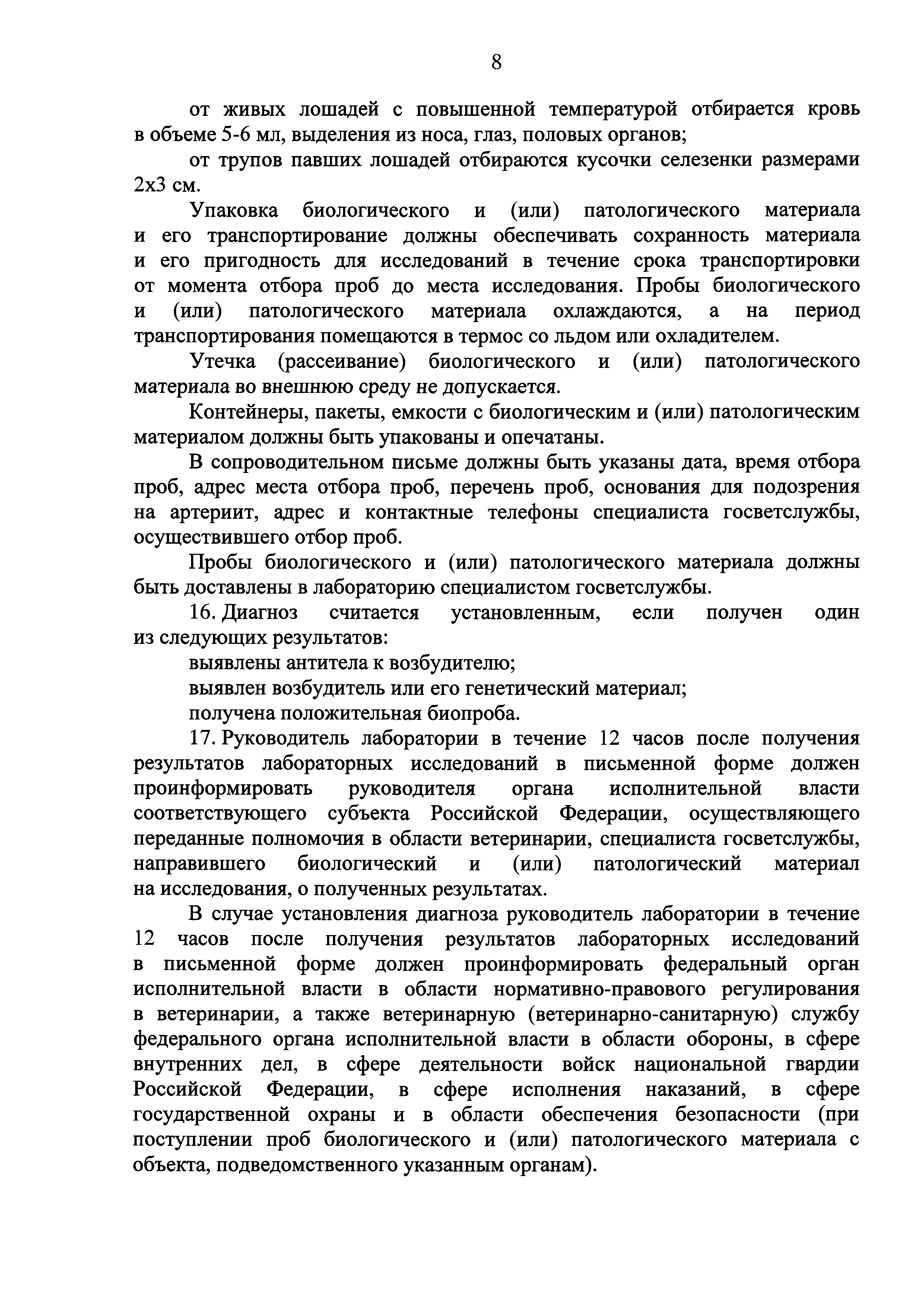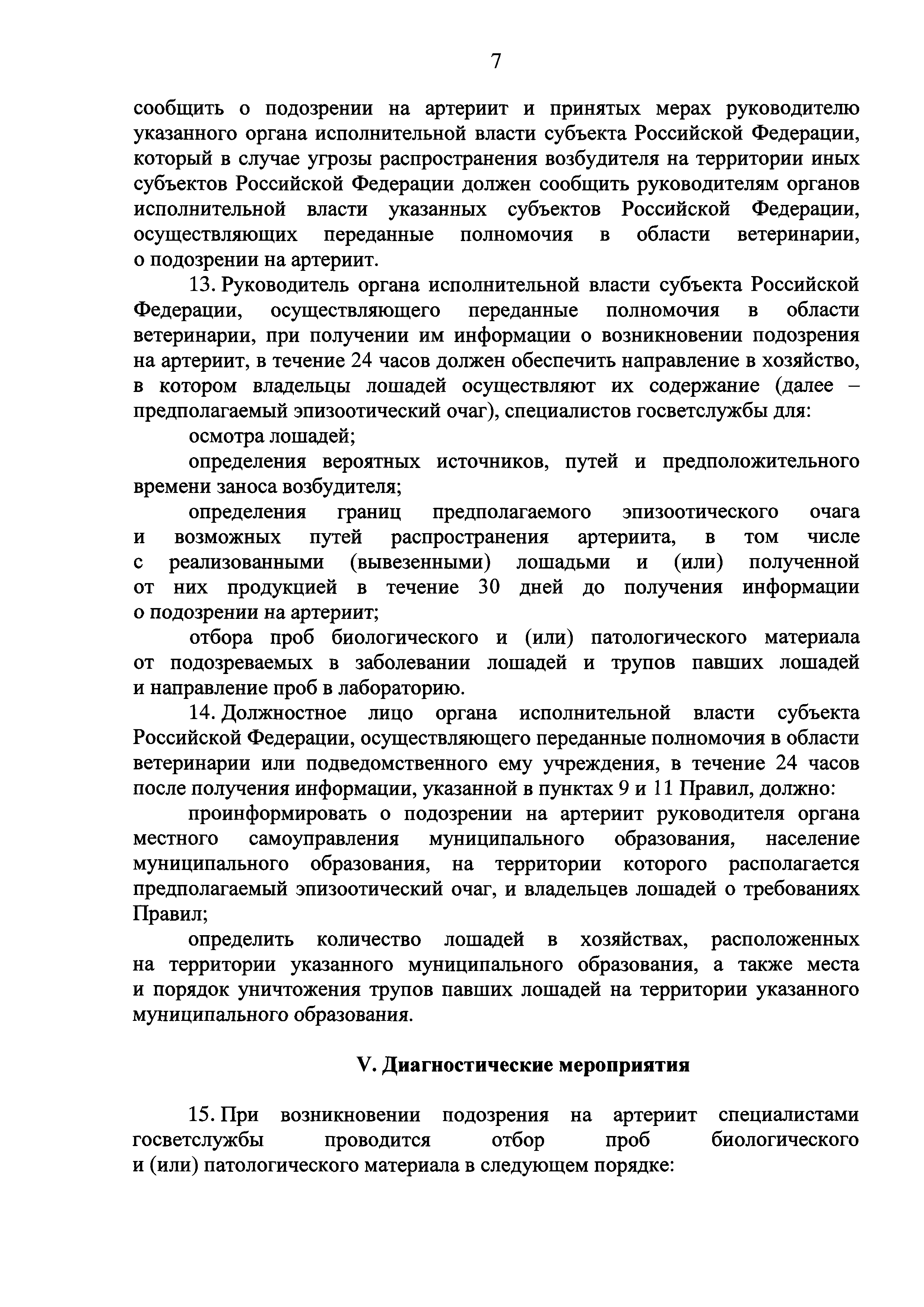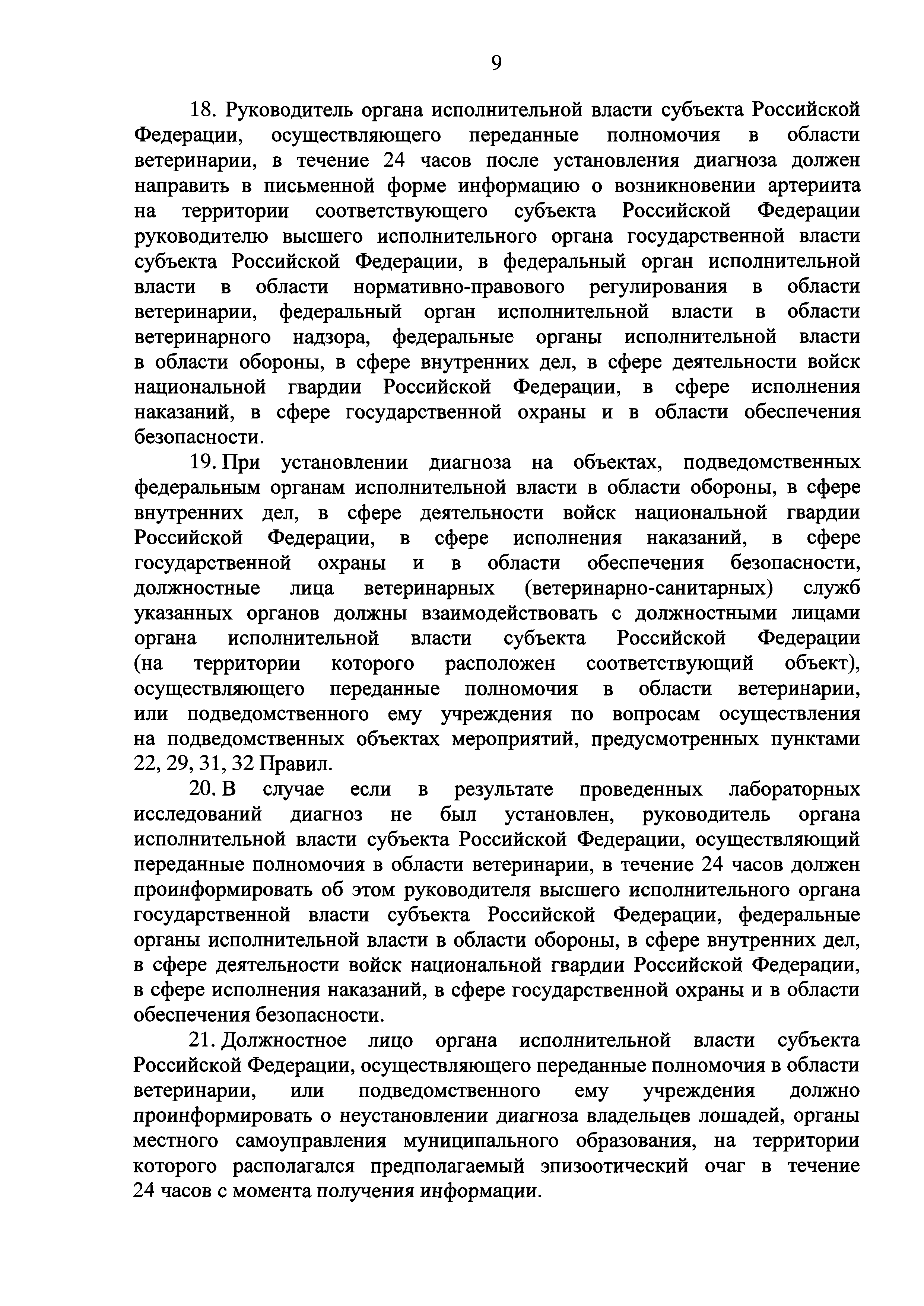 Ветеринарные правила осуществления профилактических, диагностических, ограничительных и иных мероприятий, установления и отмены карантина и иных ограничений, направленных на предотвращение распространения и ликвидацию очагов вирусного артериита лошадей| Статус: | действует | | Название рус.: | Ветеринарные правила осуществления профилактических, диагностических, ограничительных и иных мероприятий, установления и отмены карантина и иных ограничений, направленных на предотвращение распространения и ликвидацию очагов вирусного артериита лошадей | | Дата добавления в базу: | 01.01.2019 | | Дата актуализации: | 01.01.2021 | | Дата введения: | 20.01.2018 | | Область применения: | Ветеринарные правила устанавливают обязательные для исполнения требования к осуществлению профилактических, диагностических, ограничительных и иных мероприятий, установлению и отмене на территории Российской Федерации карантина и иных ограничений, направленных на предотвращение распространения и ликвидацию очагов вирусного артериита лошадей. | | Оглавление: | I. Область применения II. Общая характеристика артериита III. Профилактические мероприятия IV. Мероприятия при подозрении на артериит V. Диагностические мероприятия VI. Установление карантина, ограничительные и иные мероприятия, направленные на ликвидацию очагов артериита, а также на предотвращение его распространения VII. Отмена карантина | | Утверждён: | 07.12.2017 Министерство сельского хозяйства Российской Федерации (613)