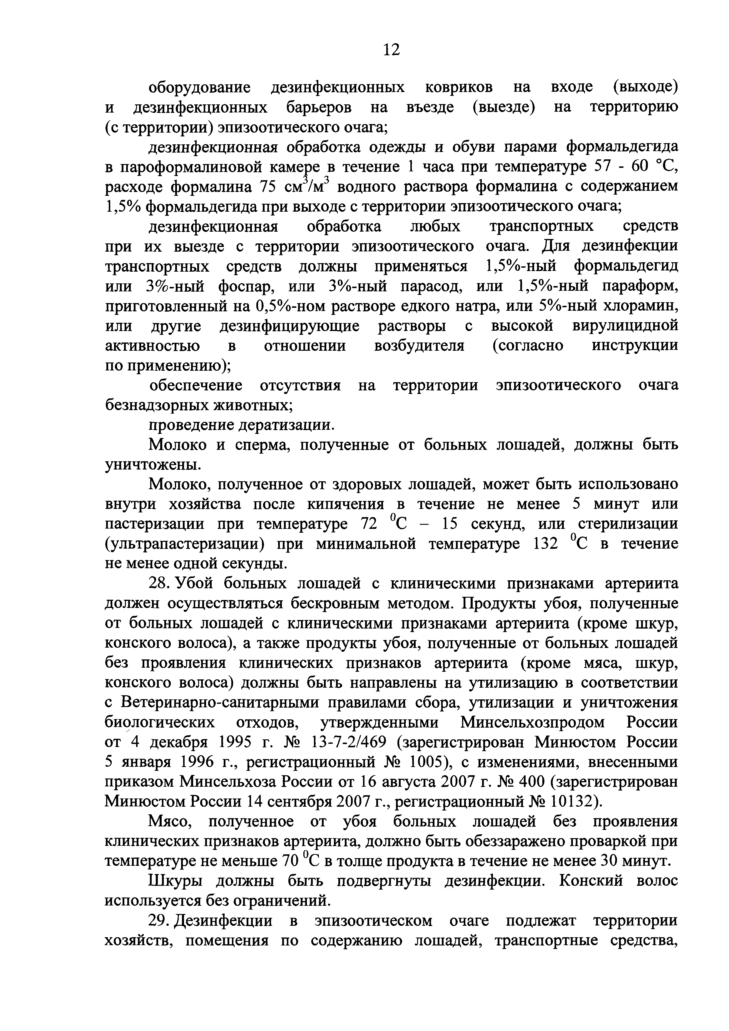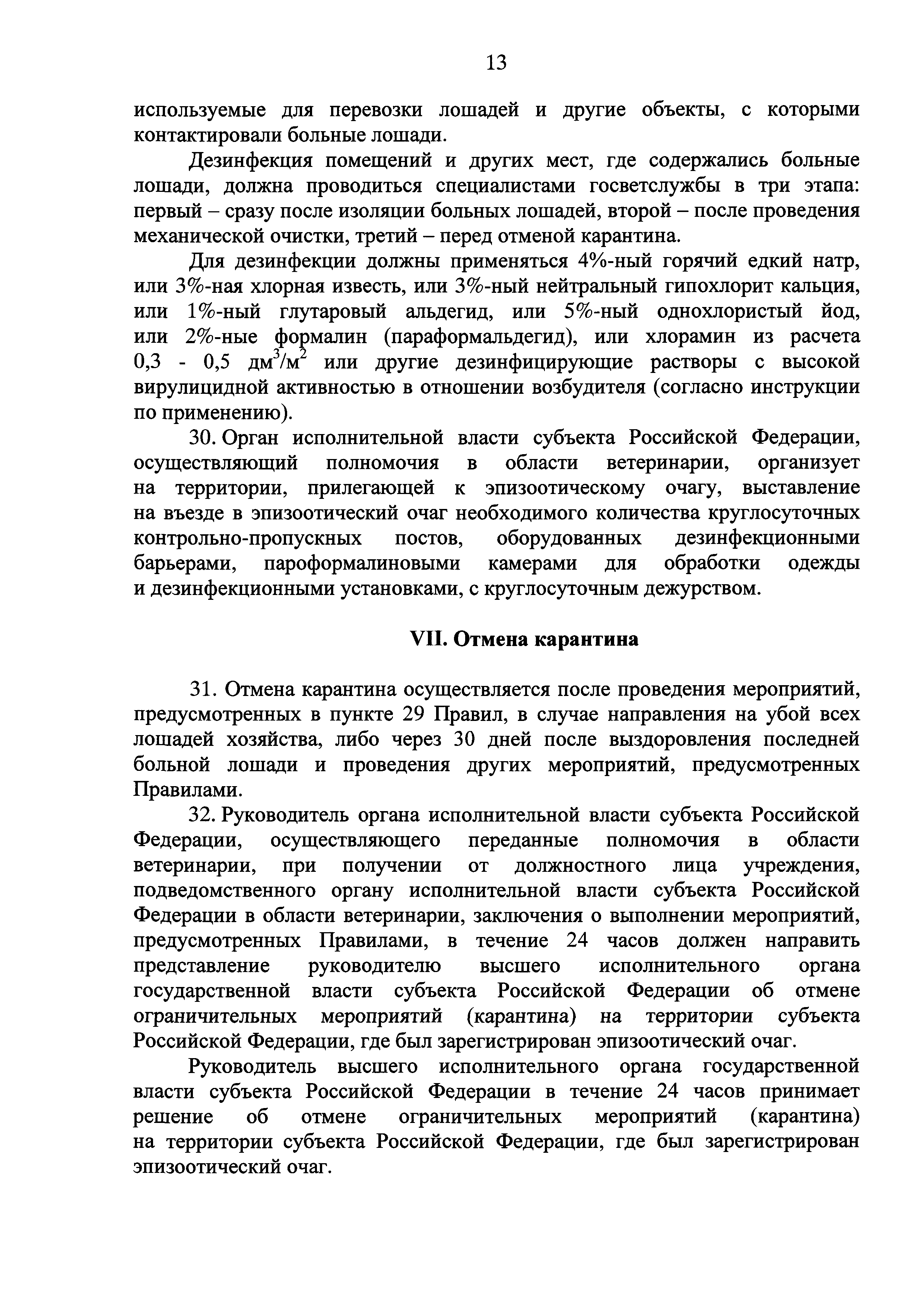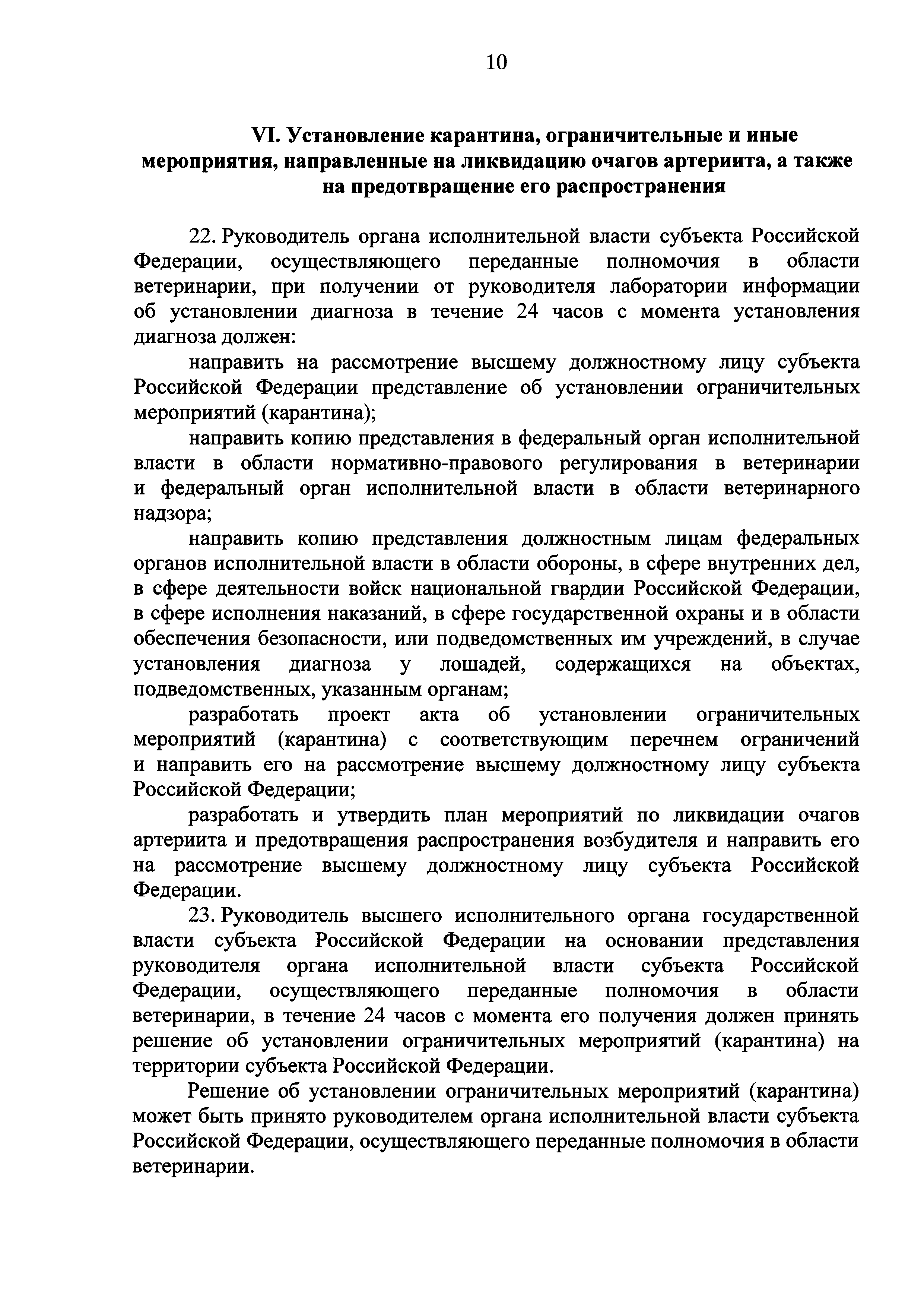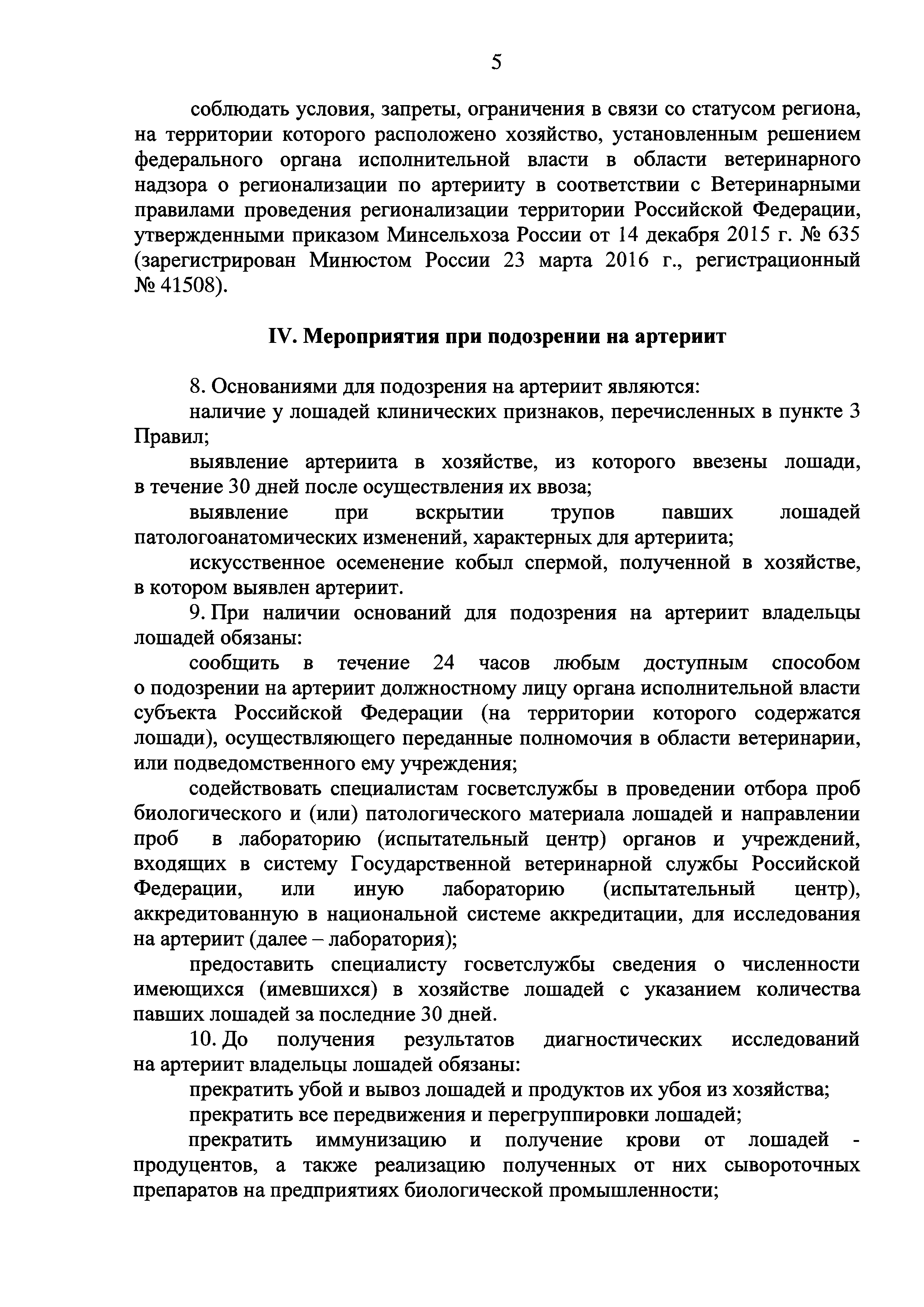 Ветеринарные правила осуществления профилактических, диагностических, ограничительных и иных мероприятий, установления и отмены карантина и иных ограничений, направленных на предотвращение распространения и ликвидацию очагов вирусного артериита лошадей| Статус: | действует | | Название рус.: | Ветеринарные правила осуществления профилактических, диагностических, ограничительных и иных мероприятий, установления и отмены карантина и иных ограничений, направленных на предотвращение распространения и ликвидацию очагов вирусного артериита лошадей | | Дата добавления в базу: | 01.01.2019 | | Дата актуализации: | 01.01.2021 | | Дата введения: | 20.01.2018 | | Область применения: | Ветеринарные правила устанавливают обязательные для исполнения требования к осуществлению профилактических, диагностических, ограничительных и иных мероприятий, установлению и отмене на территории Российской Федерации карантина и иных ограничений, направленных на предотвращение распространения и ликвидацию очагов вирусного артериита лошадей. | | Оглавление: | I. Область применения II. Общая характеристика артериита III. Профилактические мероприятия IV. Мероприятия при подозрении на артериит V. Диагностические мероприятия VI. Установление карантина, ограничительные и иные мероприятия, направленные на ликвидацию очагов артериита, а также на предотвращение его распространения VII. Отмена карантина | | Утверждён: | 07.12.2017 Министерство сельского хозяйства Российской Федерации (613)