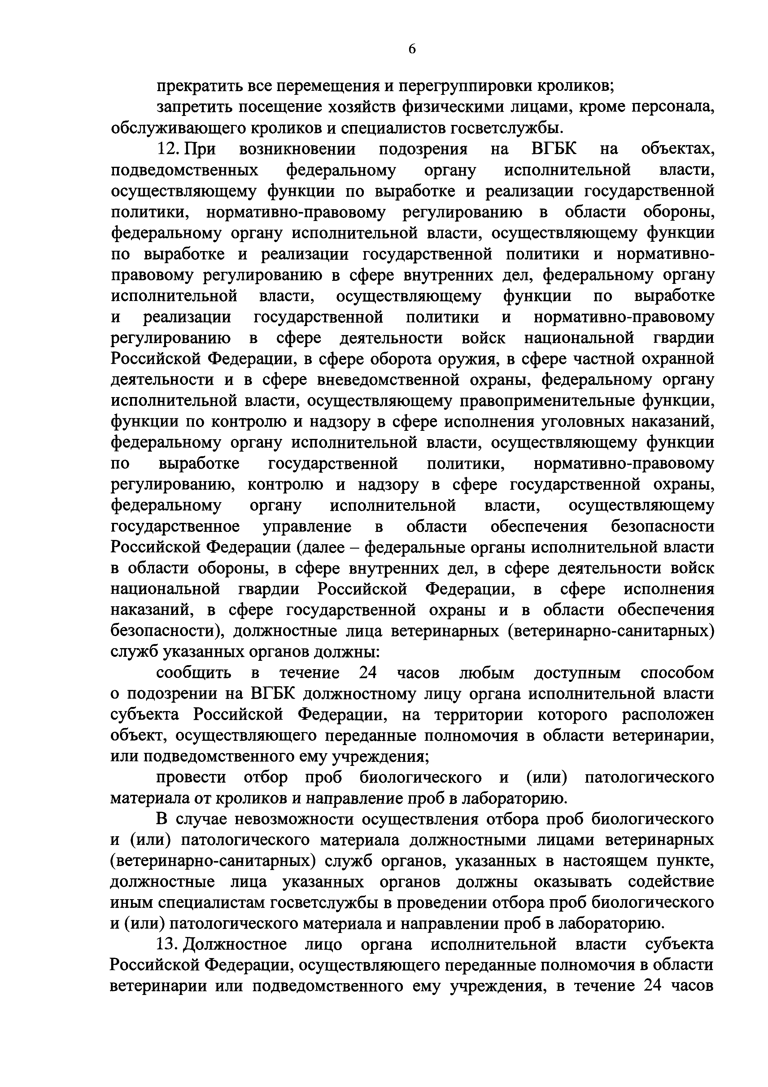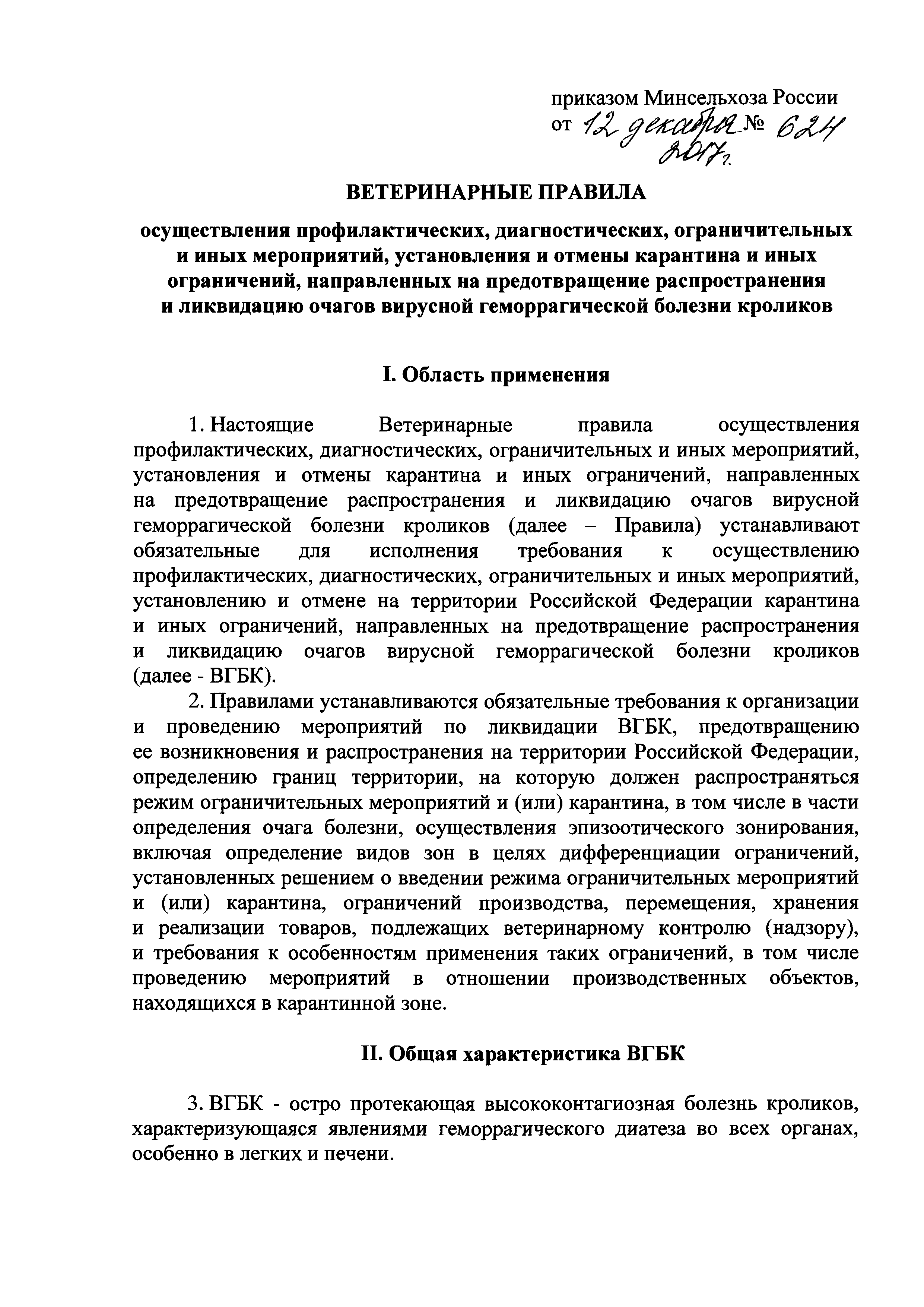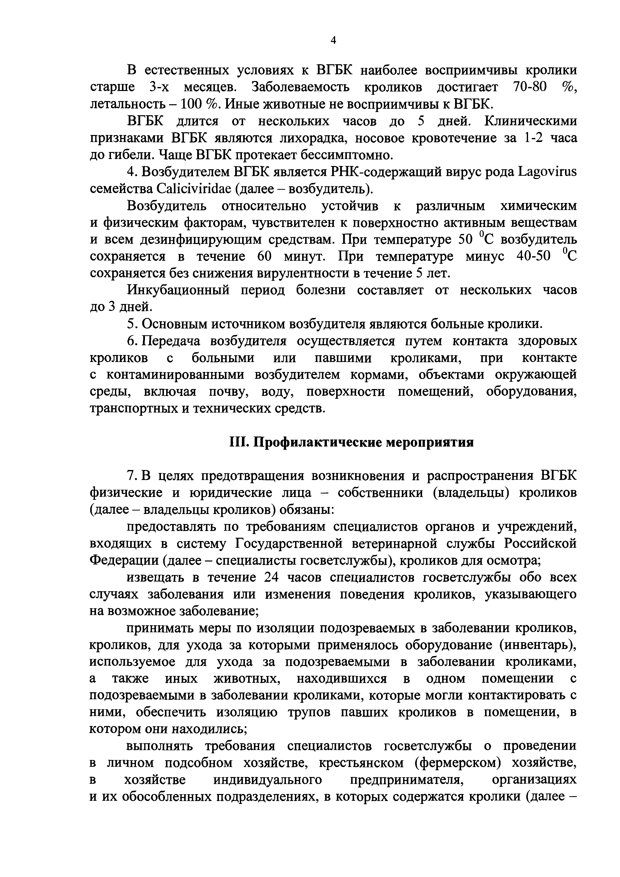 Ветеринарные правила осуществления профилактических, диагностических, ограничительных и иных мероприятий, установления и отмены карантина и иных ограничений, направленных на предотвращение распространения и ликвидацию очагов вирусной геморрагической болезни кроликов| Статус: | действует | | Название рус.: | Ветеринарные правила осуществления профилактических, диагностических, ограничительных и иных мероприятий, установления и отмены карантина и иных ограничений, направленных на предотвращение распространения и ликвидацию очагов вирусной геморрагической болезни кроликов | | Дата добавления в базу: | 01.01.2019 | | Дата актуализации: | 01.01.2021 | | Дата введения: | 20.01.2018 | | Область применения: | Ветеринарные правила устанавливают обязательные для исполнения требования к осуществлению профилактических, диагностических, ограничительных и иных мероприятий, установлению и отмене на территории Российской Федерации карантина и иных ограничений, направленных на предотвращение распространения и ликвидацию очагов вирусной геморрагической болезни кроликов. | | Оглавление: | I. Область применения II. Общая характеристика ВГБК III. Профилактические мероприятия IV. Мероприятия при подозрении на ВГБК V. Диагностические мероприятия VI. Установление карантина, ограничительные и иные мероприятия, направленные на ликвидацию очагов ВГБК, а также на предотвращение ее распространения VII. Отмена карантина | | Утверждён: | 12.12.2017 Министерство сельского хозяйства Российской Федерации (624)