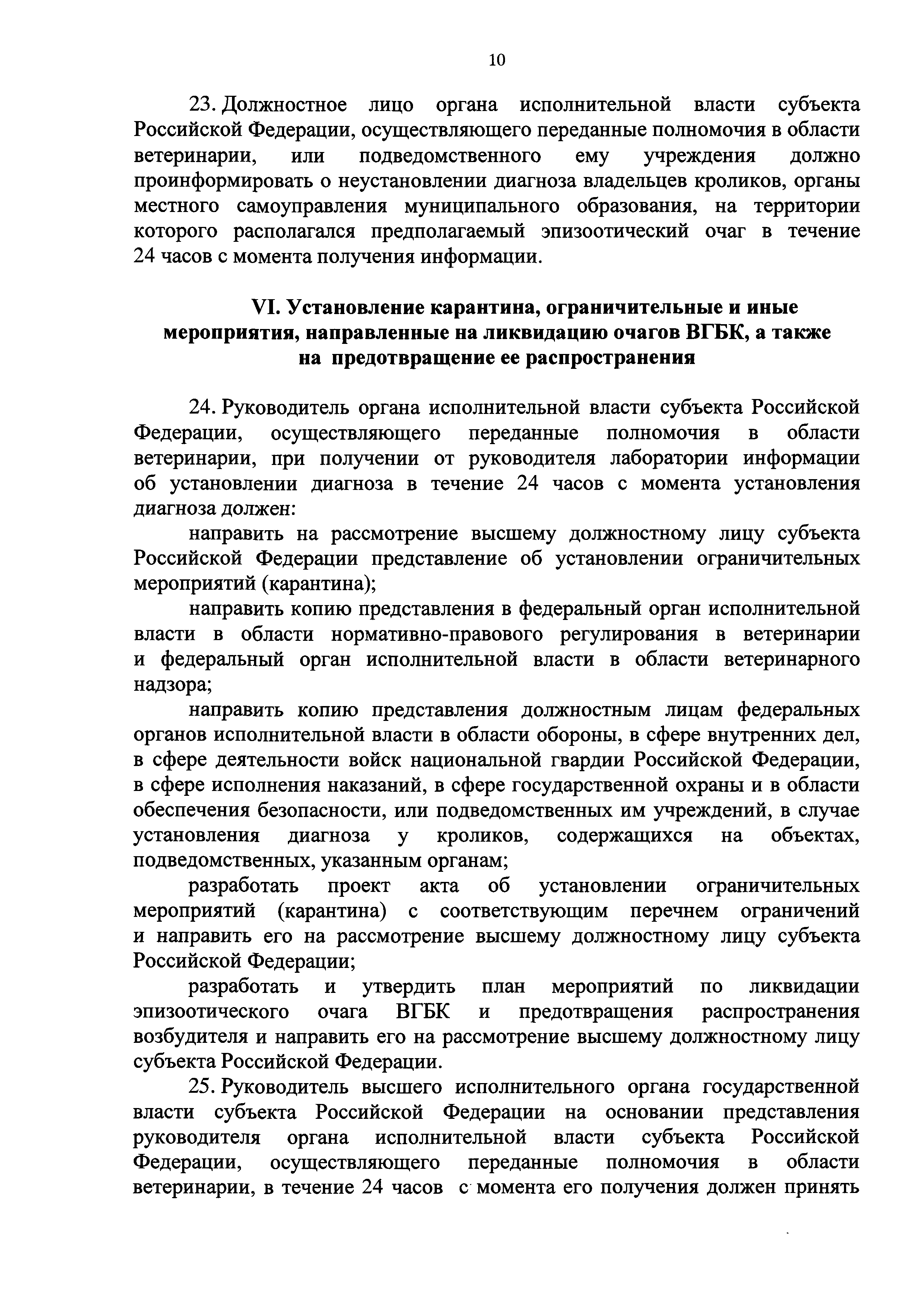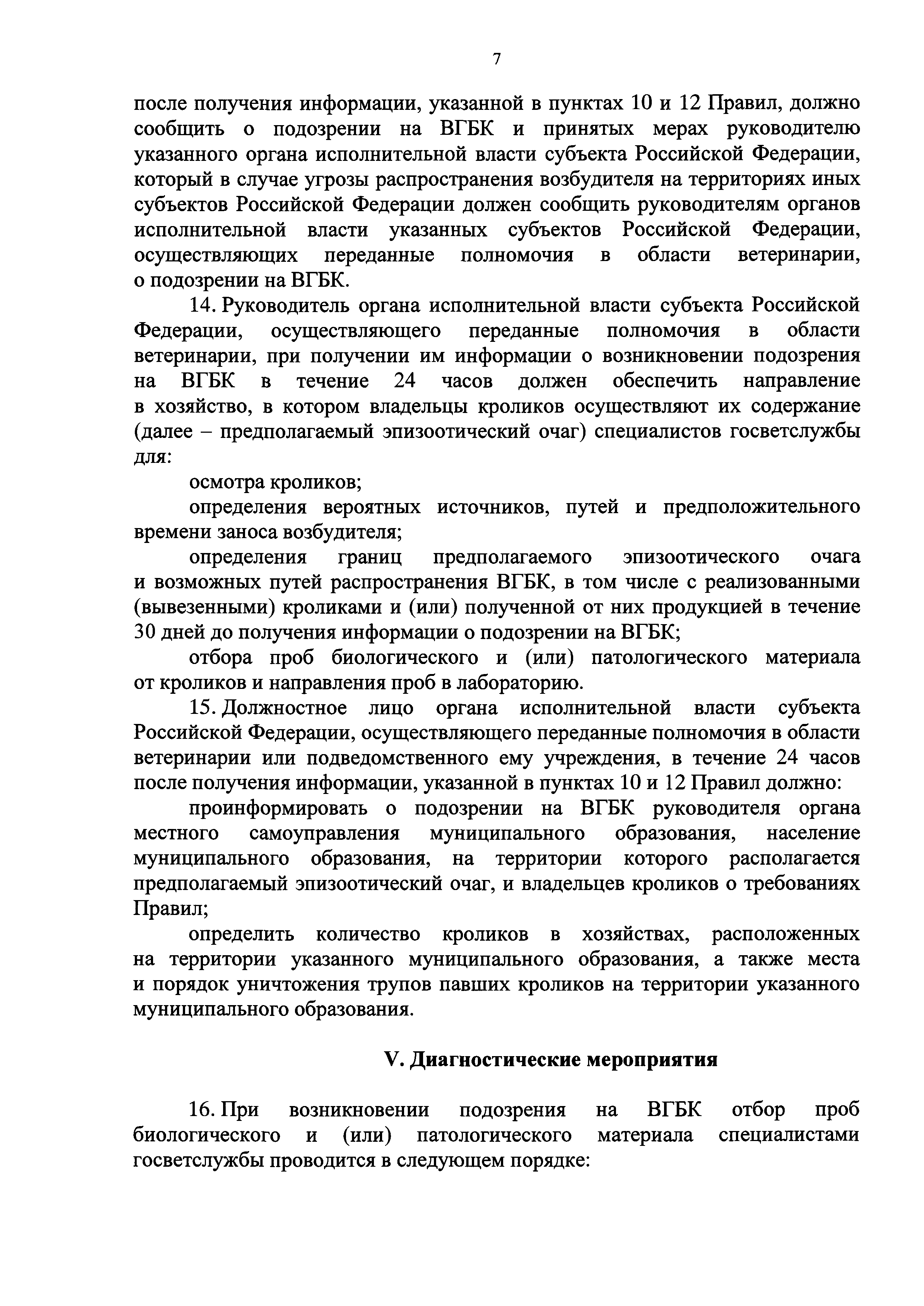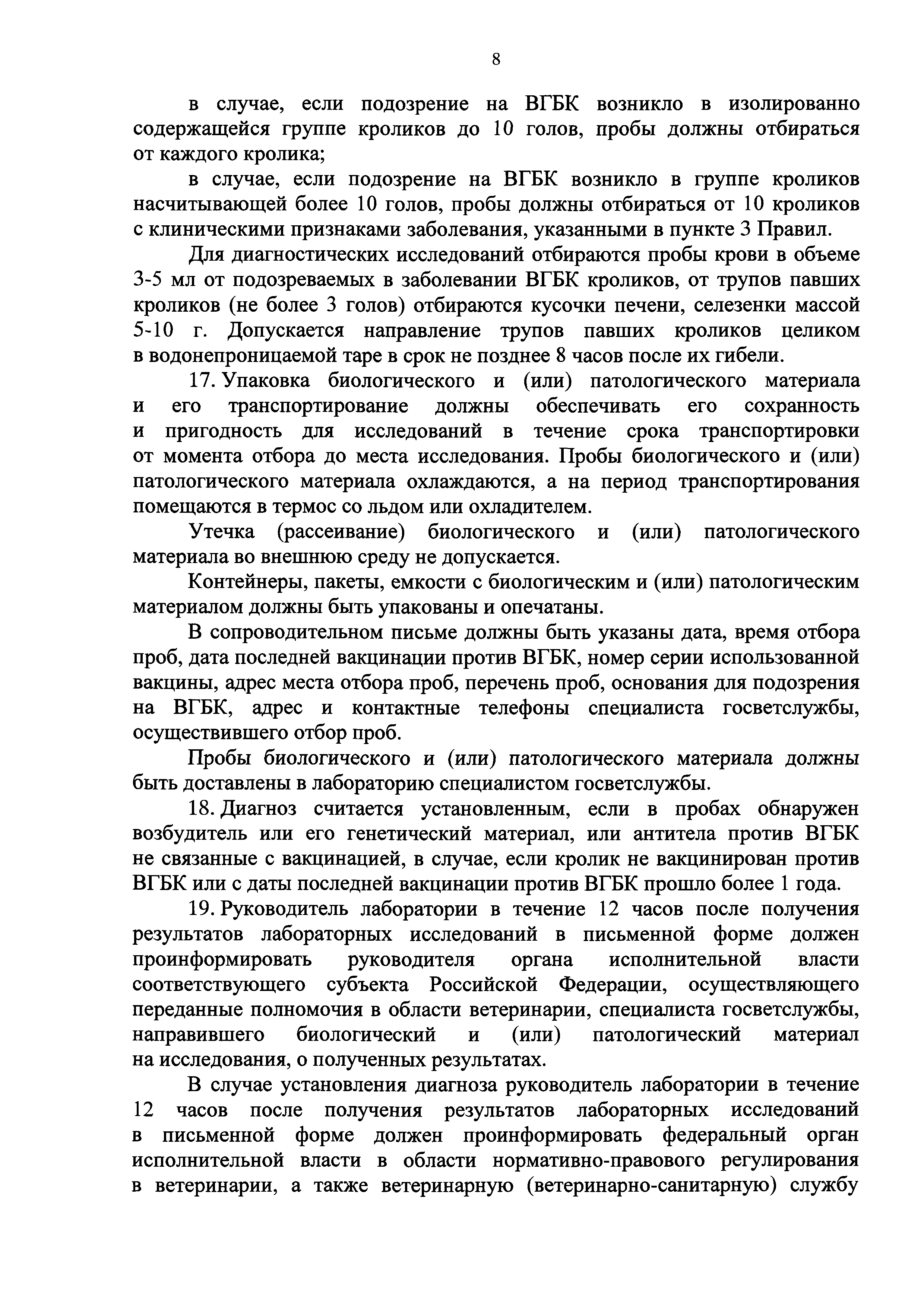 Ветеринарные правила осуществления профилактических, диагностических, ограничительных и иных мероприятий, установления и отмены карантина и иных ограничений, направленных на предотвращение распространения и ликвидацию очагов вирусной геморрагической болезни кроликов| Статус: | действует | | Название рус.: | Ветеринарные правила осуществления профилактических, диагностических, ограничительных и иных мероприятий, установления и отмены карантина и иных ограничений, направленных на предотвращение распространения и ликвидацию очагов вирусной геморрагической болезни кроликов | | Дата добавления в базу: | 01.01.2019 | | Дата актуализации: | 01.01.2021 | | Дата введения: | 20.01.2018 | | Область применения: | Ветеринарные правила устанавливают обязательные для исполнения требования к осуществлению профилактических, диагностических, ограничительных и иных мероприятий, установлению и отмене на территории Российской Федерации карантина и иных ограничений, направленных на предотвращение распространения и ликвидацию очагов вирусной геморрагической болезни кроликов. | | Оглавление: | I. Область применения II. Общая характеристика ВГБК III. Профилактические мероприятия IV. Мероприятия при подозрении на ВГБК V. Диагностические мероприятия VI. Установление карантина, ограничительные и иные мероприятия, направленные на ликвидацию очагов ВГБК, а также на предотвращение ее распространения VII. Отмена карантина | | Утверждён: | 12.12.2017 Министерство сельского хозяйства Российской Федерации (624)