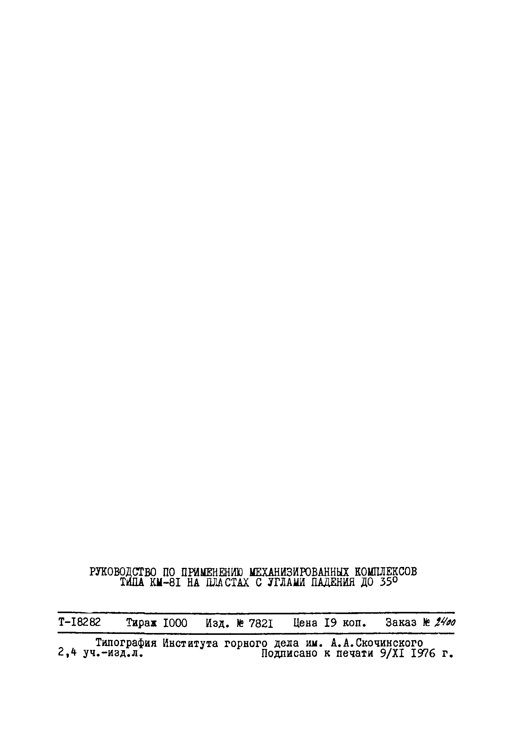 | Название рус.: | Руководство по применению механизированных комплексов типа КМ-81 на пластах с углами падения до 35 градусов |