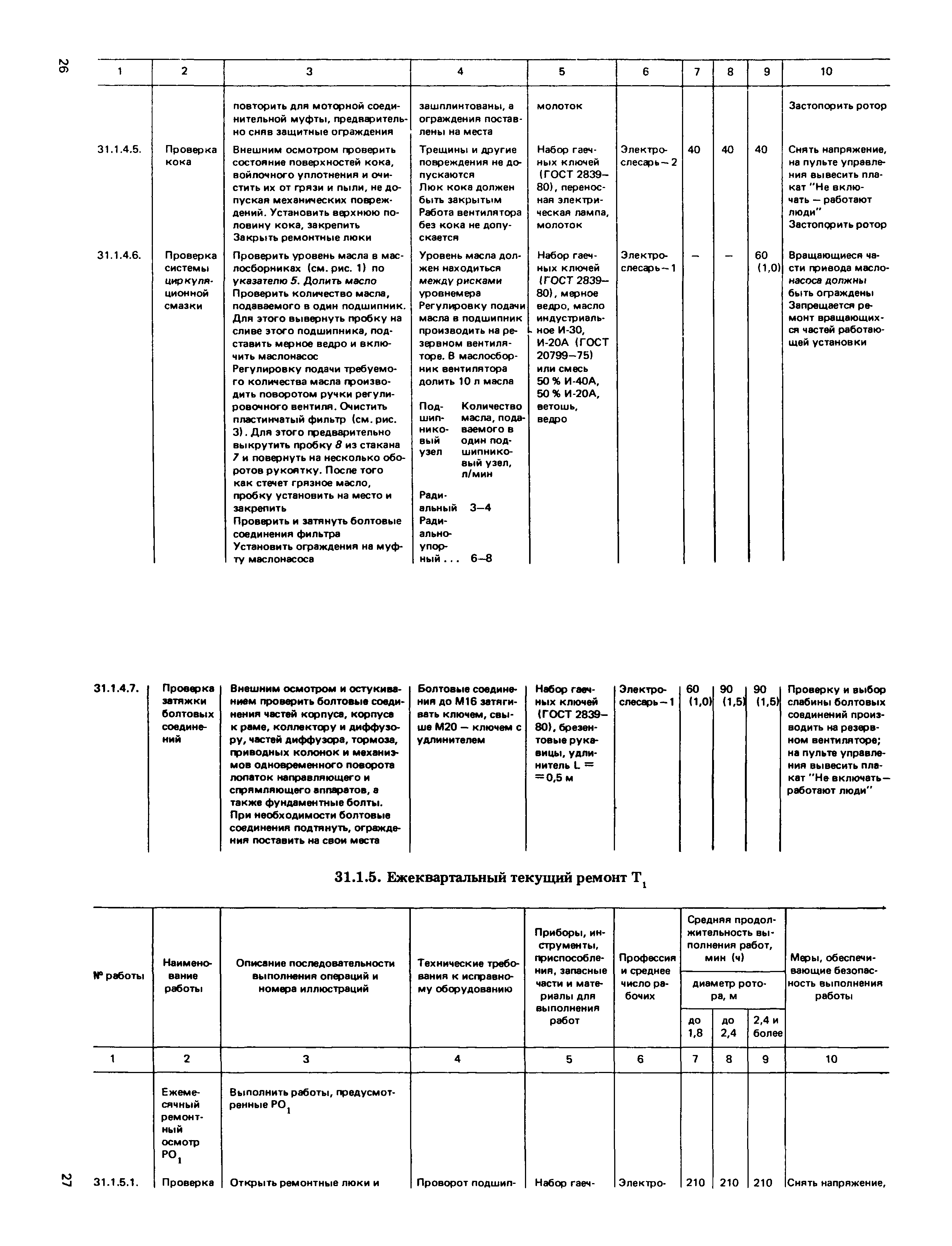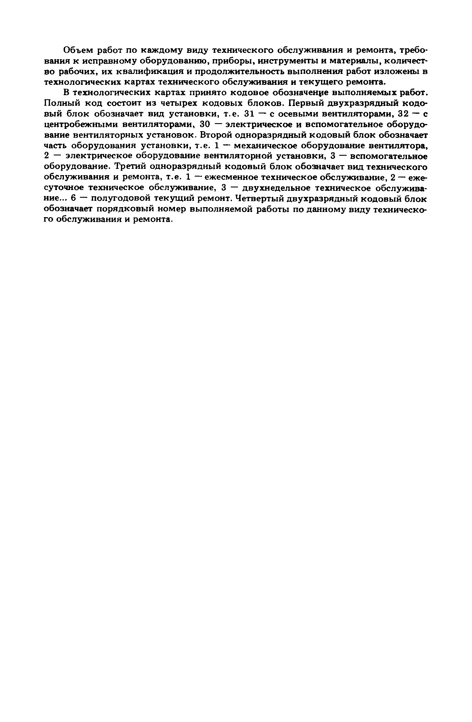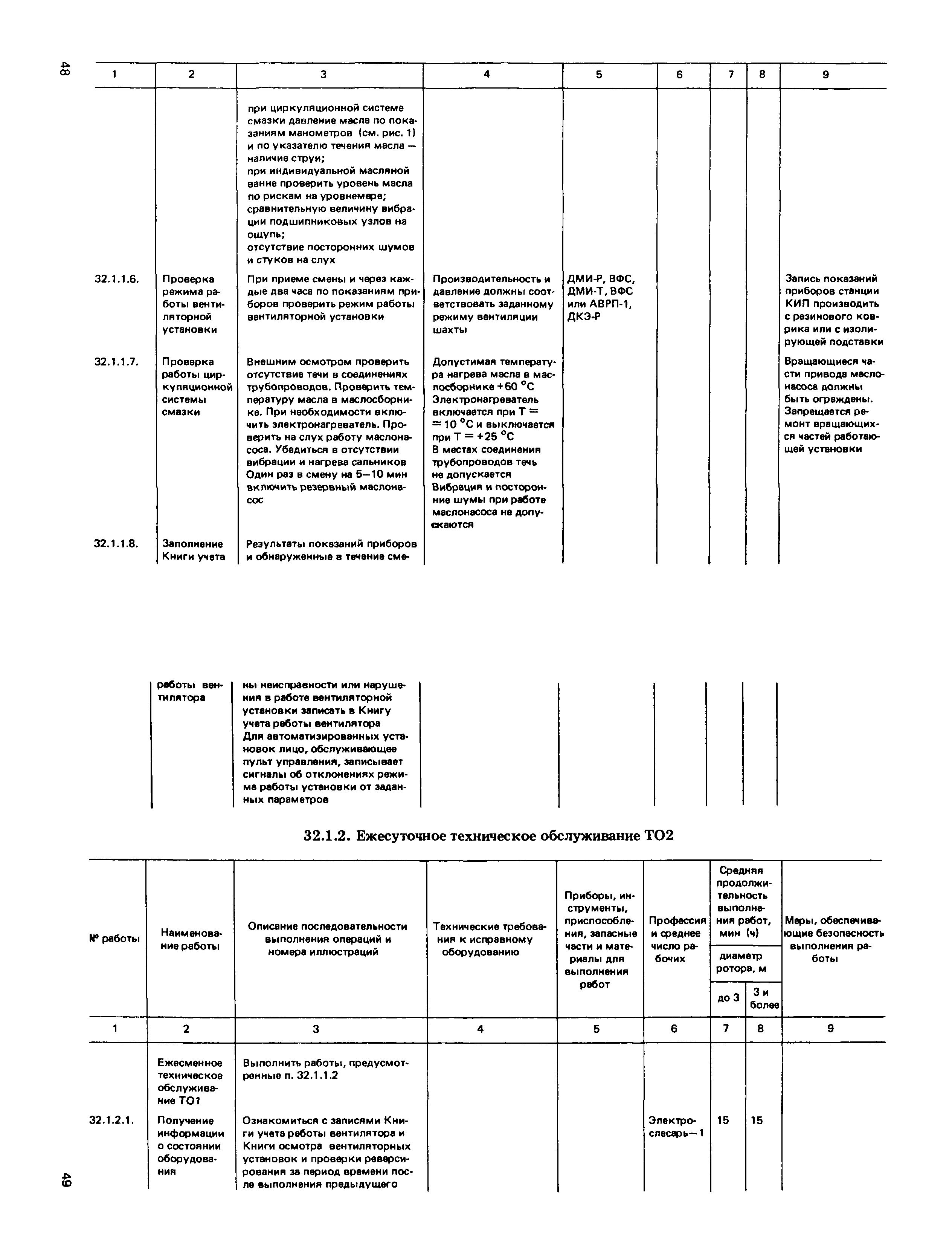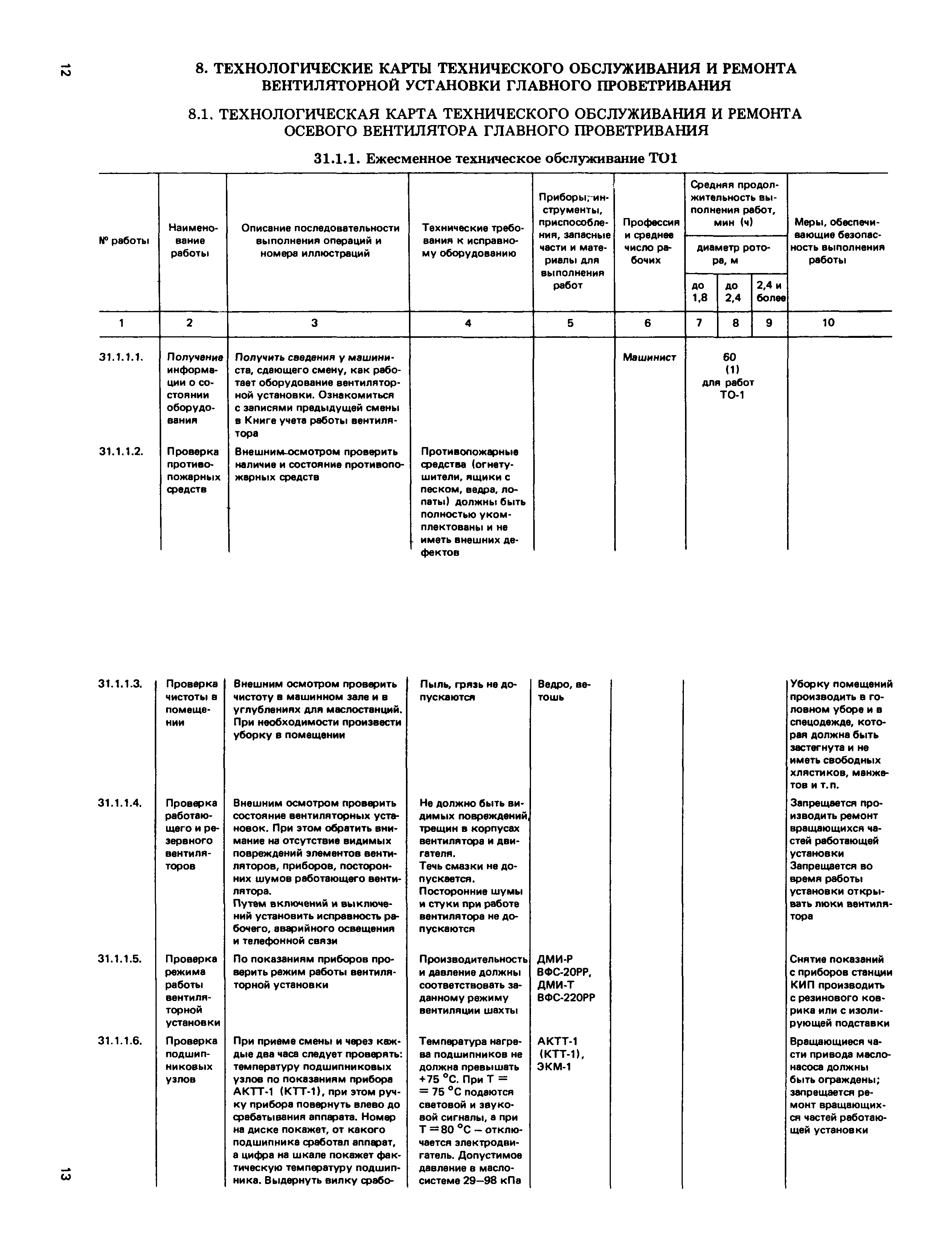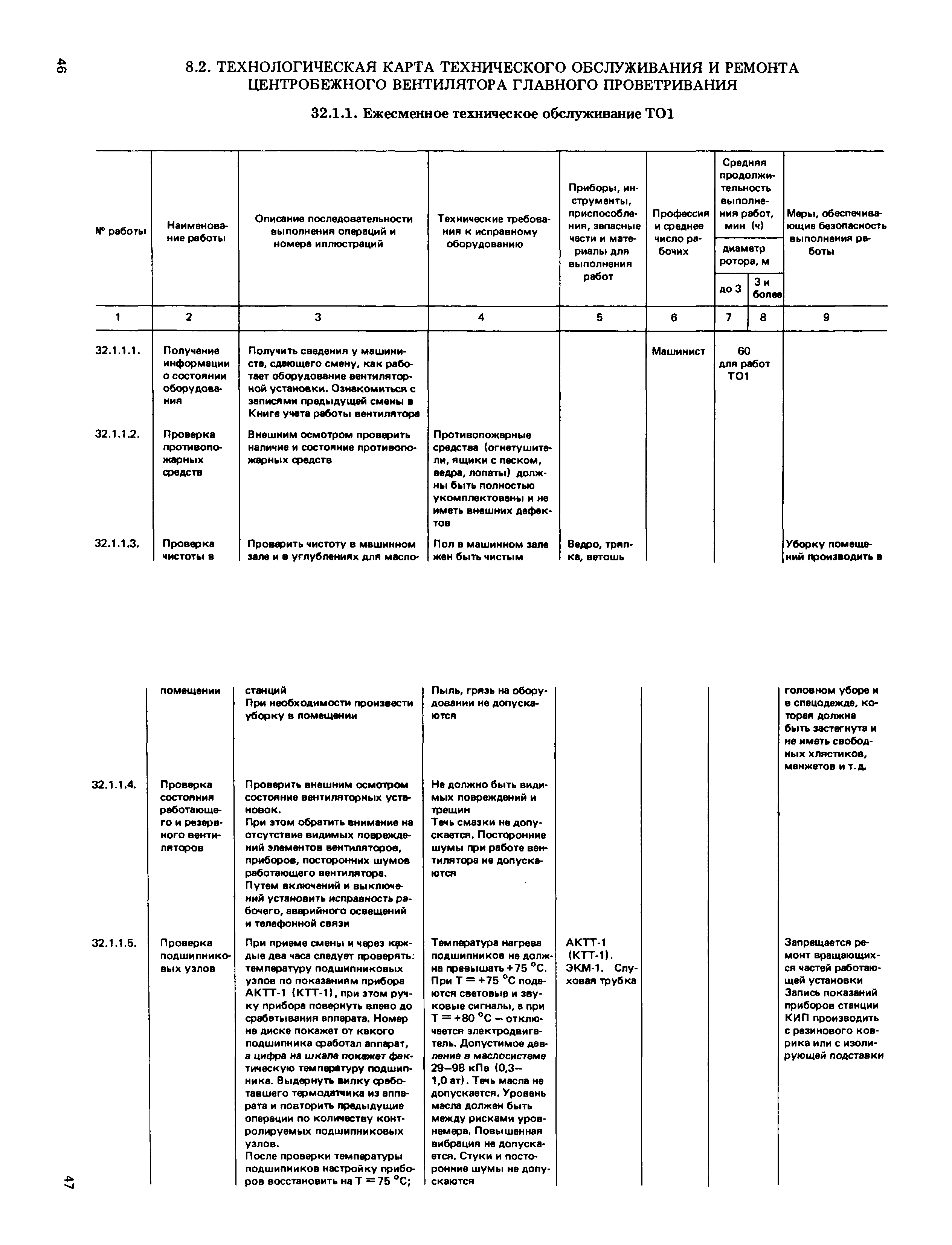 | Оглавление: | 1. Введение 2. Указание мер безопасности Меры безопасности при техническом обслуживании и ремонте механического оборудования вентиляторных установок Меры безопасности при Техническом обслуживании и ремонте электрооборудования вентиляторных установок Противопожарные мероприятия 3. Состав вентиляторной установки 4. Правила хранения оборудования шахтных вентиляторных установок 5. Организация смазочного хозяйства 6. Ревизия, наладка и испытания шахтной вентиляторной установки 7. Техническое обслуживание и текущий ремонт 8. Технологические карты технического обслуживания и ремонта вентиля торной установки главного проветривания 8.1. Технологическая карта технического обслуживания и ремонта осевого вентилятора главного проветривания 31.1.1. Ежесменное техническое обслуживание ТО1 31.1.2. Ежесуточное техническое обслуживание ТО2 31.1.3. Двухнедельное техническое обслуживание ТО4 31.1.4. Ежемесячное ремонтное обслуживание РО1 31.1.5. Ежеквартальный текущий ремонт Т1 31.1.6. Полугодовой текущий ремонт Т2 31.1.7. Годовая ревизия и наладка (НРГ) 31.1.8. Двухгодичная ревизия и наладка (НРД) 8.2. Технологическая карта технического обслуживания и ремонта центробежного вентилятора главного проветривания 32.1.1. Ежесменное техническое обслуживание ТО1 32.1.2. Ежесуточное техническое обслуживание ТО2 32.1.3. Двухнедельное техническое обслуживание ТО4 32.1.4. Ежемесячное ремонтное обслуживание РО1 32.1.5. Ежеквартальный текущий ремонт Т1 32.1.6. Полугодовой текущий ремонт Т2 32.1.7. Годовая ревизия и наладка НРГ 32.1.8. двухгодичная ревизия и наладка НРД 9. Технологическая карта технического обслуживания и ремонта электрического оборудования вентиляторной установки главного проветривания 30.2.1. Ежесменное техническое обслуживание ТО1 30.2.2. Ежесуточное техническое обслуживание ТО2 30.2.3. Двухнедельное техническое обслуживание ТО4 30.2.4. Ежемесячное ремонтное обслуживание РО1 30.2.5. Ежеквартальный текущий ремонт Т1 30.2.6. Полугодовой текущий ремонт Т2 30.2.7. Годовая ревизия и наладка НРГ 30.2.8. Двухгодичная ревизия и наладка НРД 10. Технологическая карта технического обслуживания и ремонта вспомогательного оборудования вентиляторной установки главного проветривания 30.3.1. Ежесменное техническое обслуживание ТО1 30.3.2. Ежесуточное техническое обслуживание ТО2 30.3.3. двухнедельное техническое обслуживание ТО4 30.3.4. Ежемесячное ремонтное обслуживание РО1 30.3.5. Полугодовой текущий ремонт Т2 30.3.6. Годовая ревизия и наладка НРГ 30.3.7. двухгодичная ревизия и наладка НРД 11. Возможные неисправности и методы их устранения 11.1. Возможные неисправности вентиляторов и методы их устранения 11.2. Возможные неисправности электрического оборудования и методы их устранения 11.3. Возможные неисправности вспомогательного оборудования и методы их устранения Список литературы |