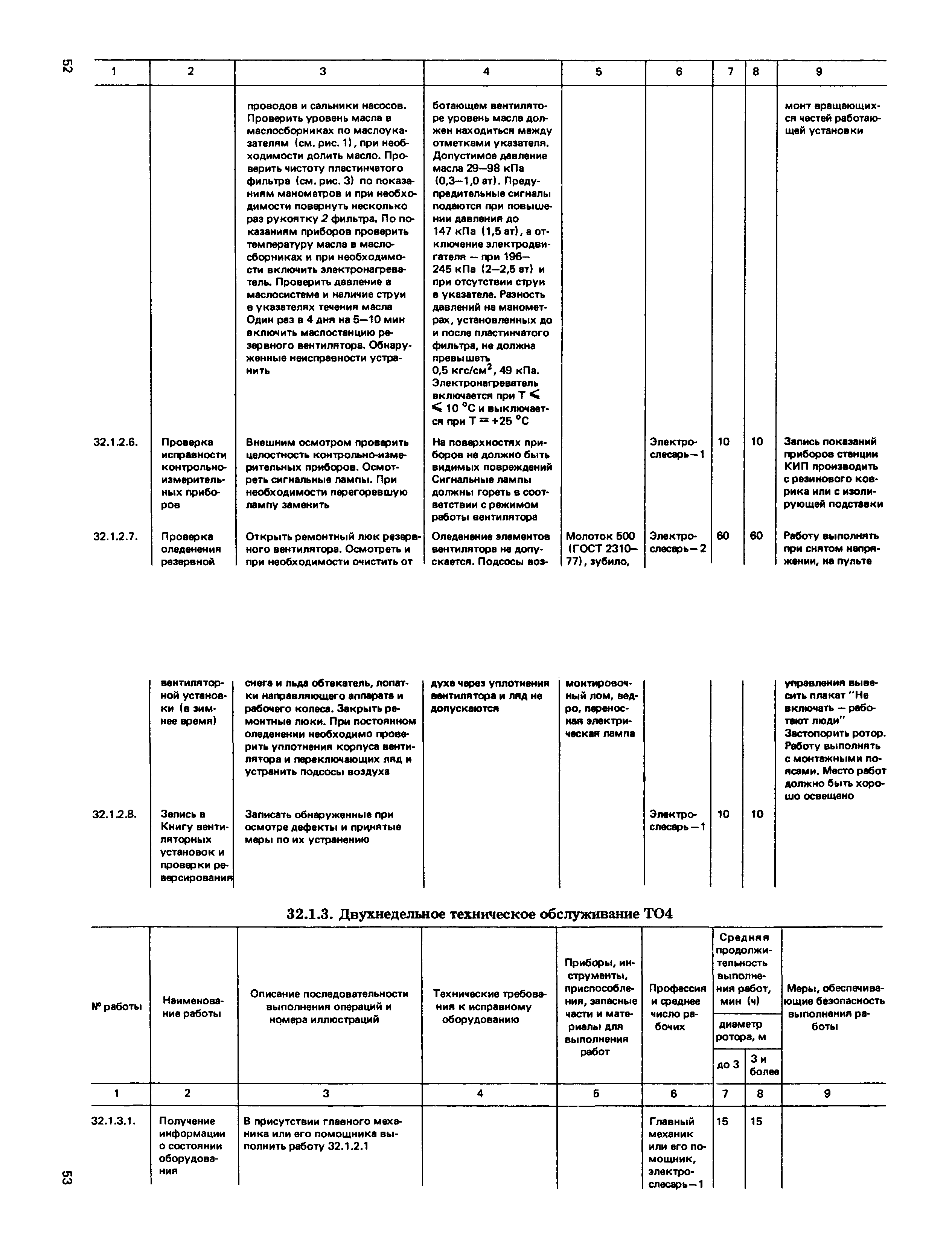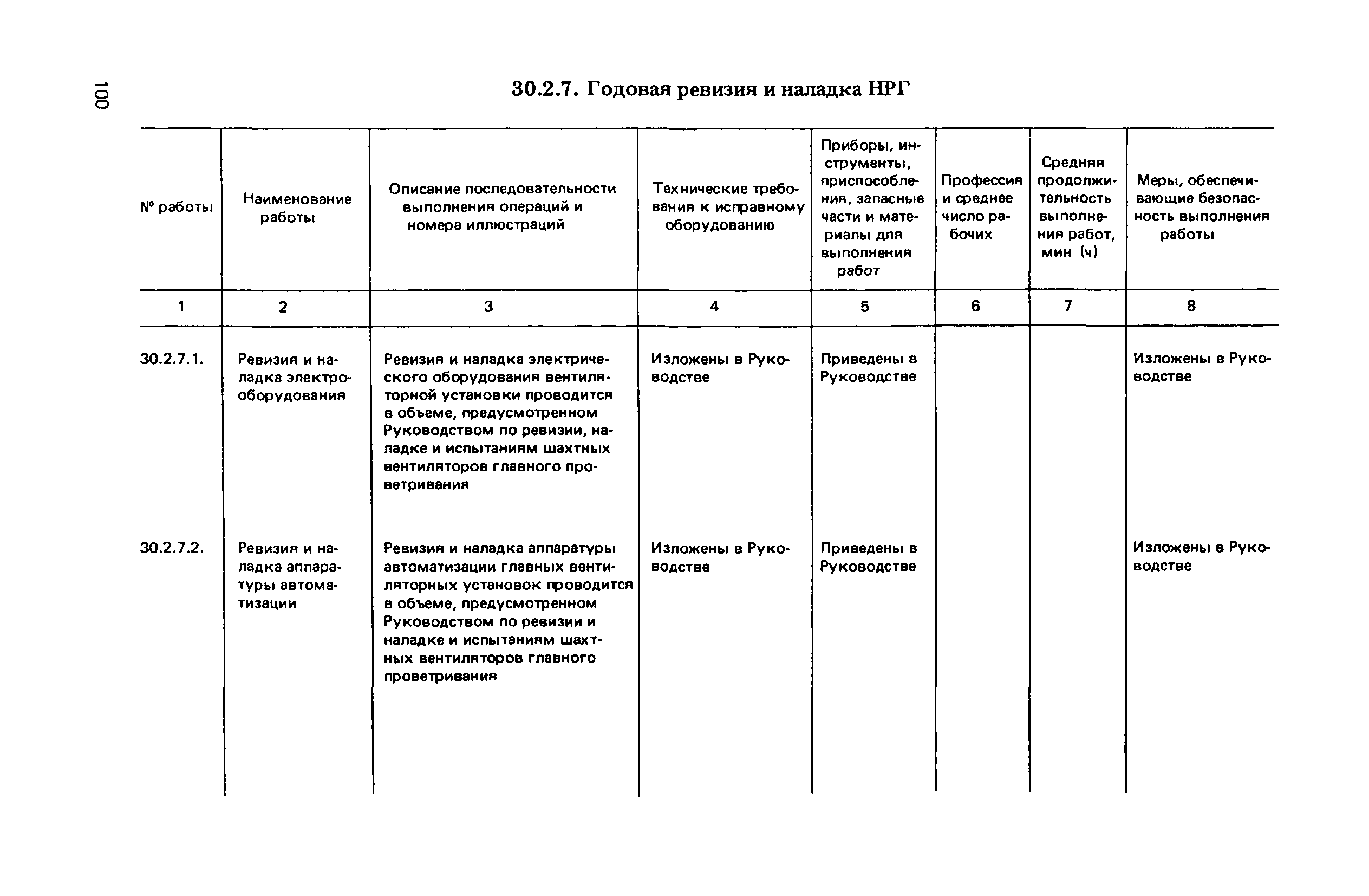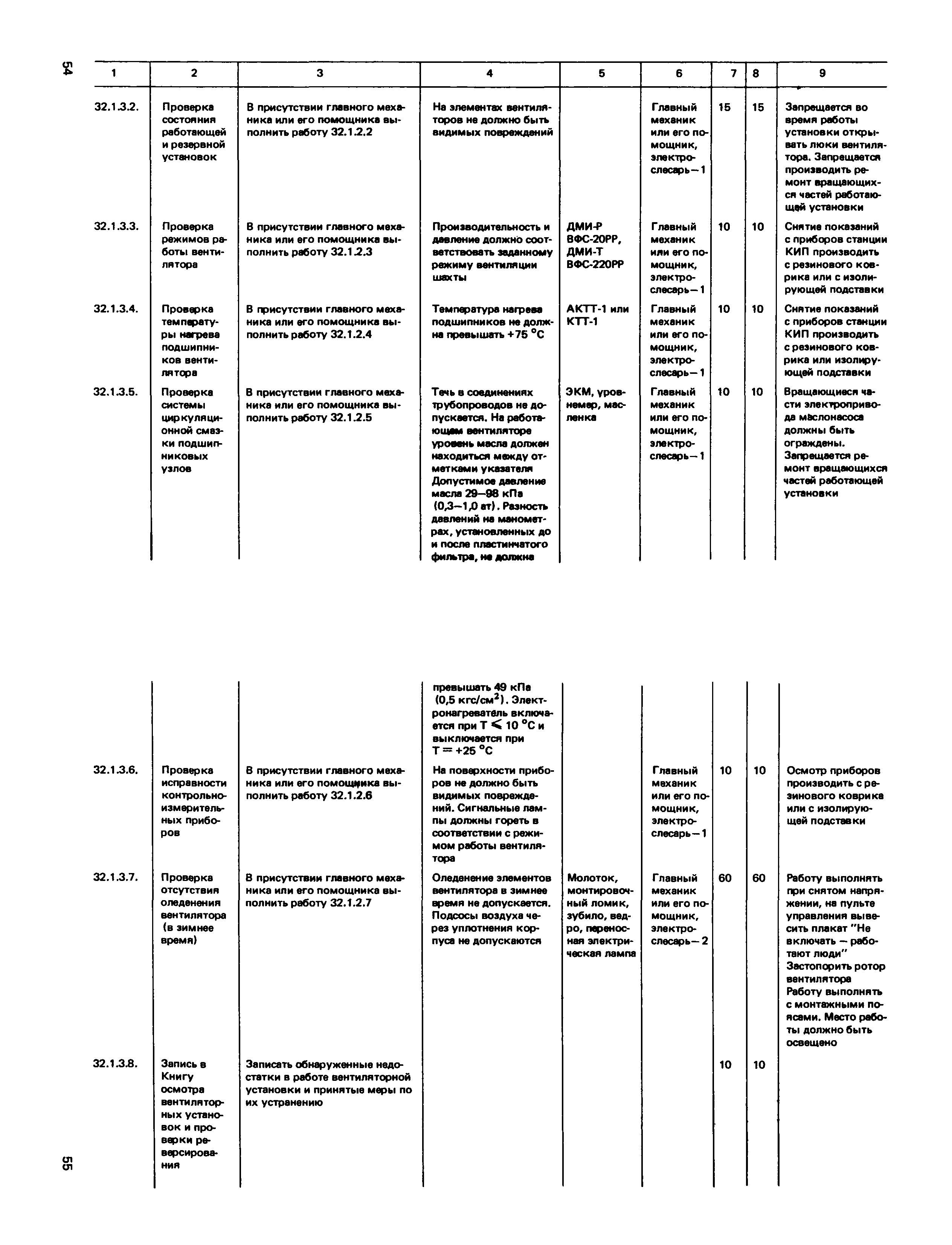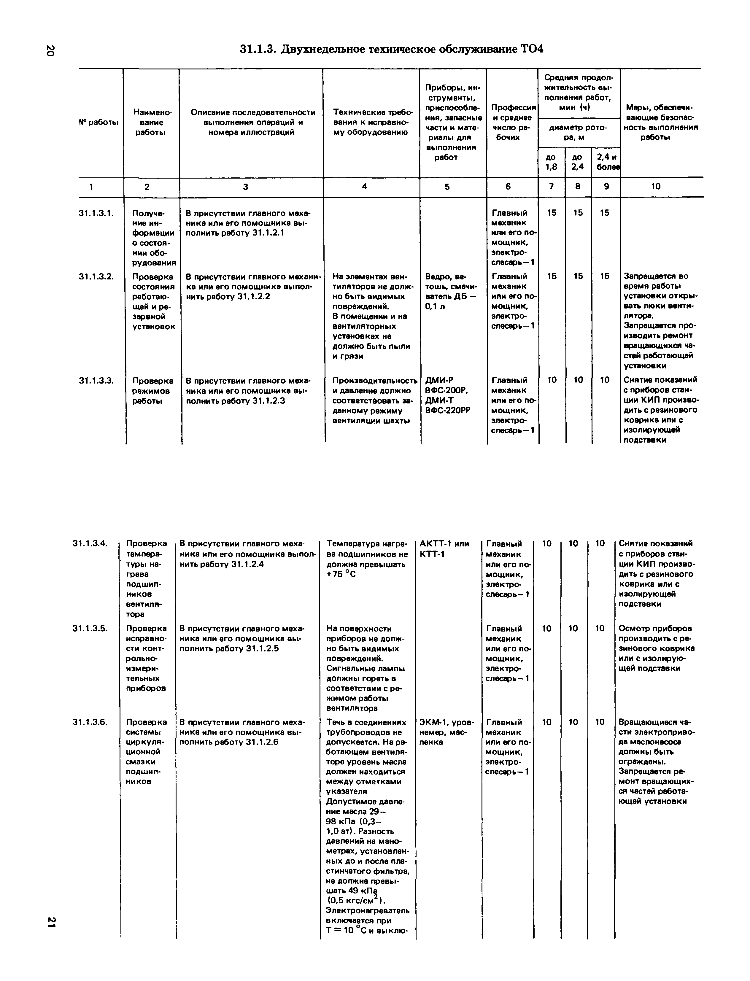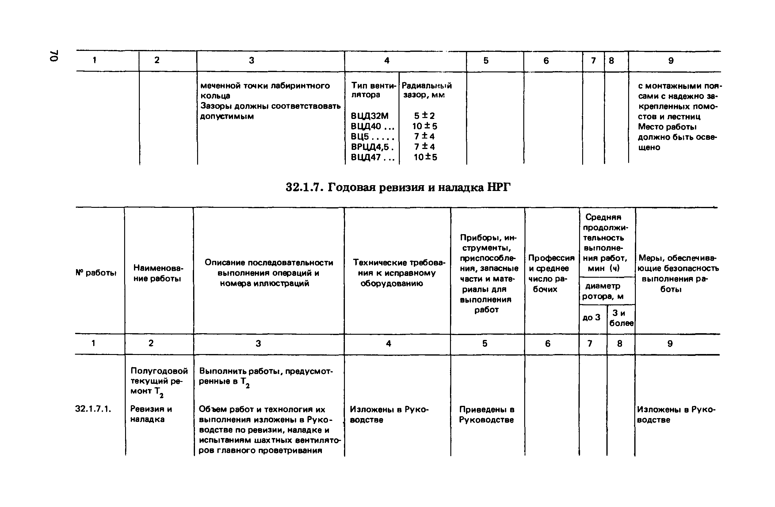 | Оглавление: | 1. Введение 2. Указание мер безопасности Меры безопасности при техническом обслуживании и ремонте механического оборудования вентиляторных установок Меры безопасности при Техническом обслуживании и ремонте электрооборудования вентиляторных установок Противопожарные мероприятия 3. Состав вентиляторной установки 4. Правила хранения оборудования шахтных вентиляторных установок 5. Организация смазочного хозяйства 6. Ревизия, наладка и испытания шахтной вентиляторной установки 7. Техническое обслуживание и текущий ремонт 8. Технологические карты технического обслуживания и ремонта вентиля торной установки главного проветривания 8.1. Технологическая карта технического обслуживания и ремонта осевого вентилятора главного проветривания 31.1.1. Ежесменное техническое обслуживание ТО1 31.1.2. Ежесуточное техническое обслуживание ТО2 31.1.3. Двухнедельное техническое обслуживание ТО4 31.1.4. Ежемесячное ремонтное обслуживание РО1 31.1.5. Ежеквартальный текущий ремонт Т1 31.1.6. Полугодовой текущий ремонт Т2 31.1.7. Годовая ревизия и наладка (НРГ) 31.1.8. Двухгодичная ревизия и наладка (НРД) 8.2. Технологическая карта технического обслуживания и ремонта центробежного вентилятора главного проветривания 32.1.1. Ежесменное техническое обслуживание ТО1 32.1.2. Ежесуточное техническое обслуживание ТО2 32.1.3. Двухнедельное техническое обслуживание ТО4 32.1.4. Ежемесячное ремонтное обслуживание РО1 32.1.5. Ежеквартальный текущий ремонт Т1 32.1.6. Полугодовой текущий ремонт Т2 32.1.7. Годовая ревизия и наладка НРГ 32.1.8. двухгодичная ревизия и наладка НРД 9. Технологическая карта технического обслуживания и ремонта электрического оборудования вентиляторной установки главного проветривания 30.2.1. Ежесменное техническое обслуживание ТО1 30.2.2. Ежесуточное техническое обслуживание ТО2 30.2.3. Двухнедельное техническое обслуживание ТО4 30.2.4. Ежемесячное ремонтное обслуживание РО1 30.2.5. Ежеквартальный текущий ремонт Т1 30.2.6. Полугодовой текущий ремонт Т2 30.2.7. Годовая ревизия и наладка НРГ 30.2.8. Двухгодичная ревизия и наладка НРД 10. Технологическая карта технического обслуживания и ремонта вспомогательного оборудования вентиляторной установки главного проветривания 30.3.1. Ежесменное техническое обслуживание ТО1 30.3.2. Ежесуточное техническое обслуживание ТО2 30.3.3. двухнедельное техническое обслуживание ТО4 30.3.4. Ежемесячное ремонтное обслуживание РО1 30.3.5. Полугодовой текущий ремонт Т2 30.3.6. Годовая ревизия и наладка НРГ 30.3.7. двухгодичная ревизия и наладка НРД 11. Возможные неисправности и методы их устранения 11.1. Возможные неисправности вентиляторов и методы их устранения 11.2. Возможные неисправности электрического оборудования и методы их устранения 11.3. Возможные неисправности вспомогательного оборудования и методы их устранения Список литературы |