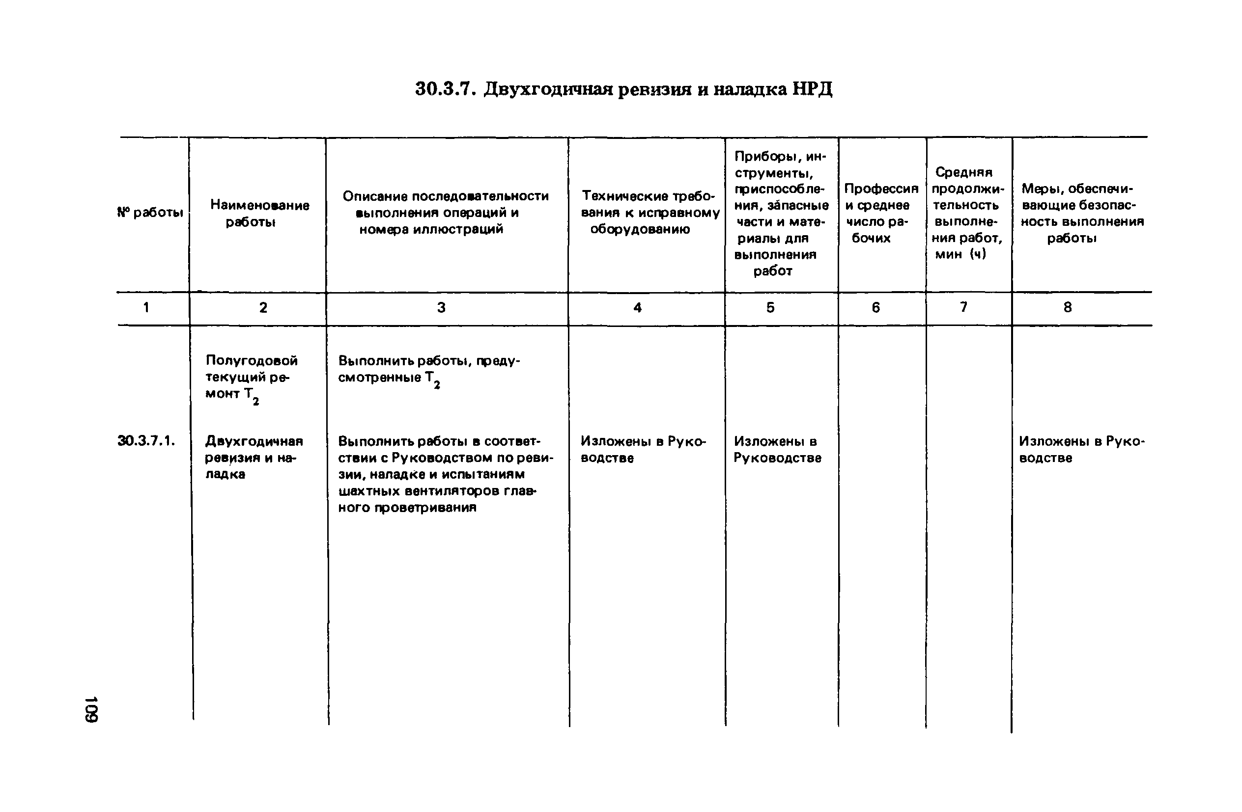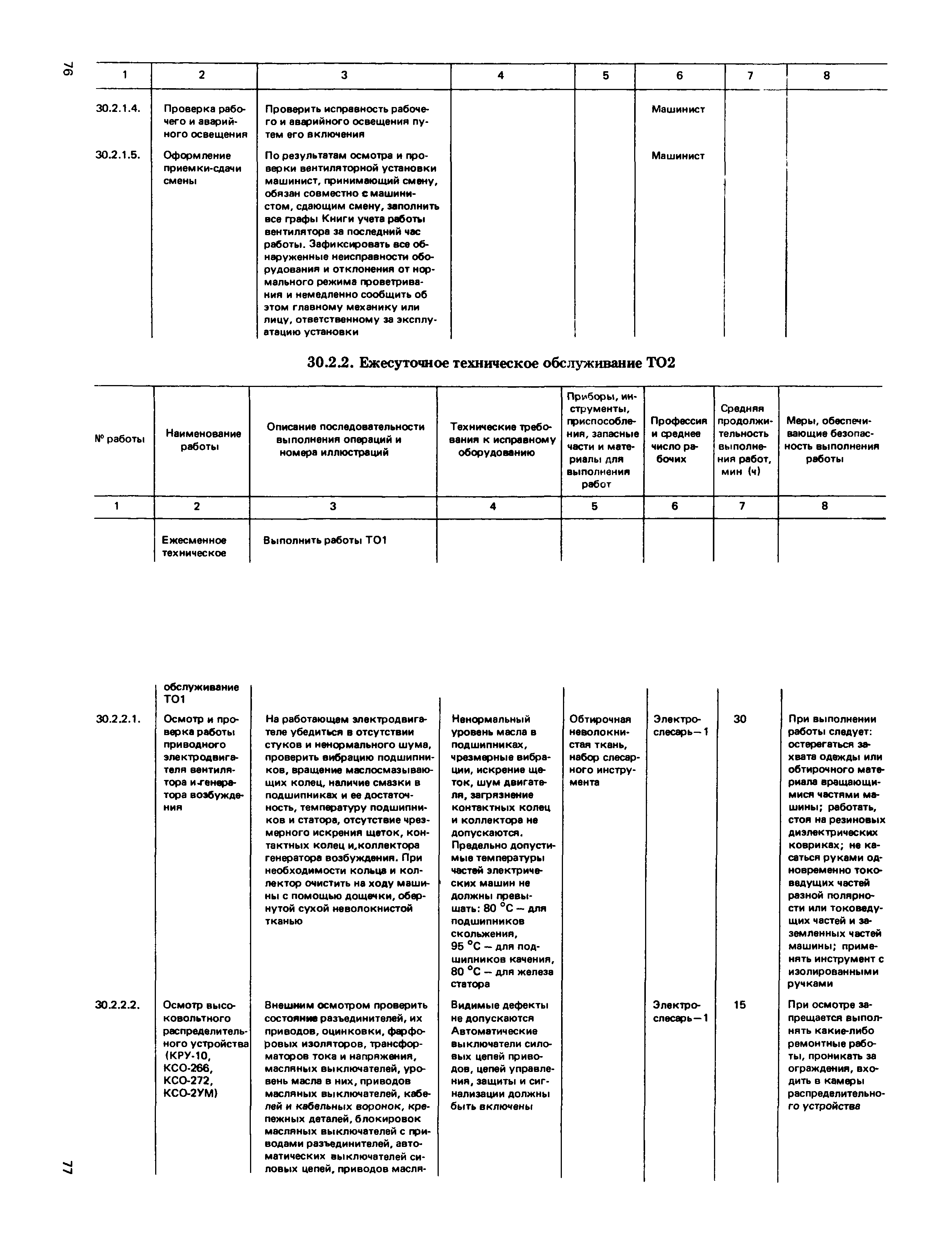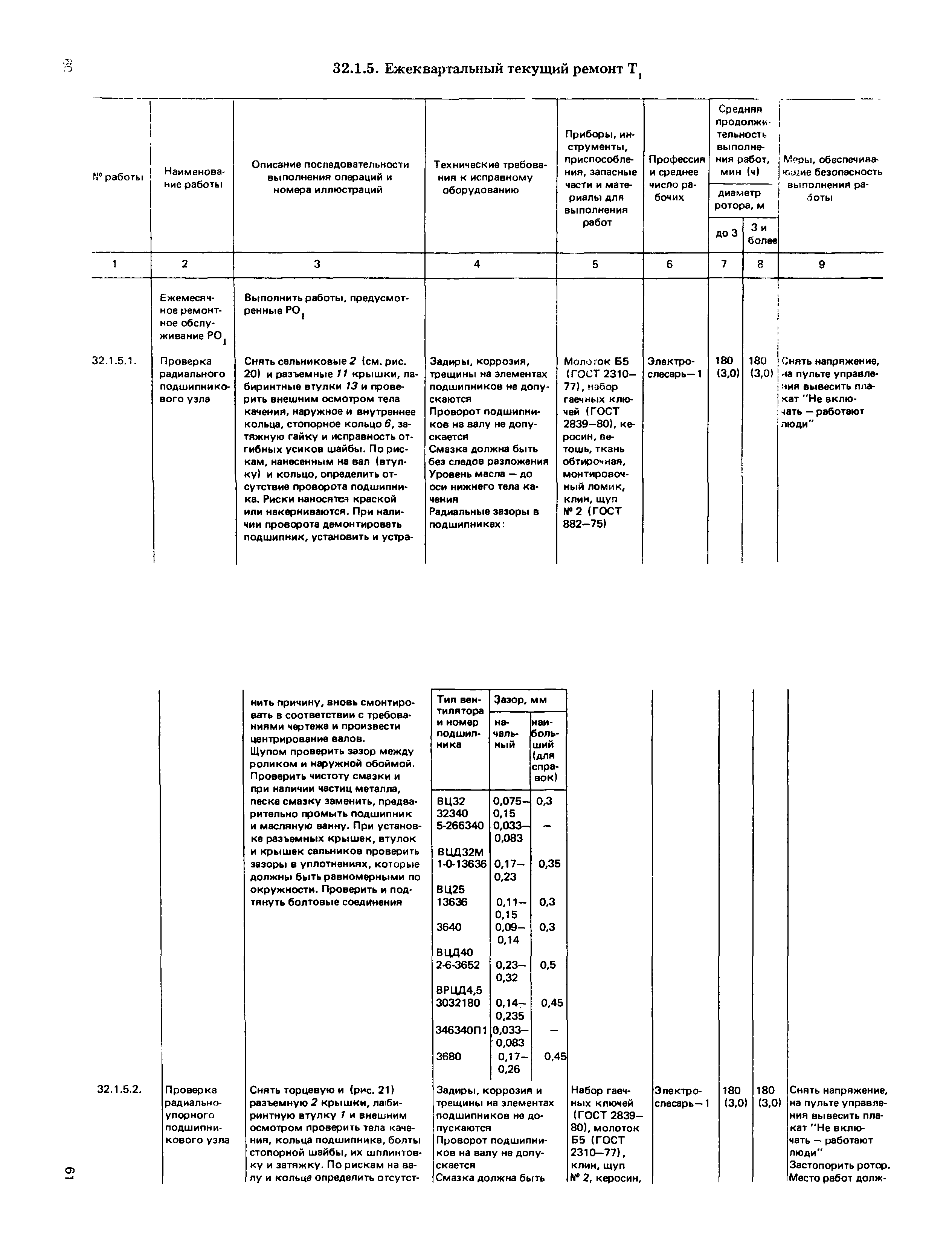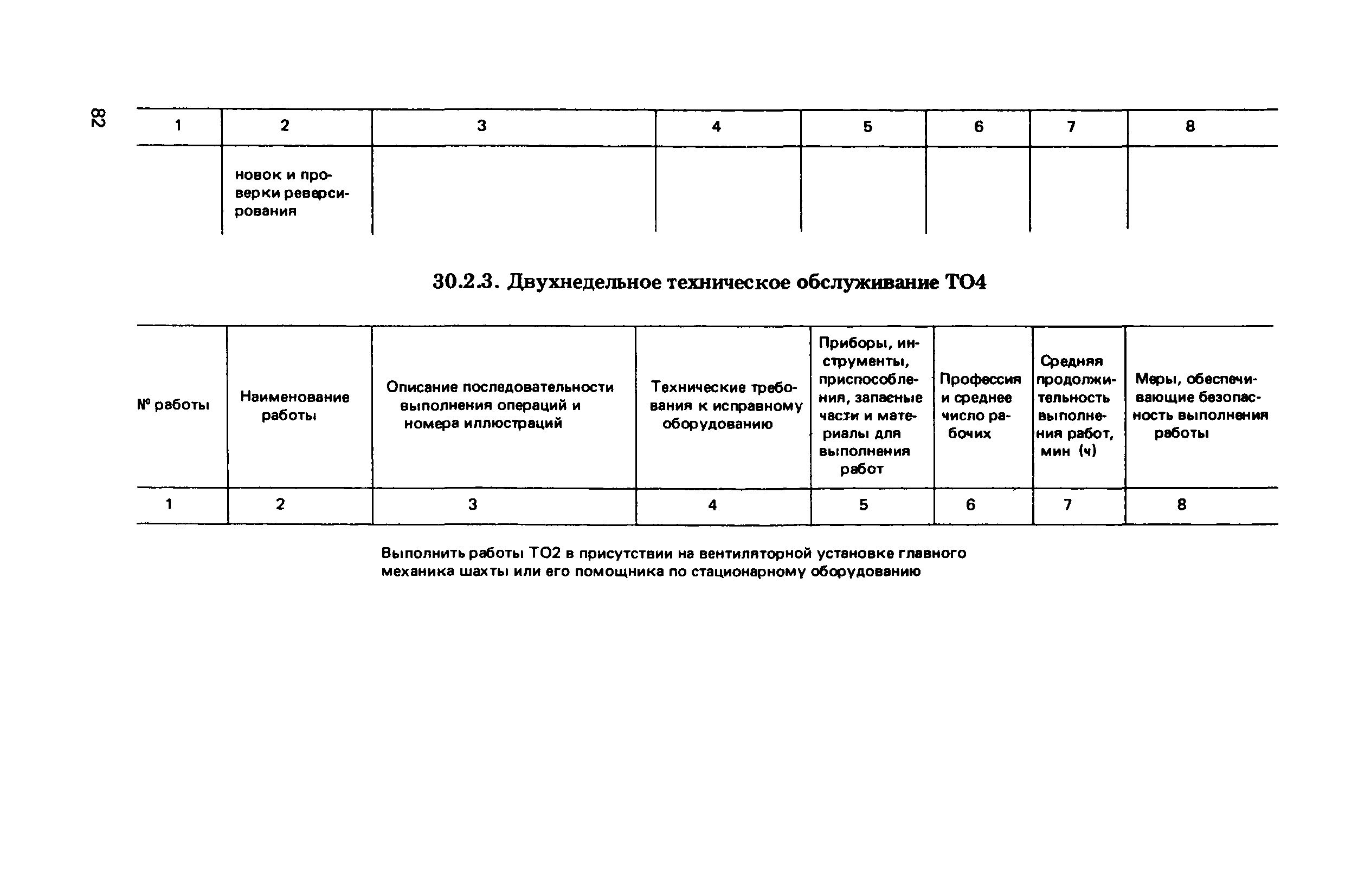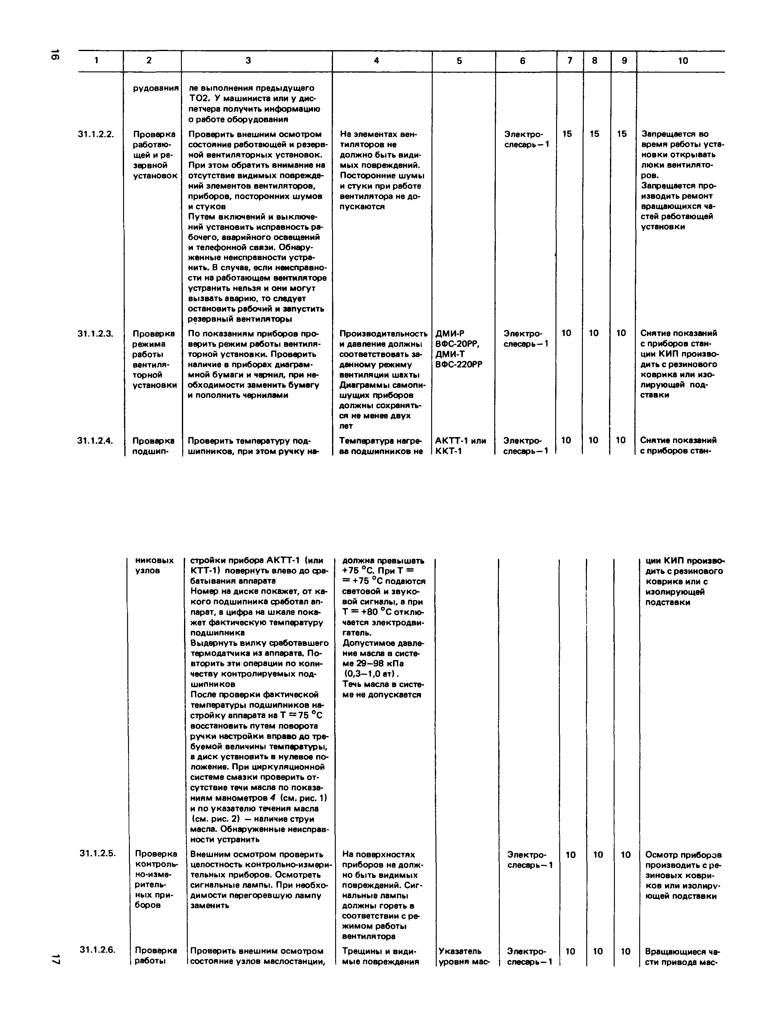 | Оглавление: | 1. Введение 2. Указание мер безопасности Меры безопасности при техническом обслуживании и ремонте механического оборудования вентиляторных установок Меры безопасности при Техническом обслуживании и ремонте электрооборудования вентиляторных установок Противопожарные мероприятия 3. Состав вентиляторной установки 4. Правила хранения оборудования шахтных вентиляторных установок 5. Организация смазочного хозяйства 6. Ревизия, наладка и испытания шахтной вентиляторной установки 7. Техническое обслуживание и текущий ремонт 8. Технологические карты технического обслуживания и ремонта вентиля торной установки главного проветривания 8.1. Технологическая карта технического обслуживания и ремонта осевого вентилятора главного проветривания 31.1.1. Ежесменное техническое обслуживание ТО1 31.1.2. Ежесуточное техническое обслуживание ТО2 31.1.3. Двухнедельное техническое обслуживание ТО4 31.1.4. Ежемесячное ремонтное обслуживание РО1 31.1.5. Ежеквартальный текущий ремонт Т1 31.1.6. Полугодовой текущий ремонт Т2 31.1.7. Годовая ревизия и наладка (НРГ) 31.1.8. Двухгодичная ревизия и наладка (НРД) 8.2. Технологическая карта технического обслуживания и ремонта центробежного вентилятора главного проветривания 32.1.1. Ежесменное техническое обслуживание ТО1 32.1.2. Ежесуточное техническое обслуживание ТО2 32.1.3. Двухнедельное техническое обслуживание ТО4 32.1.4. Ежемесячное ремонтное обслуживание РО1 32.1.5. Ежеквартальный текущий ремонт Т1 32.1.6. Полугодовой текущий ремонт Т2 32.1.7. Годовая ревизия и наладка НРГ 32.1.8. двухгодичная ревизия и наладка НРД 9. Технологическая карта технического обслуживания и ремонта электрического оборудования вентиляторной установки главного проветривания 30.2.1. Ежесменное техническое обслуживание ТО1 30.2.2. Ежесуточное техническое обслуживание ТО2 30.2.3. Двухнедельное техническое обслуживание ТО4 30.2.4. Ежемесячное ремонтное обслуживание РО1 30.2.5. Ежеквартальный текущий ремонт Т1 30.2.6. Полугодовой текущий ремонт Т2 30.2.7. Годовая ревизия и наладка НРГ 30.2.8. Двухгодичная ревизия и наладка НРД 10. Технологическая карта технического обслуживания и ремонта вспомогательного оборудования вентиляторной установки главного проветривания 30.3.1. Ежесменное техническое обслуживание ТО1 30.3.2. Ежесуточное техническое обслуживание ТО2 30.3.3. двухнедельное техническое обслуживание ТО4 30.3.4. Ежемесячное ремонтное обслуживание РО1 30.3.5. Полугодовой текущий ремонт Т2 30.3.6. Годовая ревизия и наладка НРГ 30.3.7. двухгодичная ревизия и наладка НРД 11. Возможные неисправности и методы их устранения 11.1. Возможные неисправности вентиляторов и методы их устранения 11.2. Возможные неисправности электрического оборудования и методы их устранения 11.3. Возможные неисправности вспомогательного оборудования и методы их устранения Список литературы |