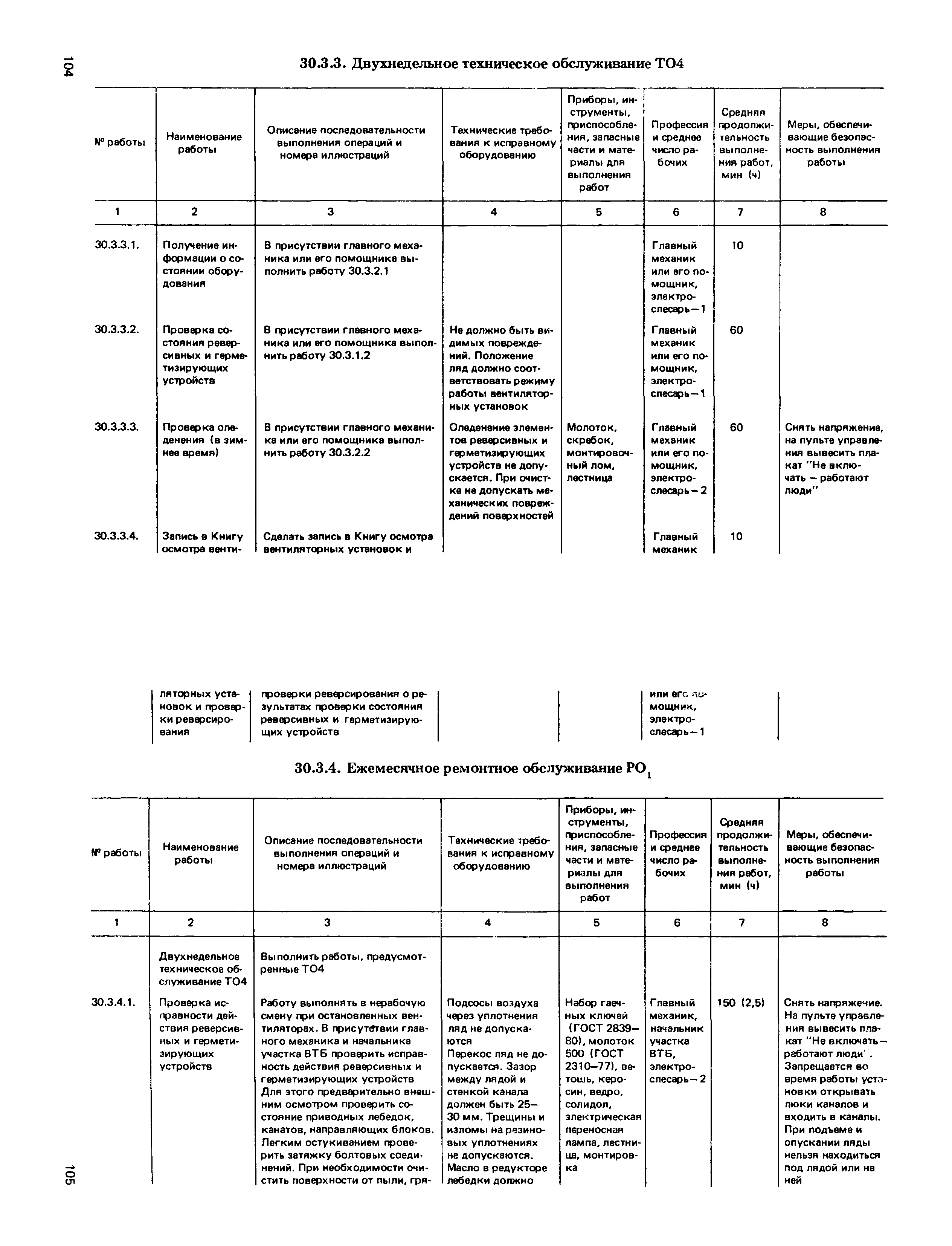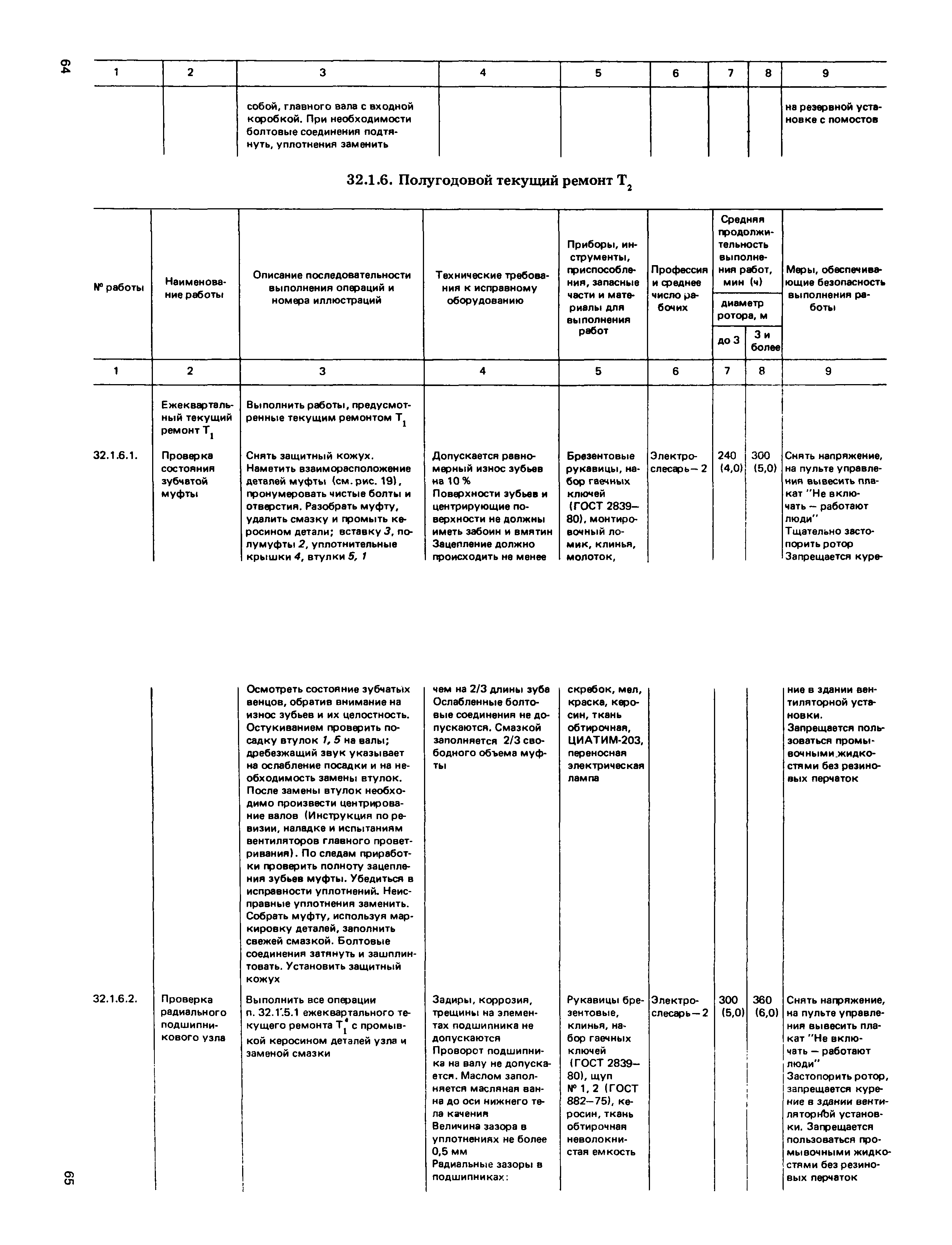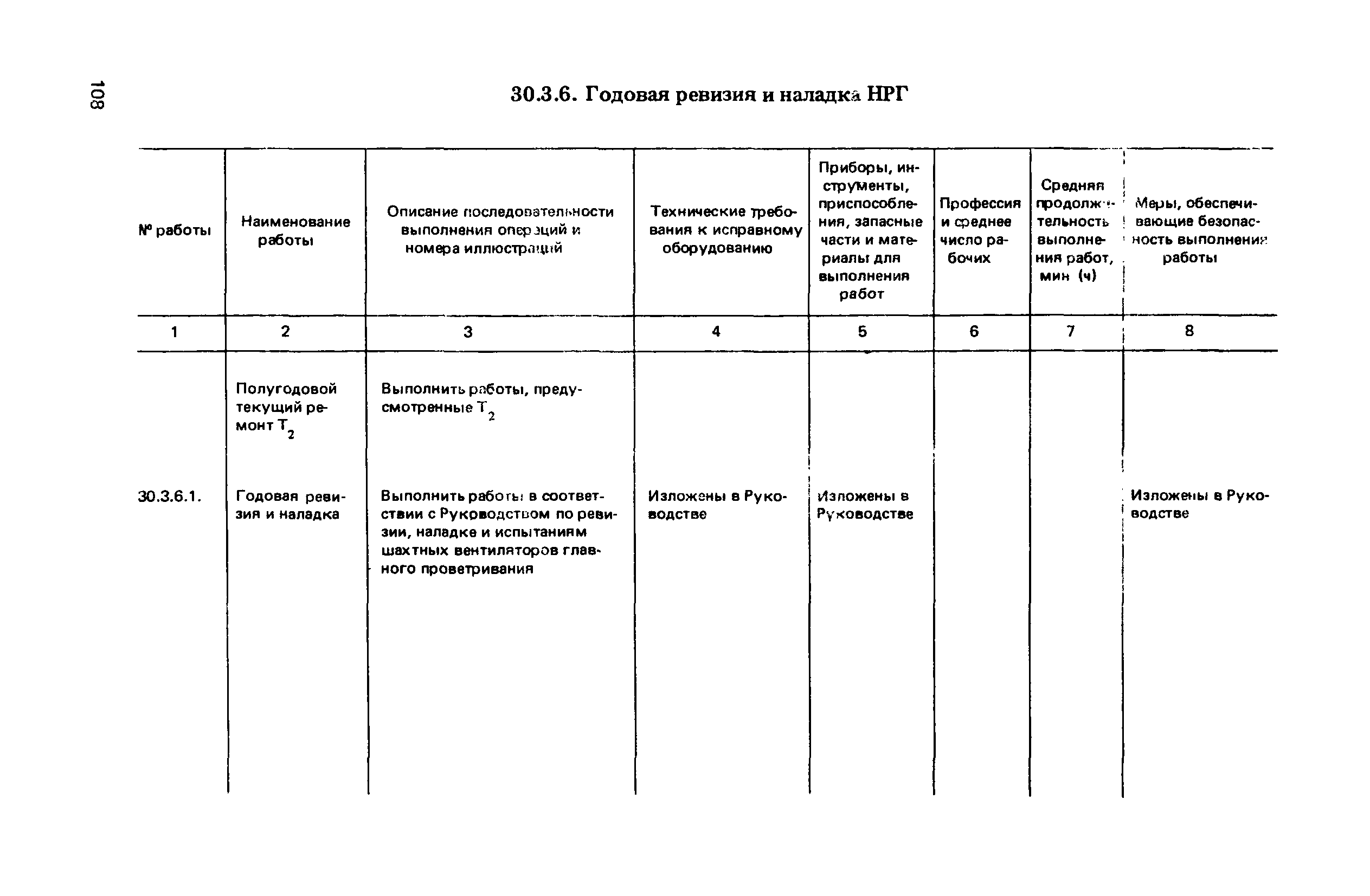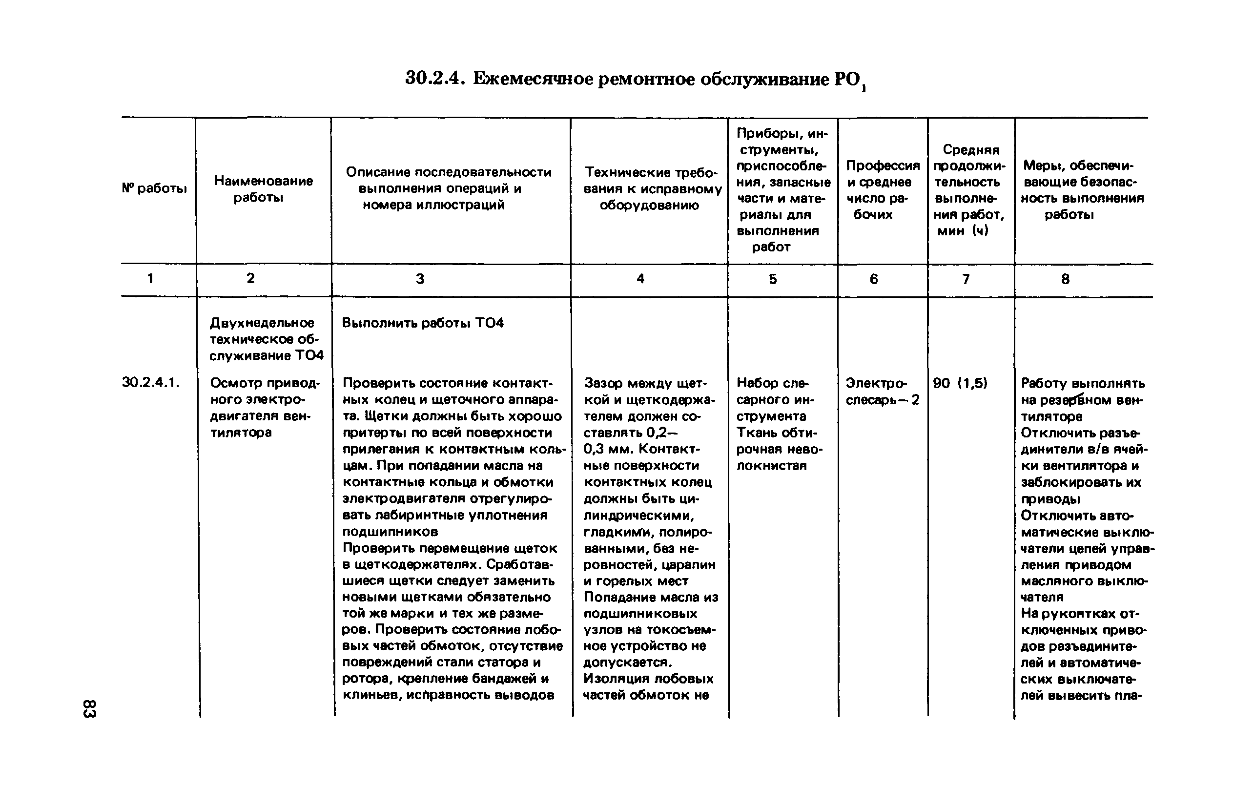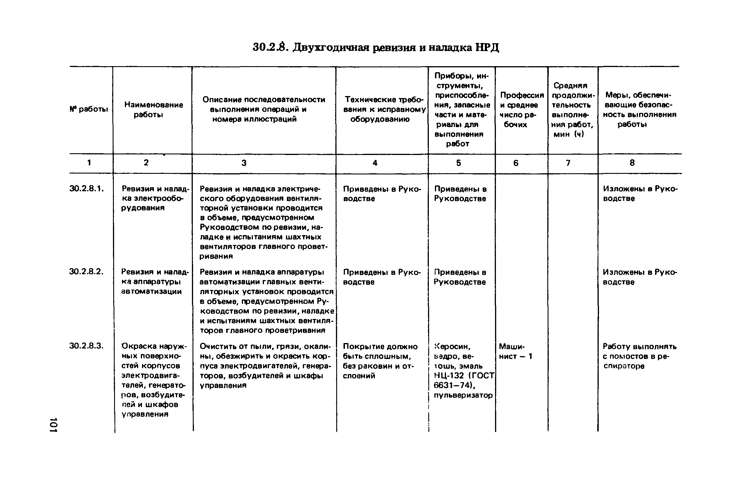 | Оглавление: | 1. Введение 2. Указание мер безопасности Меры безопасности при техническом обслуживании и ремонте механического оборудования вентиляторных установок Меры безопасности при Техническом обслуживании и ремонте электрооборудования вентиляторных установок Противопожарные мероприятия 3. Состав вентиляторной установки 4. Правила хранения оборудования шахтных вентиляторных установок 5. Организация смазочного хозяйства 6. Ревизия, наладка и испытания шахтной вентиляторной установки 7. Техническое обслуживание и текущий ремонт 8. Технологические карты технического обслуживания и ремонта вентиля торной установки главного проветривания 8.1. Технологическая карта технического обслуживания и ремонта осевого вентилятора главного проветривания 31.1.1. Ежесменное техническое обслуживание ТО1 31.1.2. Ежесуточное техническое обслуживание ТО2 31.1.3. Двухнедельное техническое обслуживание ТО4 31.1.4. Ежемесячное ремонтное обслуживание РО1 31.1.5. Ежеквартальный текущий ремонт Т1 31.1.6. Полугодовой текущий ремонт Т2 31.1.7. Годовая ревизия и наладка (НРГ) 31.1.8. Двухгодичная ревизия и наладка (НРД) 8.2. Технологическая карта технического обслуживания и ремонта центробежного вентилятора главного проветривания 32.1.1. Ежесменное техническое обслуживание ТО1 32.1.2. Ежесуточное техническое обслуживание ТО2 32.1.3. Двухнедельное техническое обслуживание ТО4 32.1.4. Ежемесячное ремонтное обслуживание РО1 32.1.5. Ежеквартальный текущий ремонт Т1 32.1.6. Полугодовой текущий ремонт Т2 32.1.7. Годовая ревизия и наладка НРГ 32.1.8. двухгодичная ревизия и наладка НРД 9. Технологическая карта технического обслуживания и ремонта электрического оборудования вентиляторной установки главного проветривания 30.2.1. Ежесменное техническое обслуживание ТО1 30.2.2. Ежесуточное техническое обслуживание ТО2 30.2.3. Двухнедельное техническое обслуживание ТО4 30.2.4. Ежемесячное ремонтное обслуживание РО1 30.2.5. Ежеквартальный текущий ремонт Т1 30.2.6. Полугодовой текущий ремонт Т2 30.2.7. Годовая ревизия и наладка НРГ 30.2.8. Двухгодичная ревизия и наладка НРД 10. Технологическая карта технического обслуживания и ремонта вспомогательного оборудования вентиляторной установки главного проветривания 30.3.1. Ежесменное техническое обслуживание ТО1 30.3.2. Ежесуточное техническое обслуживание ТО2 30.3.3. двухнедельное техническое обслуживание ТО4 30.3.4. Ежемесячное ремонтное обслуживание РО1 30.3.5. Полугодовой текущий ремонт Т2 30.3.6. Годовая ревизия и наладка НРГ 30.3.7. двухгодичная ревизия и наладка НРД 11. Возможные неисправности и методы их устранения 11.1. Возможные неисправности вентиляторов и методы их устранения 11.2. Возможные неисправности электрического оборудования и методы их устранения 11.3. Возможные неисправности вспомогательного оборудования и методы их устранения Список литературы |