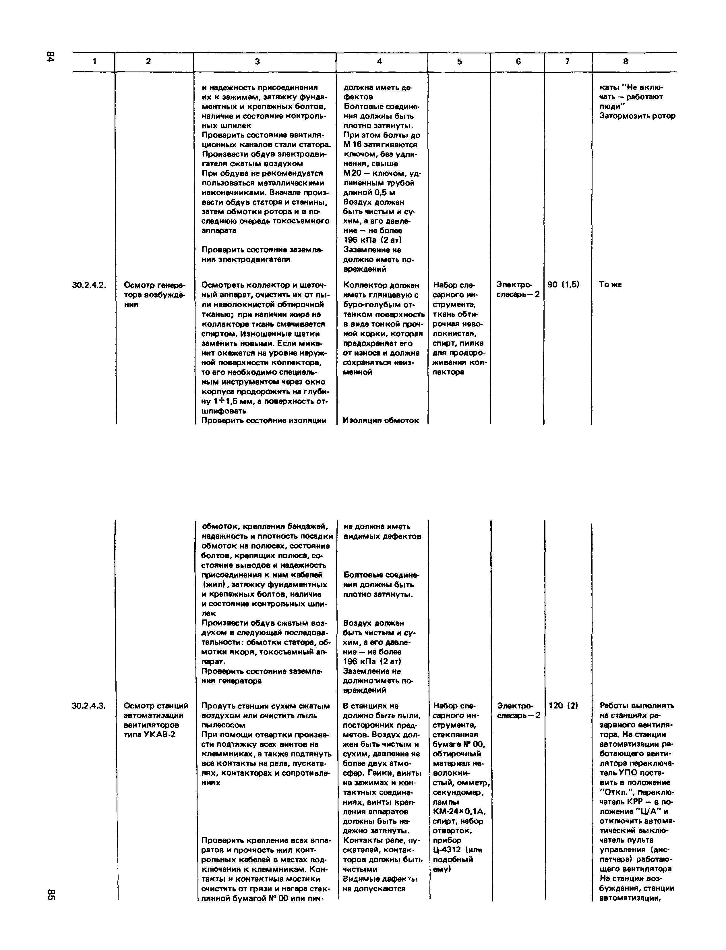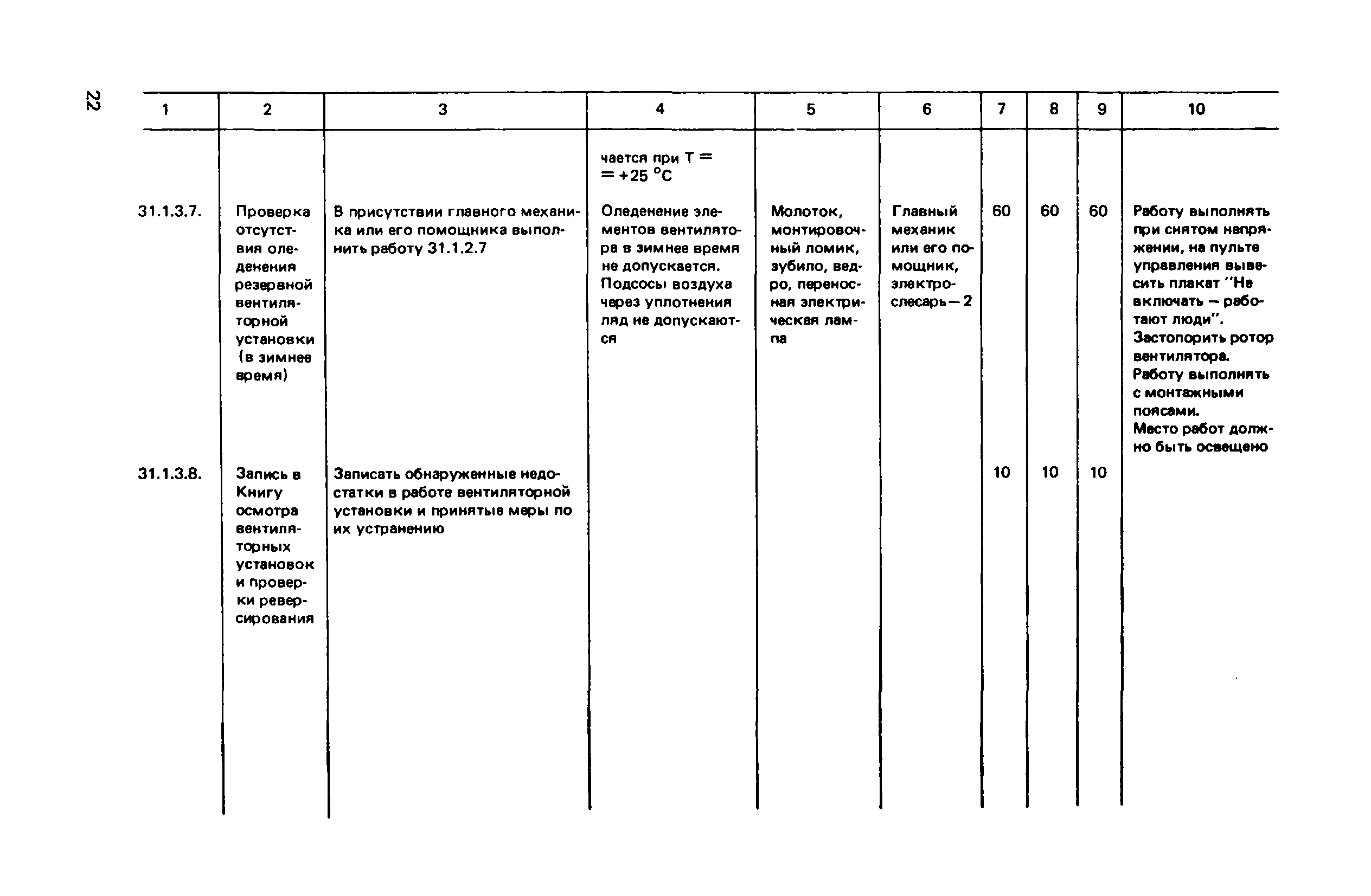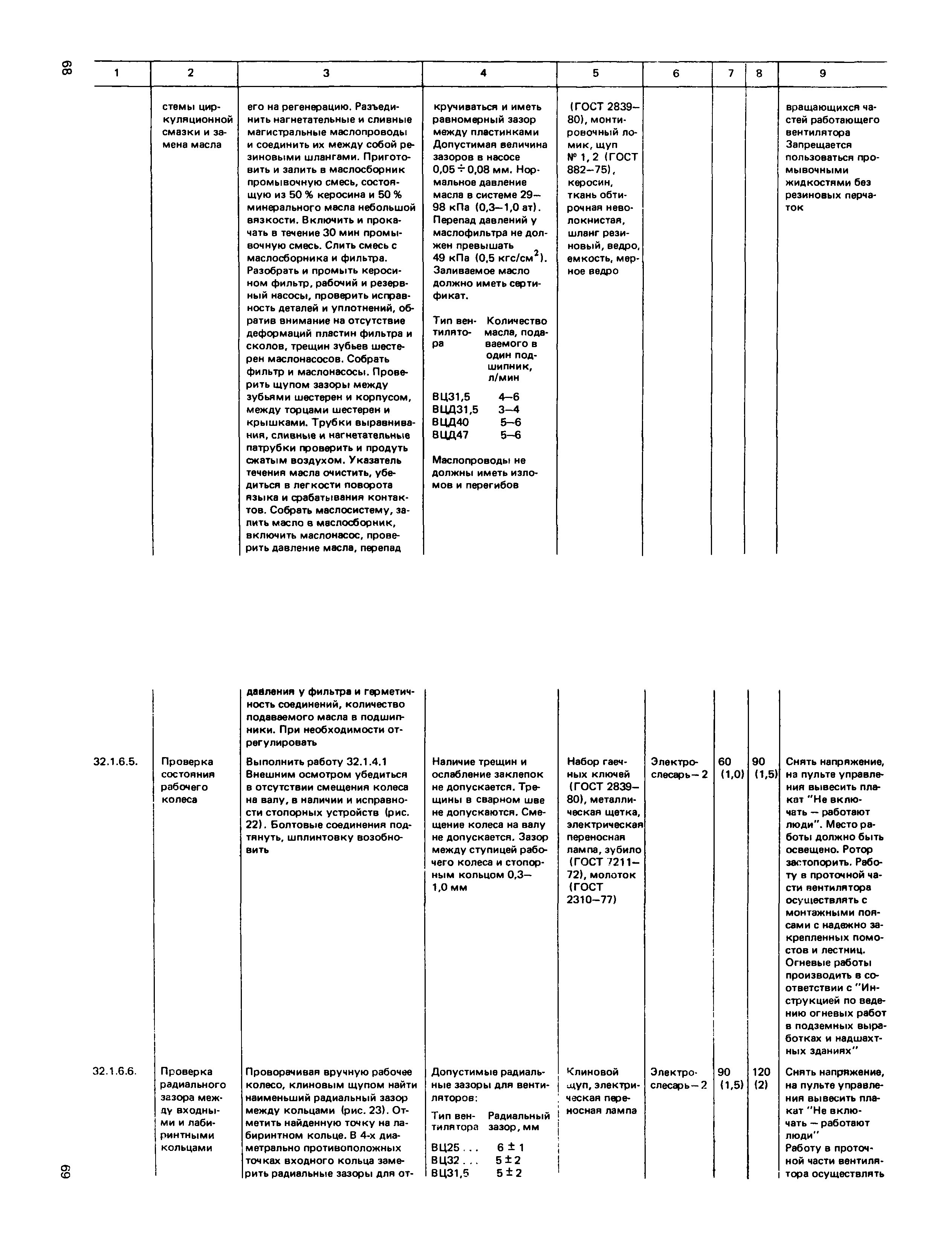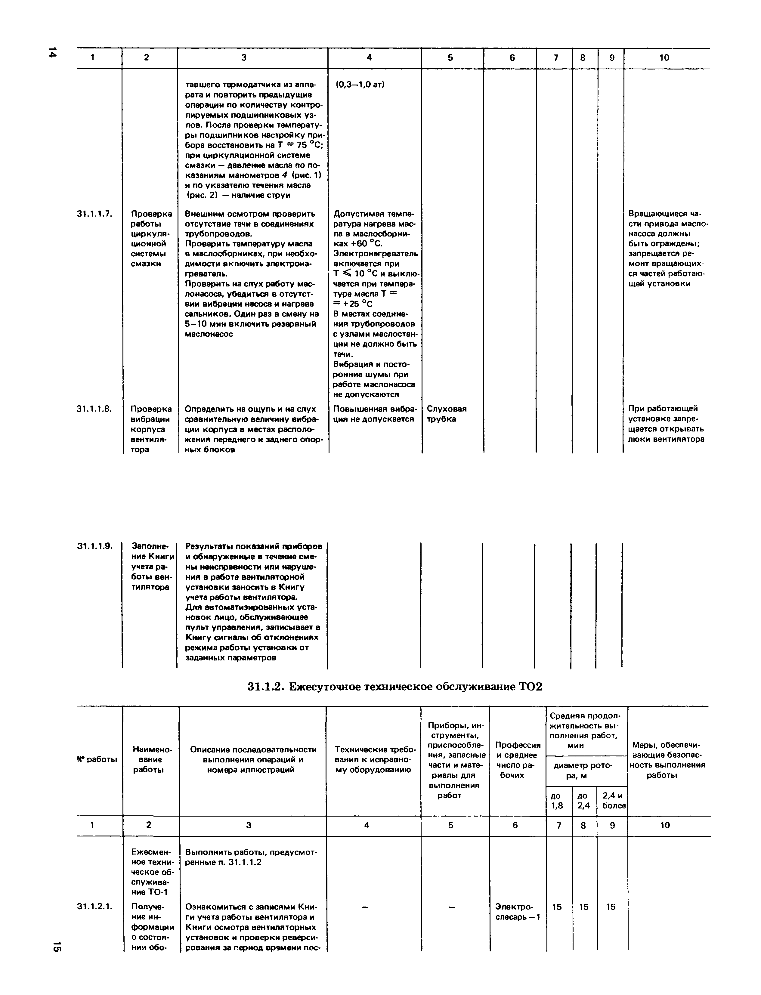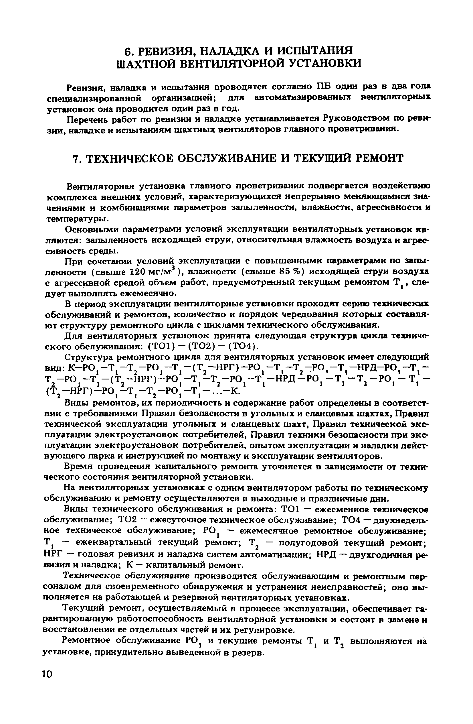 | Оглавление: | 1. Введение 2. Указание мер безопасности Меры безопасности при техническом обслуживании и ремонте механического оборудования вентиляторных установок Меры безопасности при Техническом обслуживании и ремонте электрооборудования вентиляторных установок Противопожарные мероприятия 3. Состав вентиляторной установки 4. Правила хранения оборудования шахтных вентиляторных установок 5. Организация смазочного хозяйства 6. Ревизия, наладка и испытания шахтной вентиляторной установки 7. Техническое обслуживание и текущий ремонт 8. Технологические карты технического обслуживания и ремонта вентиля торной установки главного проветривания 8.1. Технологическая карта технического обслуживания и ремонта осевого вентилятора главного проветривания 31.1.1. Ежесменное техническое обслуживание ТО1 31.1.2. Ежесуточное техническое обслуживание ТО2 31.1.3. Двухнедельное техническое обслуживание ТО4 31.1.4. Ежемесячное ремонтное обслуживание РО1 31.1.5. Ежеквартальный текущий ремонт Т1 31.1.6. Полугодовой текущий ремонт Т2 31.1.7. Годовая ревизия и наладка (НРГ) 31.1.8. Двухгодичная ревизия и наладка (НРД) 8.2. Технологическая карта технического обслуживания и ремонта центробежного вентилятора главного проветривания 32.1.1. Ежесменное техническое обслуживание ТО1 32.1.2. Ежесуточное техническое обслуживание ТО2 32.1.3. Двухнедельное техническое обслуживание ТО4 32.1.4. Ежемесячное ремонтное обслуживание РО1 32.1.5. Ежеквартальный текущий ремонт Т1 32.1.6. Полугодовой текущий ремонт Т2 32.1.7. Годовая ревизия и наладка НРГ 32.1.8. двухгодичная ревизия и наладка НРД 9. Технологическая карта технического обслуживания и ремонта электрического оборудования вентиляторной установки главного проветривания 30.2.1. Ежесменное техническое обслуживание ТО1 30.2.2. Ежесуточное техническое обслуживание ТО2 30.2.3. Двухнедельное техническое обслуживание ТО4 30.2.4. Ежемесячное ремонтное обслуживание РО1 30.2.5. Ежеквартальный текущий ремонт Т1 30.2.6. Полугодовой текущий ремонт Т2 30.2.7. Годовая ревизия и наладка НРГ 30.2.8. Двухгодичная ревизия и наладка НРД 10. Технологическая карта технического обслуживания и ремонта вспомогательного оборудования вентиляторной установки главного проветривания 30.3.1. Ежесменное техническое обслуживание ТО1 30.3.2. Ежесуточное техническое обслуживание ТО2 30.3.3. двухнедельное техническое обслуживание ТО4 30.3.4. Ежемесячное ремонтное обслуживание РО1 30.3.5. Полугодовой текущий ремонт Т2 30.3.6. Годовая ревизия и наладка НРГ 30.3.7. двухгодичная ревизия и наладка НРД 11. Возможные неисправности и методы их устранения 11.1. Возможные неисправности вентиляторов и методы их устранения 11.2. Возможные неисправности электрического оборудования и методы их устранения 11.3. Возможные неисправности вспомогательного оборудования и методы их устранения Список литературы |