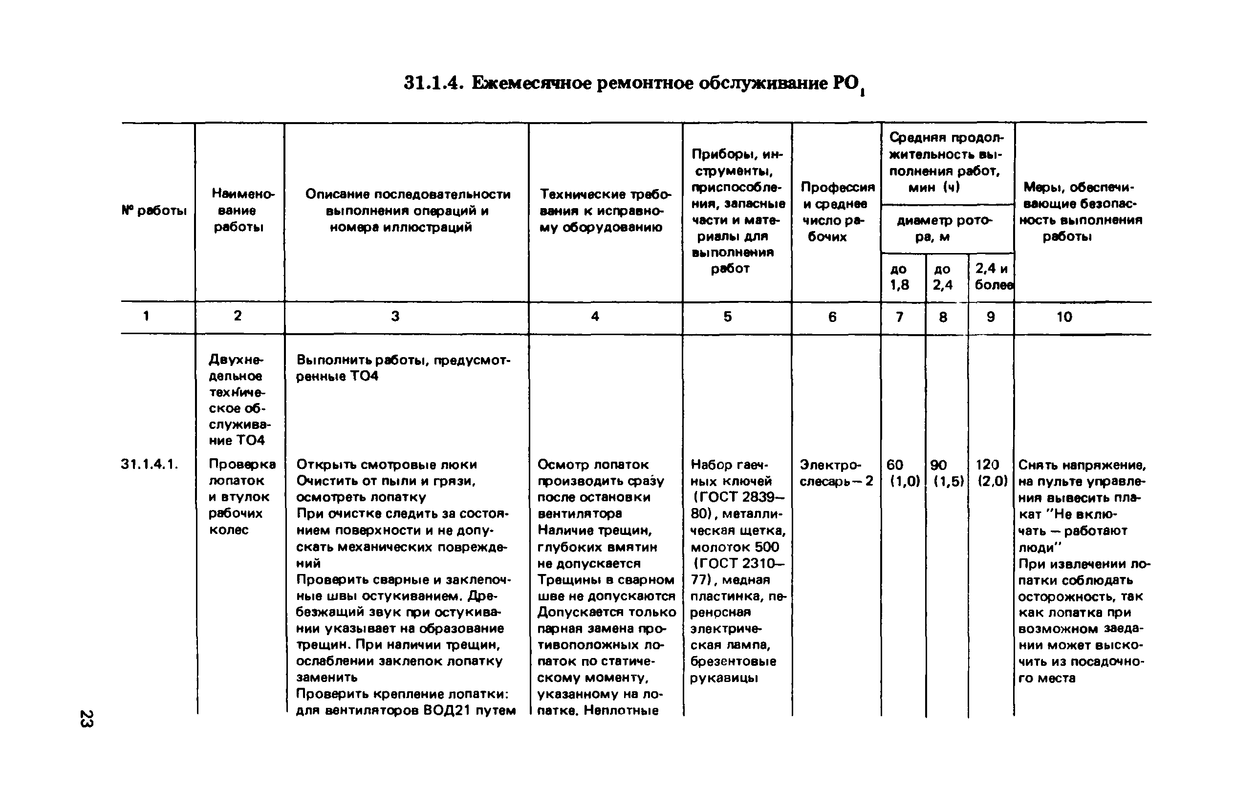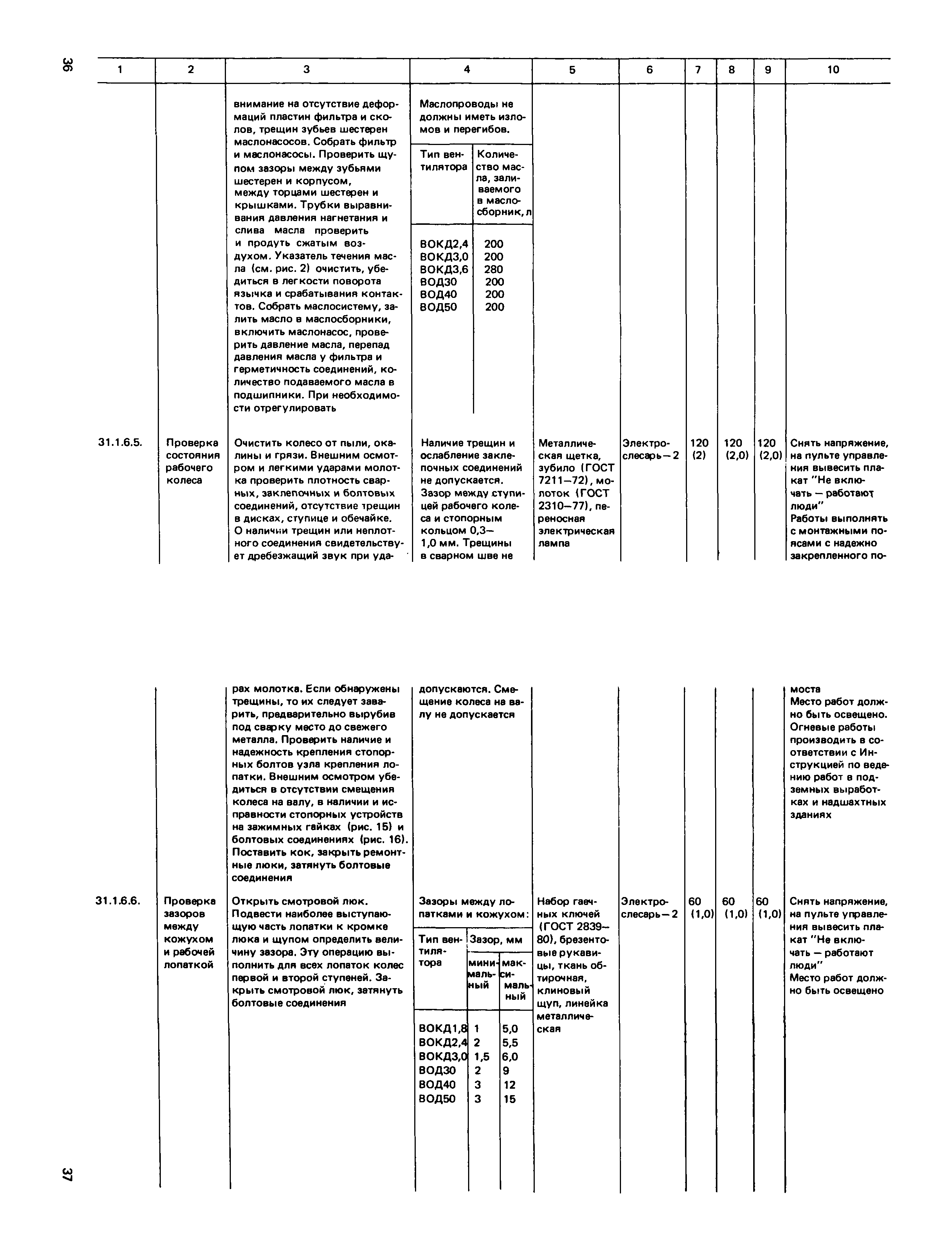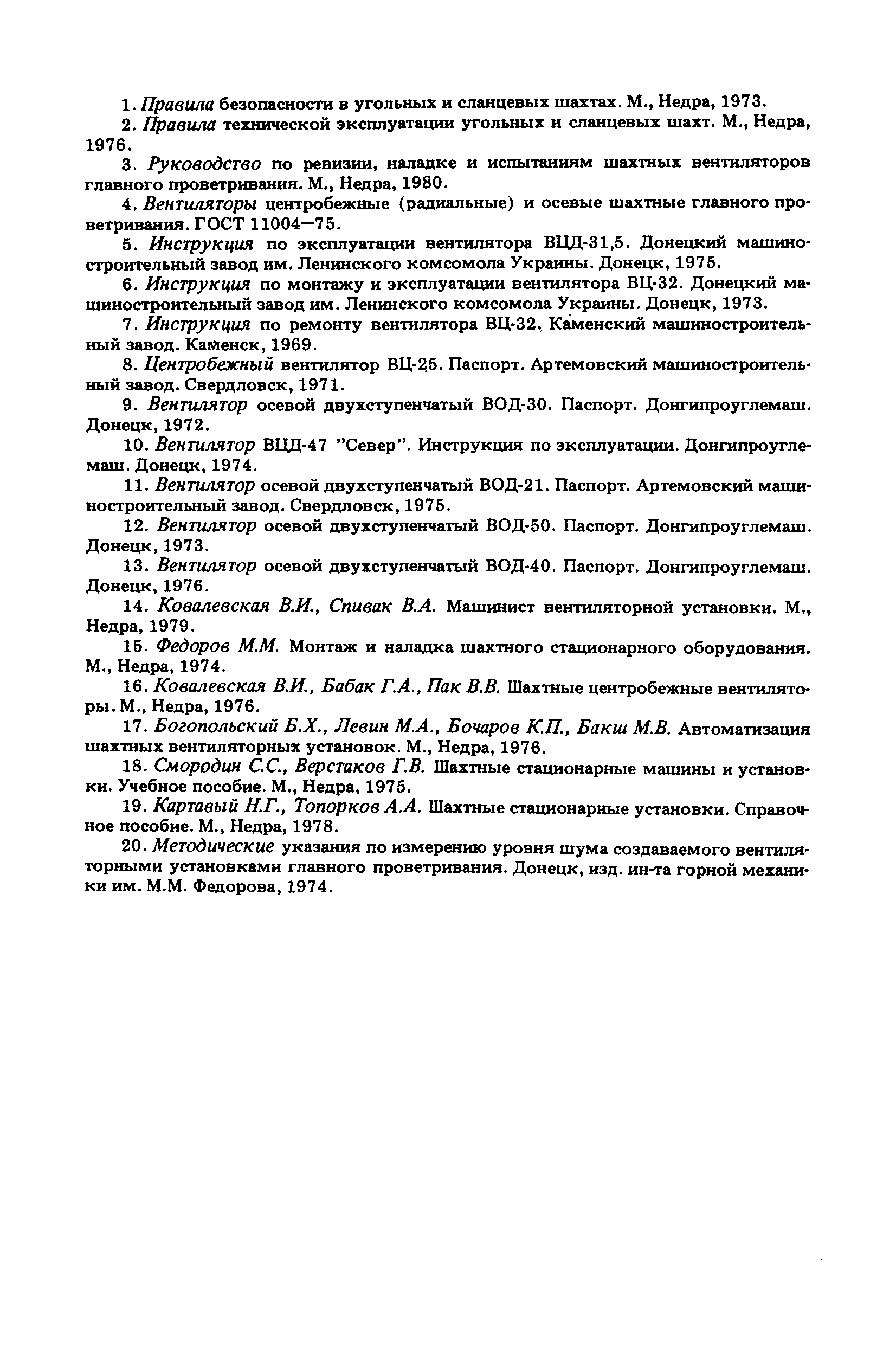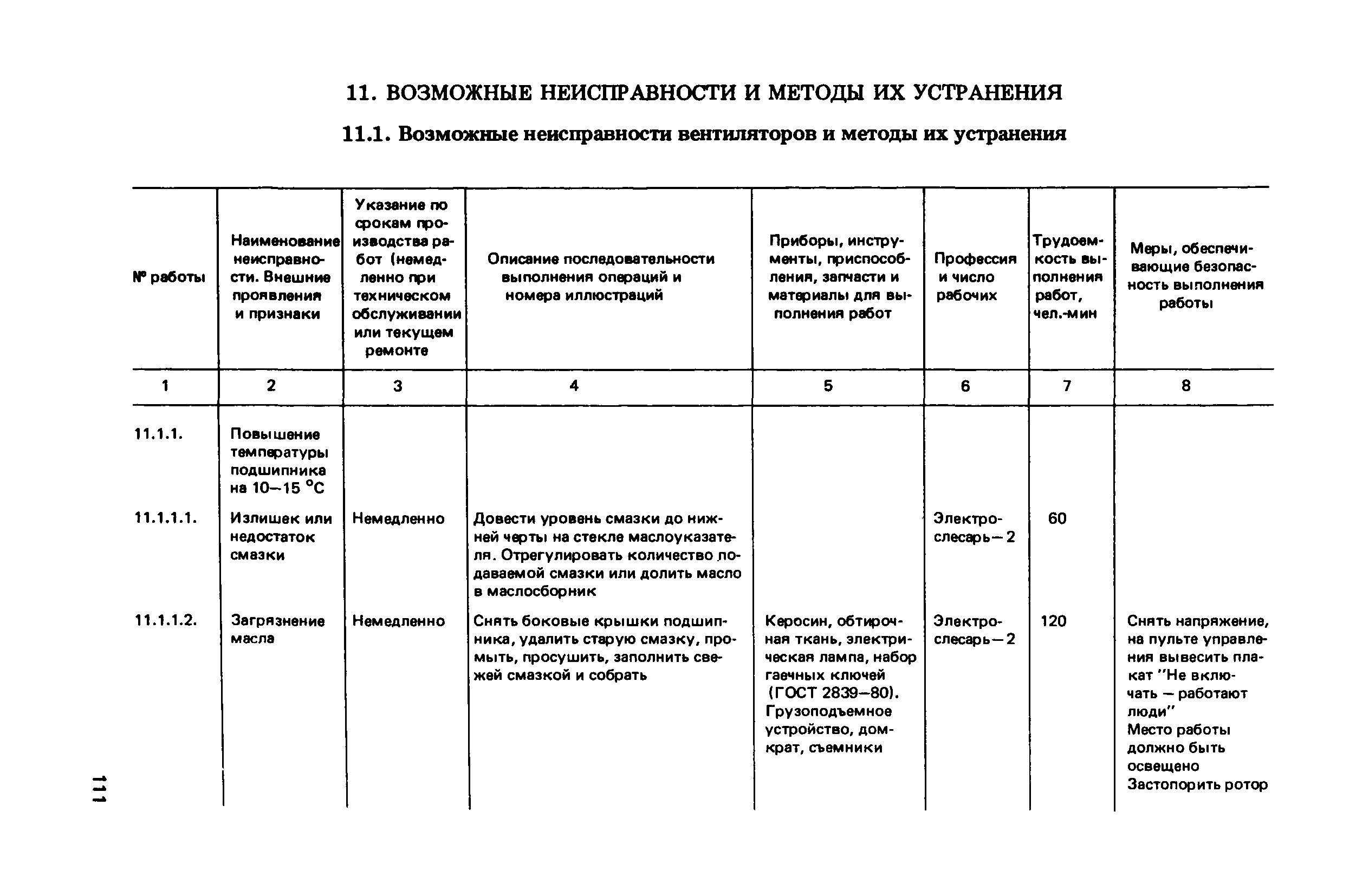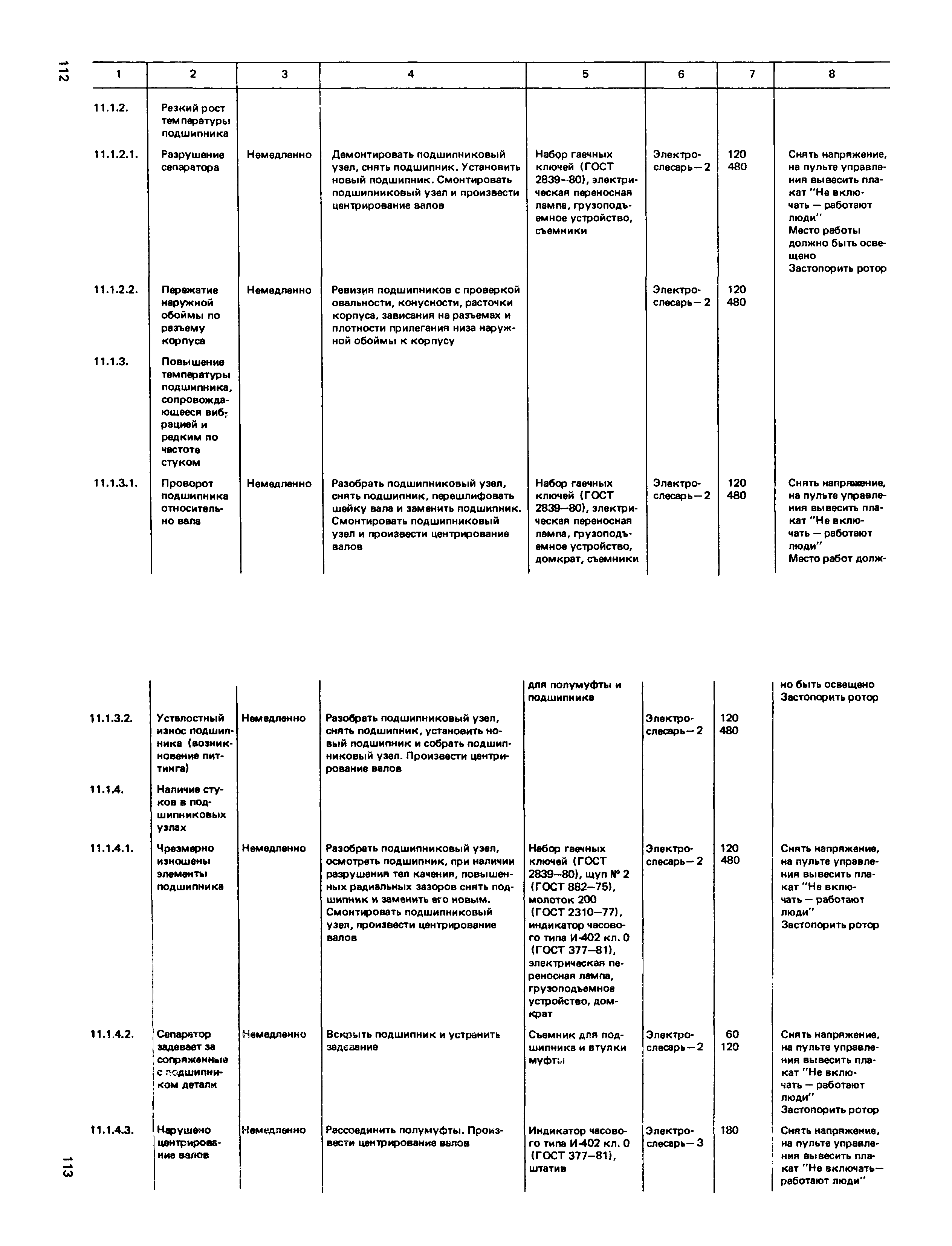 | Оглавление: | 1. Введение 2. Указание мер безопасности Меры безопасности при техническом обслуживании и ремонте механического оборудования вентиляторных установок Меры безопасности при Техническом обслуживании и ремонте электрооборудования вентиляторных установок Противопожарные мероприятия 3. Состав вентиляторной установки 4. Правила хранения оборудования шахтных вентиляторных установок 5. Организация смазочного хозяйства 6. Ревизия, наладка и испытания шахтной вентиляторной установки 7. Техническое обслуживание и текущий ремонт 8. Технологические карты технического обслуживания и ремонта вентиля торной установки главного проветривания 8.1. Технологическая карта технического обслуживания и ремонта осевого вентилятора главного проветривания 31.1.1. Ежесменное техническое обслуживание ТО1 31.1.2. Ежесуточное техническое обслуживание ТО2 31.1.3. Двухнедельное техническое обслуживание ТО4 31.1.4. Ежемесячное ремонтное обслуживание РО1 31.1.5. Ежеквартальный текущий ремонт Т1 31.1.6. Полугодовой текущий ремонт Т2 31.1.7. Годовая ревизия и наладка (НРГ) 31.1.8. Двухгодичная ревизия и наладка (НРД) 8.2. Технологическая карта технического обслуживания и ремонта центробежного вентилятора главного проветривания 32.1.1. Ежесменное техническое обслуживание ТО1 32.1.2. Ежесуточное техническое обслуживание ТО2 32.1.3. Двухнедельное техническое обслуживание ТО4 32.1.4. Ежемесячное ремонтное обслуживание РО1 32.1.5. Ежеквартальный текущий ремонт Т1 32.1.6. Полугодовой текущий ремонт Т2 32.1.7. Годовая ревизия и наладка НРГ 32.1.8. двухгодичная ревизия и наладка НРД 9. Технологическая карта технического обслуживания и ремонта электрического оборудования вентиляторной установки главного проветривания 30.2.1. Ежесменное техническое обслуживание ТО1 30.2.2. Ежесуточное техническое обслуживание ТО2 30.2.3. Двухнедельное техническое обслуживание ТО4 30.2.4. Ежемесячное ремонтное обслуживание РО1 30.2.5. Ежеквартальный текущий ремонт Т1 30.2.6. Полугодовой текущий ремонт Т2 30.2.7. Годовая ревизия и наладка НРГ 30.2.8. Двухгодичная ревизия и наладка НРД 10. Технологическая карта технического обслуживания и ремонта вспомогательного оборудования вентиляторной установки главного проветривания 30.3.1. Ежесменное техническое обслуживание ТО1 30.3.2. Ежесуточное техническое обслуживание ТО2 30.3.3. двухнедельное техническое обслуживание ТО4 30.3.4. Ежемесячное ремонтное обслуживание РО1 30.3.5. Полугодовой текущий ремонт Т2 30.3.6. Годовая ревизия и наладка НРГ 30.3.7. двухгодичная ревизия и наладка НРД 11. Возможные неисправности и методы их устранения 11.1. Возможные неисправности вентиляторов и методы их устранения 11.2. Возможные неисправности электрического оборудования и методы их устранения 11.3. Возможные неисправности вспомогательного оборудования и методы их устранения Список литературы |