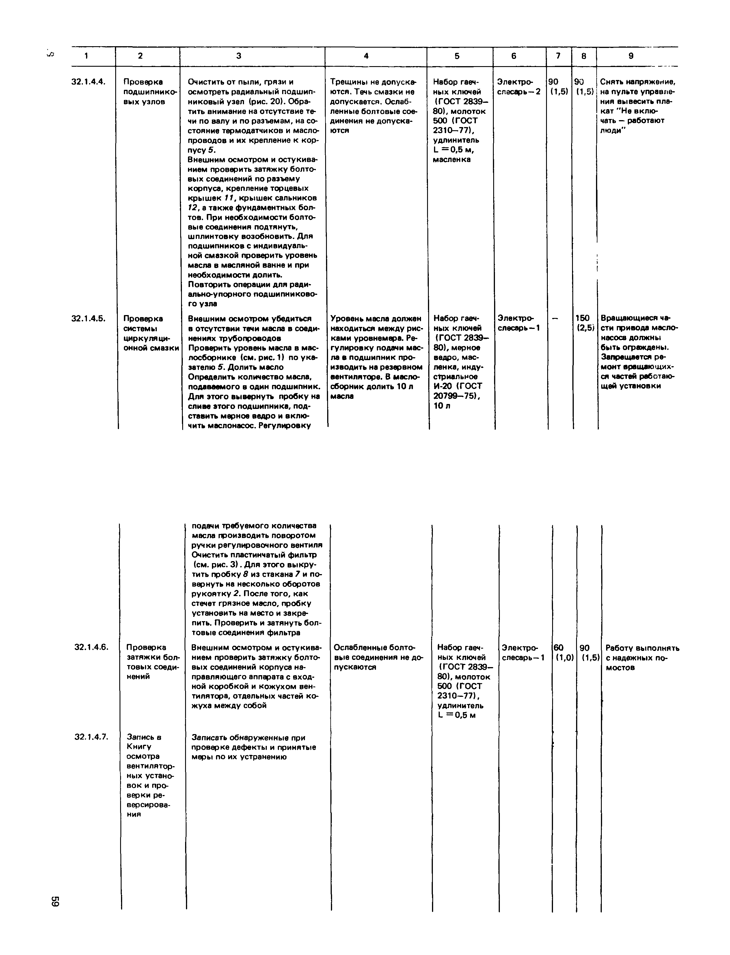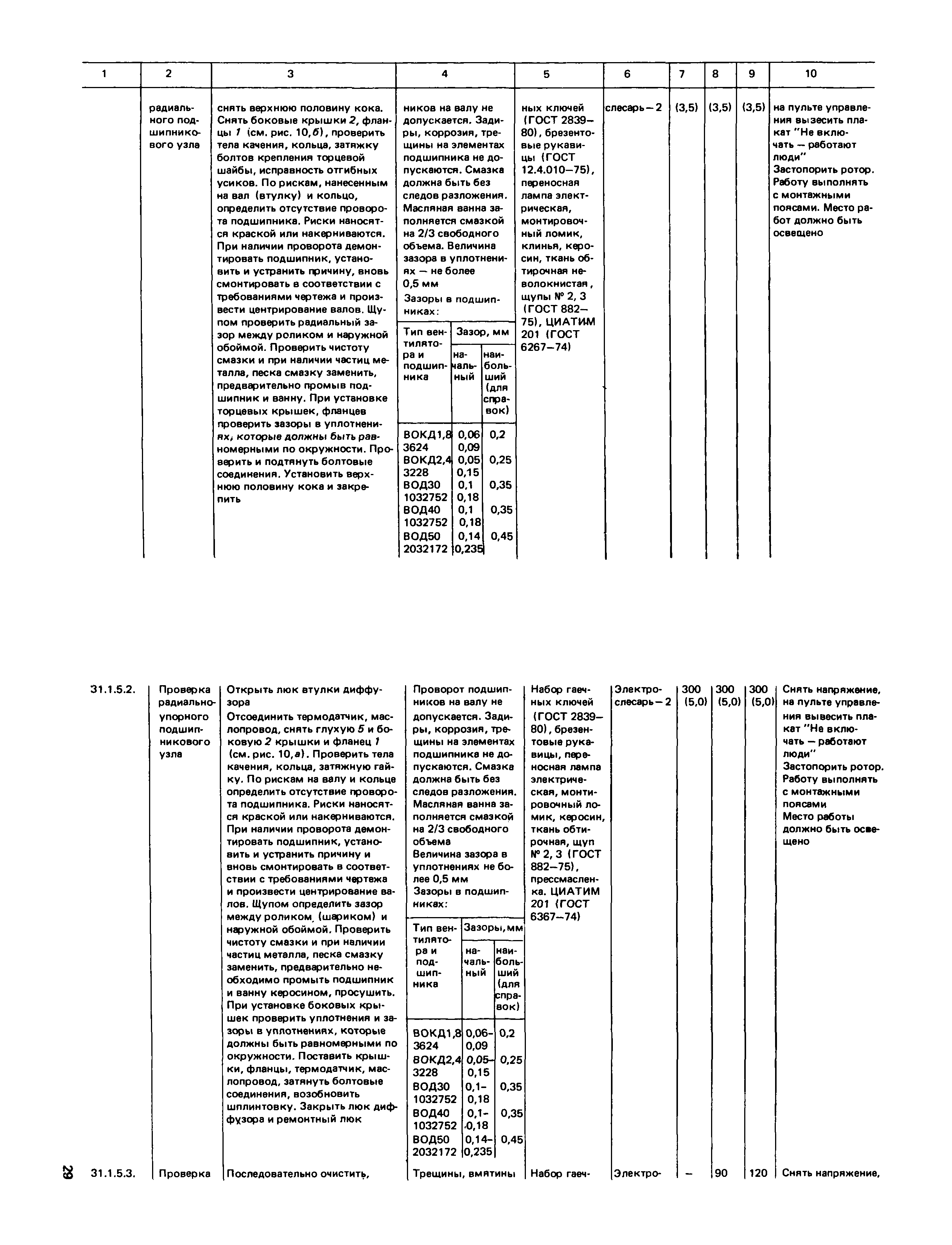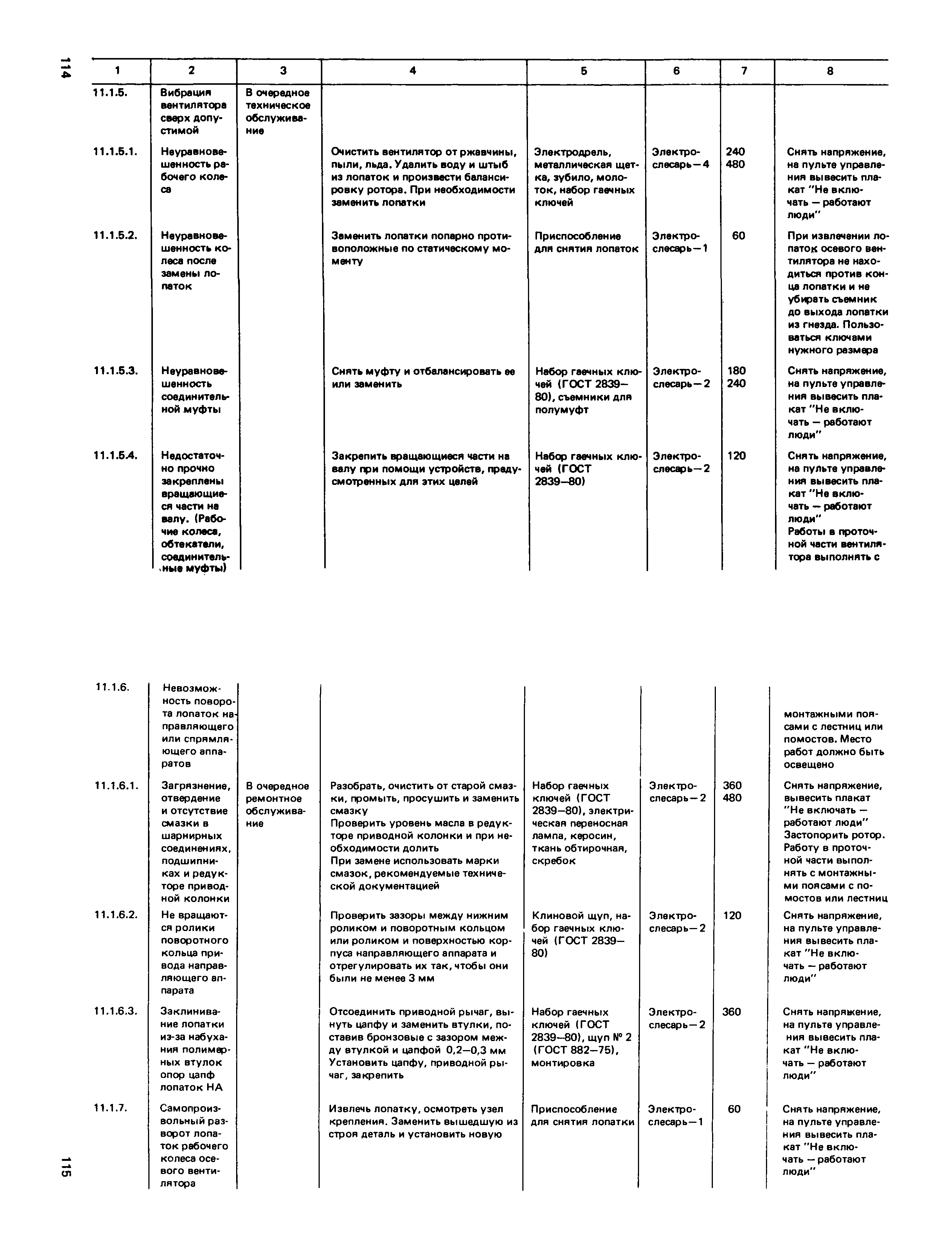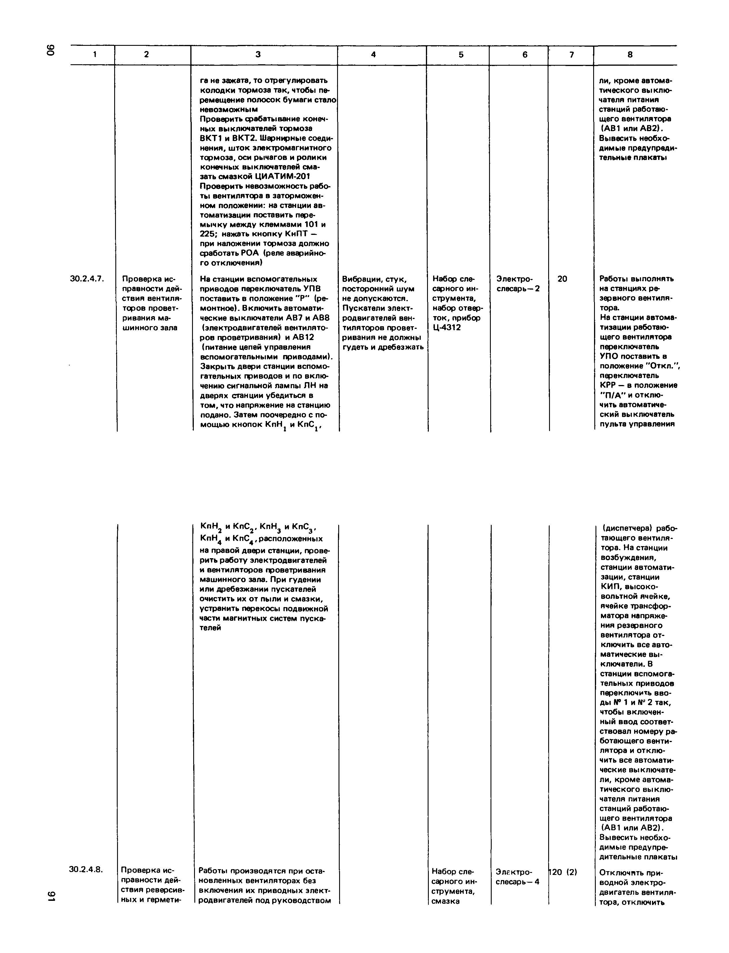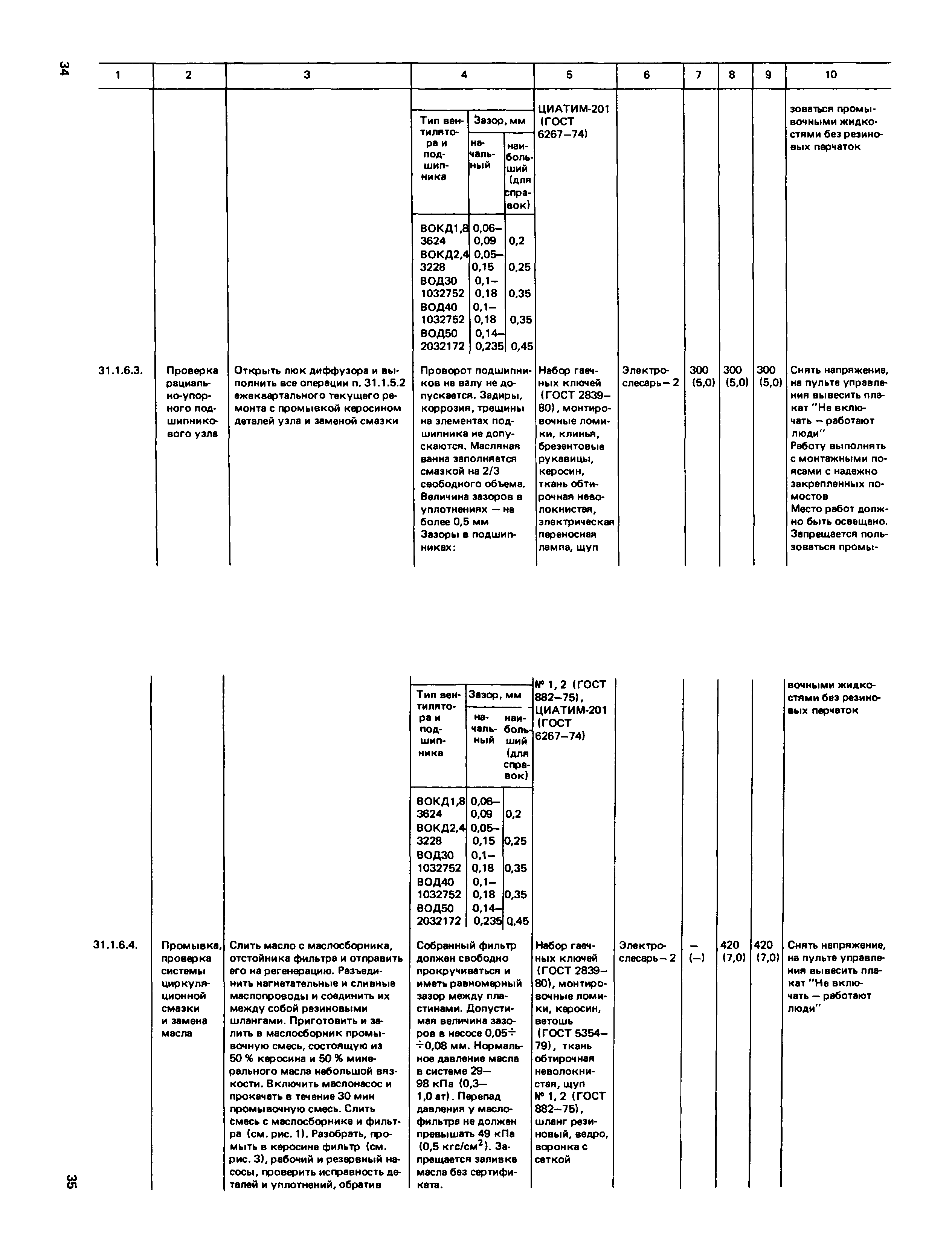 | Оглавление: | 1. Введение 2. Указание мер безопасности Меры безопасности при техническом обслуживании и ремонте механического оборудования вентиляторных установок Меры безопасности при Техническом обслуживании и ремонте электрооборудования вентиляторных установок Противопожарные мероприятия 3. Состав вентиляторной установки 4. Правила хранения оборудования шахтных вентиляторных установок 5. Организация смазочного хозяйства 6. Ревизия, наладка и испытания шахтной вентиляторной установки 7. Техническое обслуживание и текущий ремонт 8. Технологические карты технического обслуживания и ремонта вентиля торной установки главного проветривания 8.1. Технологическая карта технического обслуживания и ремонта осевого вентилятора главного проветривания 31.1.1. Ежесменное техническое обслуживание ТО1 31.1.2. Ежесуточное техническое обслуживание ТО2 31.1.3. Двухнедельное техническое обслуживание ТО4 31.1.4. Ежемесячное ремонтное обслуживание РО1 31.1.5. Ежеквартальный текущий ремонт Т1 31.1.6. Полугодовой текущий ремонт Т2 31.1.7. Годовая ревизия и наладка (НРГ) 31.1.8. Двухгодичная ревизия и наладка (НРД) 8.2. Технологическая карта технического обслуживания и ремонта центробежного вентилятора главного проветривания 32.1.1. Ежесменное техническое обслуживание ТО1 32.1.2. Ежесуточное техническое обслуживание ТО2 32.1.3. Двухнедельное техническое обслуживание ТО4 32.1.4. Ежемесячное ремонтное обслуживание РО1 32.1.5. Ежеквартальный текущий ремонт Т1 32.1.6. Полугодовой текущий ремонт Т2 32.1.7. Годовая ревизия и наладка НРГ 32.1.8. двухгодичная ревизия и наладка НРД 9. Технологическая карта технического обслуживания и ремонта электрического оборудования вентиляторной установки главного проветривания 30.2.1. Ежесменное техническое обслуживание ТО1 30.2.2. Ежесуточное техническое обслуживание ТО2 30.2.3. Двухнедельное техническое обслуживание ТО4 30.2.4. Ежемесячное ремонтное обслуживание РО1 30.2.5. Ежеквартальный текущий ремонт Т1 30.2.6. Полугодовой текущий ремонт Т2 30.2.7. Годовая ревизия и наладка НРГ 30.2.8. Двухгодичная ревизия и наладка НРД 10. Технологическая карта технического обслуживания и ремонта вспомогательного оборудования вентиляторной установки главного проветривания 30.3.1. Ежесменное техническое обслуживание ТО1 30.3.2. Ежесуточное техническое обслуживание ТО2 30.3.3. двухнедельное техническое обслуживание ТО4 30.3.4. Ежемесячное ремонтное обслуживание РО1 30.3.5. Полугодовой текущий ремонт Т2 30.3.6. Годовая ревизия и наладка НРГ 30.3.7. двухгодичная ревизия и наладка НРД 11. Возможные неисправности и методы их устранения 11.1. Возможные неисправности вентиляторов и методы их устранения 11.2. Возможные неисправности электрического оборудования и методы их устранения 11.3. Возможные неисправности вспомогательного оборудования и методы их устранения Список литературы |