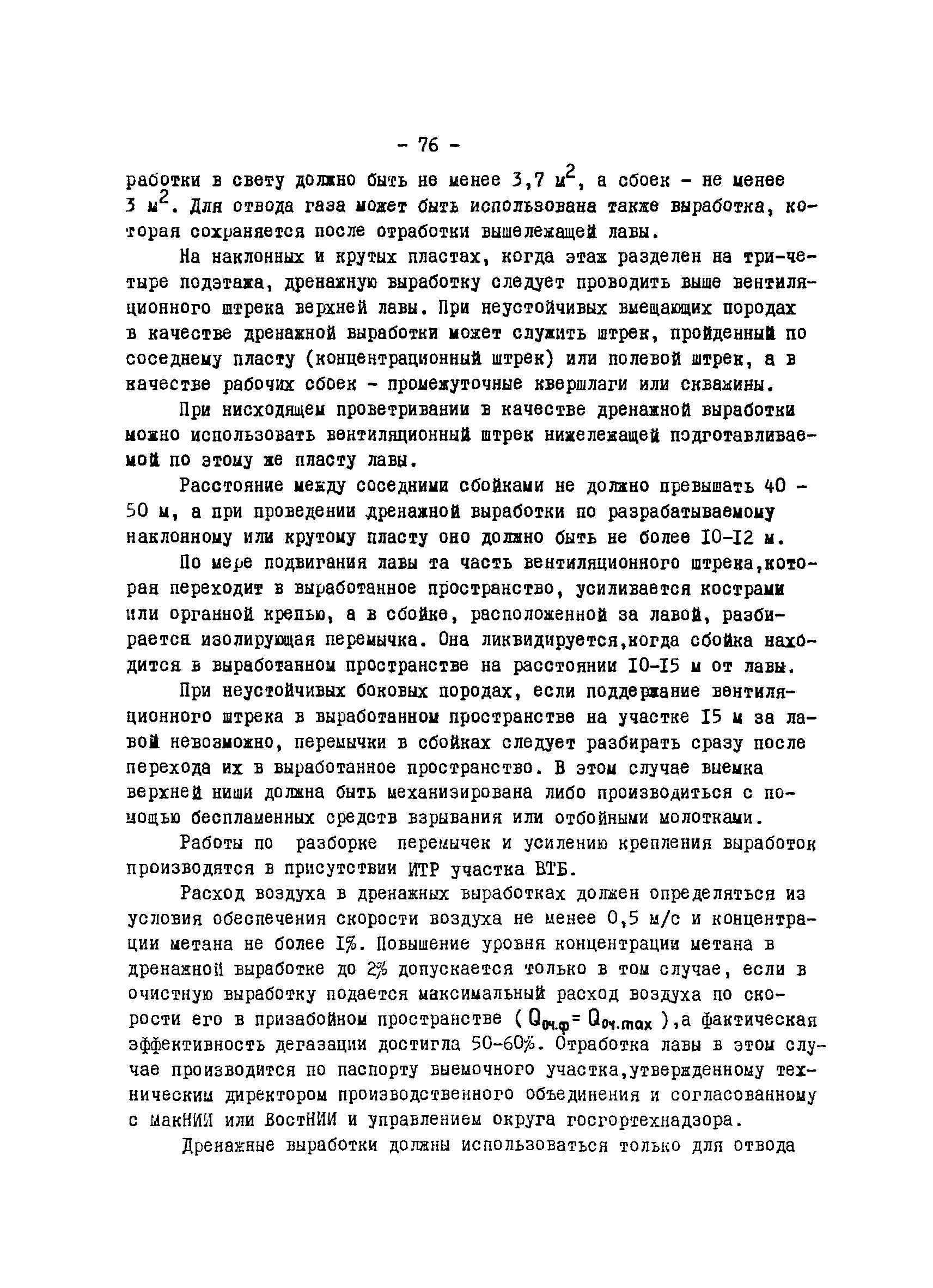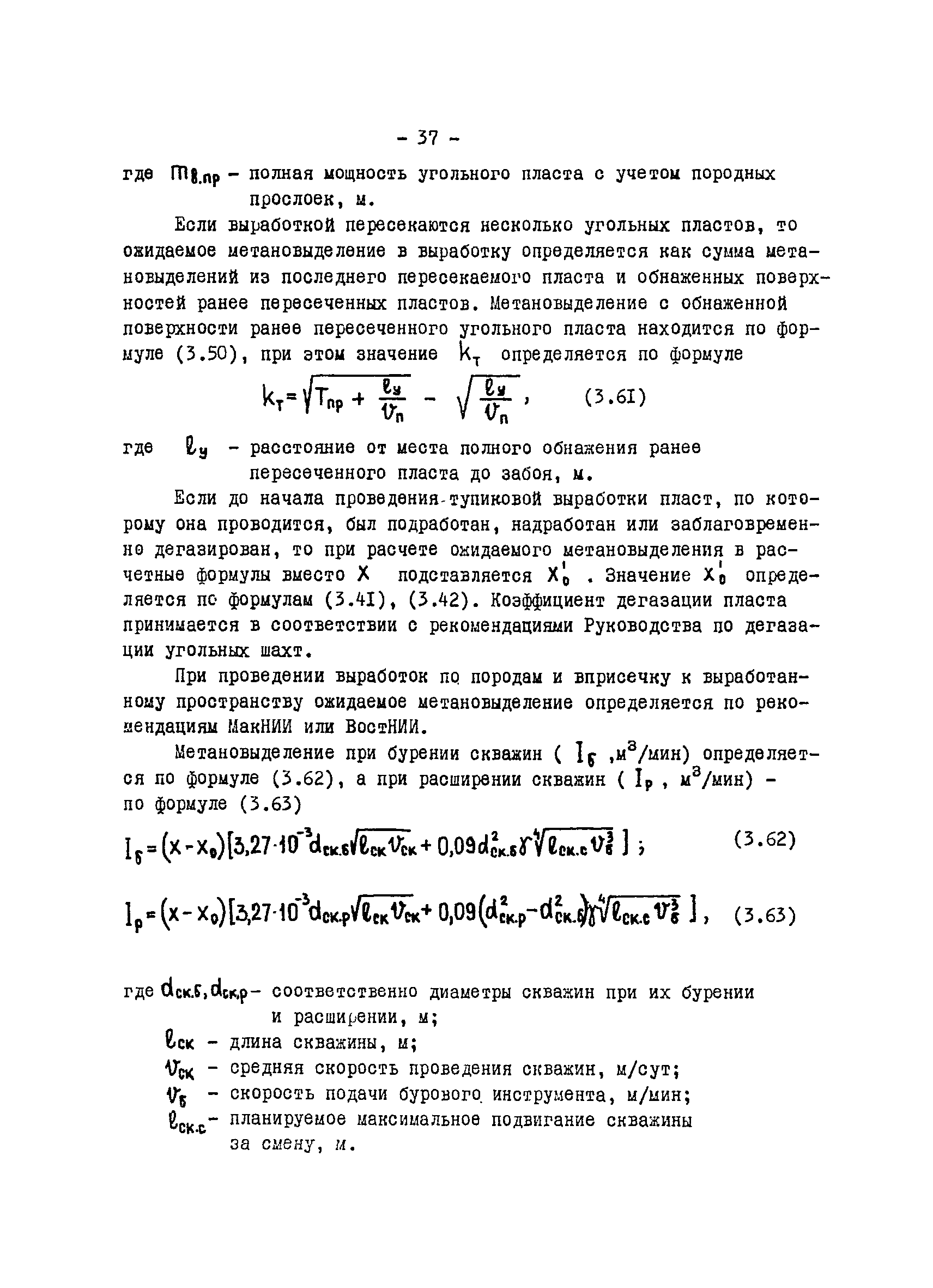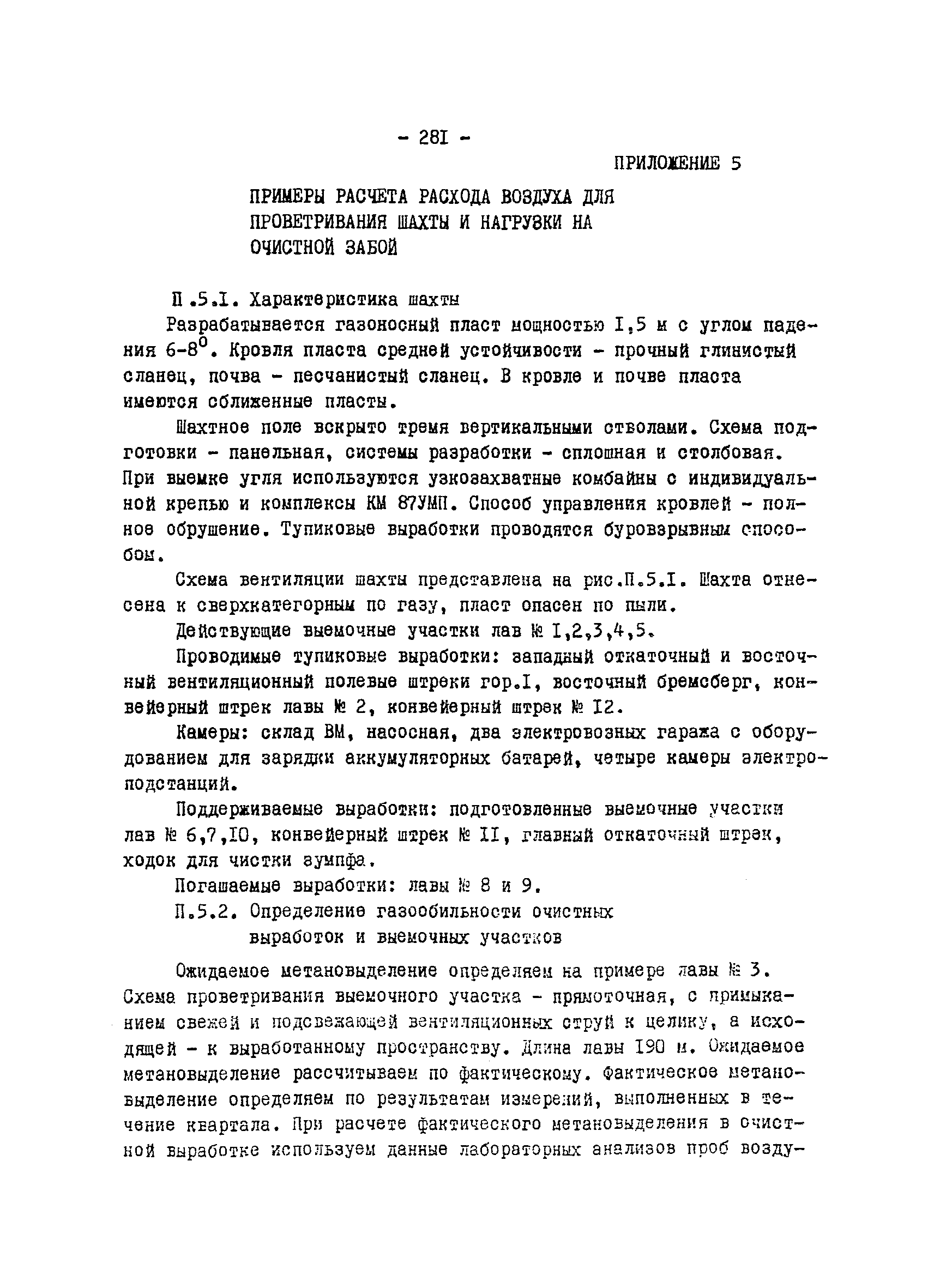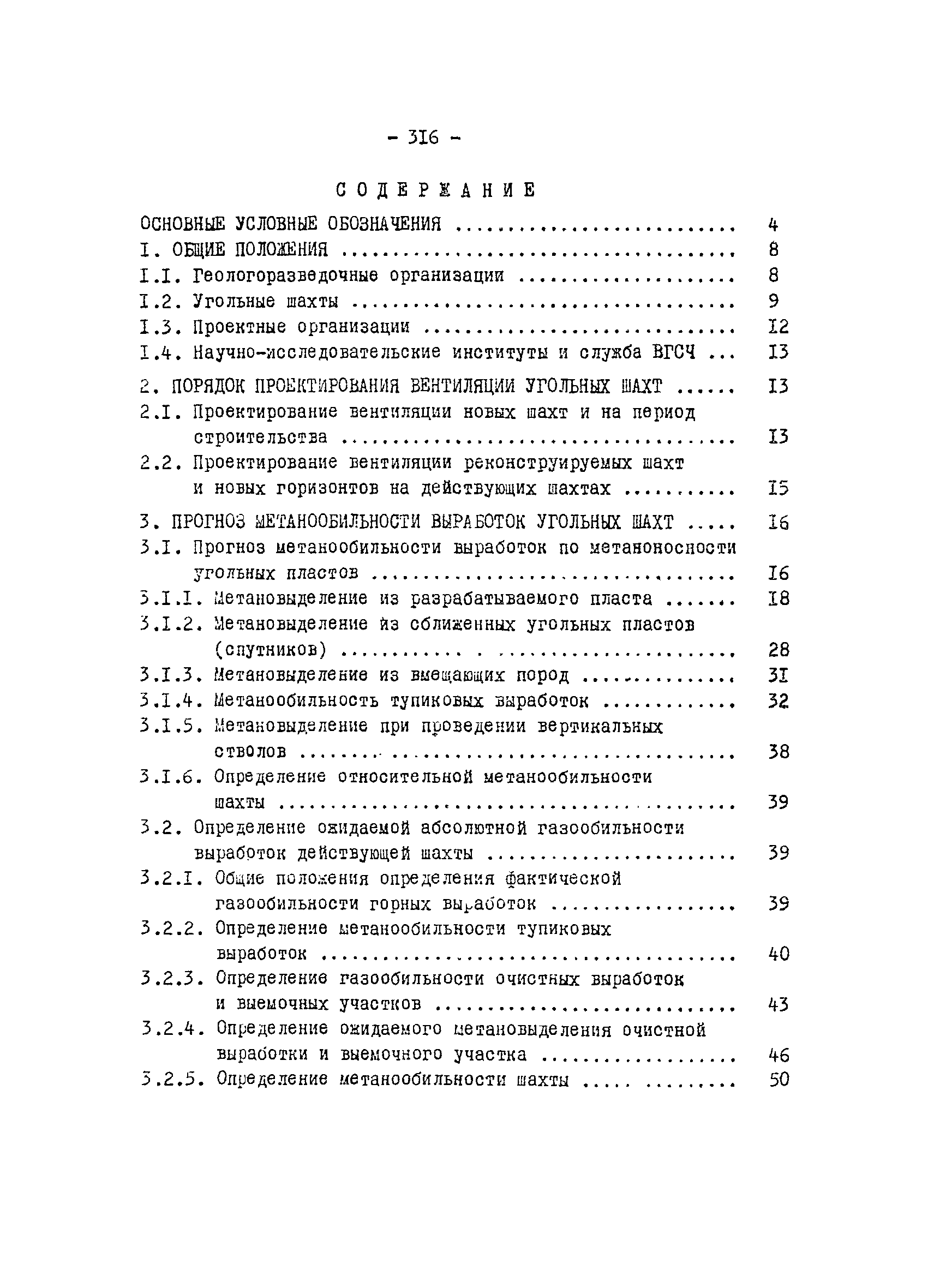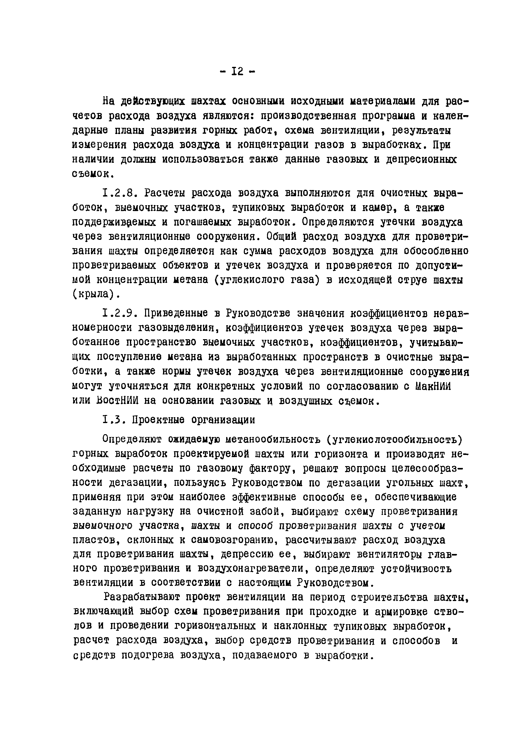 | Оглавление: | Основные условные обозначения 1. Общие положения 1.1. Геологоразведочные организация 1.2. Угольные шахты 1.3. Проектные организации 1.4. Научно-исследовательские институты и служба ВГСЧ 2. Порядок проектирования вентиляции угольных вахт 2.1. Проектирование вентиляции новых шахт и на период строительства 2.2. Проектирование вентиляции реконструируемых шахт и новых горизонтов на действующих шахтах 3. Прогноз метанообильности выработок угольных шахт 3.1. Прогноз метанообильности выработок по метаноносности угольных пластов 3.1.1. Метановыделение из разрабатываемого пласта 3.1.2. Метановыделение из сближенных угольных пластов (спутников) 3.1.3. Метановыделение из вмещающих пород 3.1.4. Метан обильность тупиковых выработок 3.1.5. Метановыделение при проведении вертикальных стволов 3.1.6. Определение относительной метанообильности шахты 3.2. Определение ожидаемой абсолютной газообильности выработок действующей шахты 3.2.1. Общие положения определения фактической газообильности горных выработок 3.2.2. Определение метанообильности тупиковых выработок 3.2.3. Определение газообильности очистных выработок и выемочных участков 3.2.4. Определение ожидаемого метановыделения очистной выработки и выемочного участка 3.2.5. Определение метанообильности шахты 4. Прогноз углекислотообильности горных выработок 4.1. Прогноз углекислотообильности горных выработок по степени метаморфизма углей 4.1.1. Углекислотообильность выемочного участка 4.1.2. Углекислотообильность тупиковых выработок 4.1.3. Углекислотообильность шахтопласта и шахты 4.2. Определение ожидаемой углекислотообильности выработок действующей шахты 4.2.1. Определение углекислотообильности очистных выработок и выемочных участков 4.2.2. Определение углекислотообильности тупиковых выработок 4.2.3. Определение углекислотообильности шахты 5. Способы и схемы проветривания шахт 5.1. Выбор схемы и способа проветривания шахты 5.2. Схемы проветривания выемочных участков 5.2.1. Требования к схемам проветривания выемочных участков 5.2.2. Классификация схем и область их применения 5.2.3. Проверка схем проветривания выемочных участков по опасности местных скоплений метана 5.2.4. Способы предупреждения образования местных скоплений метана 5.2.5. Оценка схем проветривания выемочных участков по фактору эндогенной пожароопасности 5.3. Схемы проветривания стволов и тупиковых выработок 6. Максимально допустимая нагрузка на очистную выработку по газовому фактору 6.1. Расчет максимально допустимой нагрузки на очистную выработку при проектировании новых шахт 6.1.1. Для очистных выработок типа лав по природной метаноносности угольных пластов 6.1.2. Для систем разработки с камерообразными выработками 6.2. Расчет максимально допустимой нагрузки на очистную выработку для действующих шахт 7. Расчет расхода воздуха для проветривания угольных шахт 7.1. Расчет расхода воздуха для шахты в целом 7.2. Расчет расхода воздуха для проветривания одиночных тупиковых выработок и вертикальных стволов 7.3. Расчет расхода воздуха для проветривания очистных выработок 7.4. Расход воздуха для проветривания выемочных участков 7.5. Расход воздуха для проветривания погашаемых и поддерживаемых выработок 7.6. Расход воздуха для проветривания камер 7.7. Утечки воздуха через вентиляционные сооружения 7.8. Выбор средств проветривания тупиковых выработок 