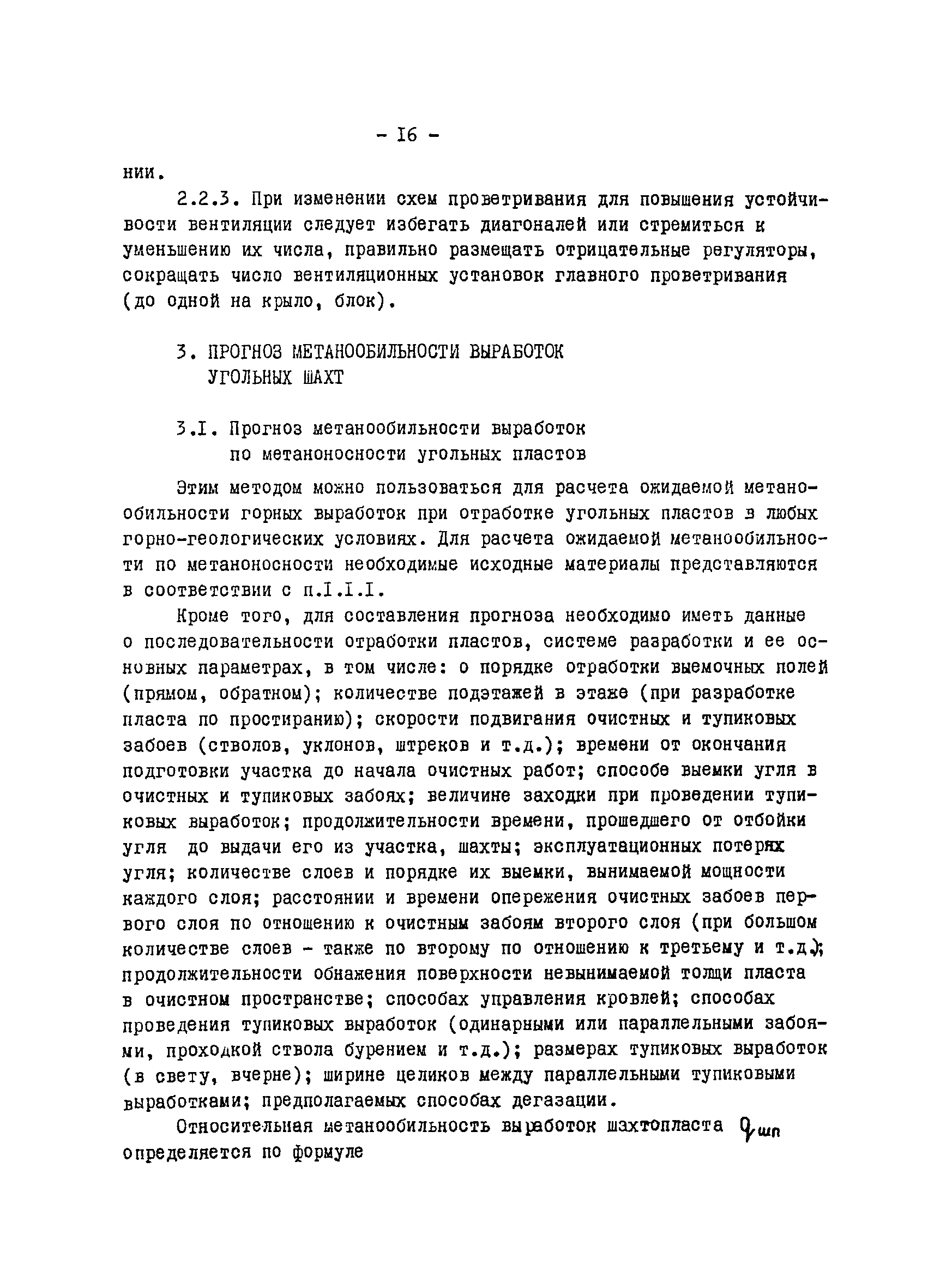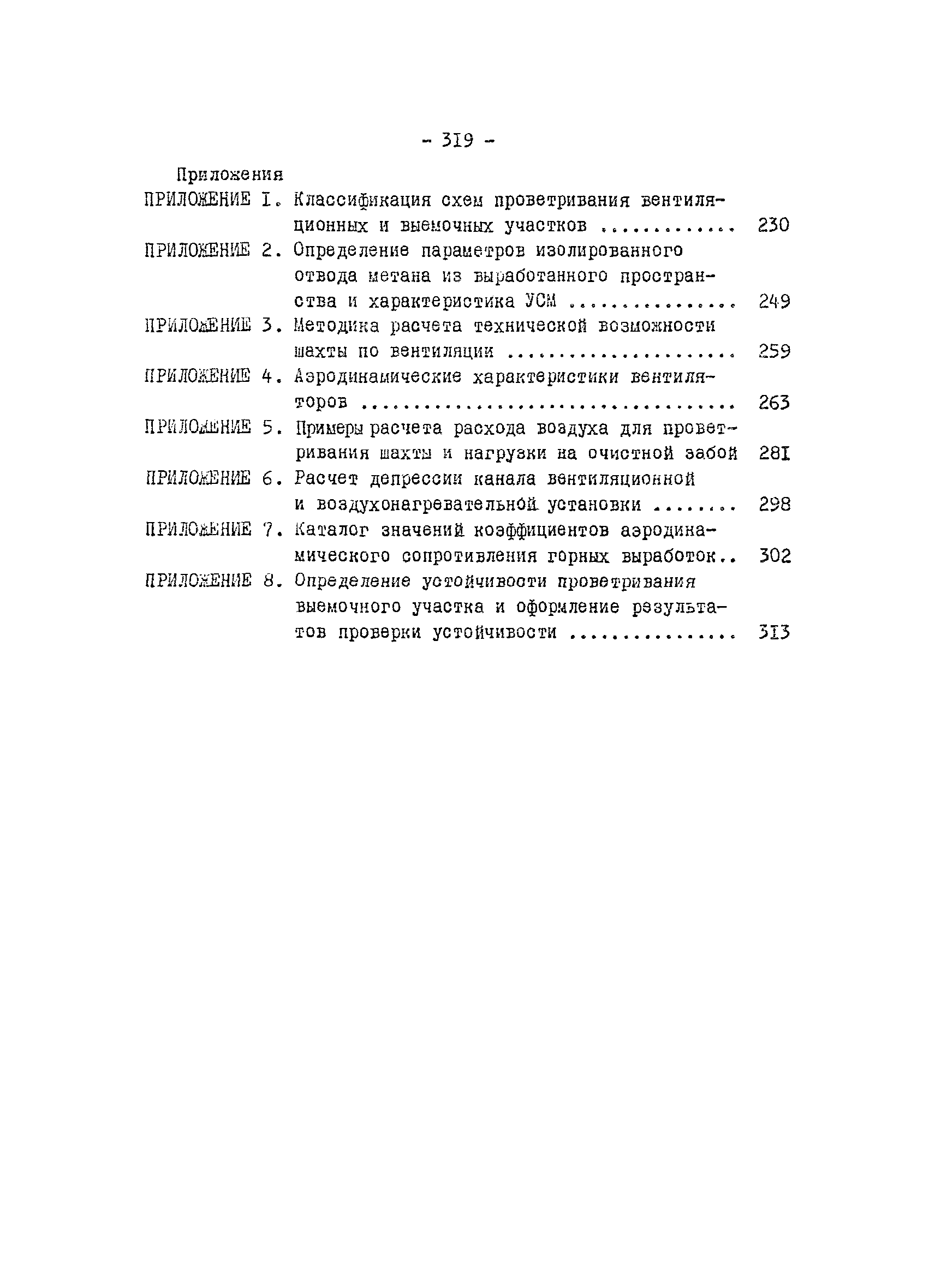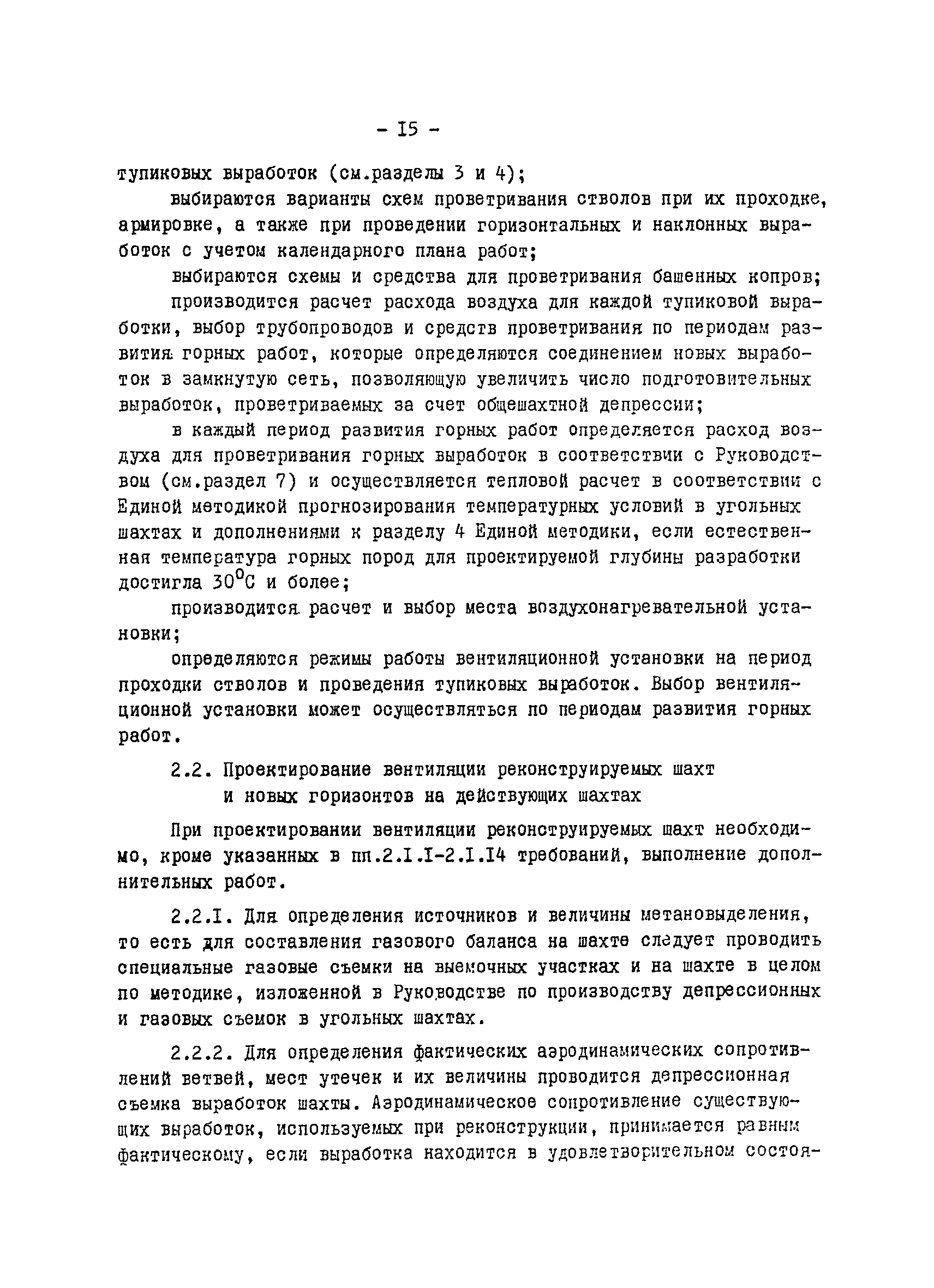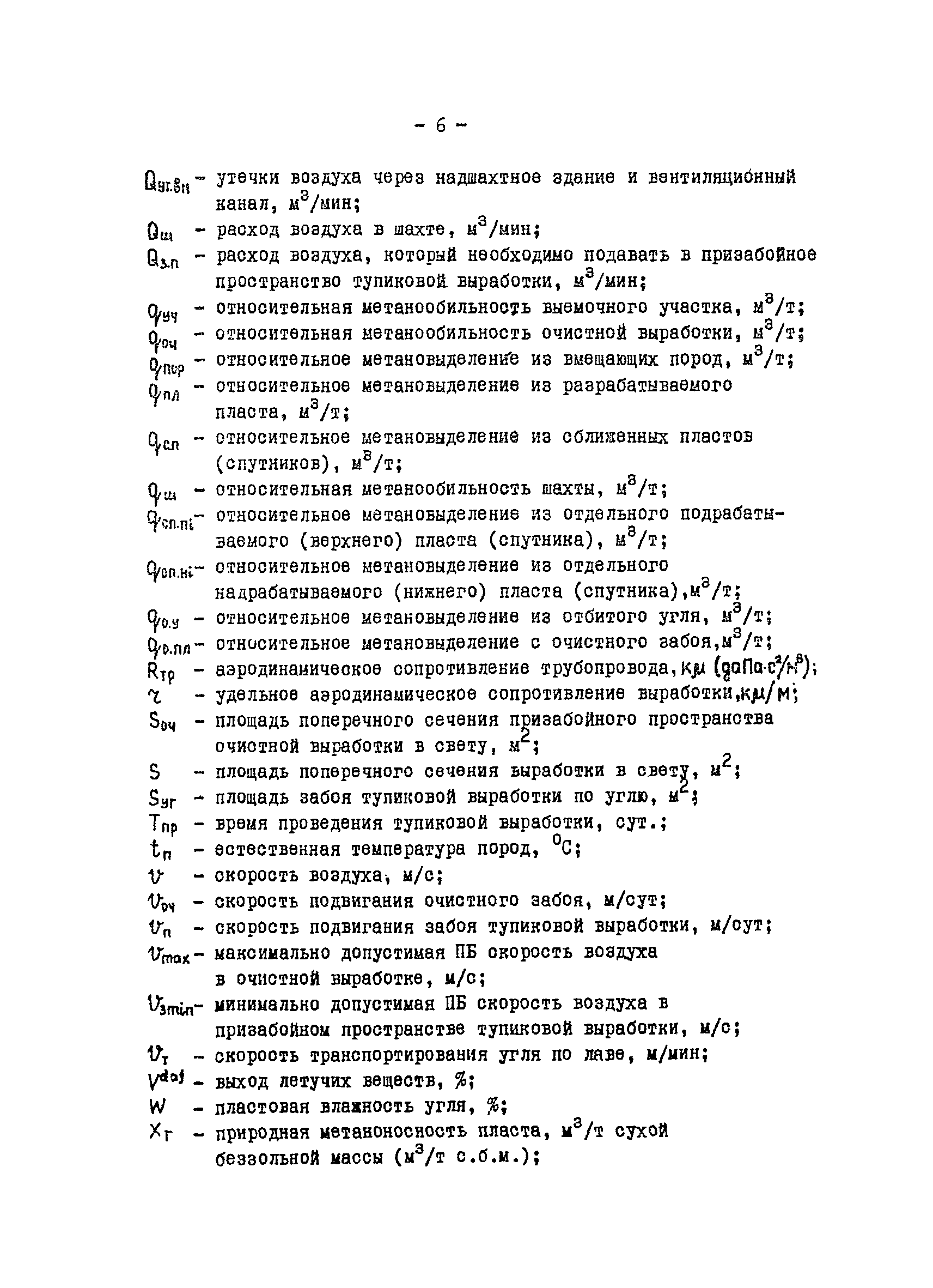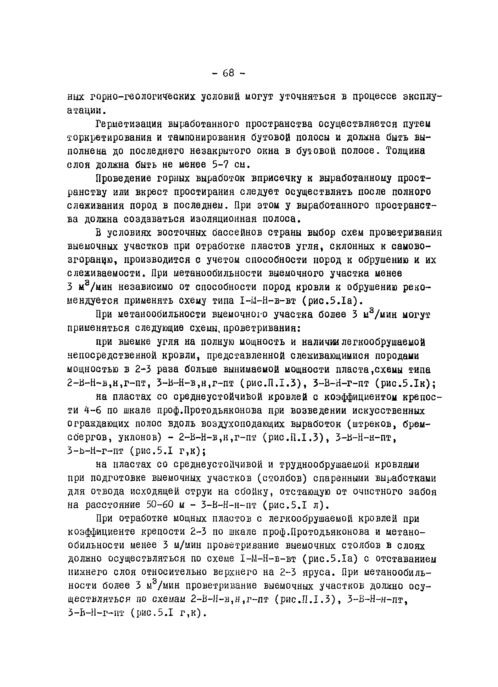 | Оглавление: | Основные условные обозначения 1. Общие положения 1.1. Геологоразведочные организация 1.2. Угольные шахты 1.3. Проектные организации 1.4. Научно-исследовательские институты и служба ВГСЧ 2. Порядок проектирования вентиляции угольных вахт 2.1. Проектирование вентиляции новых шахт и на период строительства 2.2. Проектирование вентиляции реконструируемых шахт и новых горизонтов на действующих шахтах 3. Прогноз метанообильности выработок угольных шахт 3.1. Прогноз метанообильности выработок по метаноносности угольных пластов 3.1.1. Метановыделение из разрабатываемого пласта 3.1.2. Метановыделение из сближенных угольных пластов (спутников) 3.1.3. Метановыделение из вмещающих пород 3.1.4. Метан обильность тупиковых выработок 3.1.5. Метановыделение при проведении вертикальных стволов 3.1.6. Определение относительной метанообильности шахты 3.2. Определение ожидаемой абсолютной газообильности выработок действующей шахты 3.2.1. Общие положения определения фактической газообильности горных выработок 3.2.2. Определение метанообильности тупиковых выработок 3.2.3. Определение газообильности очистных выработок и выемочных участков 3.2.4. Определение ожидаемого метановыделения очистной выработки и выемочного участка 3.2.5. Определение метанообильности шахты 4. Прогноз углекислотообильности горных выработок 4.1. Прогноз углекислотообильности горных выработок по степени метаморфизма углей 4.1.1. Углекислотообильность выемочного участка 4.1.2. Углекислотообильность тупиковых выработок 4.1.3. Углекислотообильность шахтопласта и шахты 4.2. Определение ожидаемой углекислотообильности выработок действующей шахты 4.2.1. Определение углекислотообильности очистных выработок и выемочных участков 4.2.2. Определение углекислотообильности тупиковых выработок 4.2.3. Определение углекислотообильности шахты 5. Способы и схемы проветривания шахт 5.1. Выбор схемы и способа проветривания шахты 5.2. Схемы проветривания выемочных участков 5.2.1. Требования к схемам проветривания выемочных участков 5.2.2. Классификация схем и область их применения 5.2.3. Проверка схем проветривания выемочных участков по опасности местных скоплений метана 5.2.4. Способы предупреждения образования местных скоплений метана 5.2.5. Оценка схем проветривания выемочных участков по фактору эндогенной пожароопасности 5.3. Схемы проветривания стволов и тупиковых выработок 6. Максимально допустимая нагрузка на очистную выработку по газовому фактору 6.1. Расчет максимально допустимой нагрузки на очистную выработку при проектировании новых шахт 6.1.1. Для очистных выработок типа лав по природной метаноносности угольных пластов 6.1.2. Для систем разработки с камерообразными выработками 6.2. Расчет максимально допустимой нагрузки на очистную выработку для действующих шахт 7. Расчет расхода воздуха для проветривания угольных шахт 7.1. Расчет расхода воздуха для шахты в целом 7.2. Расчет расхода воздуха для проветривания одиночных тупиковых выработок и вертикальных стволов 7.3. Расчет расхода воздуха для проветривания очистных выработок 7.4. Расход воздуха для проветривания выемочных участков 7.5. Расход воздуха для проветривания погашаемых и поддерживаемых выработок 7.6. Расход воздуха для проветривания камер 7.7. Утечки воздуха через вентиляционные сооружения 7.8. Выбор средств проветривания тупиковых выработок 