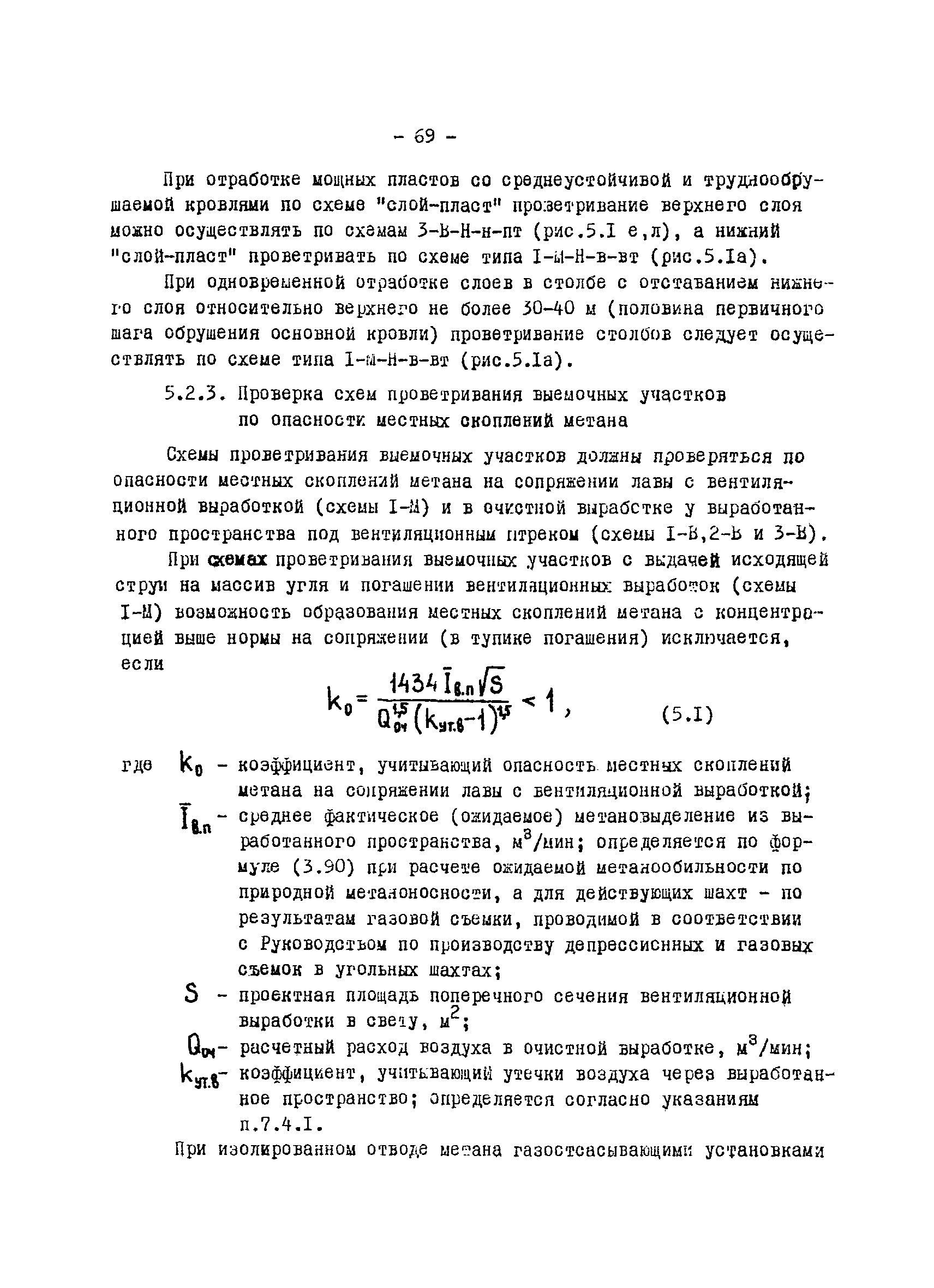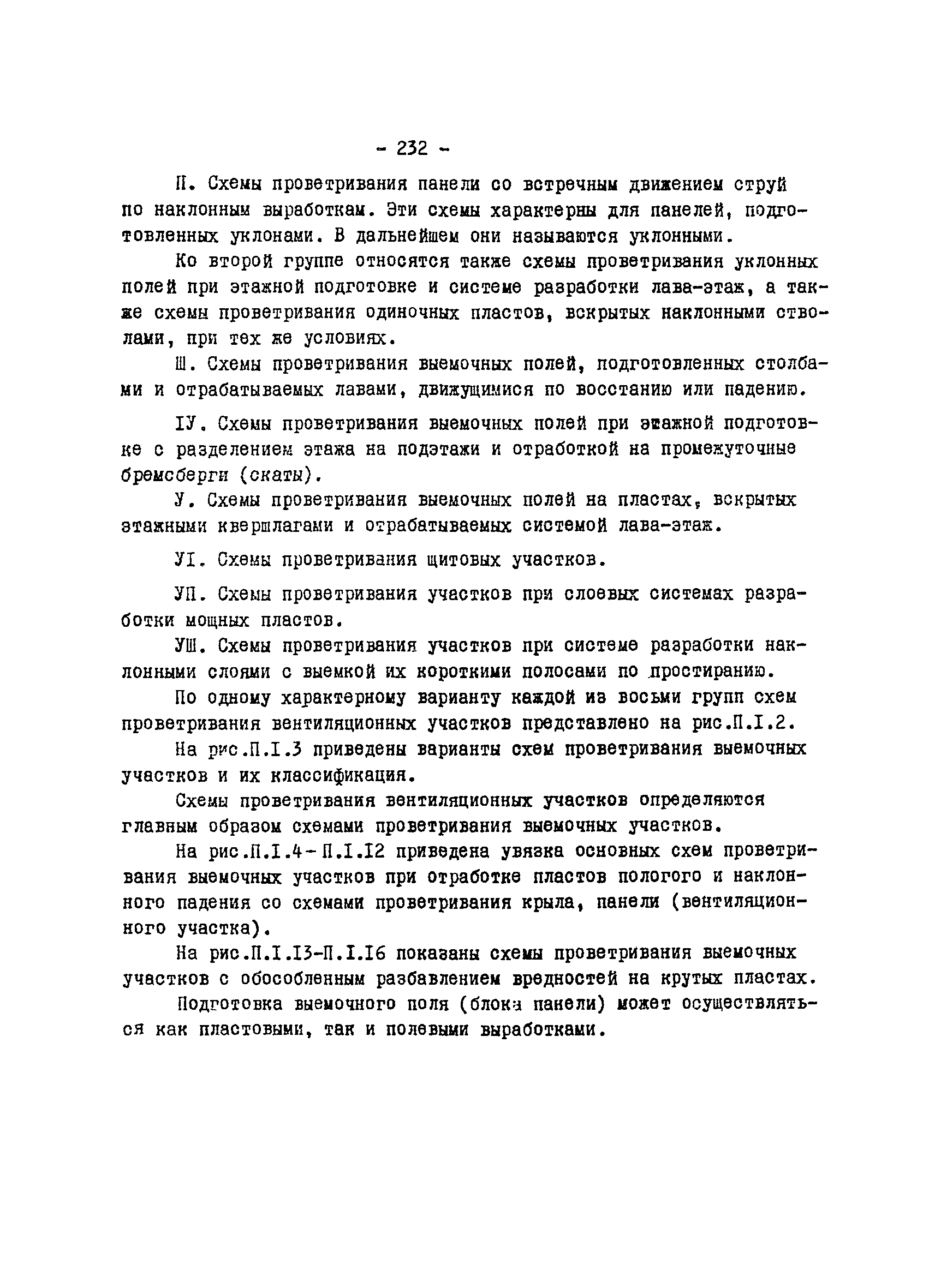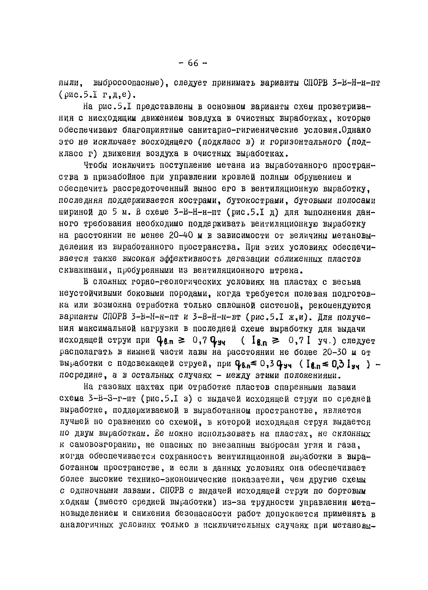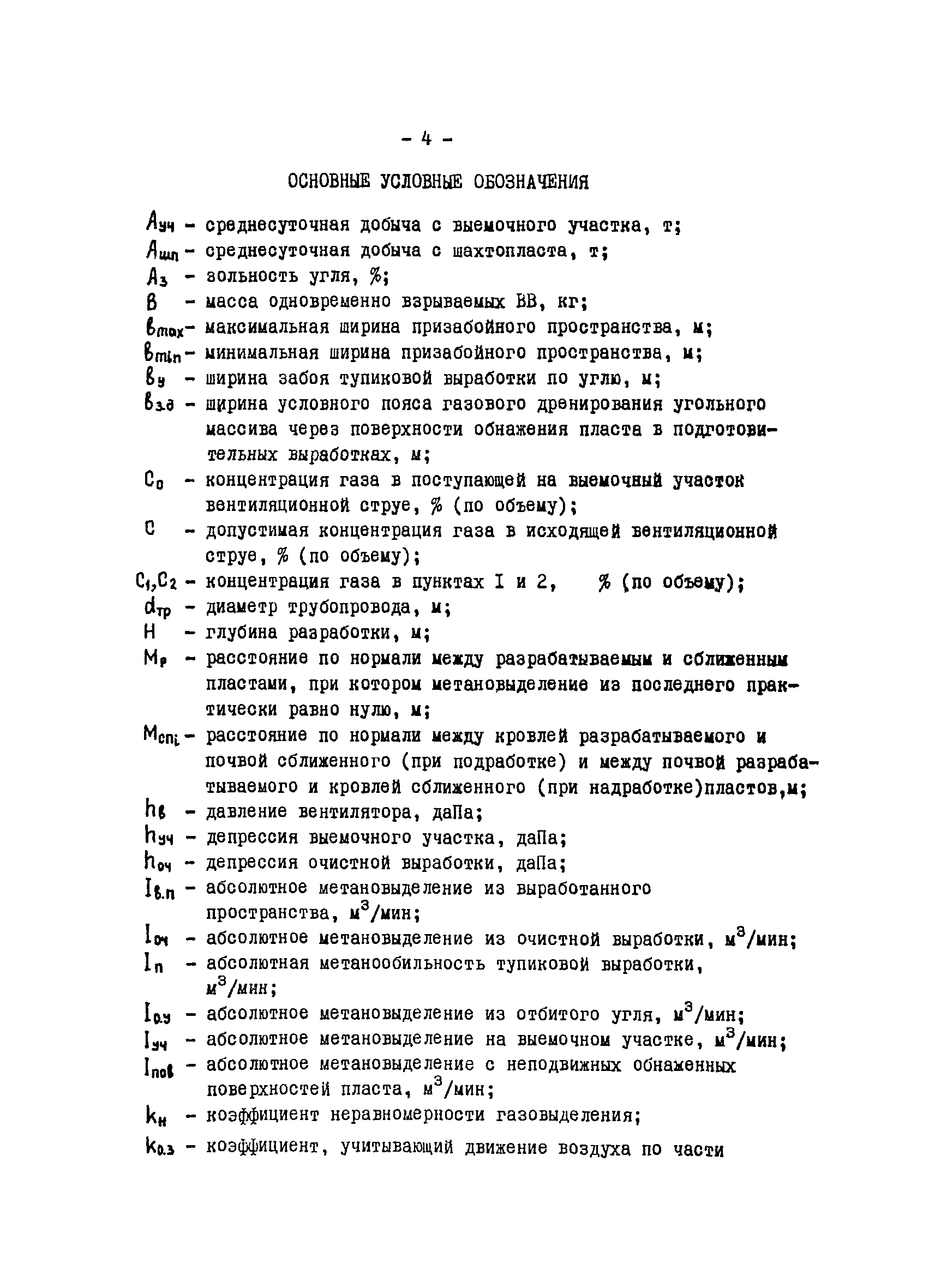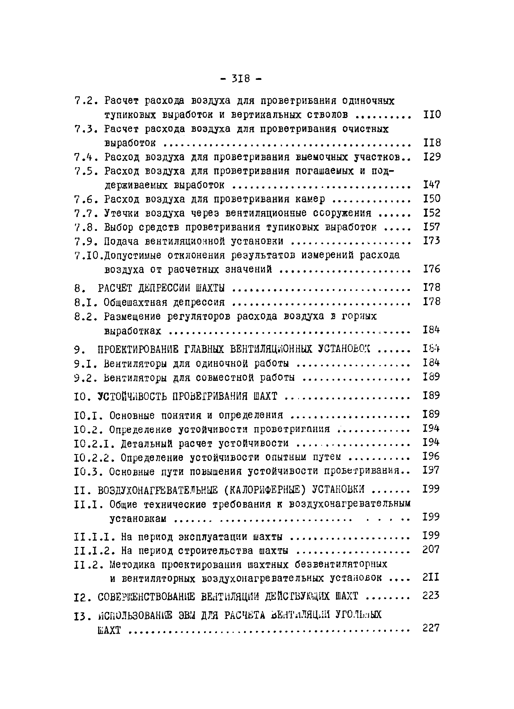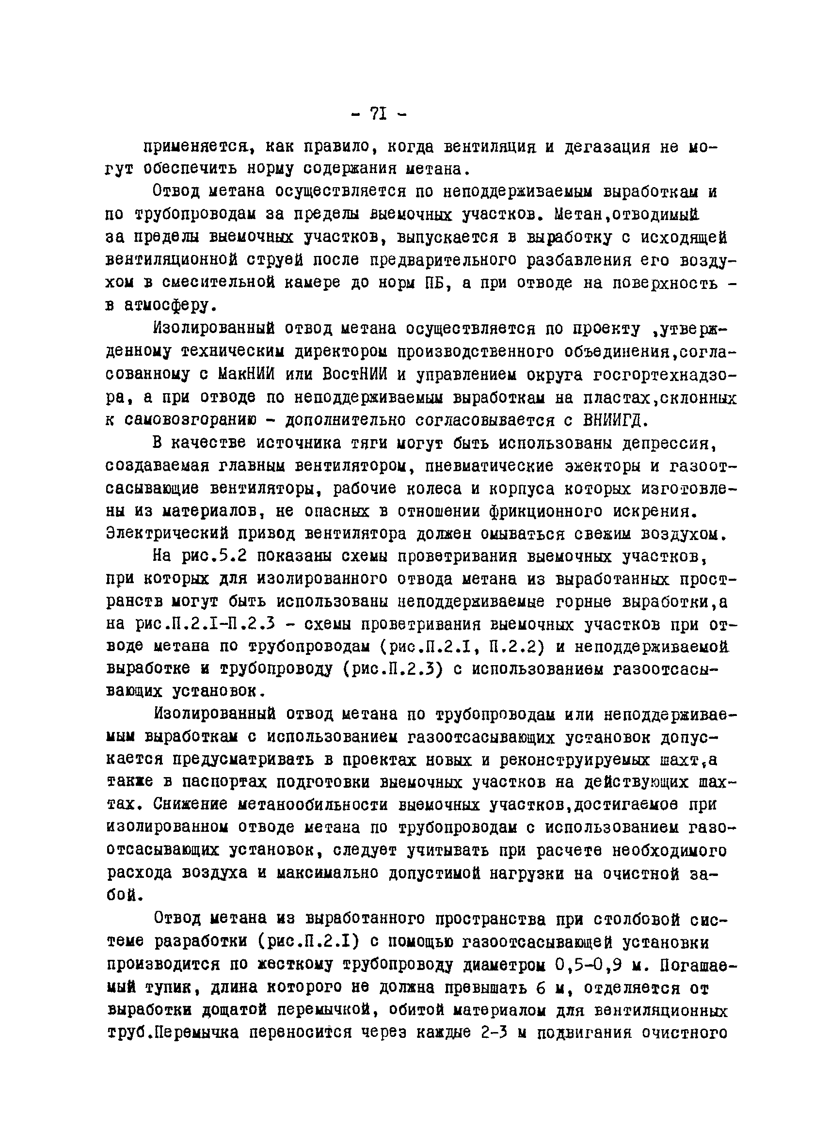 | Оглавление: | Основные условные обозначения 1. Общие положения 1.1. Геологоразведочные организация 1.2. Угольные шахты 1.3. Проектные организации 1.4. Научно-исследовательские институты и служба ВГСЧ 2. Порядок проектирования вентиляции угольных вахт 2.1. Проектирование вентиляции новых шахт и на период строительства 2.2. Проектирование вентиляции реконструируемых шахт и новых горизонтов на действующих шахтах 3. Прогноз метанообильности выработок угольных шахт 3.1. Прогноз метанообильности выработок по метаноносности угольных пластов 3.1.1. Метановыделение из разрабатываемого пласта 3.1.2. Метановыделение из сближенных угольных пластов (спутников) 3.1.3. Метановыделение из вмещающих пород 3.1.4. Метан обильность тупиковых выработок 3.1.5. Метановыделение при проведении вертикальных стволов 3.1.6. Определение относительной метанообильности шахты 3.2. Определение ожидаемой абсолютной газообильности выработок действующей шахты 3.2.1. Общие положения определения фактической газообильности горных выработок 3.2.2. Определение метанообильности тупиковых выработок 3.2.3. Определение газообильности очистных выработок и выемочных участков 3.2.4. Определение ожидаемого метановыделения очистной выработки и выемочного участка 3.2.5. Определение метанообильности шахты 4. Прогноз углекислотообильности горных выработок 4.1. Прогноз углекислотообильности горных выработок по степени метаморфизма углей 4.1.1. Углекислотообильность выемочного участка 4.1.2. Углекислотообильность тупиковых выработок 4.1.3. Углекислотообильность шахтопласта и шахты 4.2. Определение ожидаемой углекислотообильности выработок действующей шахты 4.2.1. Определение углекислотообильности очистных выработок и выемочных участков 4.2.2. Определение углекислотообильности тупиковых выработок 4.2.3. Определение углекислотообильности шахты 5. Способы и схемы проветривания шахт 5.1. Выбор схемы и способа проветривания шахты 5.2. Схемы проветривания выемочных участков 5.2.1. Требования к схемам проветривания выемочных участков 5.2.2. Классификация схем и область их применения 5.2.3. Проверка схем проветривания выемочных участков по опасности местных скоплений метана 5.2.4. Способы предупреждения образования местных скоплений метана 5.2.5. Оценка схем проветривания выемочных участков по фактору эндогенной пожароопасности 5.3. Схемы проветривания стволов и тупиковых выработок 6. Максимально допустимая нагрузка на очистную выработку по газовому фактору 6.1. Расчет максимально допустимой нагрузки на очистную выработку при проектировании новых шахт 6.1.1. Для очистных выработок типа лав по природной метаноносности угольных пластов 6.1.2. Для систем разработки с камерообразными выработками 6.2. Расчет максимально допустимой нагрузки на очистную выработку для действующих шахт 7. Расчет расхода воздуха для проветривания угольных шахт 7.1. Расчет расхода воздуха для шахты в целом 7.2. Расчет расхода воздуха для проветривания одиночных тупиковых выработок и вертикальных стволов 7.3. Расчет расхода воздуха для проветривания очистных выработок 7.4. Расход воздуха для проветривания выемочных участков 7.5. Расход воздуха для проветривания погашаемых и поддерживаемых выработок 7.6. Расход воздуха для проветривания камер 7.7. Утечки воздуха через вентиляционные сооружения 7.8. Выбор средств проветривания тупиковых выработок 