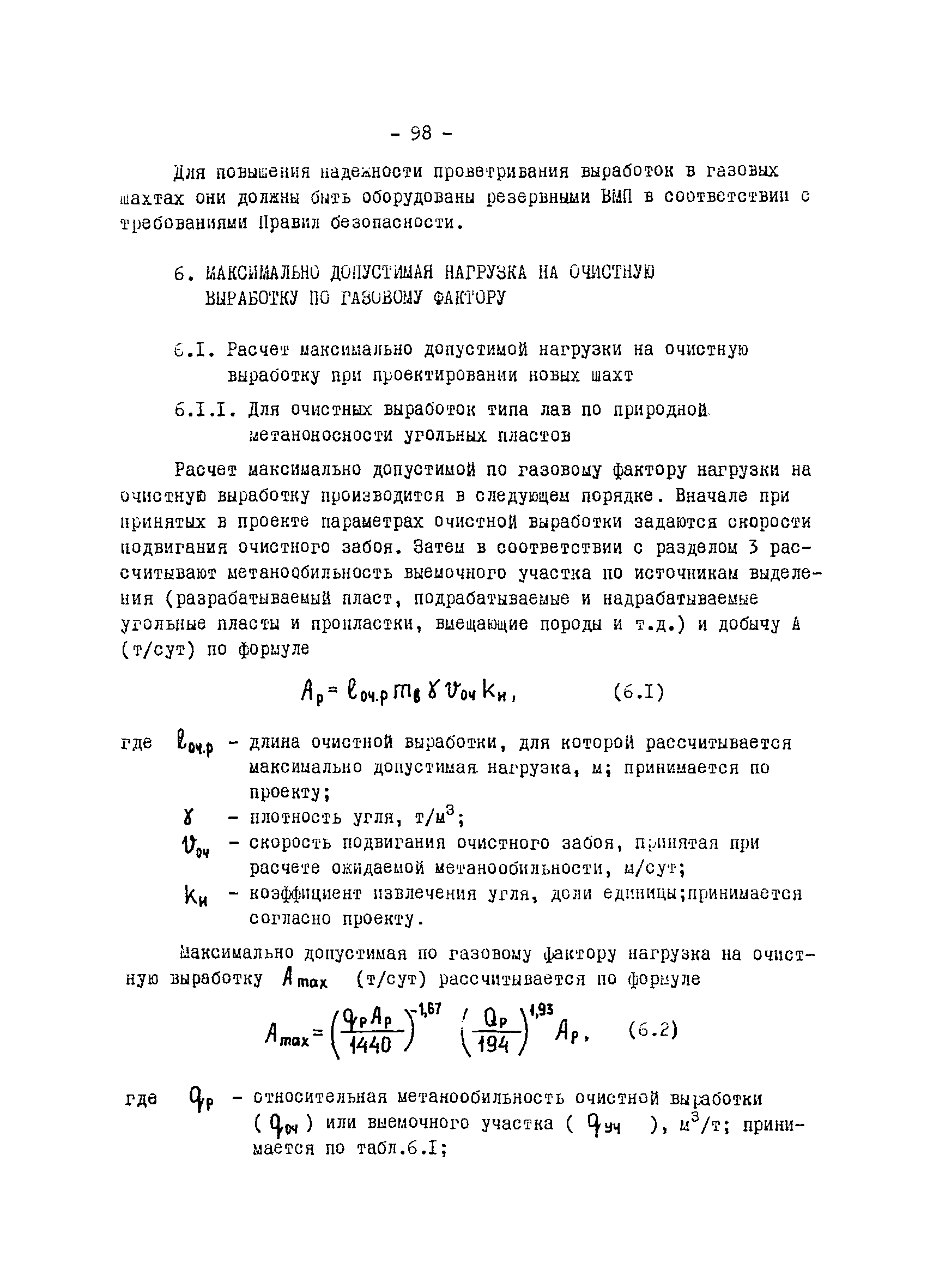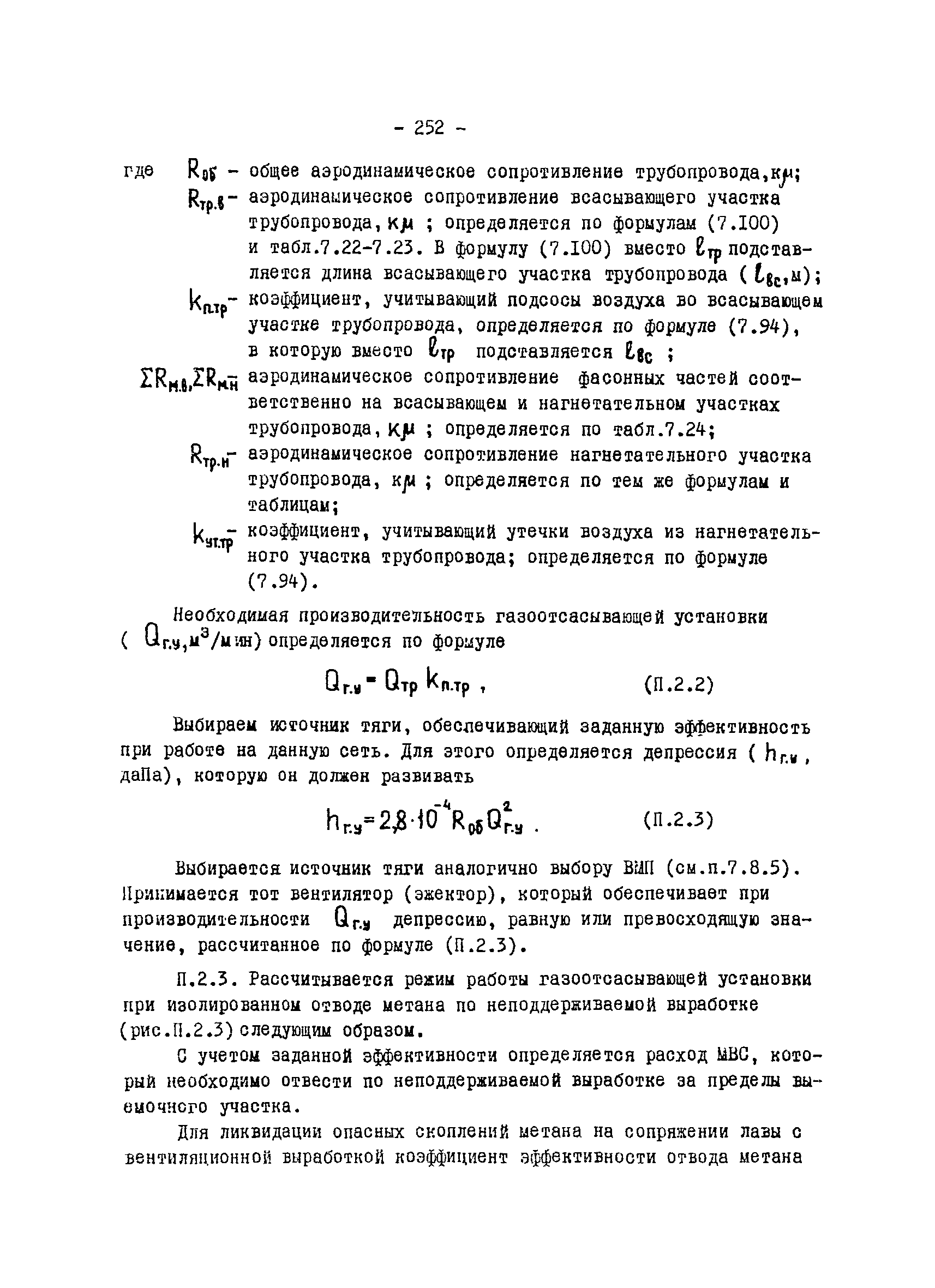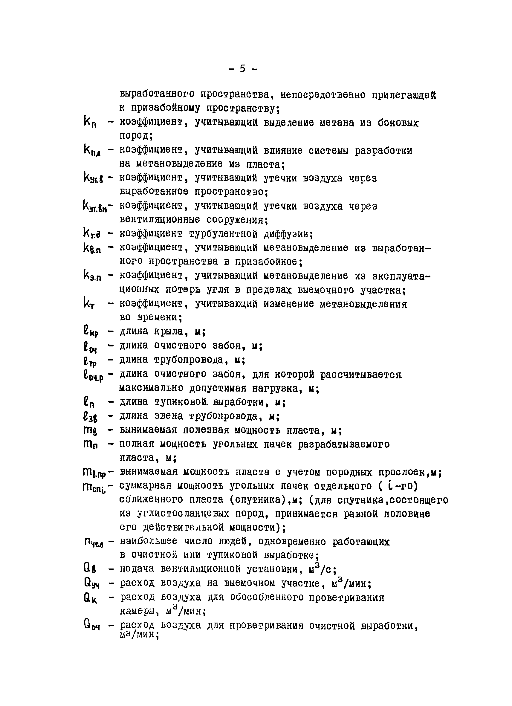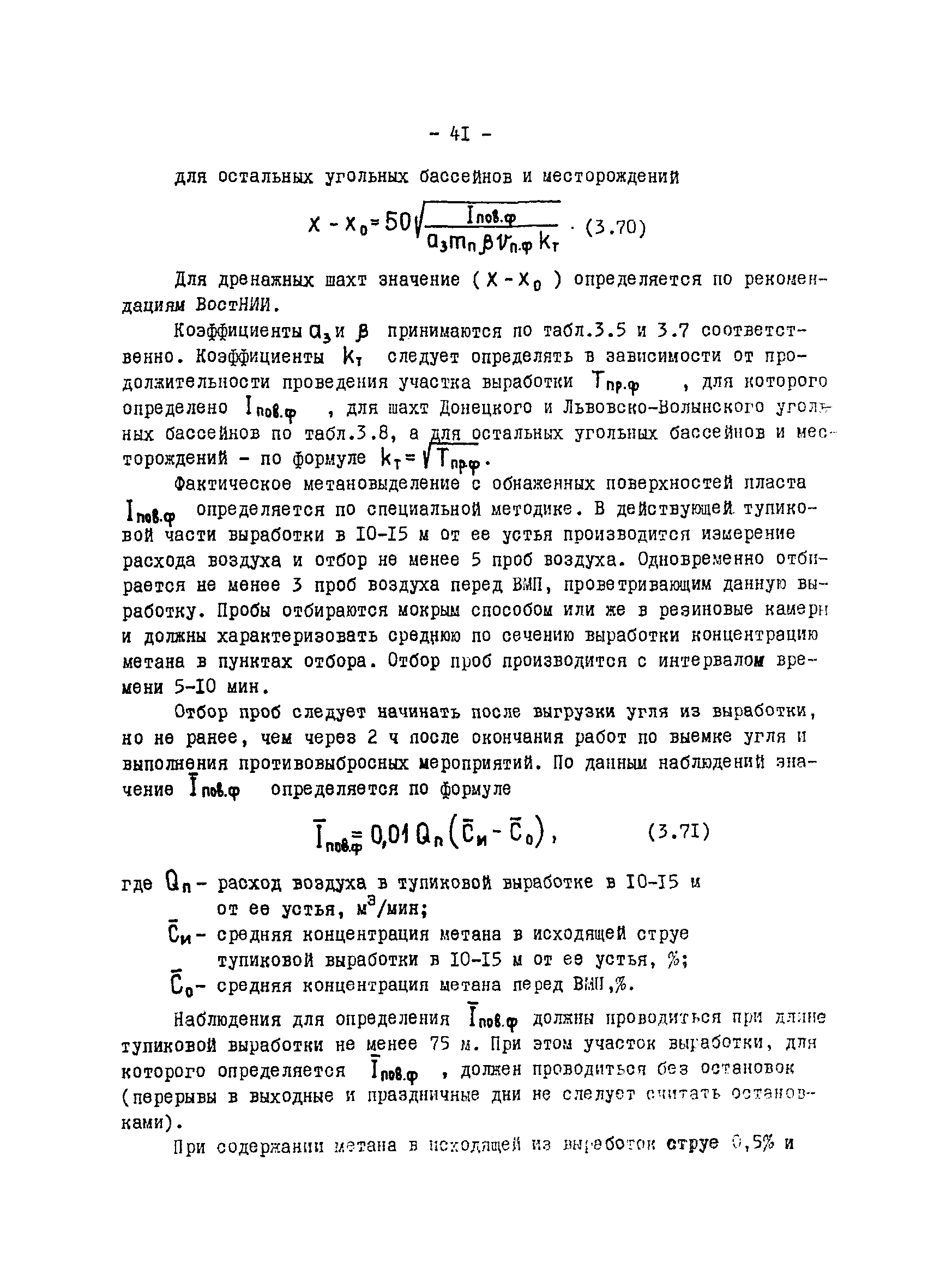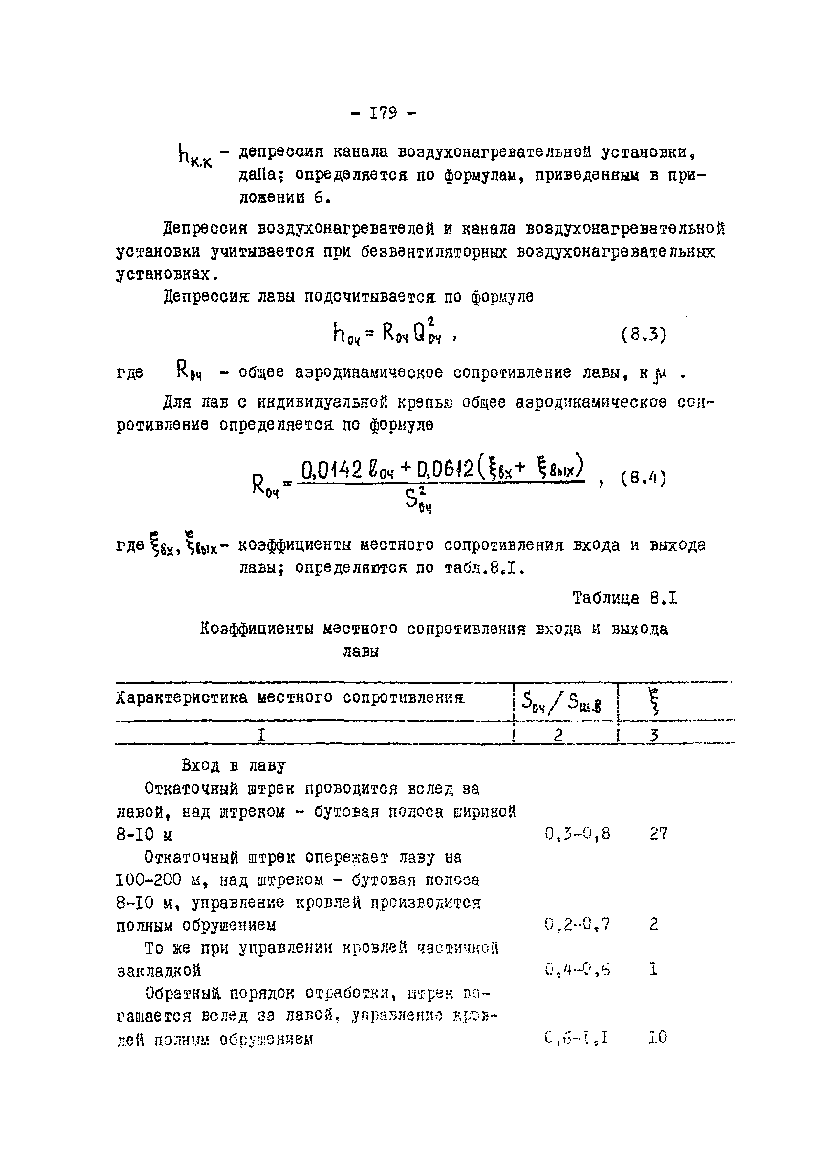 | Оглавление: | Основные условные обозначения 1. Общие положения 1.1. Геологоразведочные организация 1.2. Угольные шахты 1.3. Проектные организации 1.4. Научно-исследовательские институты и служба ВГСЧ 2. Порядок проектирования вентиляции угольных вахт 2.1. Проектирование вентиляции новых шахт и на период строительства 2.2. Проектирование вентиляции реконструируемых шахт и новых горизонтов на действующих шахтах 3. Прогноз метанообильности выработок угольных шахт 3.1. Прогноз метанообильности выработок по метаноносности угольных пластов 3.1.1. Метановыделение из разрабатываемого пласта 3.1.2. Метановыделение из сближенных угольных пластов (спутников) 3.1.3. Метановыделение из вмещающих пород 3.1.4. Метан обильность тупиковых выработок 3.1.5. Метановыделение при проведении вертикальных стволов 3.1.6. Определение относительной метанообильности шахты 3.2. Определение ожидаемой абсолютной газообильности выработок действующей шахты 3.2.1. Общие положения определения фактической газообильности горных выработок 3.2.2. Определение метанообильности тупиковых выработок 3.2.3. Определение газообильности очистных выработок и выемочных участков 3.2.4. Определение ожидаемого метановыделения очистной выработки и выемочного участка 3.2.5. Определение метанообильности шахты 4. Прогноз углекислотообильности горных выработок 4.1. Прогноз углекислотообильности горных выработок по степени метаморфизма углей 4.1.1. Углекислотообильность выемочного участка 4.1.2. Углекислотообильность тупиковых выработок 4.1.3. Углекислотообильность шахтопласта и шахты 4.2. Определение ожидаемой углекислотообильности выработок действующей шахты 4.2.1. Определение углекислотообильности очистных выработок и выемочных участков 4.2.2. Определение углекислотообильности тупиковых выработок 4.2.3. Определение углекислотообильности шахты 5. Способы и схемы проветривания шахт 5.1. Выбор схемы и способа проветривания шахты 5.2. Схемы проветривания выемочных участков 5.2.1. Требования к схемам проветривания выемочных участков 5.2.2. Классификация схем и область их применения 5.2.3. Проверка схем проветривания выемочных участков по опасности местных скоплений метана 5.2.4. Способы предупреждения образования местных скоплений метана 5.2.5. Оценка схем проветривания выемочных участков по фактору эндогенной пожароопасности 5.3. Схемы проветривания стволов и тупиковых выработок 6. Максимально допустимая нагрузка на очистную выработку по газовому фактору 6.1. Расчет максимально допустимой нагрузки на очистную выработку при проектировании новых шахт 6.1.1. Для очистных выработок типа лав по природной метаноносности угольных пластов 6.1.2. Для систем разработки с камерообразными выработками 6.2. Расчет максимально допустимой нагрузки на очистную выработку для действующих шахт 7. Расчет расхода воздуха для проветривания угольных шахт 7.1. Расчет расхода воздуха для шахты в целом 7.2. Расчет расхода воздуха для проветривания одиночных тупиковых выработок и вертикальных стволов 7.3. Расчет расхода воздуха для проветривания очистных выработок 7.4. Расход воздуха для проветривания выемочных участков 7.5. Расход воздуха для проветривания погашаемых и поддерживаемых выработок 7.6. Расход воздуха для проветривания камер 7.7. Утечки воздуха через вентиляционные сооружения 7.8. Выбор средств проветривания тупиковых выработок 