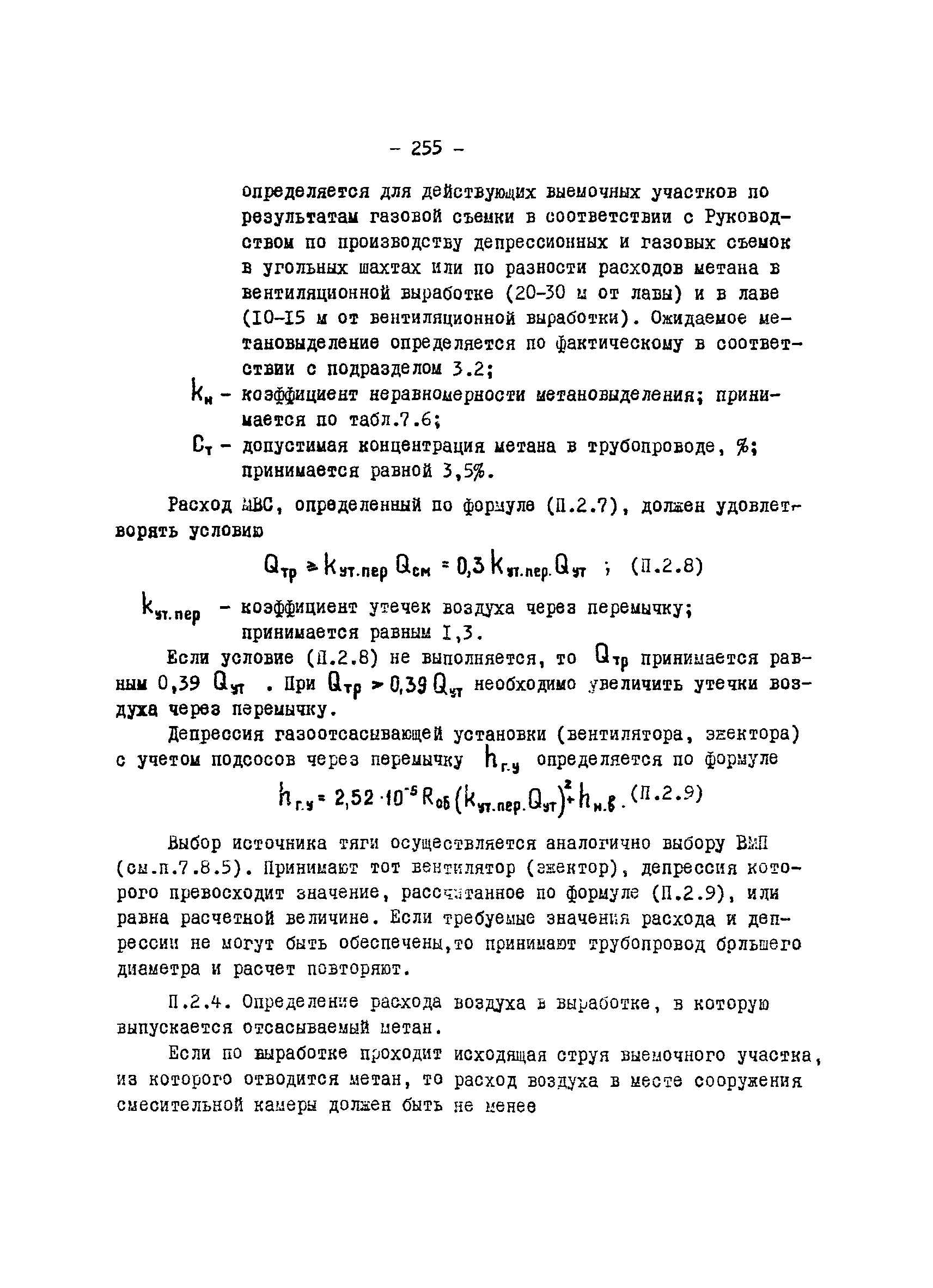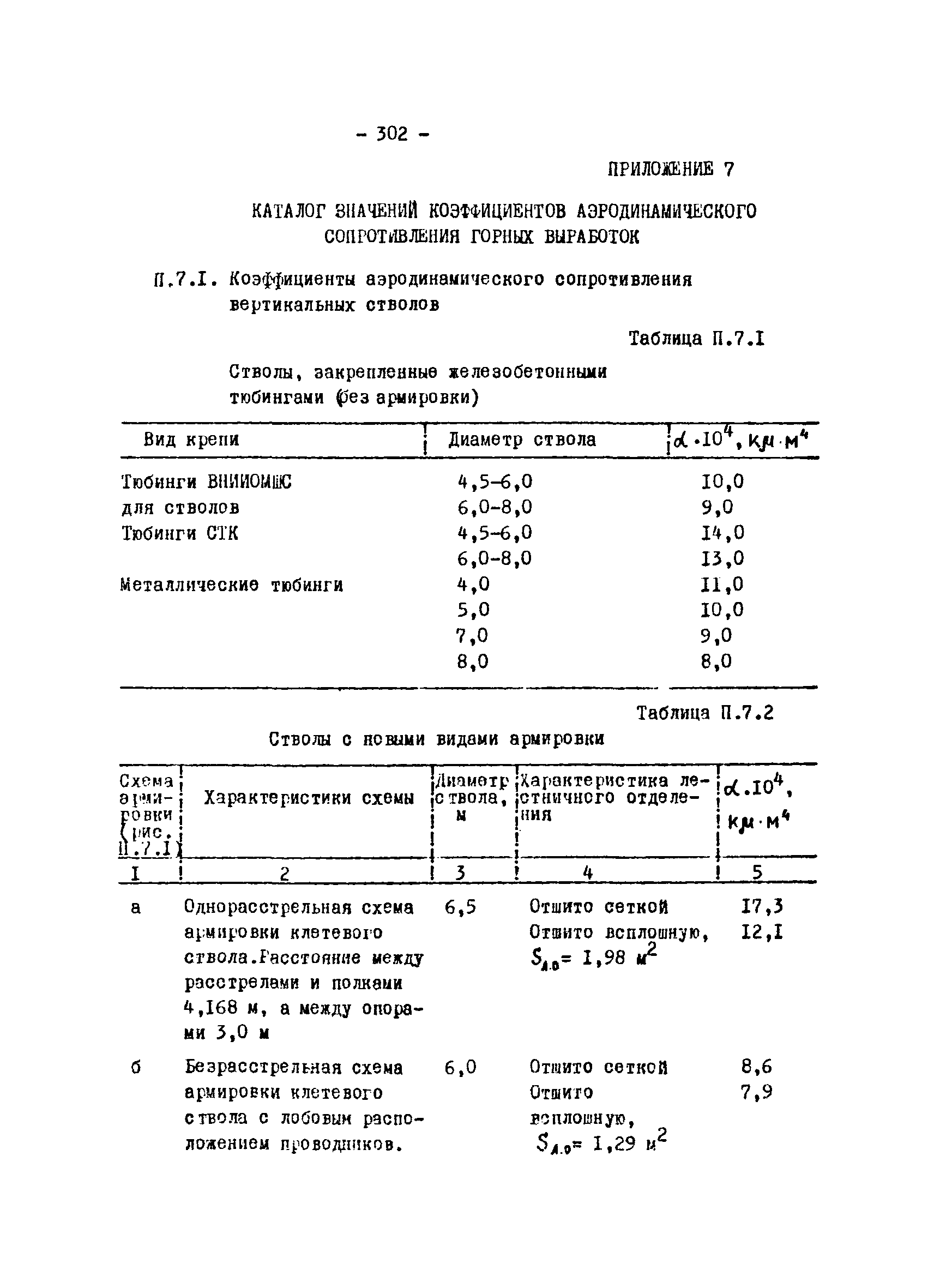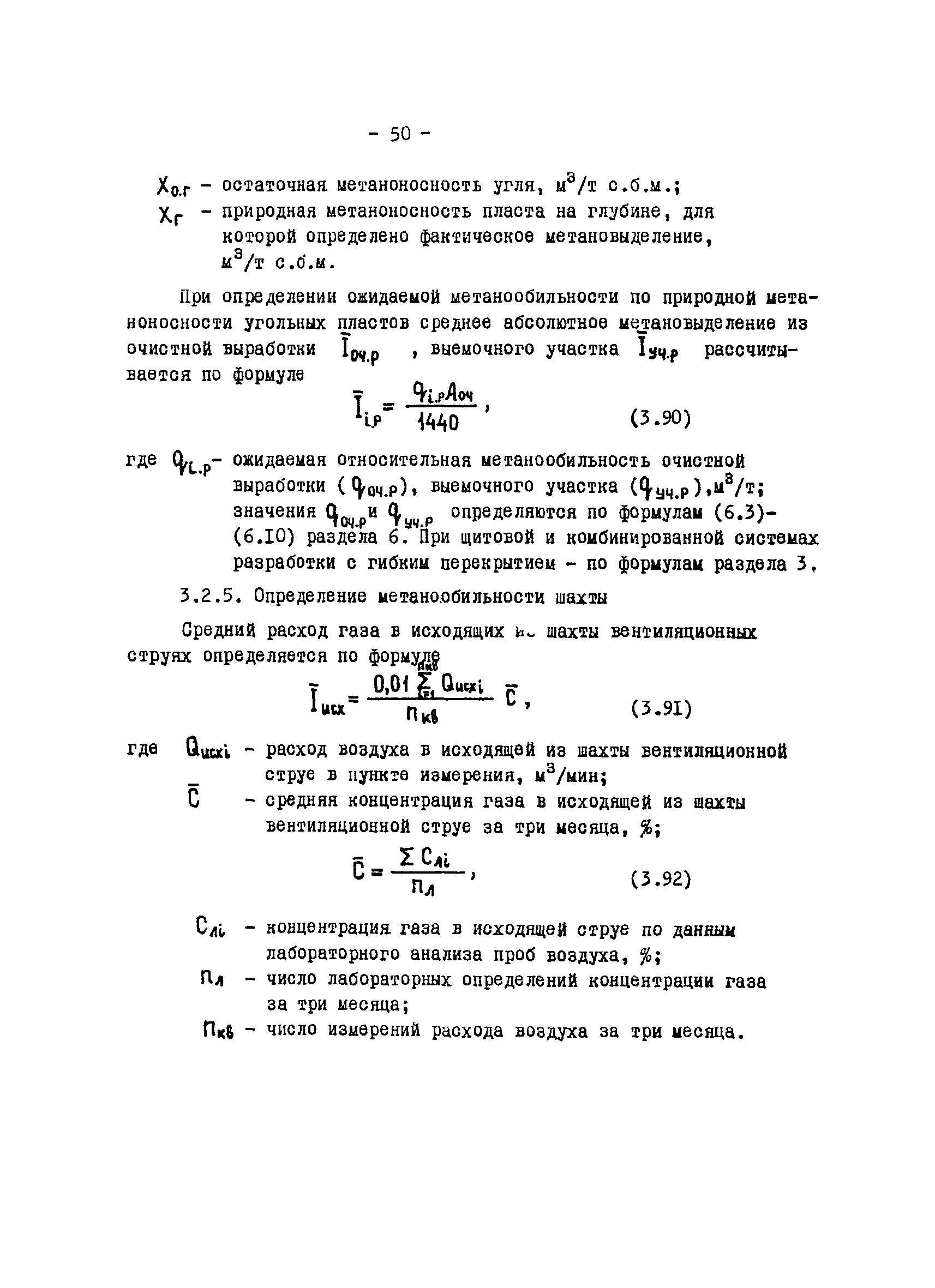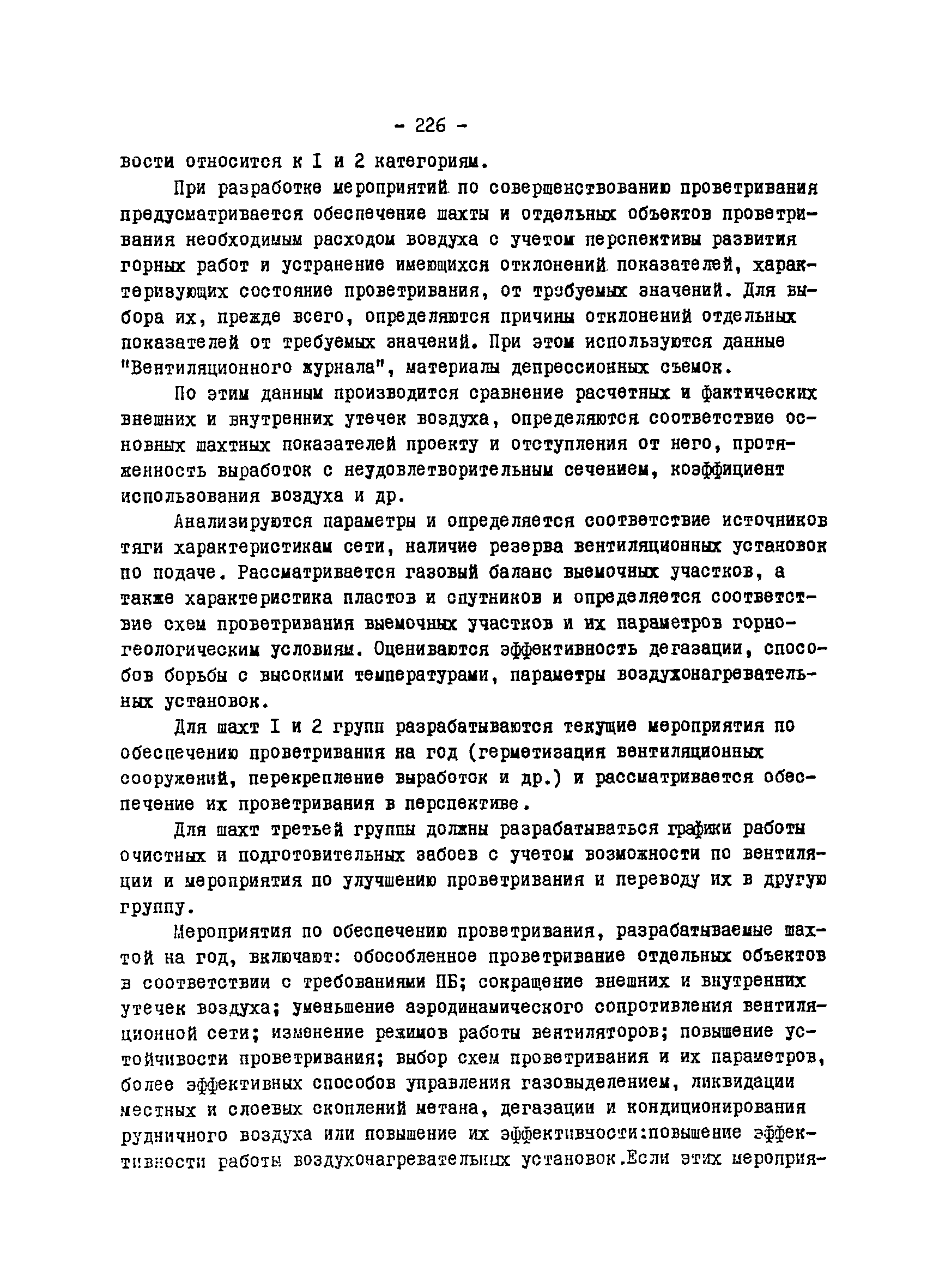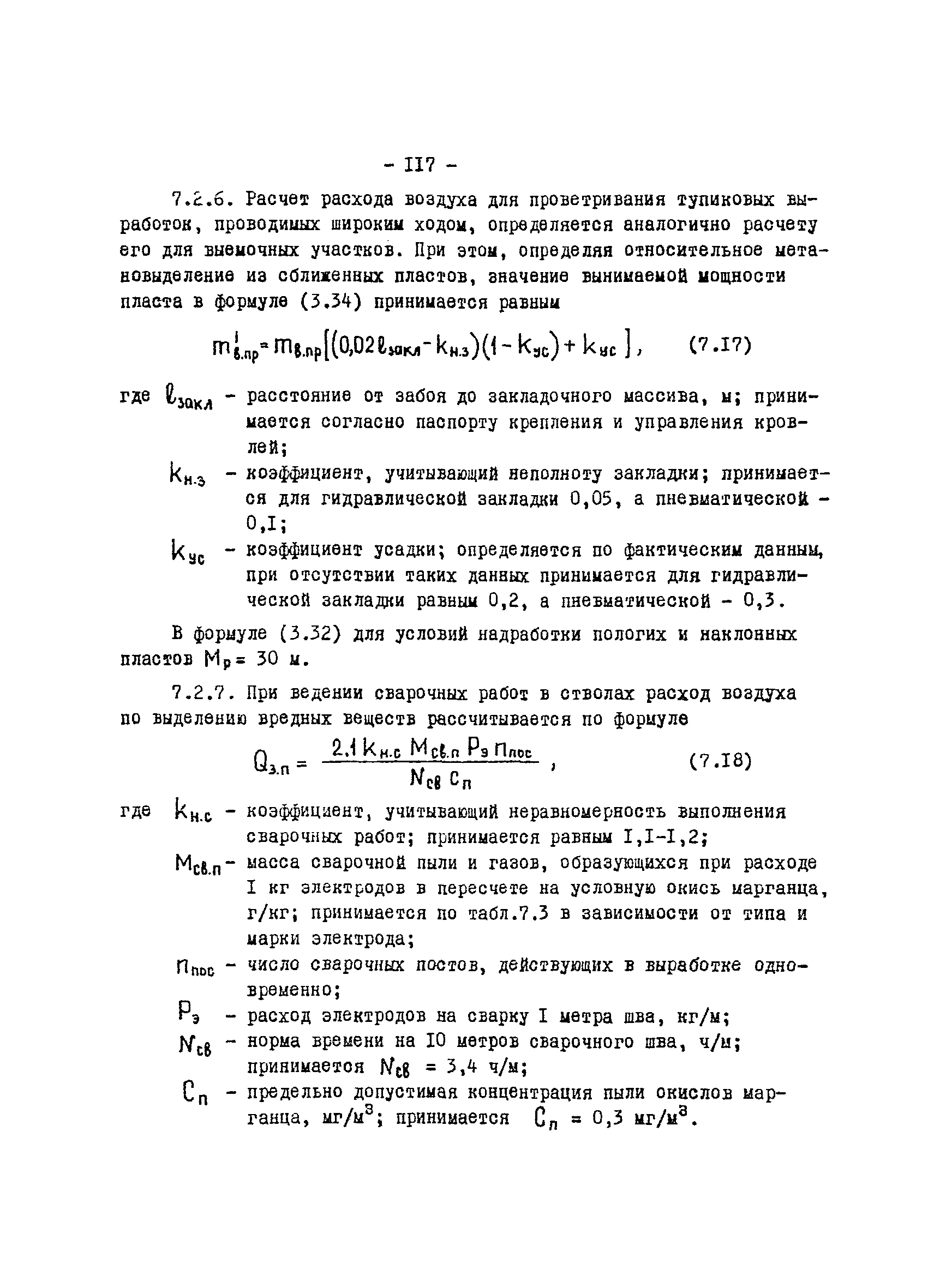 | Оглавление: | Основные условные обозначения 1. Общие положения 1.1. Геологоразведочные организация 1.2. Угольные шахты 1.3. Проектные организации 1.4. Научно-исследовательские институты и служба ВГСЧ 2. Порядок проектирования вентиляции угольных вахт 2.1. Проектирование вентиляции новых шахт и на период строительства 2.2. Проектирование вентиляции реконструируемых шахт и новых горизонтов на действующих шахтах 3. Прогноз метанообильности выработок угольных шахт 3.1. Прогноз метанообильности выработок по метаноносности угольных пластов 3.1.1. Метановыделение из разрабатываемого пласта 3.1.2. Метановыделение из сближенных угольных пластов (спутников) 3.1.3. Метановыделение из вмещающих пород 3.1.4. Метан обильность тупиковых выработок 3.1.5. Метановыделение при проведении вертикальных стволов 3.1.6. Определение относительной метанообильности шахты 3.2. Определение ожидаемой абсолютной газообильности выработок действующей шахты 3.2.1. Общие положения определения фактической газообильности горных выработок 3.2.2. Определение метанообильности тупиковых выработок 3.2.3. Определение газообильности очистных выработок и выемочных участков 3.2.4. Определение ожидаемого метановыделения очистной выработки и выемочного участка 3.2.5. Определение метанообильности шахты 4. Прогноз углекислотообильности горных выработок 4.1. Прогноз углекислотообильности горных выработок по степени метаморфизма углей 4.1.1. Углекислотообильность выемочного участка 4.1.2. Углекислотообильность тупиковых выработок 4.1.3. Углекислотообильность шахтопласта и шахты 4.2. Определение ожидаемой углекислотообильности выработок действующей шахты 4.2.1. Определение углекислотообильности очистных выработок и выемочных участков 4.2.2. Определение углекислотообильности тупиковых выработок 4.2.3. Определение углекислотообильности шахты 5. Способы и схемы проветривания шахт 5.1. Выбор схемы и способа проветривания шахты 5.2. Схемы проветривания выемочных участков 5.2.1. Требования к схемам проветривания выемочных участков 5.2.2. Классификация схем и область их применения 5.2.3. Проверка схем проветривания выемочных участков по опасности местных скоплений метана 5.2.4. Способы предупреждения образования местных скоплений метана 5.2.5. Оценка схем проветривания выемочных участков по фактору эндогенной пожароопасности 5.3. Схемы проветривания стволов и тупиковых выработок 6. Максимально допустимая нагрузка на очистную выработку по газовому фактору 6.1. Расчет максимально допустимой нагрузки на очистную выработку при проектировании новых шахт 6.1.1. Для очистных выработок типа лав по природной метаноносности угольных пластов 6.1.2. Для систем разработки с камерообразными выработками 6.2. Расчет максимально допустимой нагрузки на очистную выработку для действующих шахт 7. Расчет расхода воздуха для проветривания угольных шахт 7.1. Расчет расхода воздуха для шахты в целом 7.2. Расчет расхода воздуха для проветривания одиночных тупиковых выработок и вертикальных стволов 7.3. Расчет расхода воздуха для проветривания очистных выработок 7.4. Расход воздуха для проветривания выемочных участков 7.5. Расход воздуха для проветривания погашаемых и поддерживаемых выработок 7.6. Расход воздуха для проветривания камер 7.7. Утечки воздуха через вентиляционные сооружения 7.8. Выбор средств проветривания тупиковых выработок 