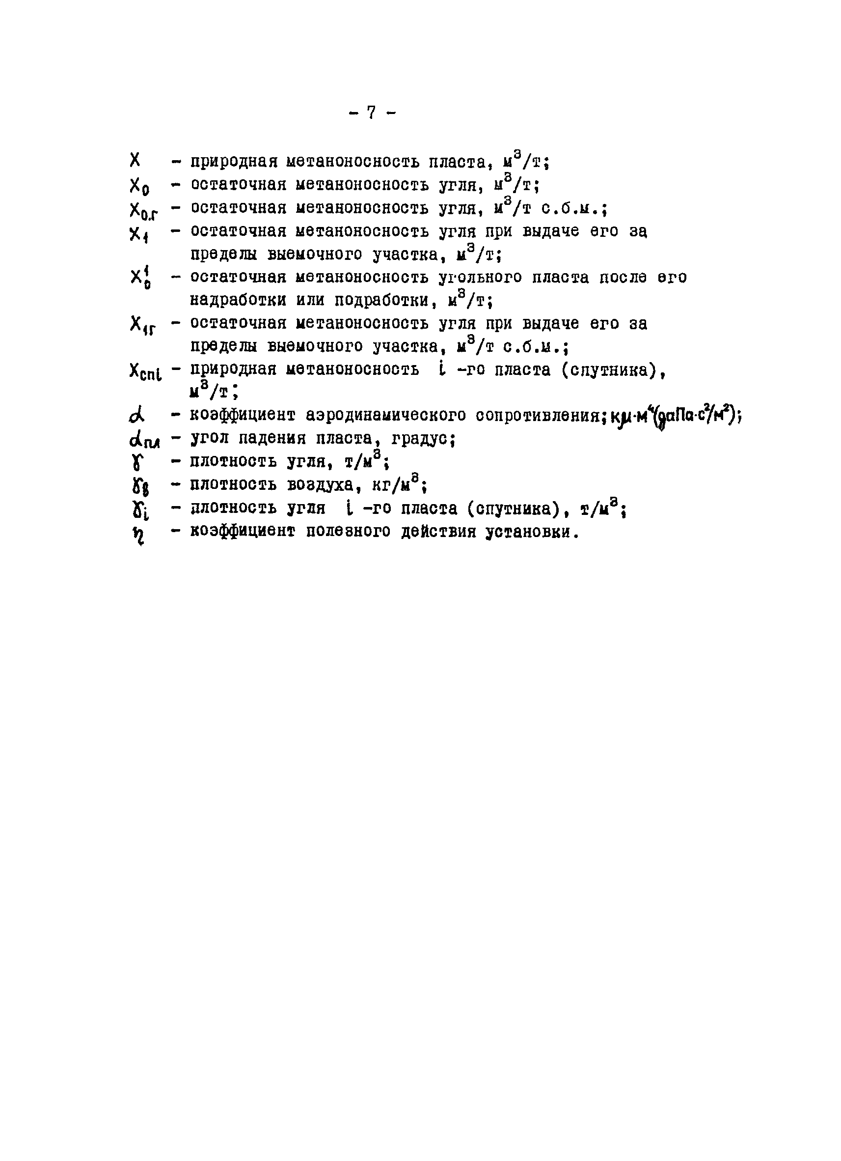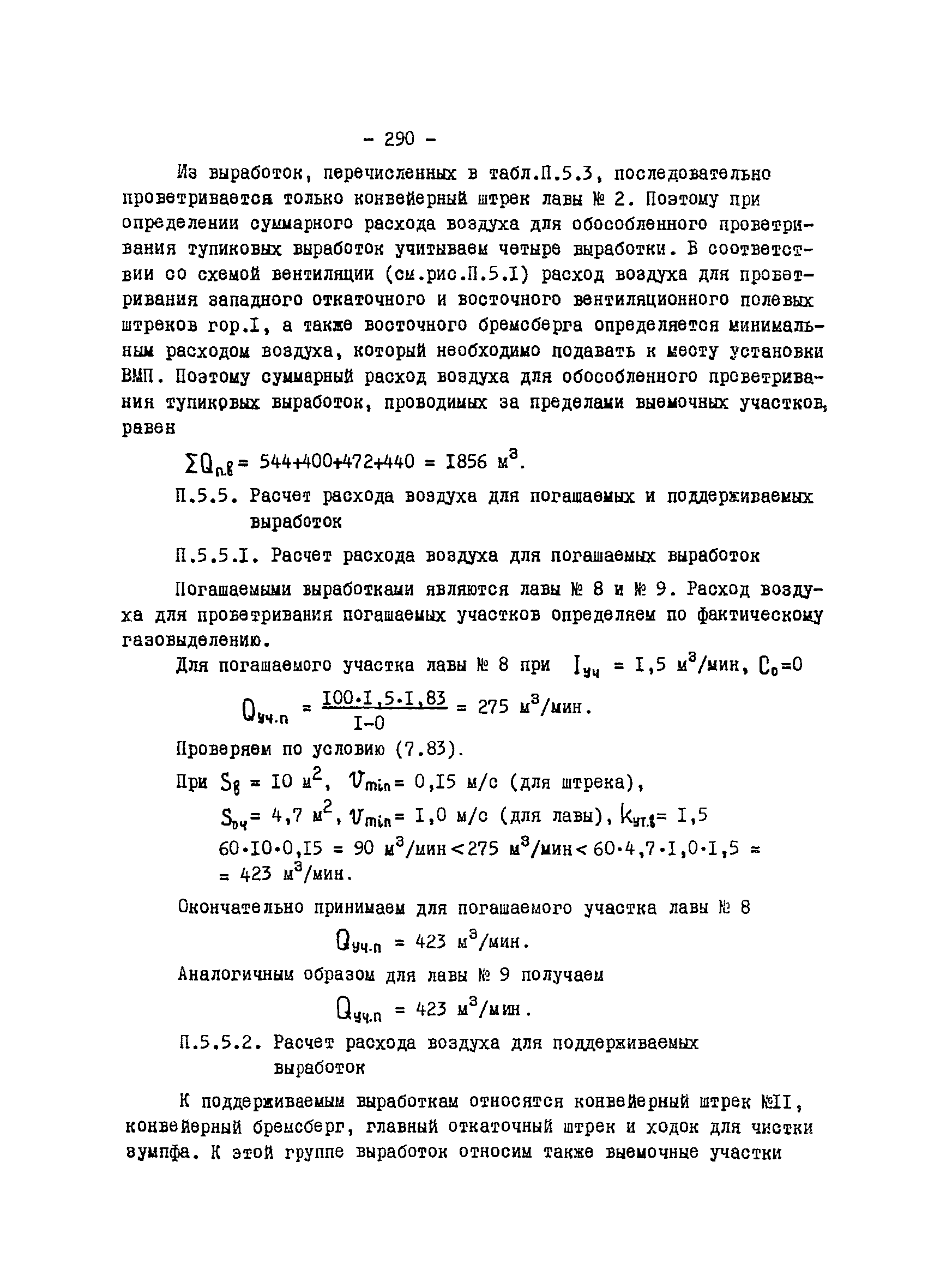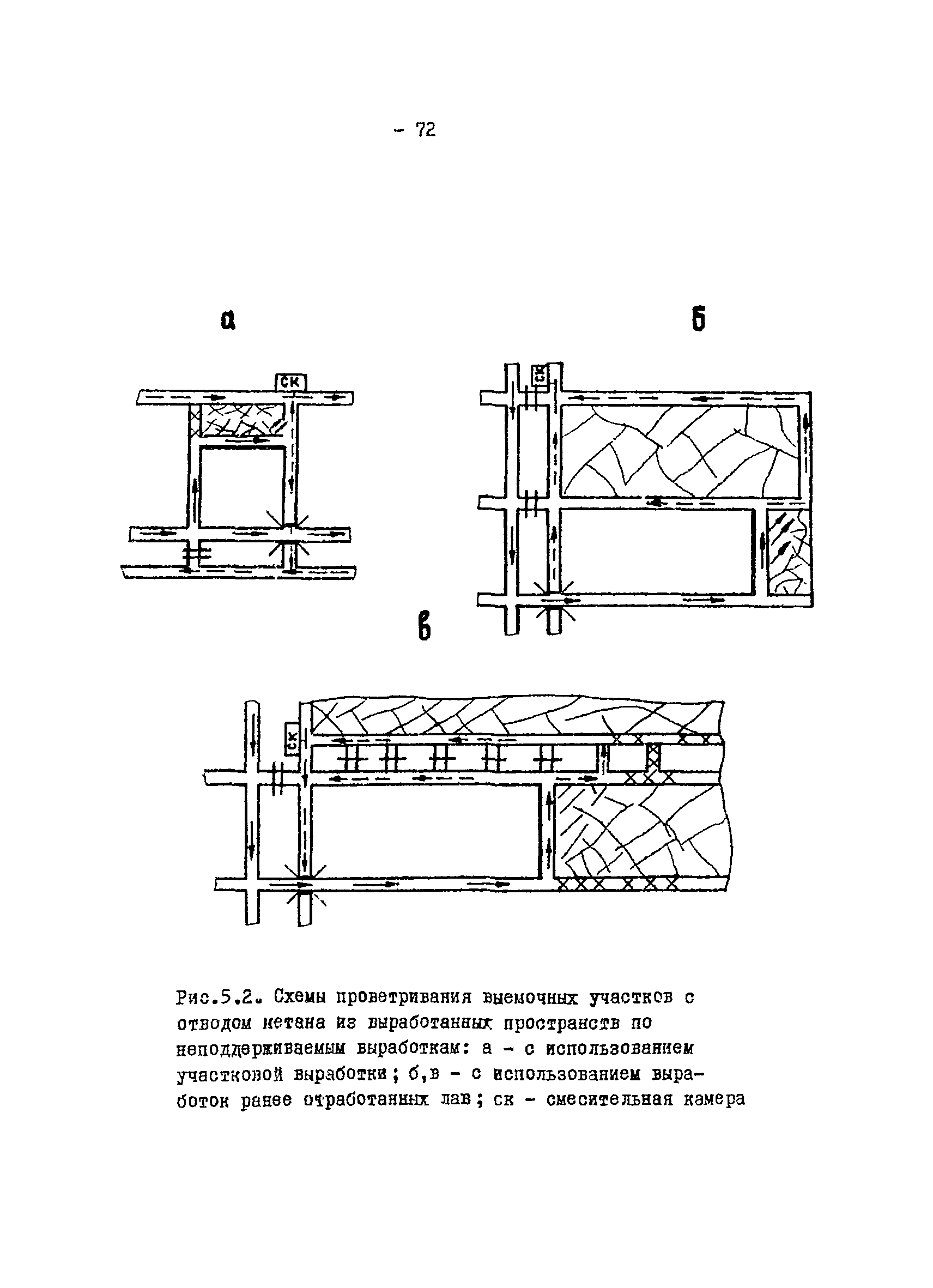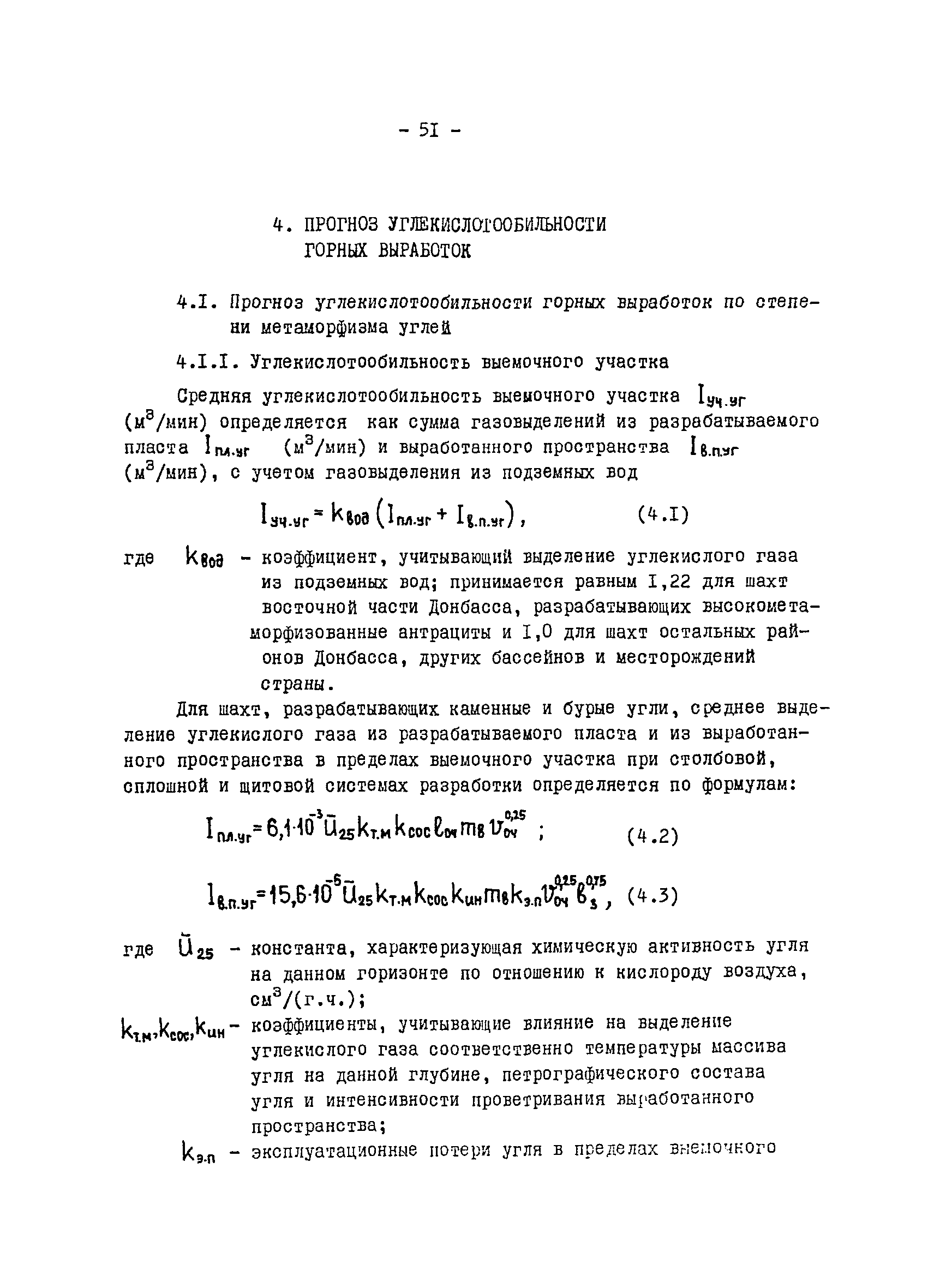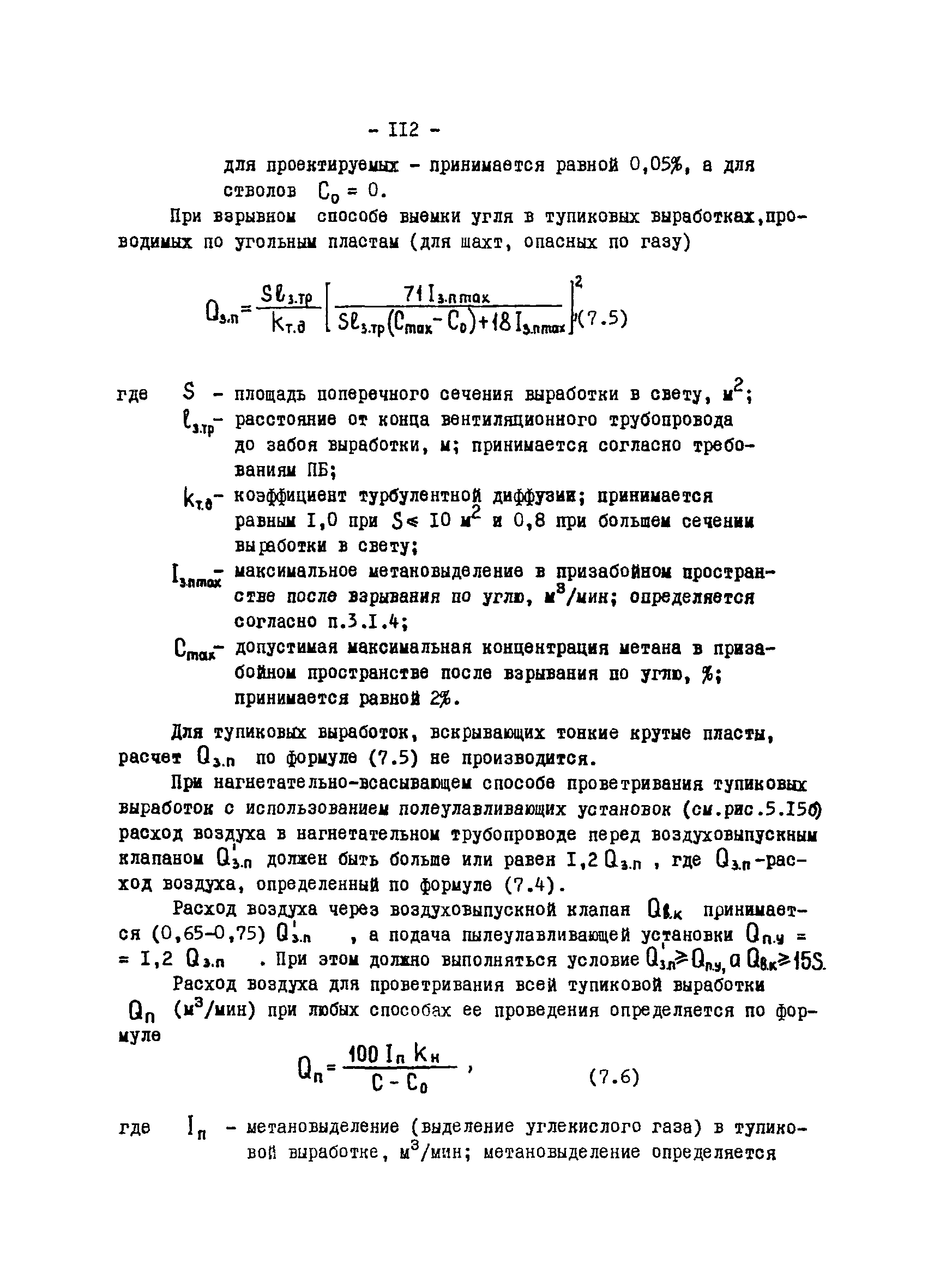 | Оглавление: | Основные условные обозначения 1. Общие положения 1.1. Геологоразведочные организация 1.2. Угольные шахты 1.3. Проектные организации 1.4. Научно-исследовательские институты и служба ВГСЧ 2. Порядок проектирования вентиляции угольных вахт 2.1. Проектирование вентиляции новых шахт и на период строительства 2.2. Проектирование вентиляции реконструируемых шахт и новых горизонтов на действующих шахтах 3. Прогноз метанообильности выработок угольных шахт 3.1. Прогноз метанообильности выработок по метаноносности угольных пластов 3.1.1. Метановыделение из разрабатываемого пласта 3.1.2. Метановыделение из сближенных угольных пластов (спутников) 3.1.3. Метановыделение из вмещающих пород 3.1.4. Метан обильность тупиковых выработок 3.1.5. Метановыделение при проведении вертикальных стволов 3.1.6. Определение относительной метанообильности шахты 3.2. Определение ожидаемой абсолютной газообильности выработок действующей шахты 3.2.1. Общие положения определения фактической газообильности горных выработок 3.2.2. Определение метанообильности тупиковых выработок 3.2.3. Определение газообильности очистных выработок и выемочных участков 3.2.4. Определение ожидаемого метановыделения очистной выработки и выемочного участка 3.2.5. Определение метанообильности шахты 4. Прогноз углекислотообильности горных выработок 4.1. Прогноз углекислотообильности горных выработок по степени метаморфизма углей 4.1.1. Углекислотообильность выемочного участка 4.1.2. Углекислотообильность тупиковых выработок 4.1.3. Углекислотообильность шахтопласта и шахты 4.2. Определение ожидаемой углекислотообильности выработок действующей шахты 4.2.1. Определение углекислотообильности очистных выработок и выемочных участков 4.2.2. Определение углекислотообильности тупиковых выработок 4.2.3. Определение углекислотообильности шахты 5. Способы и схемы проветривания шахт 5.1. Выбор схемы и способа проветривания шахты 5.2. Схемы проветривания выемочных участков 5.2.1. Требования к схемам проветривания выемочных участков 5.2.2. Классификация схем и область их применения 5.2.3. Проверка схем проветривания выемочных участков по опасности местных скоплений метана 5.2.4. Способы предупреждения образования местных скоплений метана 5.2.5. Оценка схем проветривания выемочных участков по фактору эндогенной пожароопасности 5.3. Схемы проветривания стволов и тупиковых выработок 6. Максимально допустимая нагрузка на очистную выработку по газовому фактору 6.1. Расчет максимально допустимой нагрузки на очистную выработку при проектировании новых шахт 6.1.1. Для очистных выработок типа лав по природной метаноносности угольных пластов 6.1.2. Для систем разработки с камерообразными выработками 6.2. Расчет максимально допустимой нагрузки на очистную выработку для действующих шахт 7. Расчет расхода воздуха для проветривания угольных шахт 7.1. Расчет расхода воздуха для шахты в целом 7.2. Расчет расхода воздуха для проветривания одиночных тупиковых выработок и вертикальных стволов 7.3. Расчет расхода воздуха для проветривания очистных выработок 7.4. Расход воздуха для проветривания выемочных участков 7.5. Расход воздуха для проветривания погашаемых и поддерживаемых выработок 7.6. Расход воздуха для проветривания камер 7.7. Утечки воздуха через вентиляционные сооружения 7.8. Выбор средств проветривания тупиковых выработок 