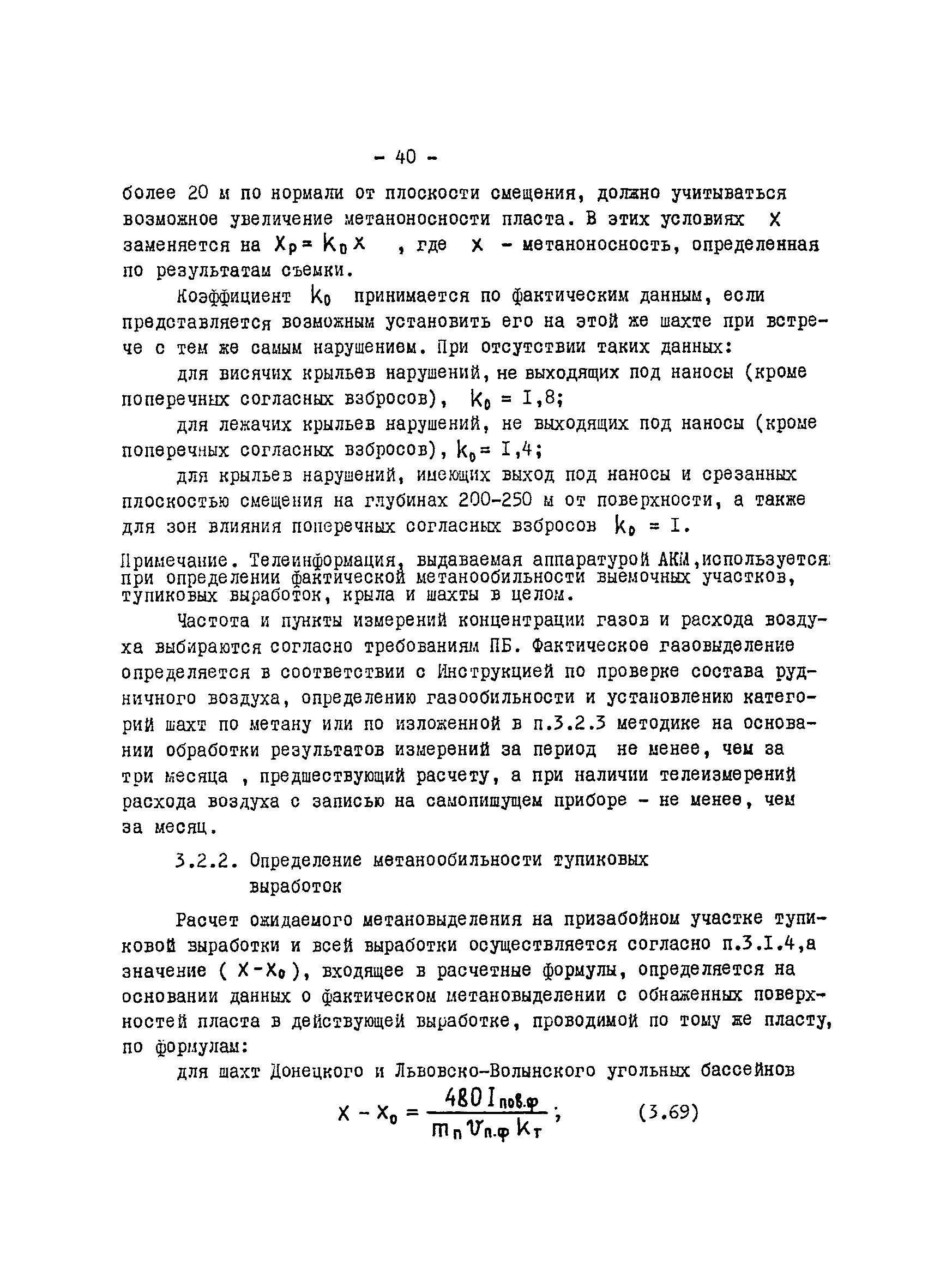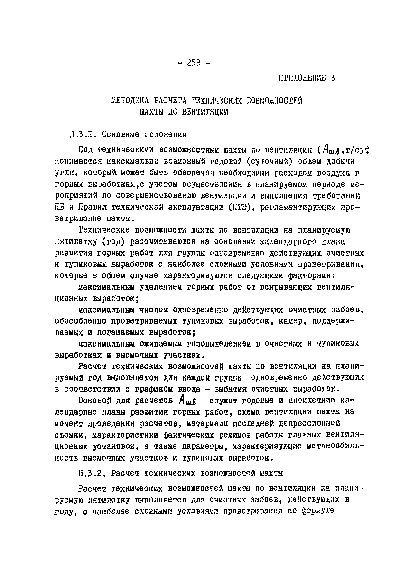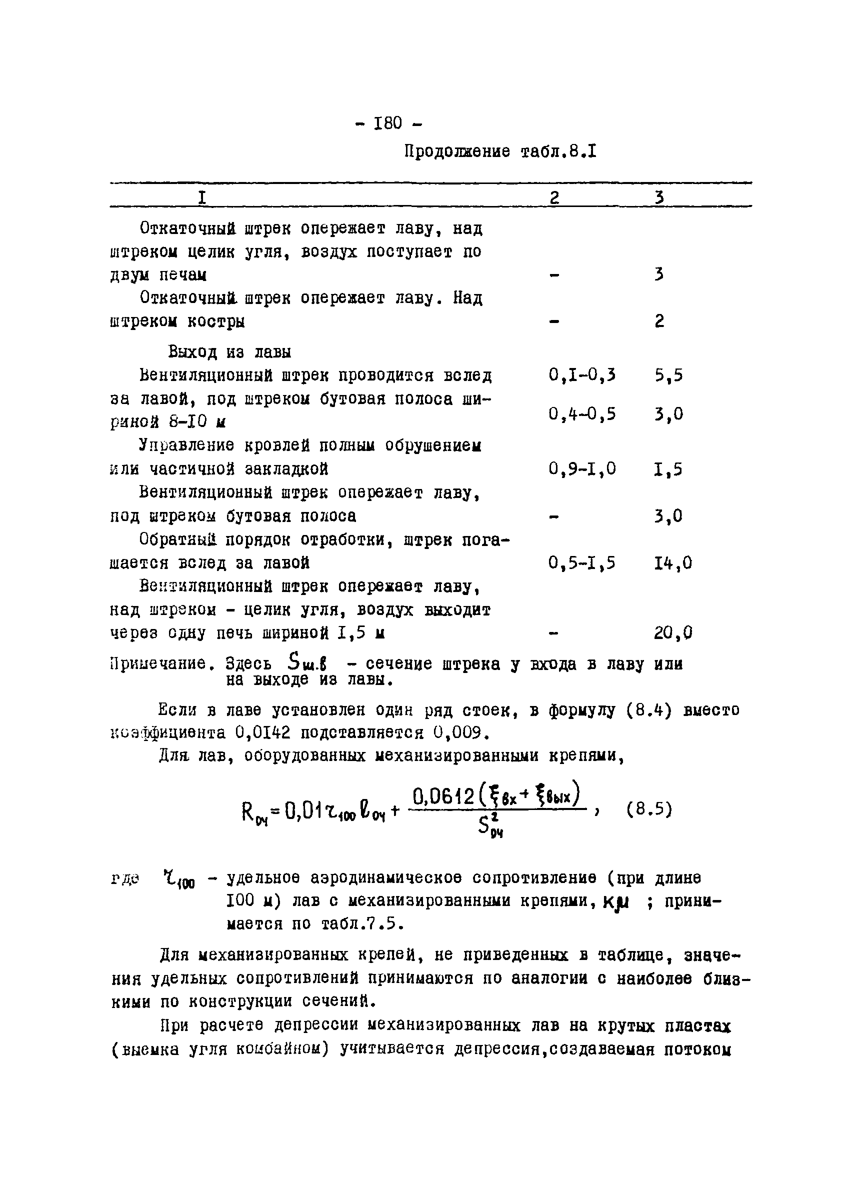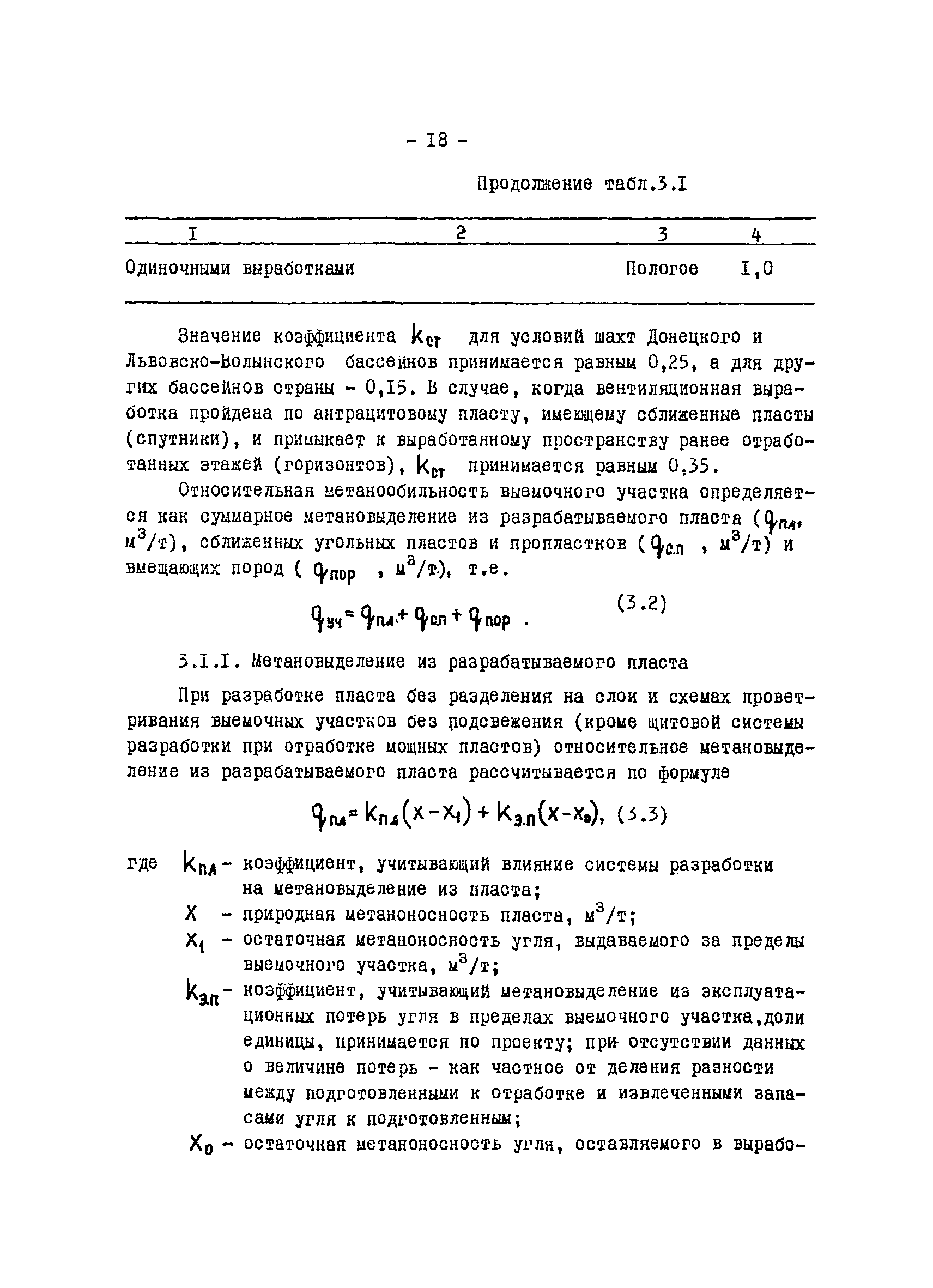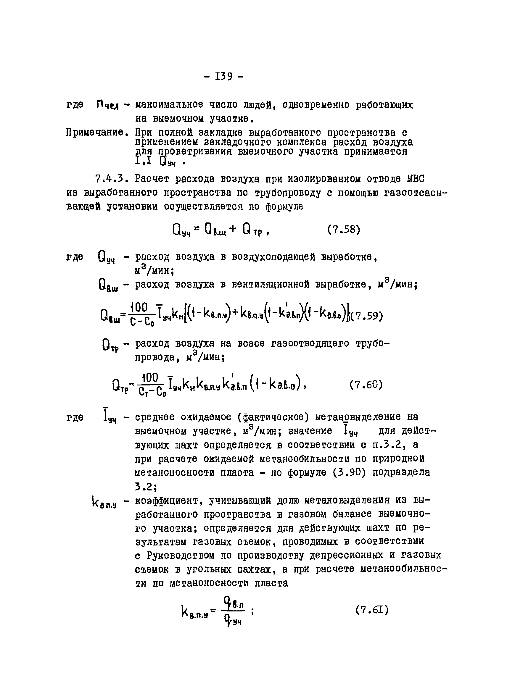 | Оглавление: | Основные условные обозначения 1. Общие положения 1.1. Геологоразведочные организация 1.2. Угольные шахты 1.3. Проектные организации 1.4. Научно-исследовательские институты и служба ВГСЧ 2. Порядок проектирования вентиляции угольных вахт 2.1. Проектирование вентиляции новых шахт и на период строительства 2.2. Проектирование вентиляции реконструируемых шахт и новых горизонтов на действующих шахтах 3. Прогноз метанообильности выработок угольных шахт 3.1. Прогноз метанообильности выработок по метаноносности угольных пластов 3.1.1. Метановыделение из разрабатываемого пласта 3.1.2. Метановыделение из сближенных угольных пластов (спутников) 3.1.3. Метановыделение из вмещающих пород 3.1.4. Метан обильность тупиковых выработок 3.1.5. Метановыделение при проведении вертикальных стволов 3.1.6. Определение относительной метанообильности шахты 3.2. Определение ожидаемой абсолютной газообильности выработок действующей шахты 3.2.1. Общие положения определения фактической газообильности горных выработок 3.2.2. Определение метанообильности тупиковых выработок 3.2.3. Определение газообильности очистных выработок и выемочных участков 3.2.4. Определение ожидаемого метановыделения очистной выработки и выемочного участка 3.2.5. Определение метанообильности шахты 4. Прогноз углекислотообильности горных выработок 4.1. Прогноз углекислотообильности горных выработок по степени метаморфизма углей 4.1.1. Углекислотообильность выемочного участка 4.1.2. Углекислотообильность тупиковых выработок 4.1.3. Углекислотообильность шахтопласта и шахты 4.2. Определение ожидаемой углекислотообильности выработок действующей шахты 4.2.1. Определение углекислотообильности очистных выработок и выемочных участков 4.2.2. Определение углекислотообильности тупиковых выработок 4.2.3. Определение углекислотообильности шахты 5. Способы и схемы проветривания шахт 5.1. Выбор схемы и способа проветривания шахты 5.2. Схемы проветривания выемочных участков 5.2.1. Требования к схемам проветривания выемочных участков 5.2.2. Классификация схем и область их применения 5.2.3. Проверка схем проветривания выемочных участков по опасности местных скоплений метана 5.2.4. Способы предупреждения образования местных скоплений метана 5.2.5. Оценка схем проветривания выемочных участков по фактору эндогенной пожароопасности 5.3. Схемы проветривания стволов и тупиковых выработок 6. Максимально допустимая нагрузка на очистную выработку по газовому фактору 6.1. Расчет максимально допустимой нагрузки на очистную выработку при проектировании новых шахт 6.1.1. Для очистных выработок типа лав по природной метаноносности угольных пластов 6.1.2. Для систем разработки с камерообразными выработками 6.2. Расчет максимально допустимой нагрузки на очистную выработку для действующих шахт 7. Расчет расхода воздуха для проветривания угольных шахт 7.1. Расчет расхода воздуха для шахты в целом 7.2. Расчет расхода воздуха для проветривания одиночных тупиковых выработок и вертикальных стволов 7.3. Расчет расхода воздуха для проветривания очистных выработок 7.4. Расход воздуха для проветривания выемочных участков 7.5. Расход воздуха для проветривания погашаемых и поддерживаемых выработок 7.6. Расход воздуха для проветривания камер 7.7. Утечки воздуха через вентиляционные сооружения 7.8. Выбор средств проветривания тупиковых выработок 