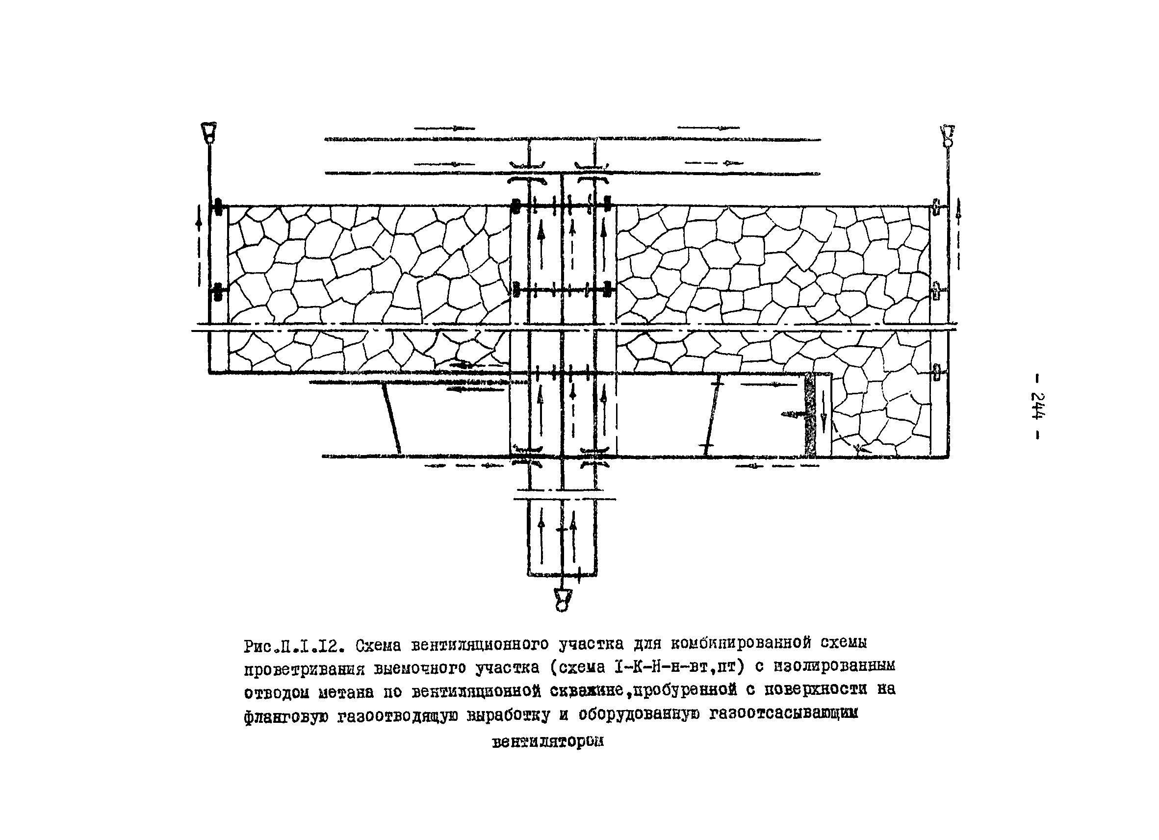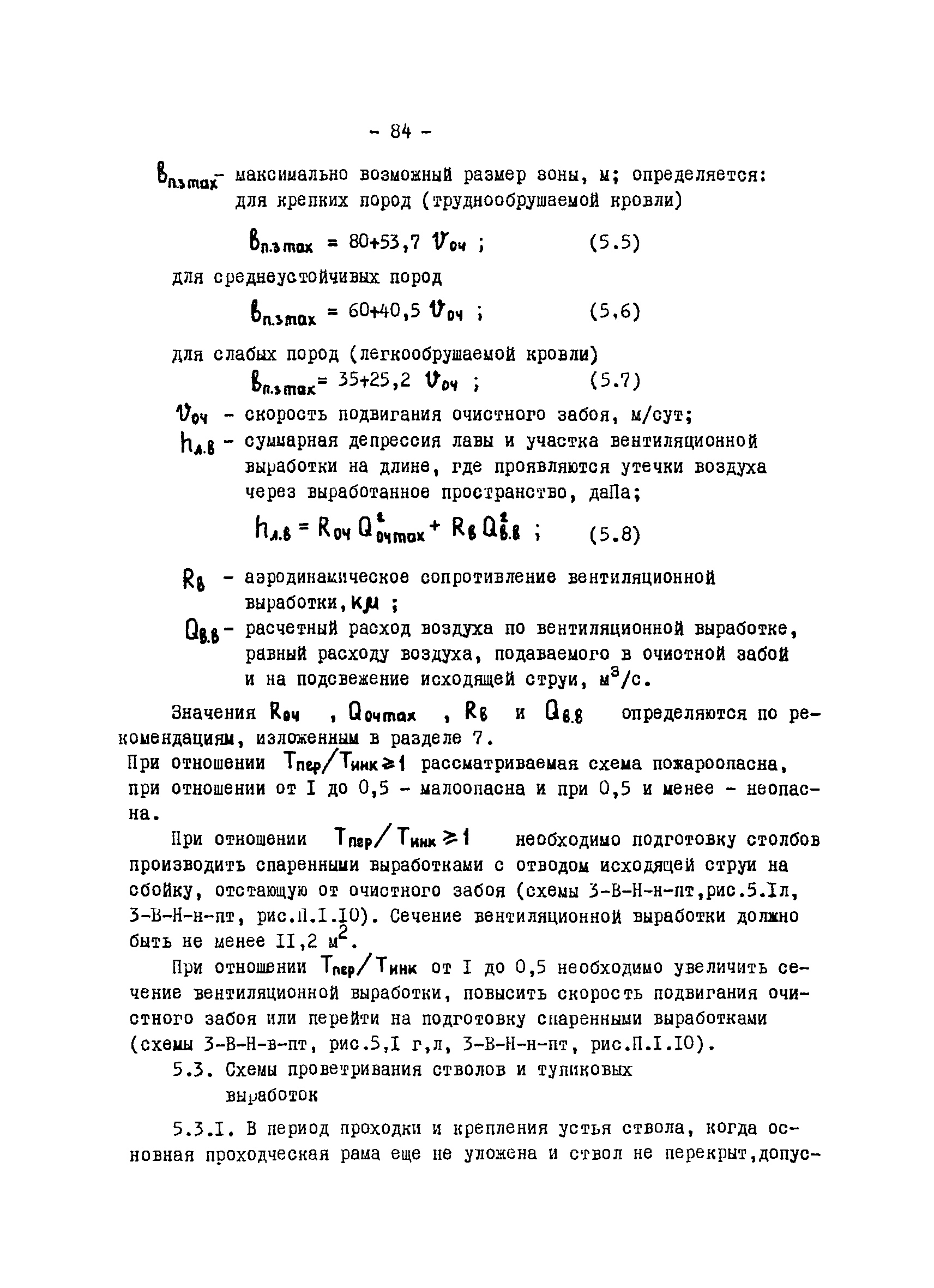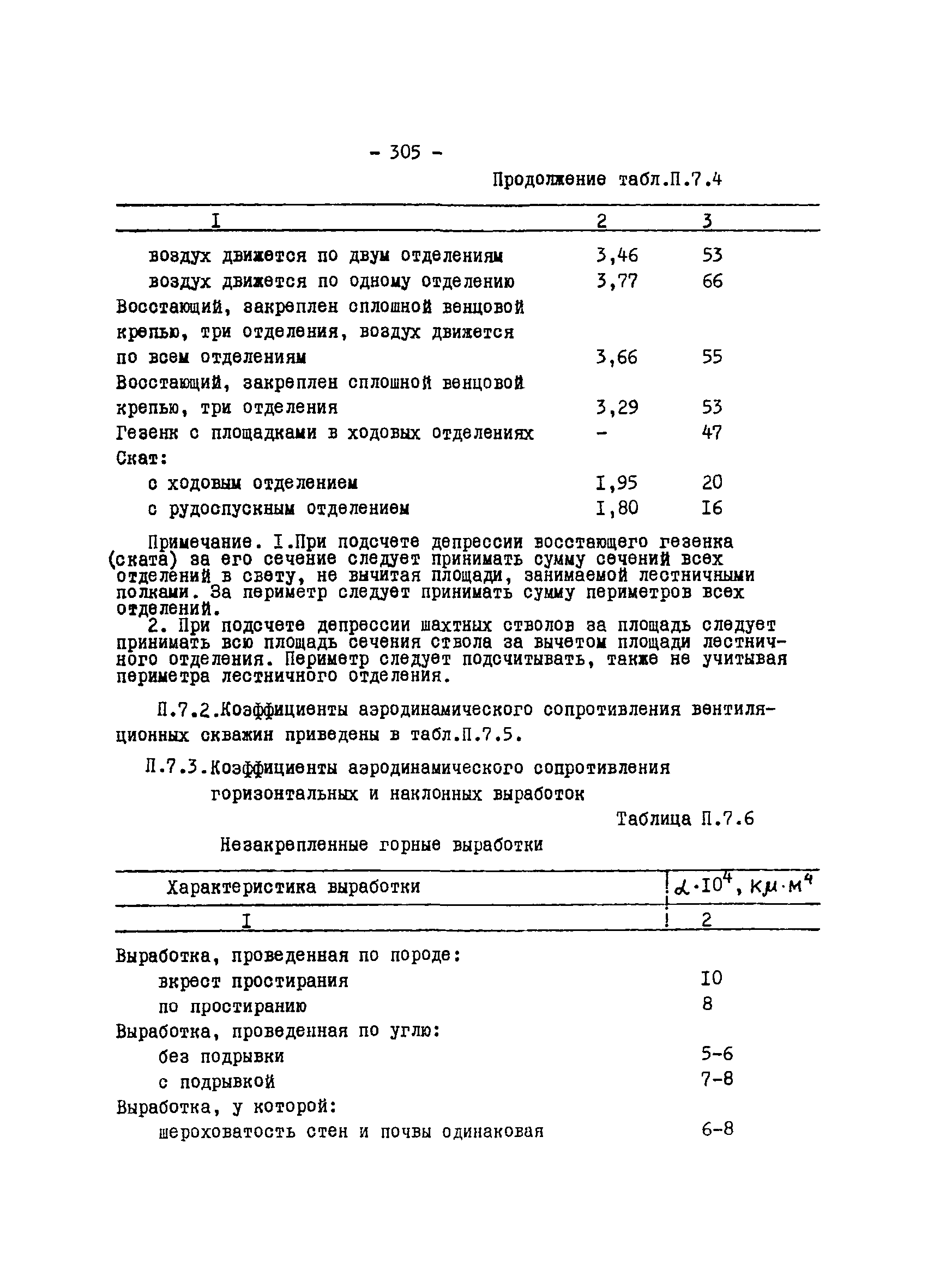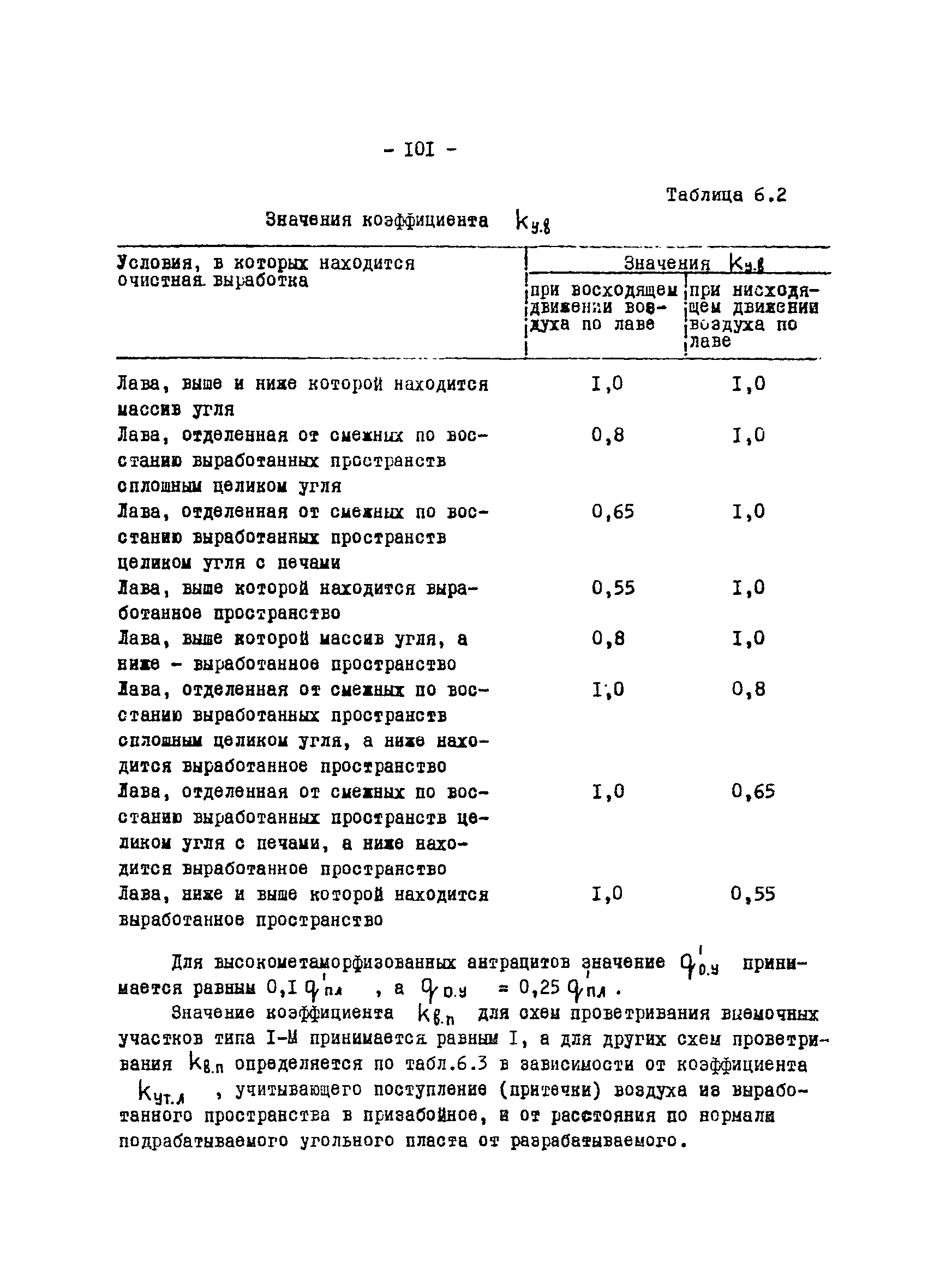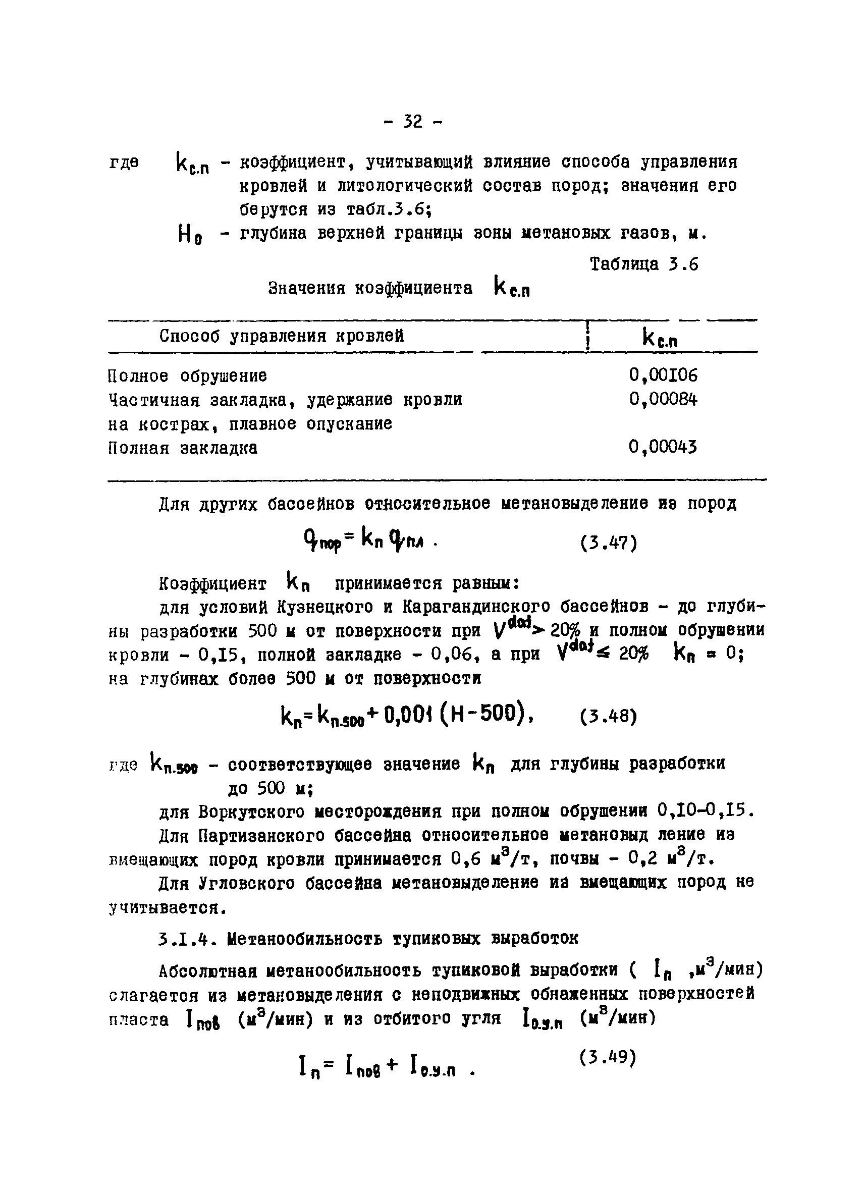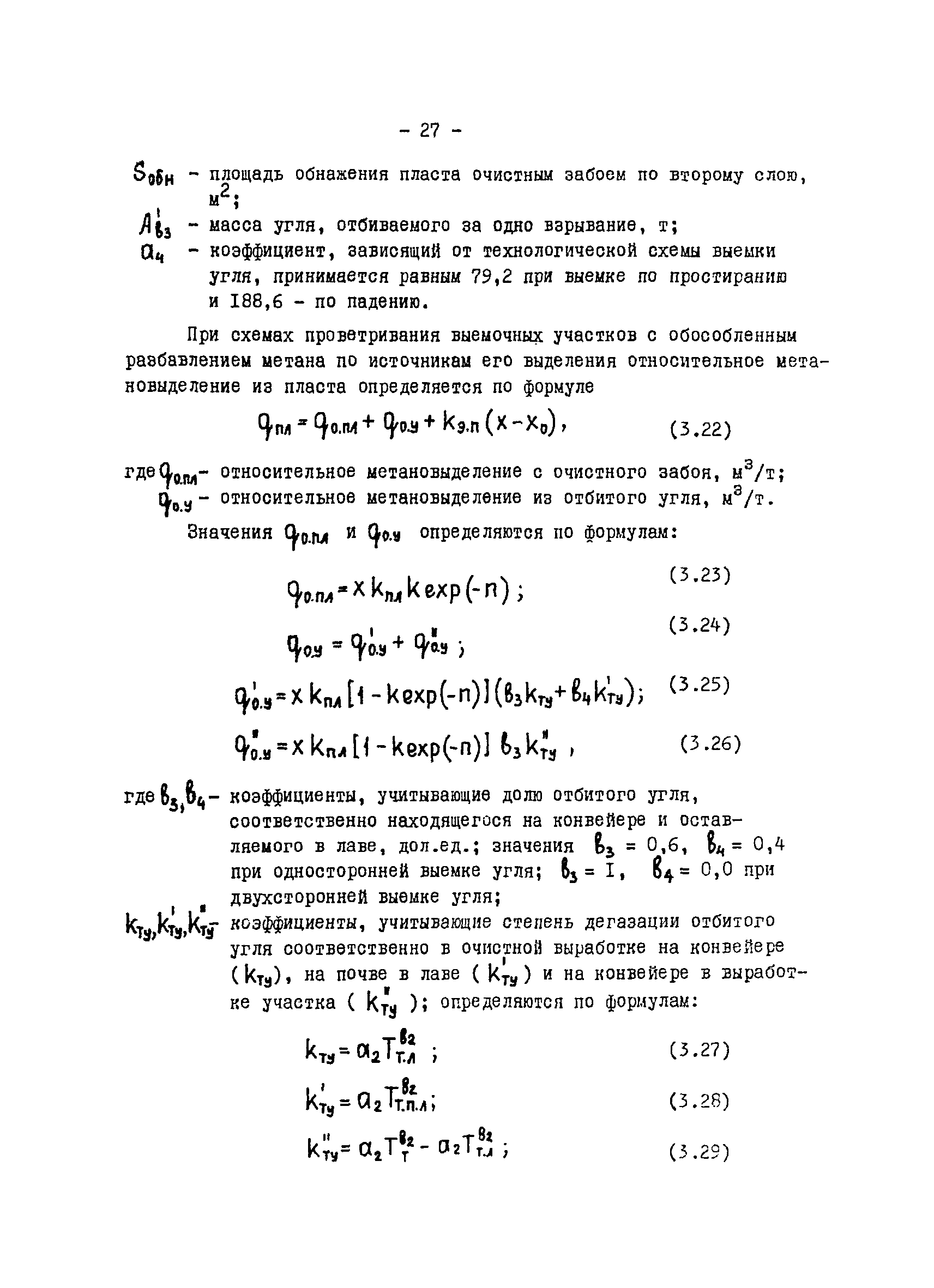 | Оглавление: | Основные условные обозначения 1. Общие положения 1.1. Геологоразведочные организация 1.2. Угольные шахты 1.3. Проектные организации 1.4. Научно-исследовательские институты и служба ВГСЧ 2. Порядок проектирования вентиляции угольных вахт 2.1. Проектирование вентиляции новых шахт и на период строительства 2.2. Проектирование вентиляции реконструируемых шахт и новых горизонтов на действующих шахтах 3. Прогноз метанообильности выработок угольных шахт 3.1. Прогноз метанообильности выработок по метаноносности угольных пластов 3.1.1. Метановыделение из разрабатываемого пласта 3.1.2. Метановыделение из сближенных угольных пластов (спутников) 3.1.3. Метановыделение из вмещающих пород 3.1.4. Метан обильность тупиковых выработок 3.1.5. Метановыделение при проведении вертикальных стволов 3.1.6. Определение относительной метанообильности шахты 3.2. Определение ожидаемой абсолютной газообильности выработок действующей шахты 3.2.1. Общие положения определения фактической газообильности горных выработок 3.2.2. Определение метанообильности тупиковых выработок 3.2.3. Определение газообильности очистных выработок и выемочных участков 3.2.4. Определение ожидаемого метановыделения очистной выработки и выемочного участка 3.2.5. Определение метанообильности шахты 4. Прогноз углекислотообильности горных выработок 4.1. Прогноз углекислотообильности горных выработок по степени метаморфизма углей 4.1.1. Углекислотообильность выемочного участка 4.1.2. Углекислотообильность тупиковых выработок 4.1.3. Углекислотообильность шахтопласта и шахты 4.2. Определение ожидаемой углекислотообильности выработок действующей шахты 4.2.1. Определение углекислотообильности очистных выработок и выемочных участков 4.2.2. Определение углекислотообильности тупиковых выработок 4.2.3. Определение углекислотообильности шахты 5. Способы и схемы проветривания шахт 5.1. Выбор схемы и способа проветривания шахты 5.2. Схемы проветривания выемочных участков 5.2.1. Требования к схемам проветривания выемочных участков 5.2.2. Классификация схем и область их применения 5.2.3. Проверка схем проветривания выемочных участков по опасности местных скоплений метана 5.2.4. Способы предупреждения образования местных скоплений метана 5.2.5. Оценка схем проветривания выемочных участков по фактору эндогенной пожароопасности 5.3. Схемы проветривания стволов и тупиковых выработок 6. Максимально допустимая нагрузка на очистную выработку по газовому фактору 6.1. Расчет максимально допустимой нагрузки на очистную выработку при проектировании новых шахт 6.1.1. Для очистных выработок типа лав по природной метаноносности угольных пластов 6.1.2. Для систем разработки с камерообразными выработками 6.2. Расчет максимально допустимой нагрузки на очистную выработку для действующих шахт 7. Расчет расхода воздуха для проветривания угольных шахт 7.1. Расчет расхода воздуха для шахты в целом 7.2. Расчет расхода воздуха для проветривания одиночных тупиковых выработок и вертикальных стволов 7.3. Расчет расхода воздуха для проветривания очистных выработок 7.4. Расход воздуха для проветривания выемочных участков 7.5. Расход воздуха для проветривания погашаемых и поддерживаемых выработок 7.6. Расход воздуха для проветривания камер 7.7. Утечки воздуха через вентиляционные сооружения 7.8. Выбор средств проветривания тупиковых выработок 