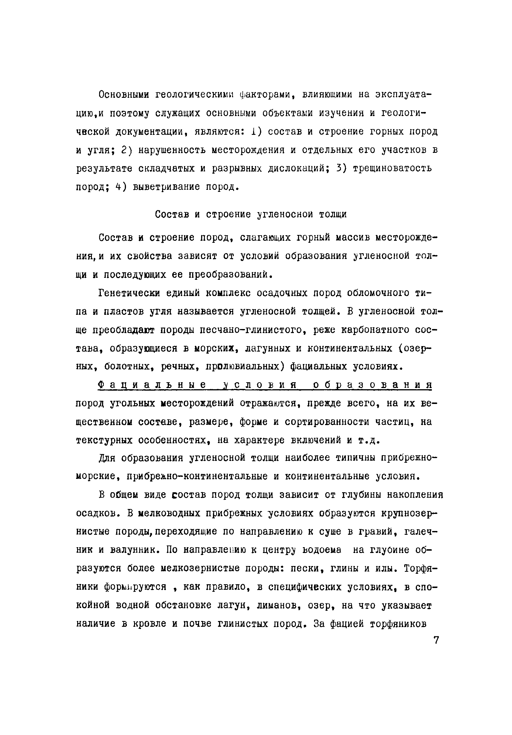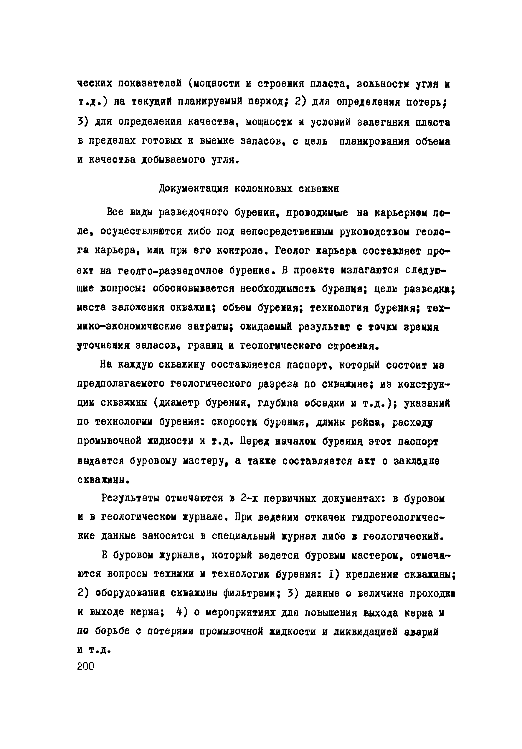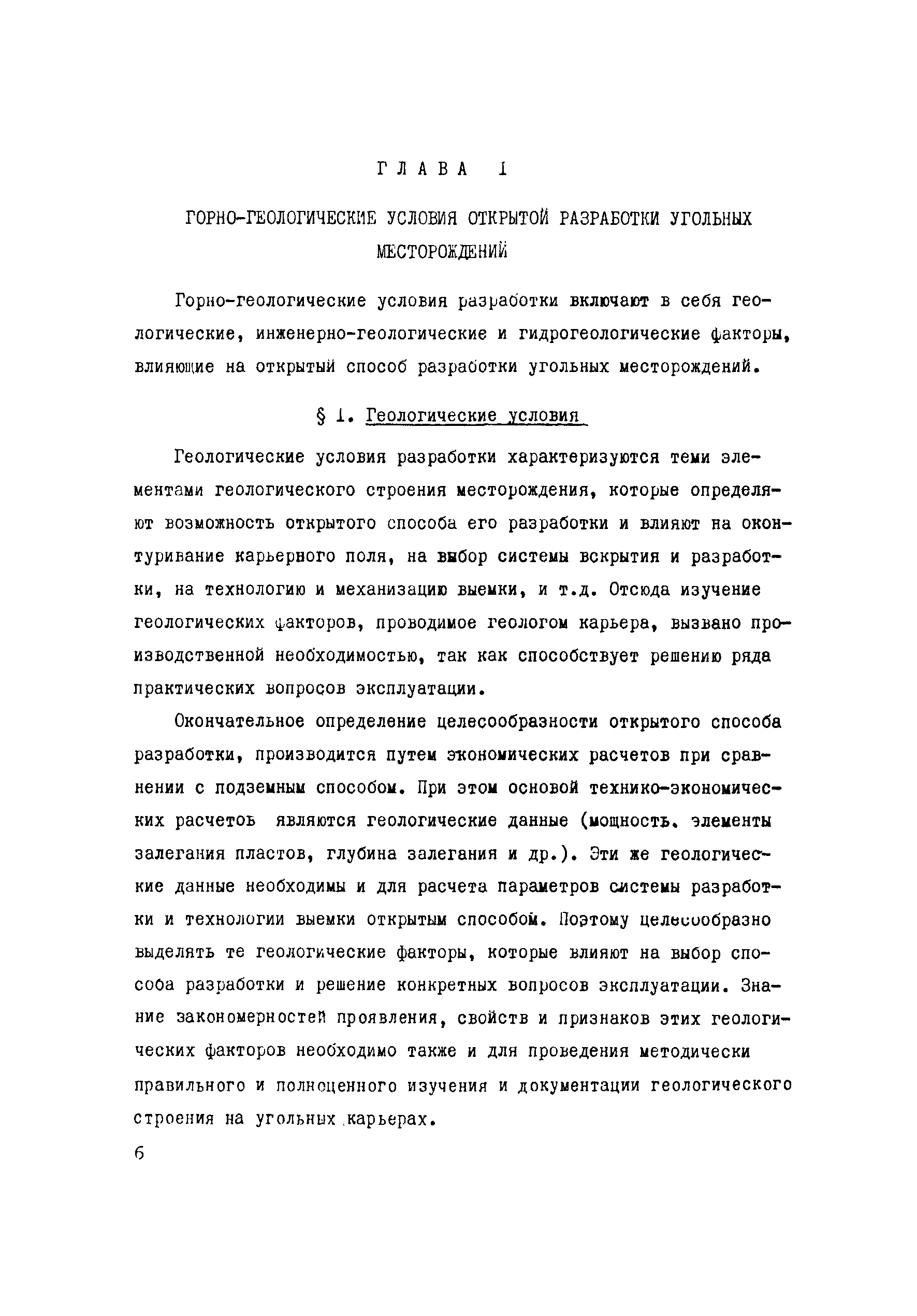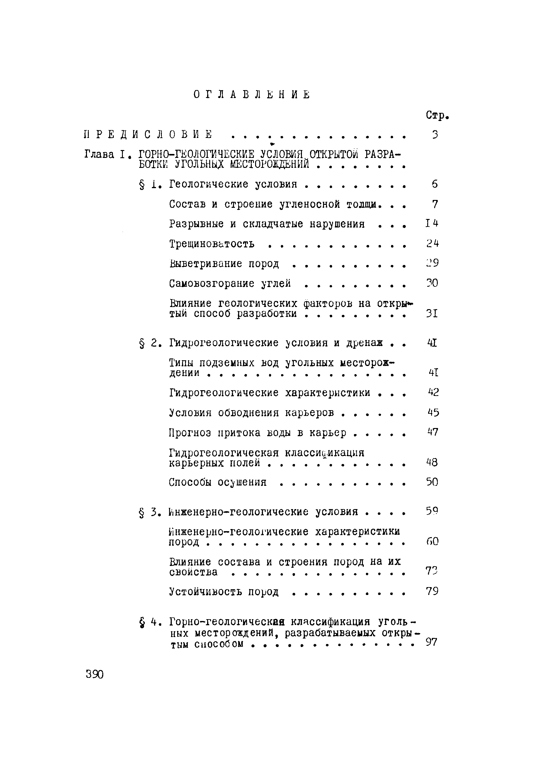 | Оглавление: | Глава 1. Горно-геологические условия открытой разработки угольных месторождений § 1. Геологические условия Состав и строение угленосной толщи Разрывные и складчатые нарушения Трещиноватость Выветривание пород Самовозгорание углей Влияние геологических факторов на открытый способ разработки § 2. Гидрогеологические условия и дренаж Типы подземных вод угольных месторождений Гидрогеологические характеристики Условия обводнения карьеров Прогноз притока воды в карьер Гидрогеологическая классификация карьерных полей Способы осушения § 3. Инженерно-геологические условия Инженерно-геологические характеристики пород Влияние состава и строения пород на их свойства Устойчивость пород § 4. Горно-геологическая классификация угольных месторождений, разрабатываемых открытым способом Глава 2. Геологическая документация на угольных карьерах § 1. Задачи геологической документации § 2. Методика геологической документации Объекты геологической документации Приемы и средства документации Изучение вмещающих пород Изучение угольного пласта Изучение разрывных нарушений Изучение трещиноватости § 3. Геологическая съемка на карьерах Геологическая съемка на карьерах с простыми горно-геологическими условиями Геологическая съемка на карьерах с горно-геологическими условиями средней сложностей Геологическая съемка на карьерах со сложными горно-геологическими условиями § 4. Усовершенствование геологической документации Геологическая документация с помощью «Телетопа» Геологическая документация с помощью рисовального прибора Геологическая фотодокументация § 5. Геологическая документация скважин Документация колонковых скважин Документация скважин ручного бурения § 6. Прогнозирование элементов геологического строения Глава 3. Изучение качества угля § 1. Опробование угля Задачи и виды опробования Способы отбора проб Сеть опробования и изменчивость основных показателей качества угля Документация при опробовании Контроль опробования § 2. Усовершенствование опробования Геофизические методы опробования Определение зольности по объемному (удельному) весу угля Механизированный отбор проб § 3. Определение зоны окисленных углей § 4. Изучение самовозгорания угля § 5. Контроль за полнотой выемки Глава 4. Гидрогеологические наблюдения § 1. Методика гидрогеологических наблюдений Замер притока воды Наблюдения за уровнями подземных вод Пробные откачки Изучение физико-химических свойств воды § 2. Гидрогеологическая документация горных выработок § 3. Гидрогеологическая съемка Глава 5. Изучение инженерно-геологических условий § 1. Изучение устойчивости бортов Инженерно-геологическая документация Натурные изучения массива Полевые методы определения физико-механических свойств пород § 2. Изучение выветривания пород Признаки и свойства выветрелых пород Методика изучения выветривания § 3. Определение показателей добываемости пород § 4. Отбор проб и образцов § 5. Лабораторные исследования Глава 6. Геологические оборудование и документы § 1. Приборы и приспособления для отбора проб, гидрогеологических и инженерно-геологических наблюдений Инструменты и приспособления, используемые при опробовании Приборы и приспособления для гидрогеологических наблюдений Приборы и приспособления для инженерно-геологических иссле
