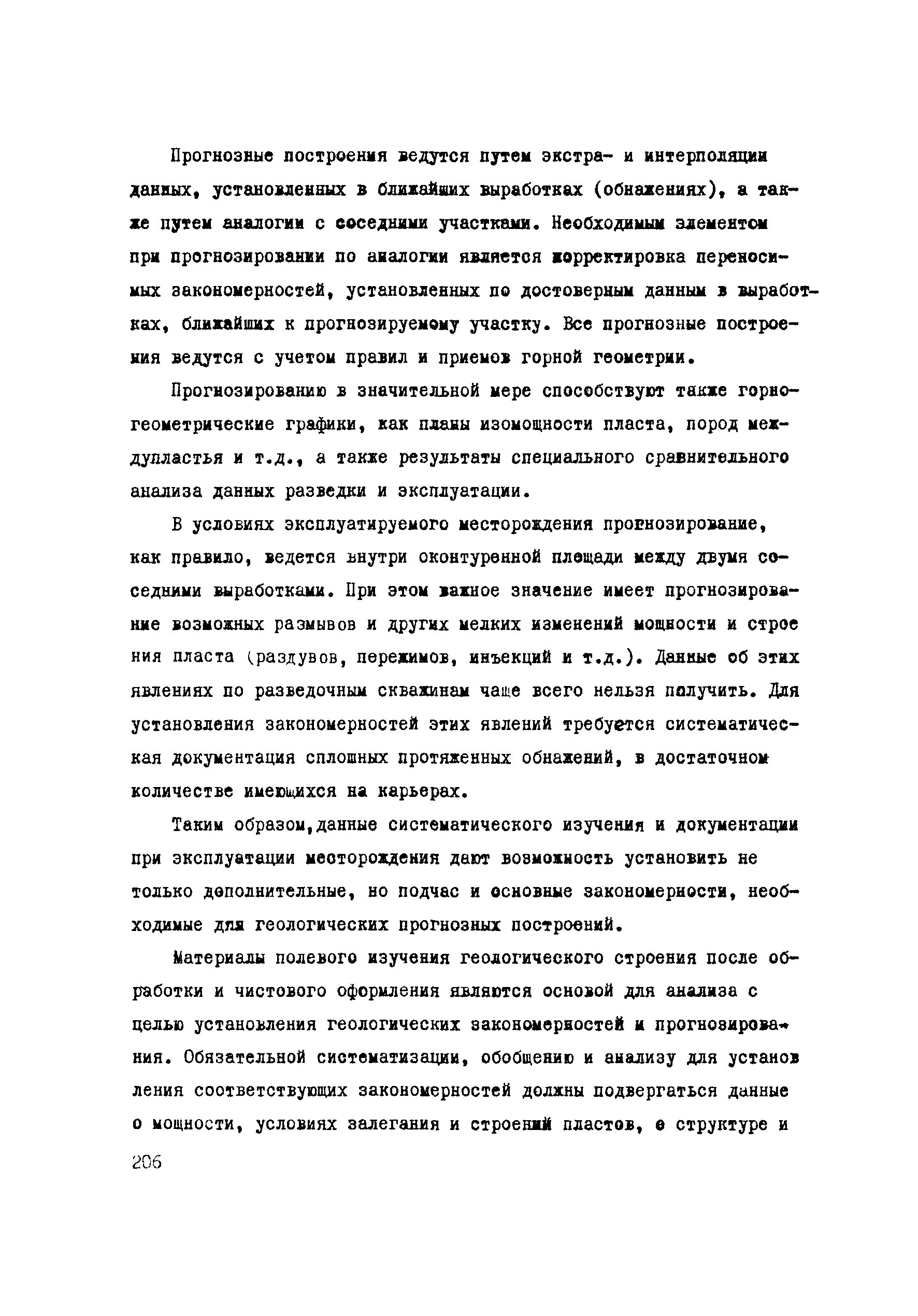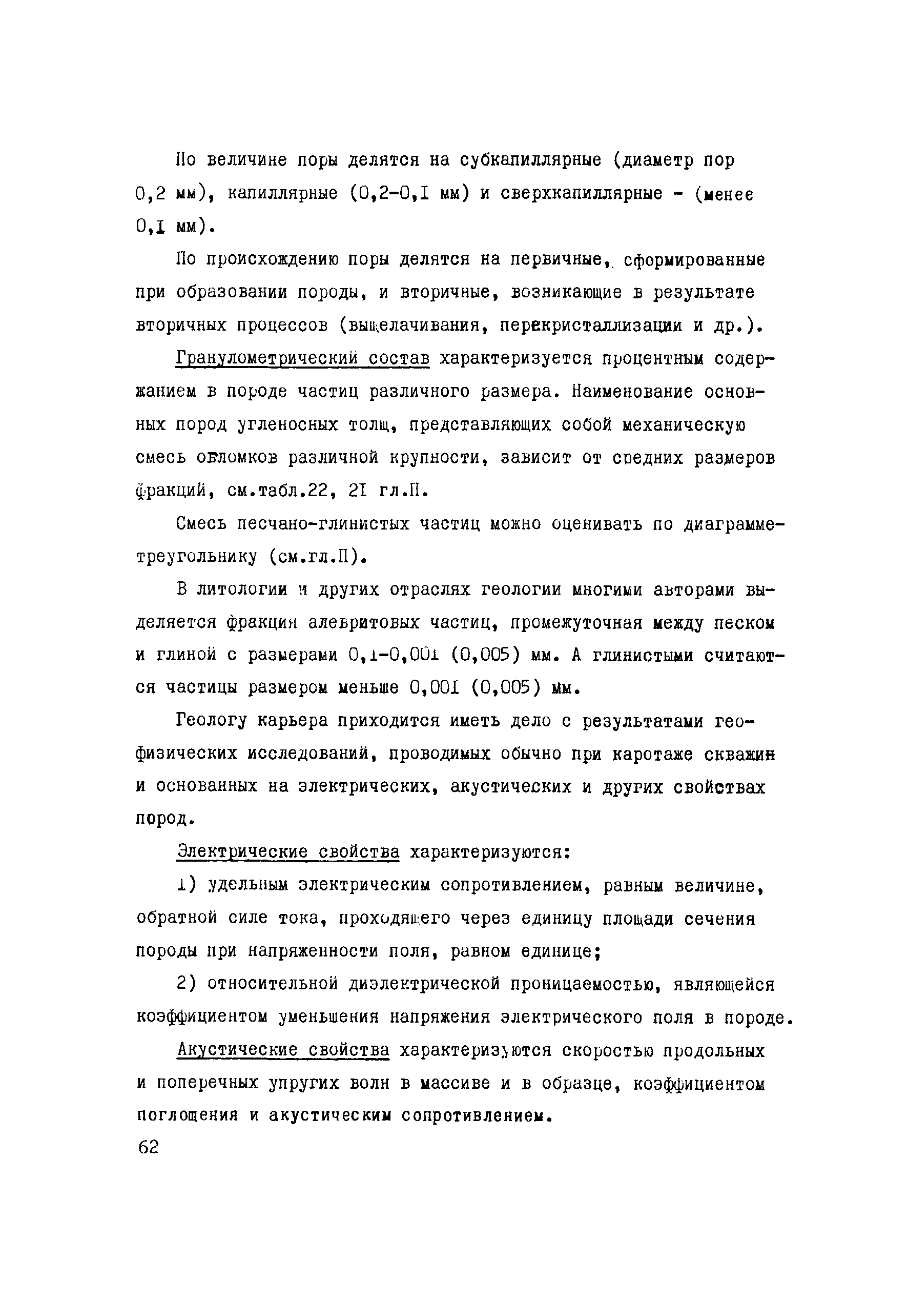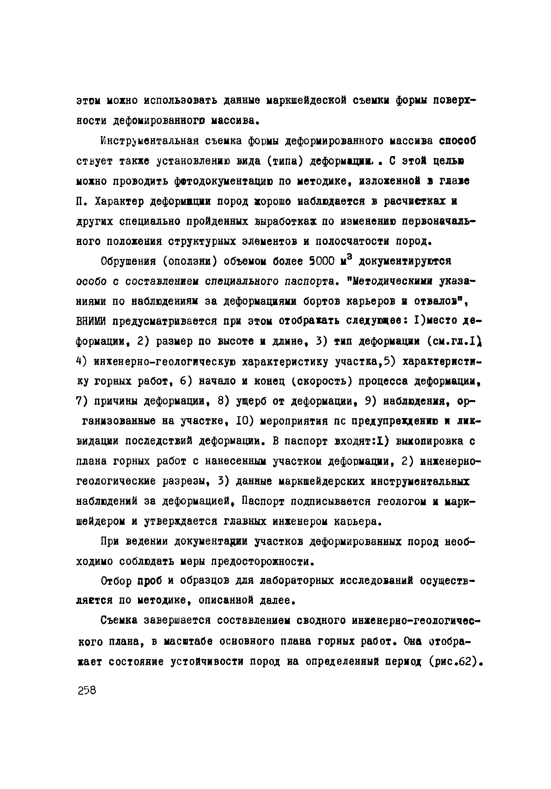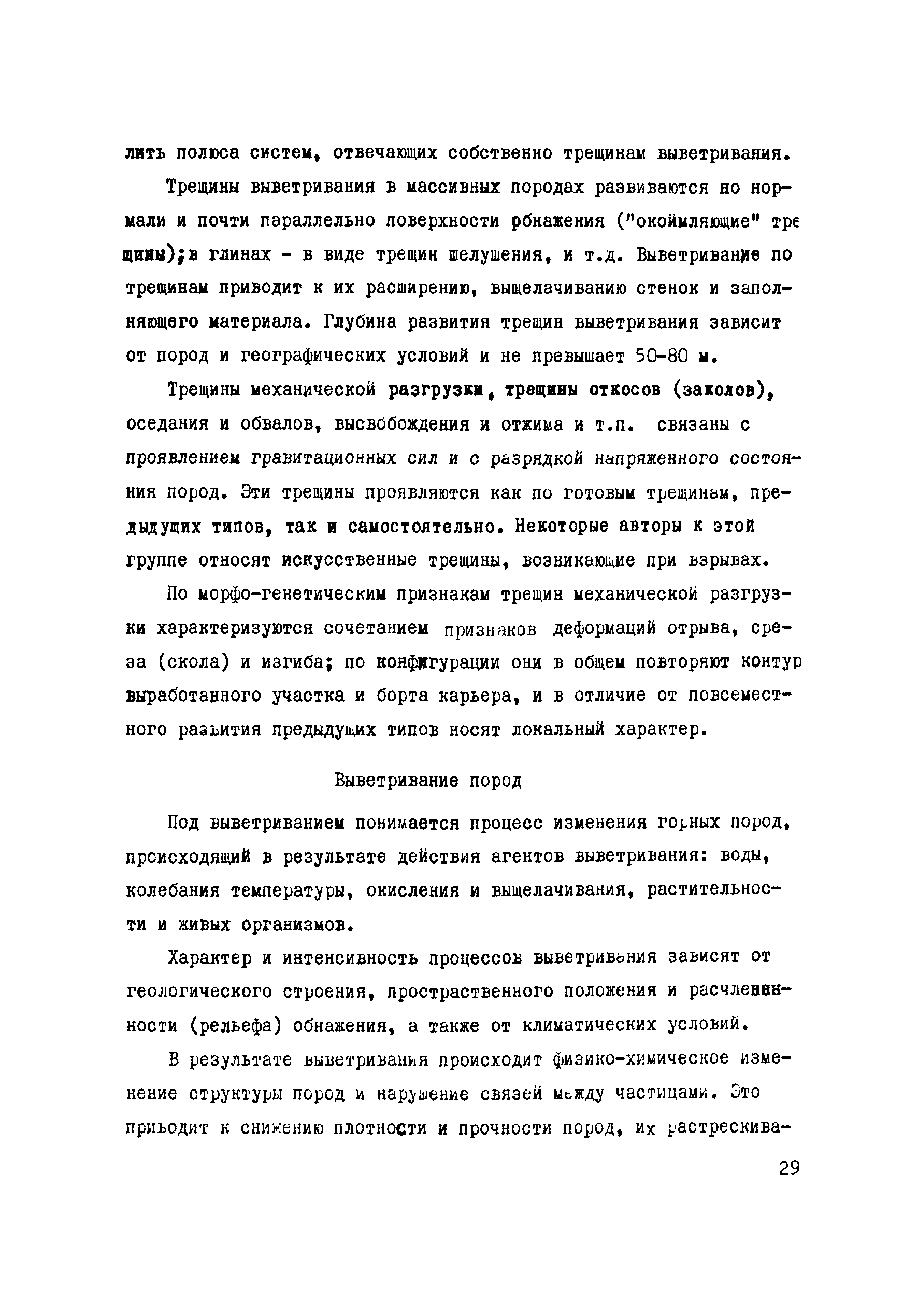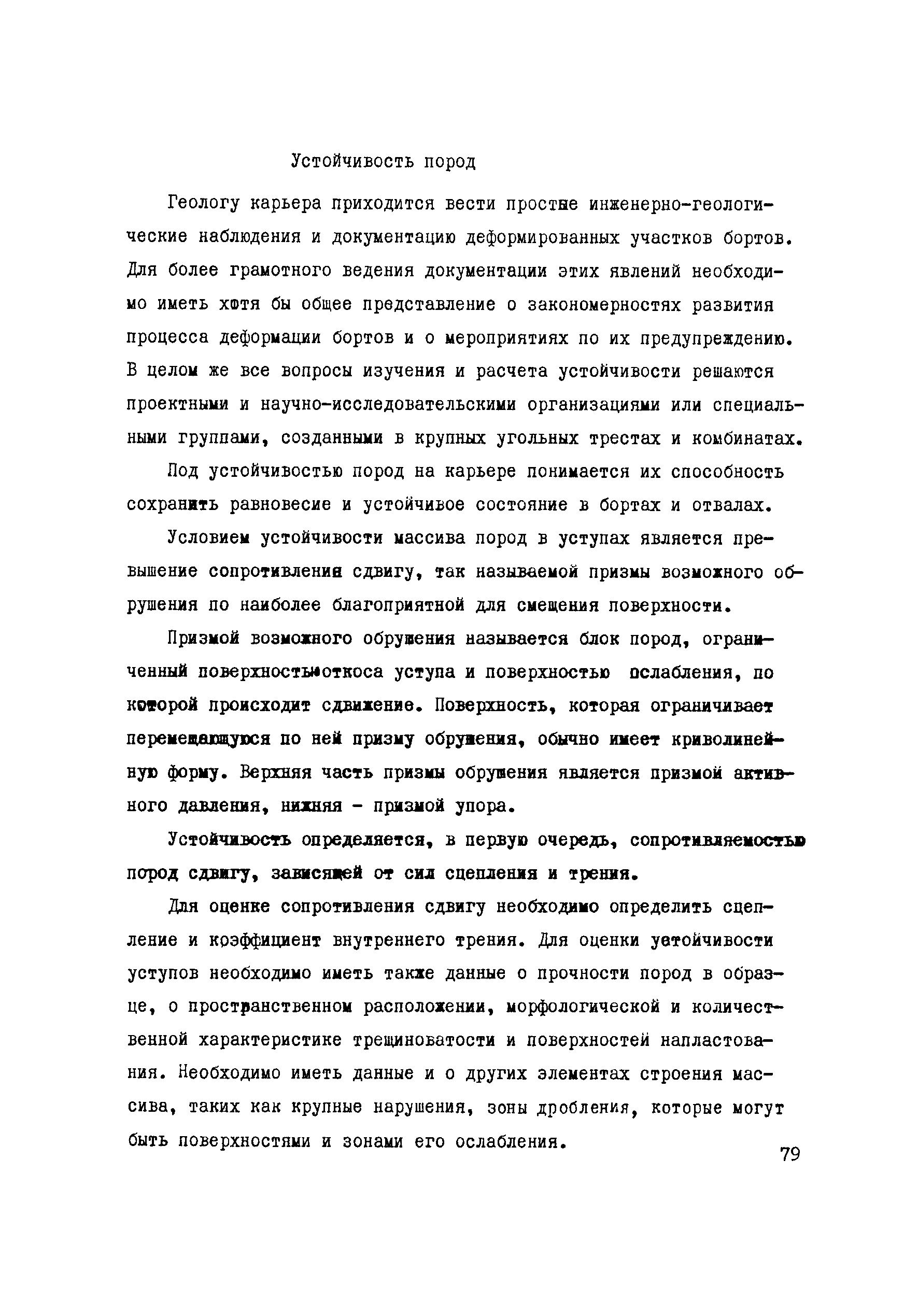 | Оглавление: | Глава 1. Горно-геологические условия открытой разработки угольных месторождений § 1. Геологические условия Состав и строение угленосной толщи Разрывные и складчатые нарушения Трещиноватость Выветривание пород Самовозгорание углей Влияние геологических факторов на открытый способ разработки § 2. Гидрогеологические условия и дренаж Типы подземных вод угольных месторождений Гидрогеологические характеристики Условия обводнения карьеров Прогноз притока воды в карьер Гидрогеологическая классификация карьерных полей Способы осушения § 3. Инженерно-геологические условия Инженерно-геологические характеристики пород Влияние состава и строения пород на их свойства Устойчивость пород § 4. Горно-геологическая классификация угольных месторождений, разрабатываемых открытым способом Глава 2. Геологическая документация на угольных карьерах § 1. Задачи геологической документации § 2. Методика геологической документации Объекты геологической документации Приемы и средства документации Изучение вмещающих пород Изучение угольного пласта Изучение разрывных нарушений Изучение трещиноватости § 3. Геологическая съемка на карьерах Геологическая съемка на карьерах с простыми горно-геологическими условиями Геологическая съемка на карьерах с горно-геологическими условиями средней сложностей Геологическая съемка на карьерах со сложными горно-геологическими условиями § 4. Усовершенствование геологической документации Геологическая документация с помощью «Телетопа» Геологическая документация с помощью рисовального прибора Геологическая фотодокументация § 5. Геологическая документация скважин Документация колонковых скважин Документация скважин ручного бурения § 6. Прогнозирование элементов геологического строения Глава 3. Изучение качества угля § 1. Опробование угля Задачи и виды опробования Способы отбора проб Сеть опробования и изменчивость основных показателей качества угля Документация при опробовании Контроль опробования § 2. Усовершенствование опробования Геофизические методы опробования Определение зольности по объемному (удельному) весу угля Механизированный отбор проб § 3. Определение зоны окисленных углей § 4. Изучение самовозгорания угля § 5. Контроль за полнотой выемки Глава 4. Гидрогеологические наблюдения § 1. Методика гидрогеологических наблюдений Замер притока воды Наблюдения за уровнями подземных вод Пробные откачки Изучение физико-химических свойств воды § 2. Гидрогеологическая документация горных выработок § 3. Гидрогеологическая съемка Глава 5. Изучение инженерно-геологических условий § 1. Изучение устойчивости бортов Инженерно-геологическая документация Натурные изучения массива Полевые методы определения физико-механических свойств пород § 2. Изучение выветривания пород Признаки и свойства выветрелых пород Методика изучения выветривания § 3. Определение показателей добываемости пород § 4. Отбор проб и образцов § 5. Лабораторные исследования Глава 6. Геологические оборудование и документы § 1. Приборы и приспособления для отбора проб, гидрогеологических и инженерно-геологических наблюдений Инструменты и приспособления, используемые при опробовании Приборы и приспособления для гидрогеологических наблюдений Приборы и приспособления для инженерно-геологических иссле