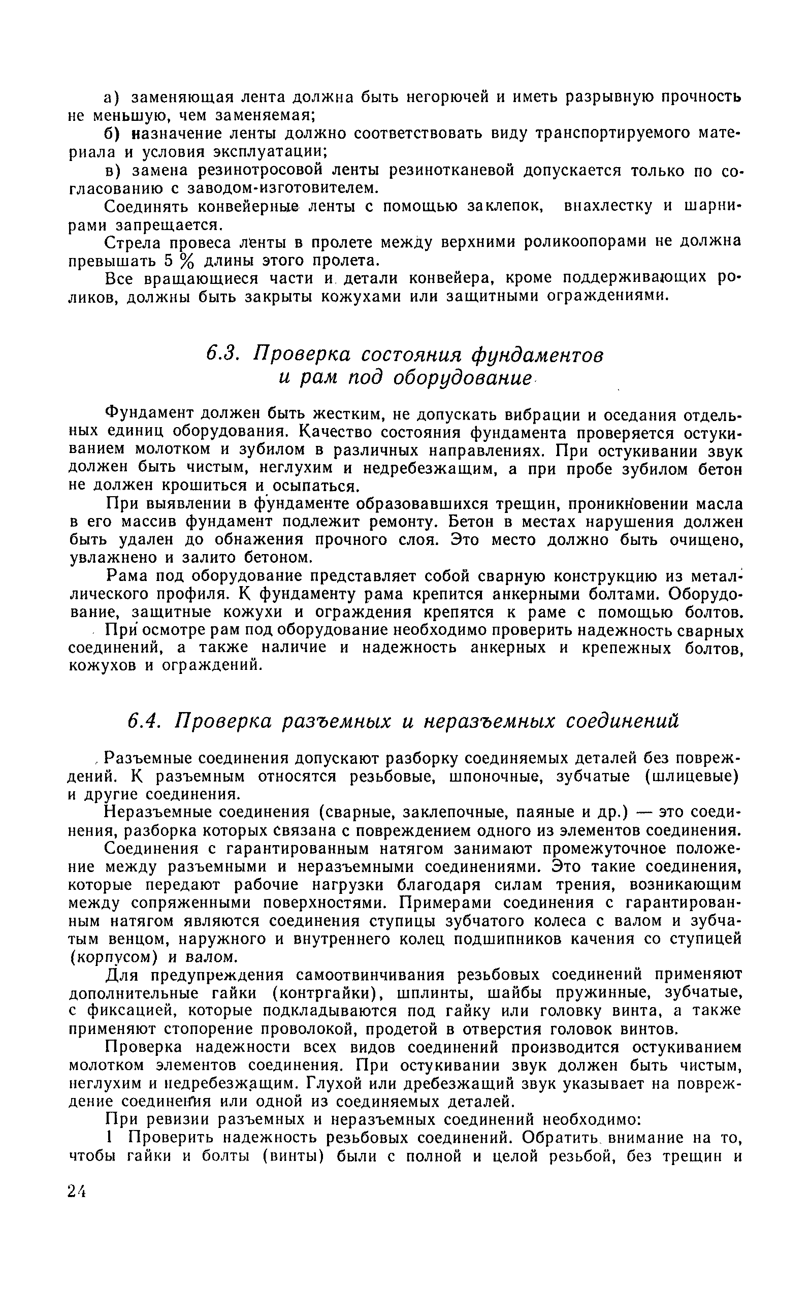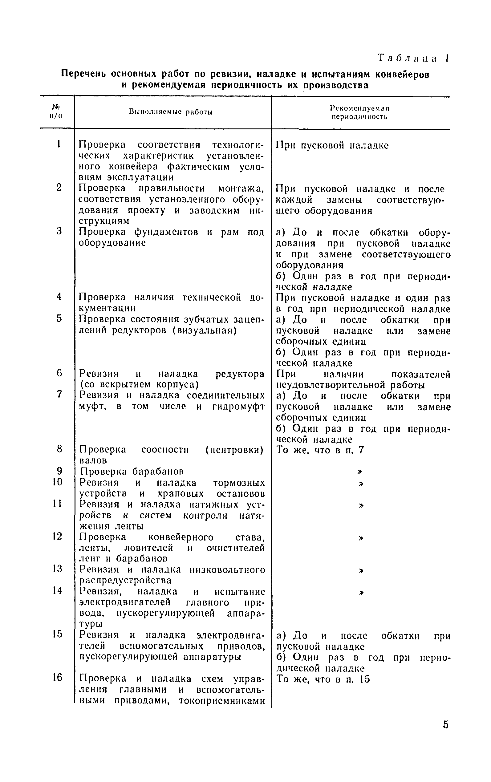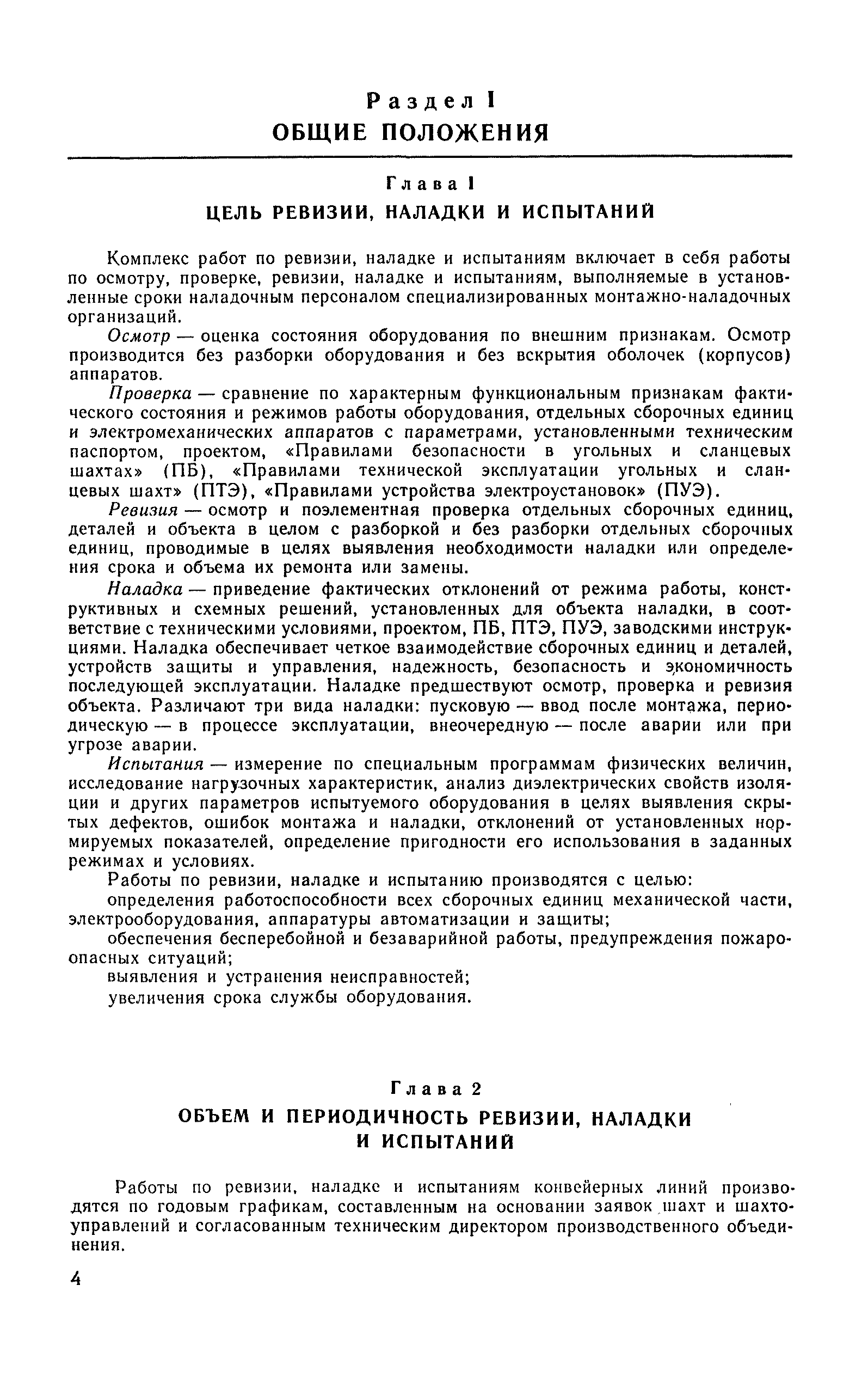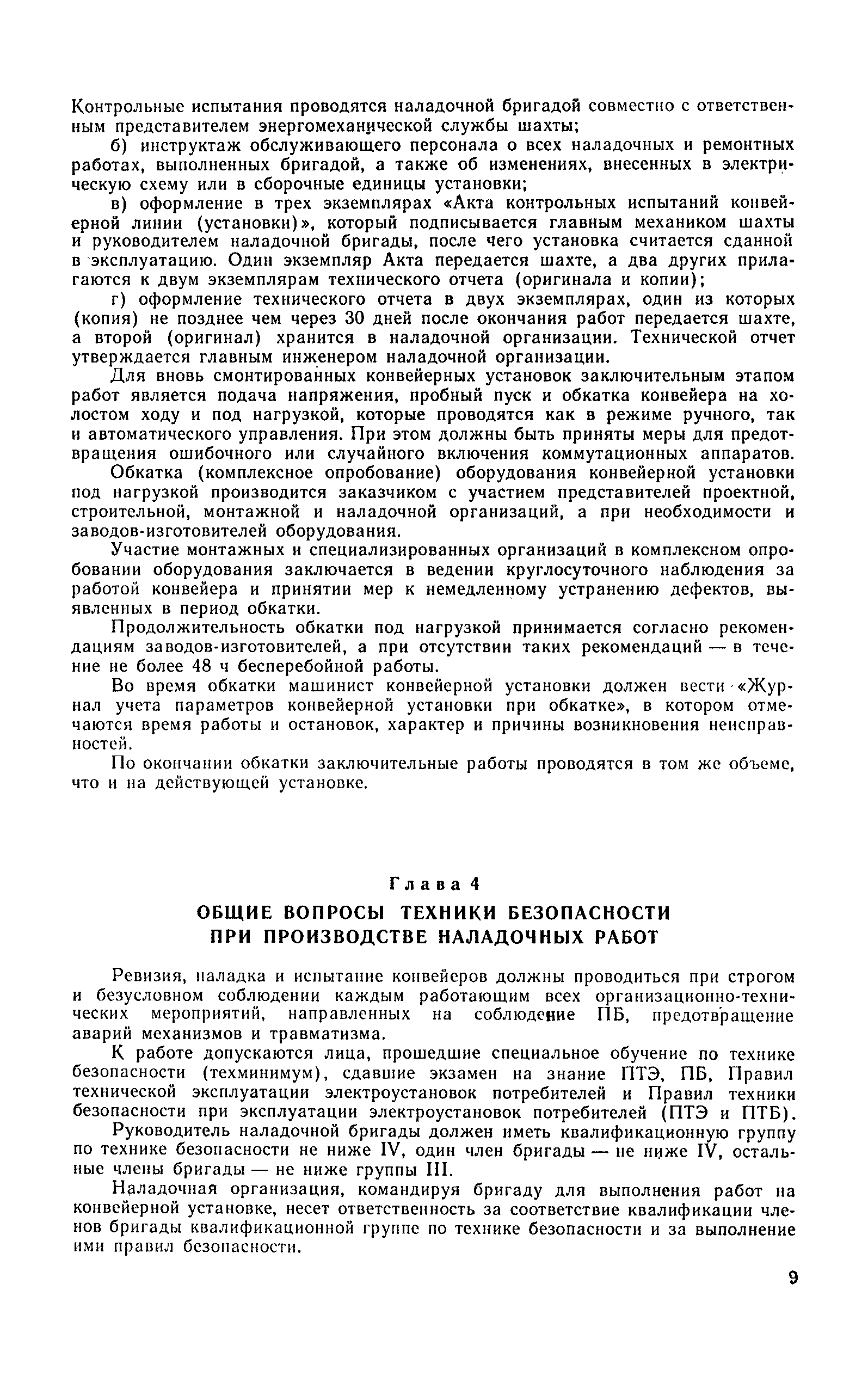 Руководство по ревизии, наладке и испытанию ленточных конвейеров и конвейерных линий угольных и сланцевых шахт| Статус: | справочные материалы, мп, тпр | | Название рус.: | Руководство по ревизии, наладке и испытанию ленточных конвейеров и конвейерных линий угольных и сланцевых шахт | | Дата добавления в базу: | 01.01.2019 | | Дата актуализации: | 01.01.2021 | | Область применения: | В документе приведены периодичность, объем и технология работ по ревизии, наладке и испытанию шахтных ленточных конвейеров и конвейерных линий, описаны принципы действия и даны краткие технические характеристики, конструктивные особенности механического и электрического оборудования. Изложены необходимые при наладке справочные данные. Освещены вопросы организации работ и техники безопасности. Предназначен для специализированных наладочных бригад, занимающихся вопросами ревизии, наладки и испытания шахтных ленточных конвейеров и конвейерных линий, а также для работников энергомеханических служб, выполняющих техническое обслуживание и ремонт конвейерных линий шахт | | Оглавление: | Раздел 1. Общие положения Глава 1. Цель ревизии, наладки и испытаний Глава 2. Объем и периодичность ревизии, наладки и испытаний Глава 3. Организация работ по ревизии, наладке и испытаниям 3.1. Состав и обязанности наладочных бригад 3.2. Подготовительные работы 3.3. Производство наладочных работ 3.4. Заключительные работы Глава 4. Общие вопросы техники безопасности при производстве наладочных работ Раздел 2. Механическая часть ленточных конвейеров Глава 5. Назначение, типы и технические характеристики Глава 6. Общие методы оценки состояния механического оборудования конвейеров 6.1. Проверка соответствия технологических характеристик конвейера фактическим условиям эксплуатации 6.2. Проверка правильности монтажа механического оборудования 6.3. Проверка состояния фундаментов и рам под оборудование 6.4. Проверка разъемных и неразъемных соединений 6.5. Ревизия и наладка подшипников качения 6.6. Проверка соосности и центровка валов 6.6.1. Проверка соосности и центровка двухопорных валов 6.6.2. Проверка соосности и центровка привода с промежуточным валом 6.7. Проверка состояния зубчатых зацеплений Глава 7. Устройство, ревизия и наладка сборочных единиц механического оборудования конвейеров 7.1. Приводные станции 7.2. Редукторы 7.3. Барабаны 7.4. Соединительные муфты 7.5. Гидромуфты 7.6. Тормозные устройства 7.7. Храповые остановы 7.8. Устройства густой смазки 7.9. Натяжные станции 7.10. Ловители ленты 7.11. Очистные устройства 7.12. Став 7.13. Загрузочные и перегрузочные устройства Раздел 3. Электрическое оборудование конвейеров и конвейерных линий Глава 8. Общие методы оценки состояния электрооборудования 8.1. Проверка правильности применения й монтажа электрооборудования 8.2. Проверка состояния корпусов, оболочек и кабельных вводов 8.3. Проверка знаков исполнения и взрывозащитных щелей 8.4. Измерение величины сопротивления изоляции 8.5. Проверка электрических цепей Глава 9. Общие методы ревизии и наладки контакторно-релейной аппаратуры 9.1. Ревизия и наладка магнитных систем КРА 9.2. Ревизия и наладка контактных систем КРА Глава 10. Электросиловое оборудование 10.1. Электродвигатели 10.2. Электрогидроприводы 10.3. Жидкостные реостаты 10.4. Тормозные электромагниты Глава 11. Станции управления СУВ1Л-100 и СУВ2Л-120 Глава 12. Указания п