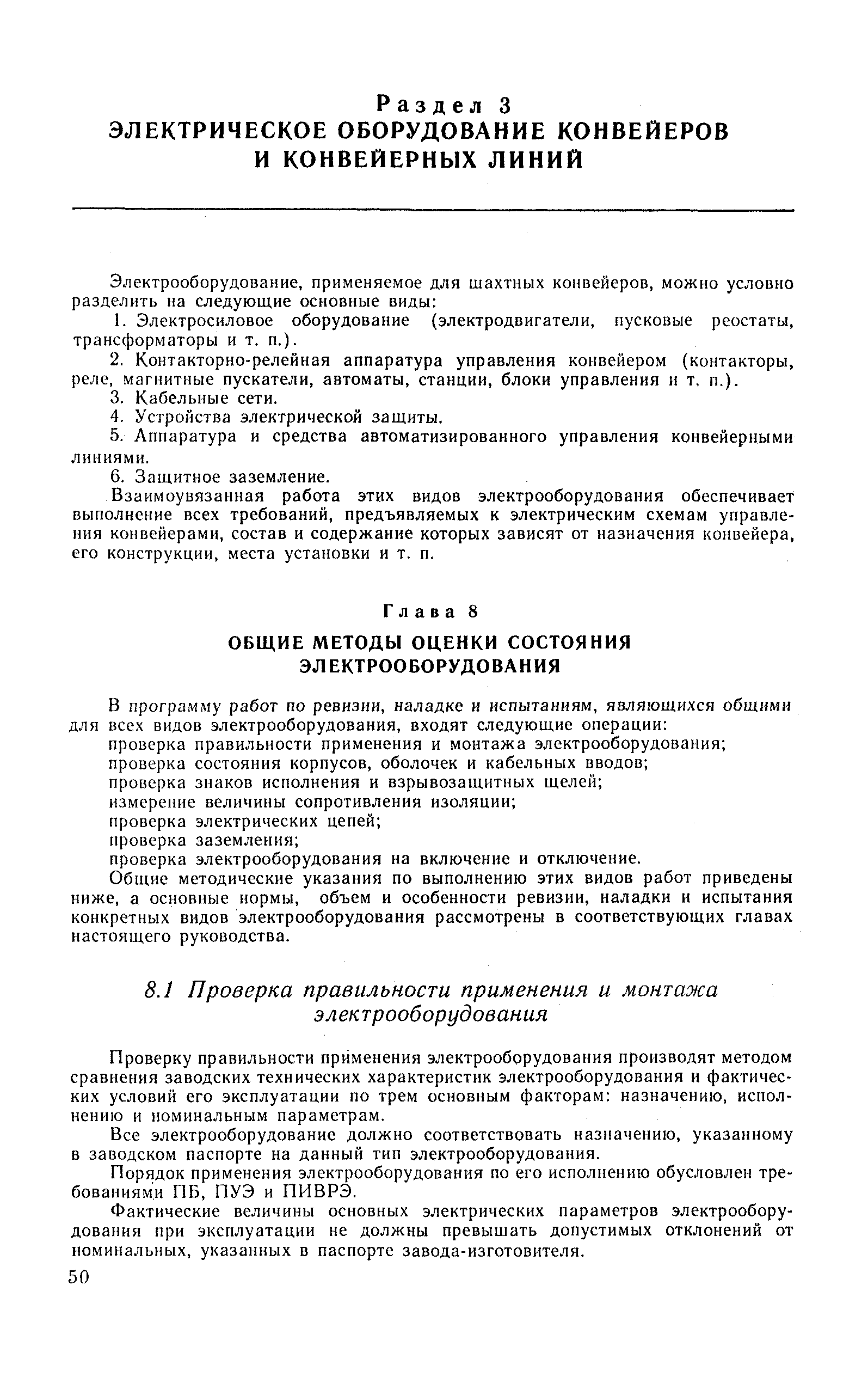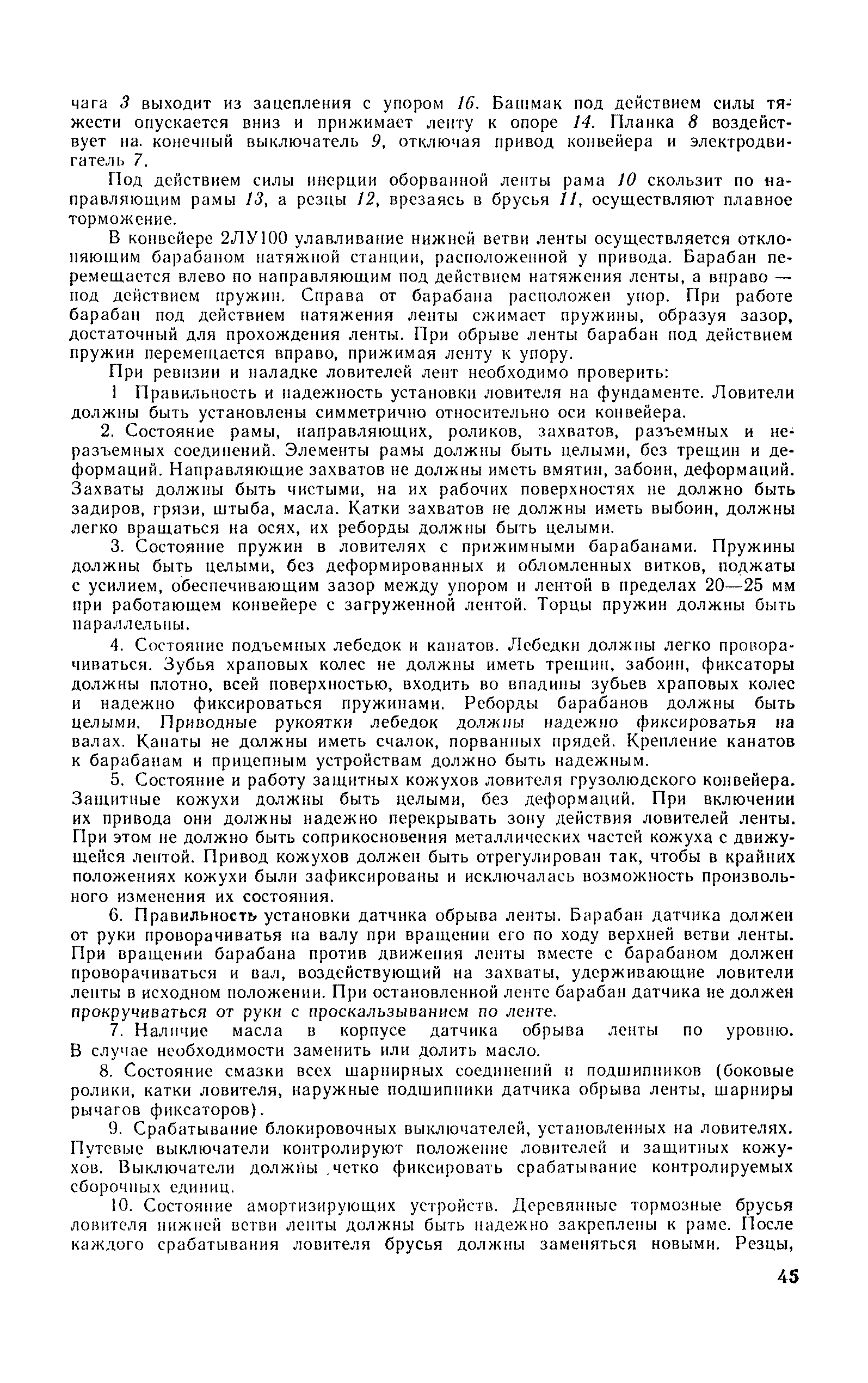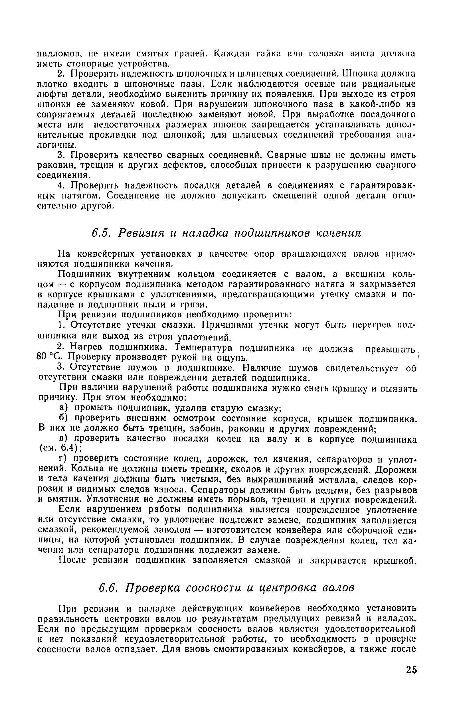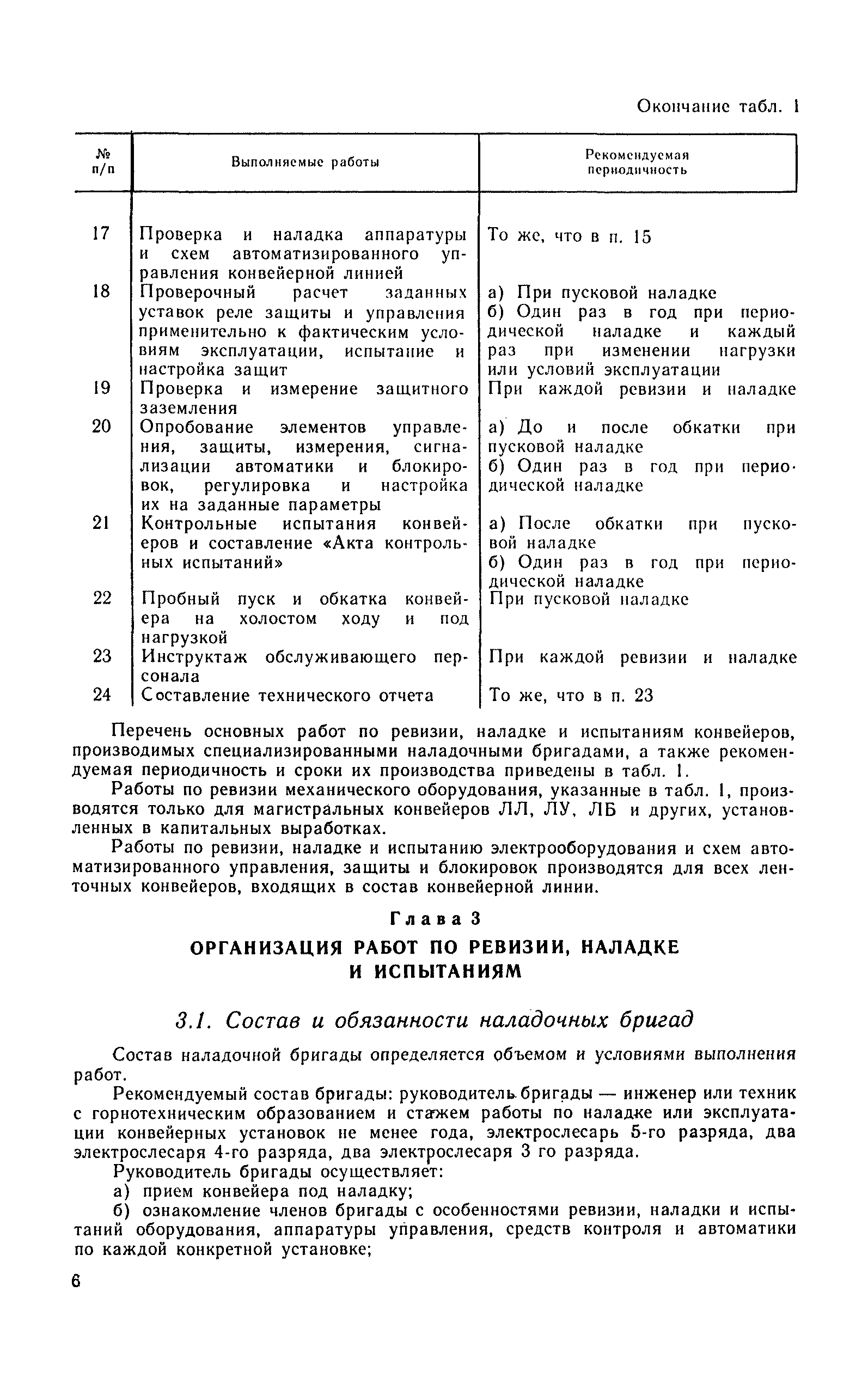 Руководство по ревизии, наладке и испытанию ленточных конвейеров и конвейерных линий угольных и сланцевых шахт| Статус: | справочные материалы, мп, тпр | | Название рус.: | Руководство по ревизии, наладке и испытанию ленточных конвейеров и конвейерных линий угольных и сланцевых шахт | | Дата добавления в базу: | 01.01.2019 | | Дата актуализации: | 01.01.2021 | | Область применения: | В документе приведены периодичность, объем и технология работ по ревизии, наладке и испытанию шахтных ленточных конвейеров и конвейерных линий, описаны принципы действия и даны краткие технические характеристики, конструктивные особенности механического и электрического оборудования. Изложены необходимые при наладке справочные данные. Освещены вопросы организации работ и техники безопасности. Предназначен для специализированных наладочных бригад, занимающихся вопросами ревизии, наладки и испытания шахтных ленточных конвейеров и конвейерных линий, а также для работников энергомеханических служб, выполняющих техническое обслуживание и ремонт конвейерных линий шахт | | Оглавление: | Раздел 1. Общие положения Глава 1. Цель ревизии, наладки и испытаний Глава 2. Объем и периодичность ревизии, наладки и испытаний Глава 3. Организация работ по ревизии, наладке и испытаниям 3.1. Состав и обязанности наладочных бригад 3.2. Подготовительные работы 3.3. Производство наладочных работ 3.4. Заключительные работы Глава 4. Общие вопросы техники безопасности при производстве наладочных работ Раздел 2. Механическая часть ленточных конвейеров Глава 5. Назначение, типы и технические характеристики Глава 6. Общие методы оценки состояния механического оборудования конвейеров 6.1. Проверка соответствия технологических характеристик конвейера фактическим условиям эксплуатации 6.2. Проверка правильности монтажа механического оборудования 6.3. Проверка состояния фундаментов и рам под оборудование 6.4. Проверка разъемных и неразъемных соединений 6.5. Ревизия и наладка подшипников качения 6.6. Проверка соосности и центровка валов 6.6.1. Проверка соосности и центровка двухопорных валов 6.6.2. Проверка соосности и центровка привода с промежуточным валом 6.7. Проверка состояния зубчатых зацеплений Глава 7. Устройство, ревизия и наладка сборочных единиц механического оборудования конвейеров 7.1. Приводные станции 7.2. Редукторы 7.3. Барабаны 7.4. Соединительные муфты 7.5. Гидромуфты 7.6. Тормозные устройства 7.7. Храповые остановы 7.8. Устройства густой смазки 7.9. Натяжные станции 7.10. Ловители ленты 7.11. Очистные устройства 7.12. Став 7.13. Загрузочные и перегрузочные устройства Раздел 3. Электрическое оборудование конвейеров и конвейерных линий Глава 8. Общие методы оценки состояния электрооборудования 8.1. Проверка правильности применения й монтажа электрооборудования 8.2. Проверка состояния корпусов, оболочек и кабельных вводов 8.3. Проверка знаков исполнения и взрывозащитных щелей 8.4. Измерение величины сопротивления изоляции 8.5. Проверка электрических цепей Глава 9. Общие методы ревизии и наладки контакторно-релейной аппаратуры 9.1. Ревизия и наладка магнитных систем КРА 9.2. Ревизия и наладка контактных систем КРА Глава 10. Электросиловое оборудование 10.1. Электродвигатели 10.2. Электрогидроприводы 10.3. Жидкостные реостаты 10.4. Тормозные электромагниты Глава 11. Станции управления СУВ1Л-100 и СУВ2Л-120 Глава 12. Указания п