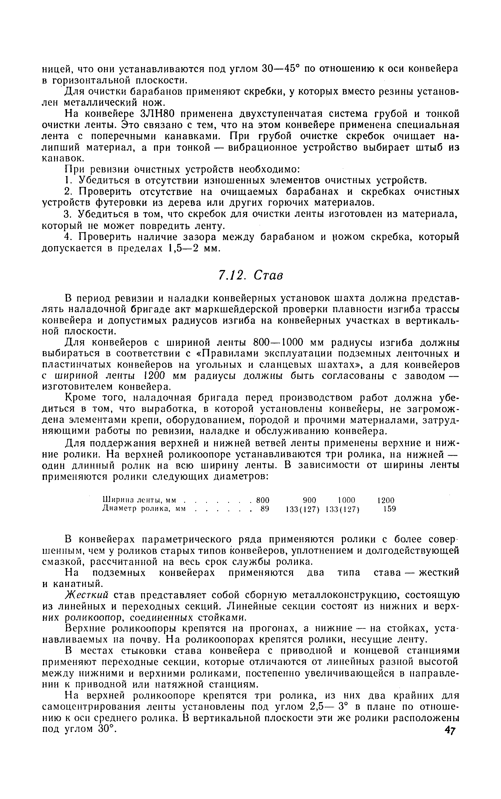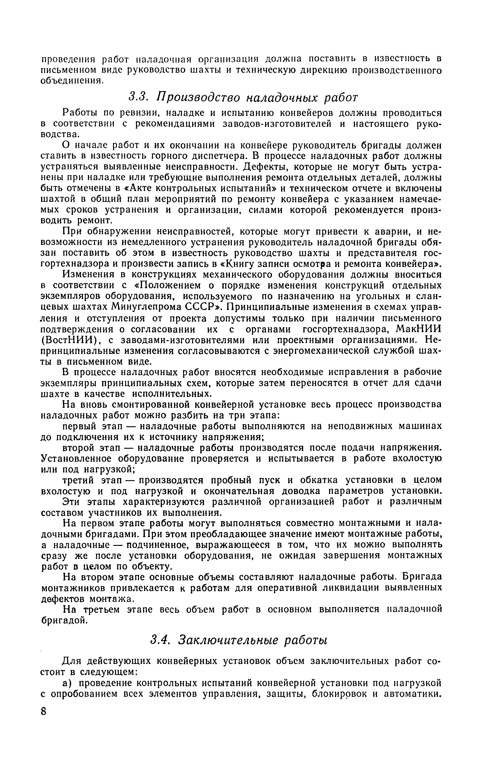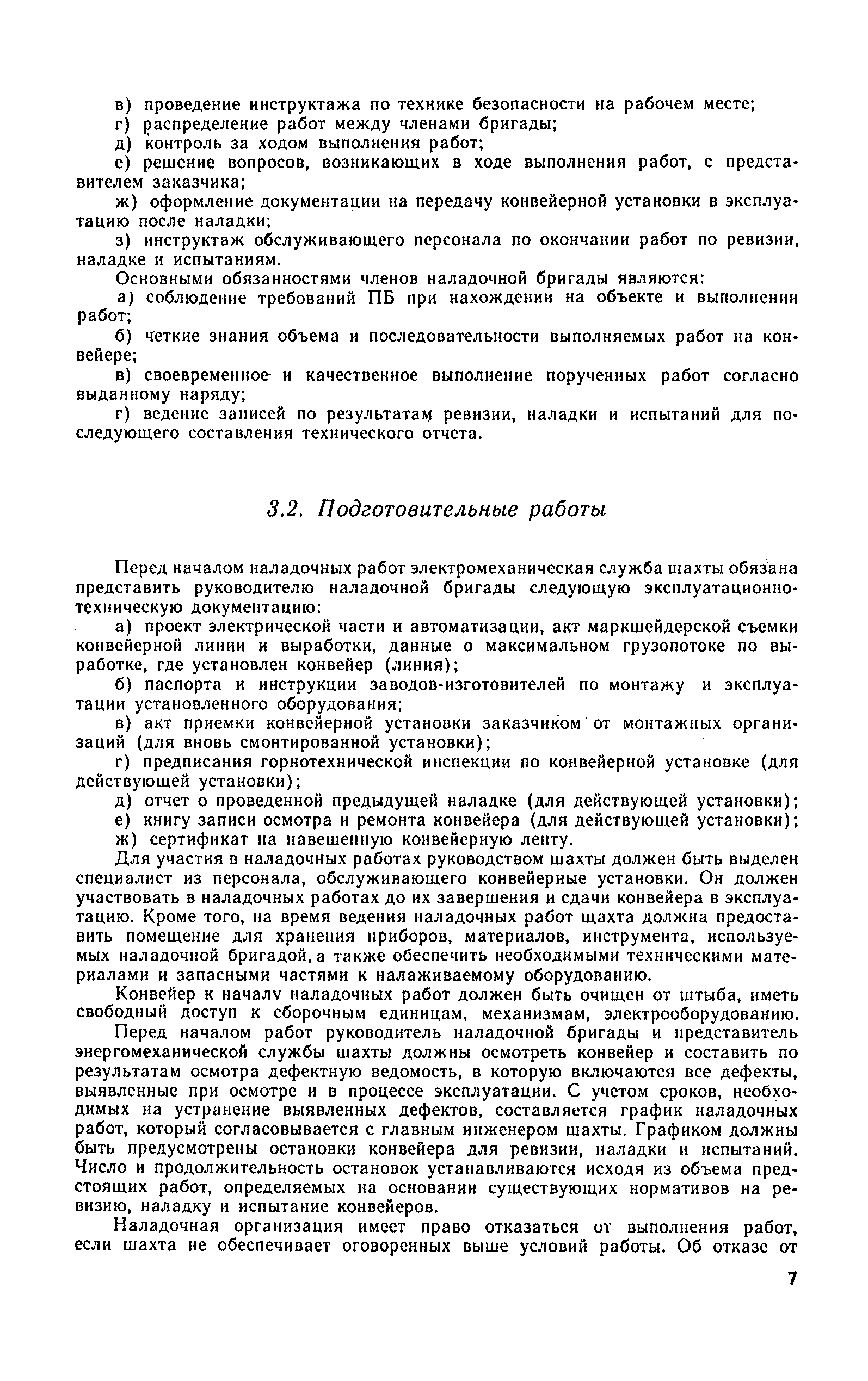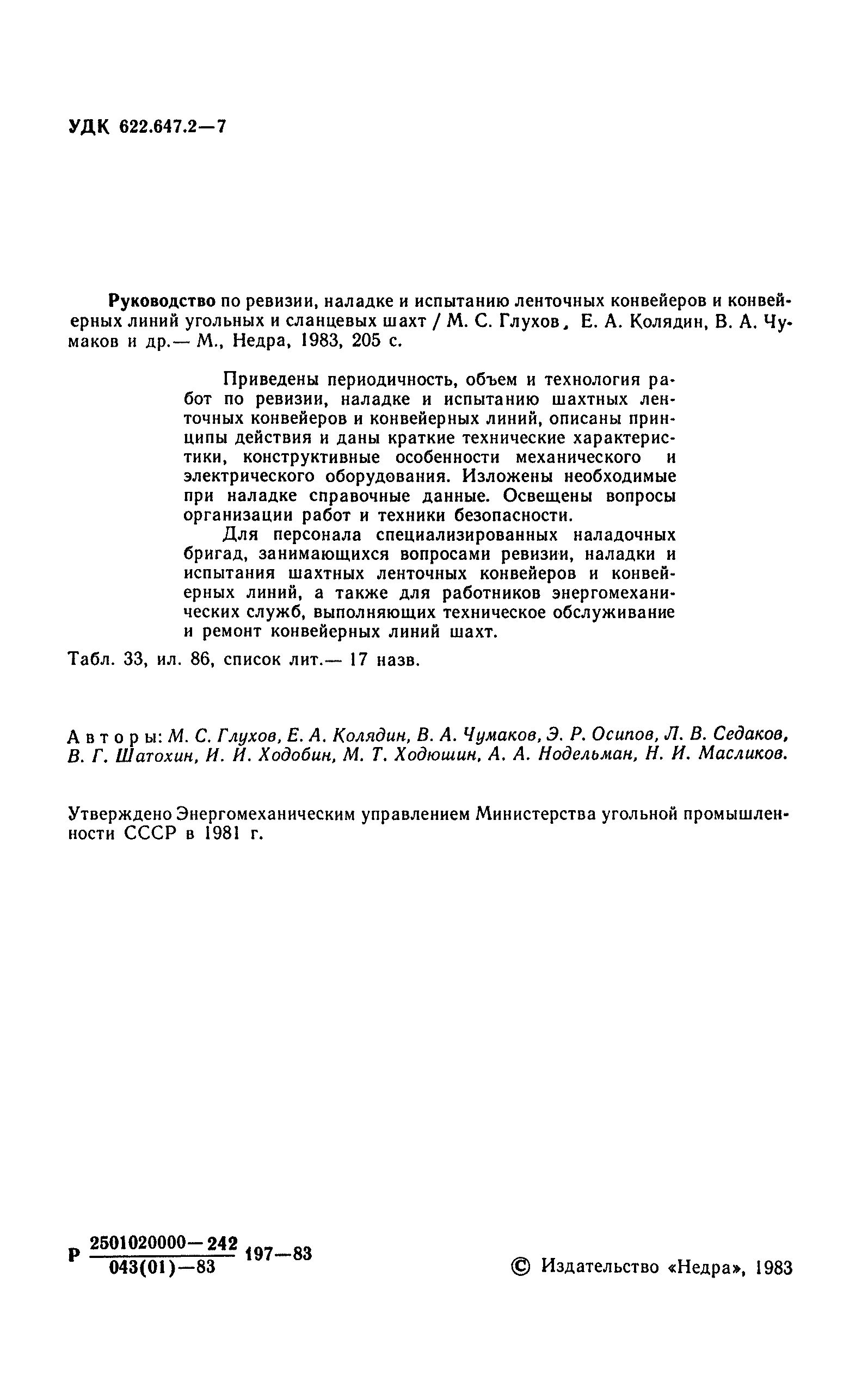 Руководство по ревизии, наладке и испытанию ленточных конвейеров и конвейерных линий угольных и сланцевых шахт| Статус: | справочные материалы, мп, тпр | | Название рус.: | Руководство по ревизии, наладке и испытанию ленточных конвейеров и конвейерных линий угольных и сланцевых шахт | | Дата добавления в базу: | 01.01.2019 | | Дата актуализации: | 01.01.2021 | | Область применения: | В документе приведены периодичность, объем и технология работ по ревизии, наладке и испытанию шахтных ленточных конвейеров и конвейерных линий, описаны принципы действия и даны краткие технические характеристики, конструктивные особенности механического и электрического оборудования. Изложены необходимые при наладке справочные данные. Освещены вопросы организации работ и техники безопасности. Предназначен для специализированных наладочных бригад, занимающихся вопросами ревизии, наладки и испытания шахтных ленточных конвейеров и конвейерных линий, а также для работников энергомеханических служб, выполняющих техническое обслуживание и ремонт конвейерных линий шахт | | Оглавление: | Раздел 1. Общие положения Глава 1. Цель ревизии, наладки и испытаний Глава 2. Объем и периодичность ревизии, наладки и испытаний Глава 3. Организация работ по ревизии, наладке и испытаниям 3.1. Состав и обязанности наладочных бригад 3.2. Подготовительные работы 3.3. Производство наладочных работ 3.4. Заключительные работы Глава 4. Общие вопросы техники безопасности при производстве наладочных работ Раздел 2. Механическая часть ленточных конвейеров Глава 5. Назначение, типы и технические характеристики Глава 6. Общие методы оценки состояния механического оборудования конвейеров 6.1. Проверка соответствия технологических характеристик конвейера фактическим условиям эксплуатации 6.2. Проверка правильности монтажа механического оборудования 6.3. Проверка состояния фундаментов и рам под оборудование 6.4. Проверка разъемных и неразъемных соединений 6.5. Ревизия и наладка подшипников качения 6.6. Проверка соосности и центровка валов 6.6.1. Проверка соосности и центровка двухопорных валов 6.6.2. Проверка соосности и центровка привода с промежуточным валом 6.7. Проверка состояния зубчатых зацеплений Глава 7. Устройство, ревизия и наладка сборочных единиц механического оборудования конвейеров 7.1. Приводные станции 7.2. Редукторы 7.3. Барабаны 7.4. Соединительные муфты 7.5. Гидромуфты 7.6. Тормозные устройства 7.7. Храповые остановы 7.8. Устройства густой смазки 7.9. Натяжные станции 7.10. Ловители ленты 7.11. Очистные устройства 7.12. Став 7.13. Загрузочные и перегрузочные устройства Раздел 3. Электрическое оборудование конвейеров и конвейерных линий Глава 8. Общие методы оценки состояния электрооборудования 8.1. Проверка правильности применения й монтажа электрооборудования 8.2. Проверка состояния корпусов, оболочек и кабельных вводов 8.3. Проверка знаков исполнения и взрывозащитных щелей 8.4. Измерение величины сопротивления изоляции 8.5. Проверка электрических цепей Глава 9. Общие методы ревизии и наладки контакторно-релейной аппаратуры 9.1. Ревизия и наладка магнитных систем КРА 9.2. Ревизия и наладка контактных систем КРА Глава 10. Электросиловое оборудование 10.1. Электродвигатели 10.2. Электрогидроприводы 10.3. Жидкостные реостаты 10.4. Тормозные электромагниты Глава 11. Станции управления СУВ1Л-100 и СУВ2Л-120 Глава 12. Указания п