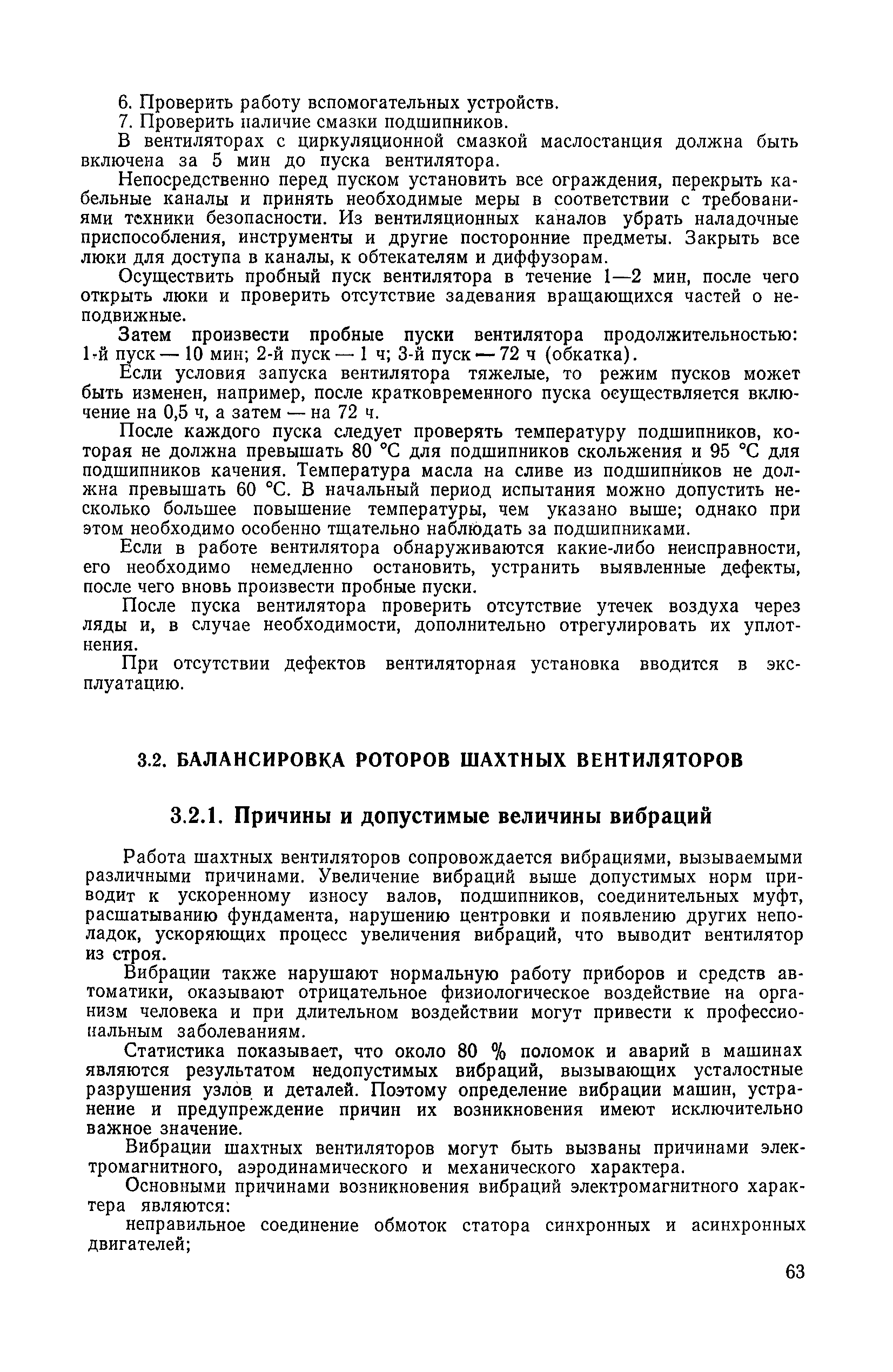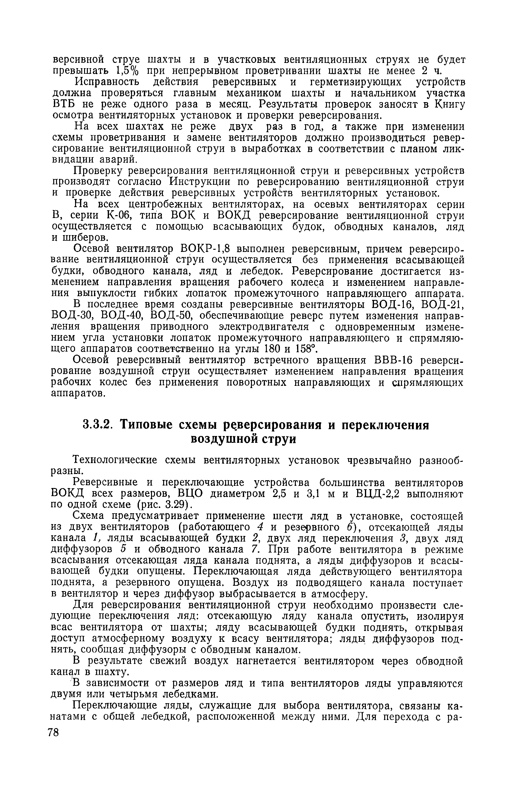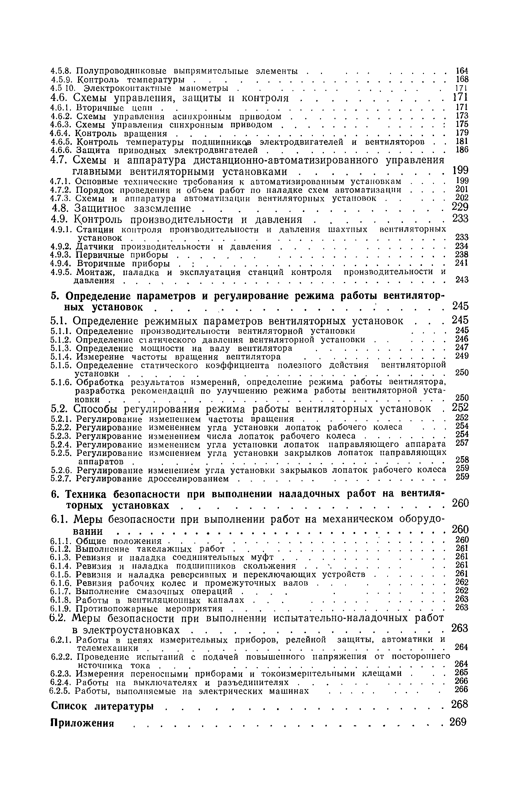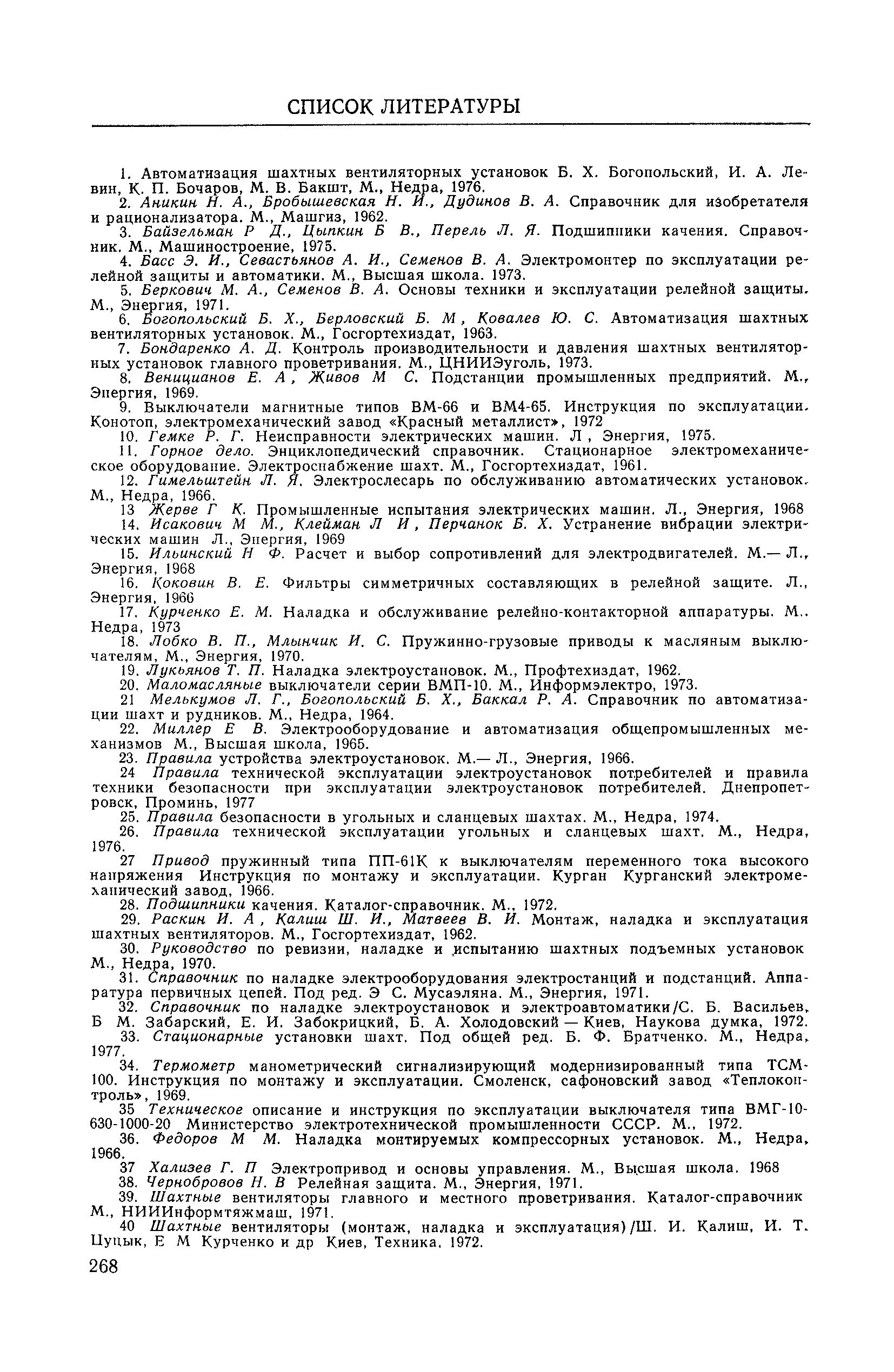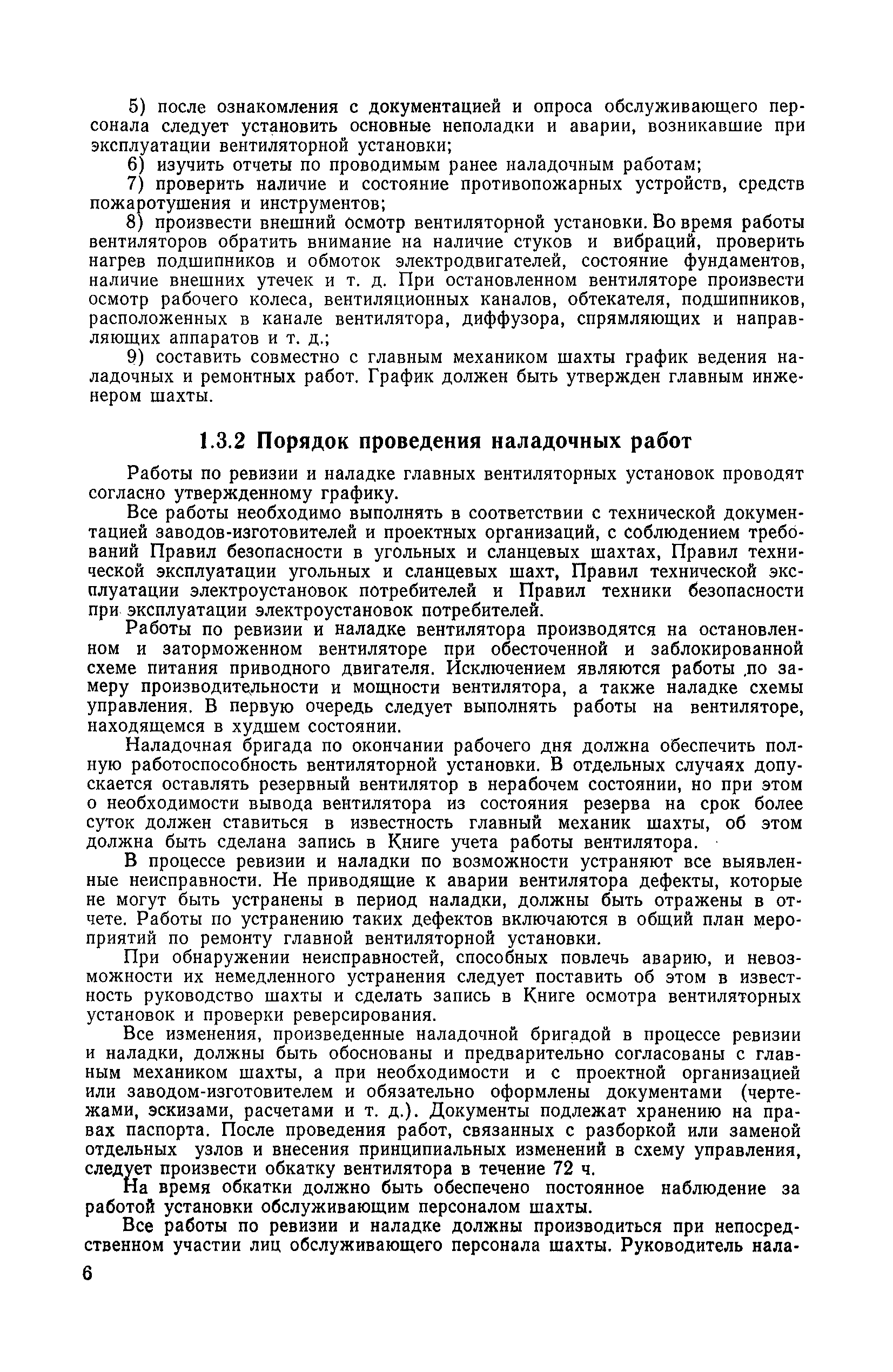 | Оглавление: | 1. Общие положения 1.1. Цель ревизии и наладки главных вентиляторных установок 1.2. Объем работ по ревизии и наладке главных вентиляторных установок 1.3. Организация и проведение работ по ревизии и наладке главных вентиляторных установок 1.3.1. Подготовительные работы 1.3.2, Порядок проведения наладочных работ 1.3.3. Определение режимных параметров главной вентиляторной установки 1.3.4. Оформление отчетно-технической документации 2. Конструкции и параметры вентиляторных установок 2.1. Элементы главной вентиляторной установки шахты 2.2. Осевые вентиляторы 2.3. Центробежные вентиляторы 3. Ревизия и наладка механической части главных вентиляторных установок 3.1. Ревизия и наладка отдельных узлов механической части вентиляторов и пробный пуск 3.1.1. Проверка состояния фундамента, рамы, кожуха, диффузора, коллектора, обтекателя, подшипниковых узлов 3.1.2. Рабочие колеса осевых вентиляторов 3.1.3. Рабочие колеса центробежных вентиляторов 3.1.4. Направляющие и спрямляющие аппараты 3.1.5. Подшипники качения. валы 3.1.6. Подшипники скольжения. Валы 3.1.7. Системы циркуляционной смазки подшипников 3.1.8. Соединительные муфты 3.1.9. Центровка опорных валов 3.1.10. Центровка подвесных валов 3.1.11. Тормозные устройства вентиляторов 3.1.12. Пробный пуск вентиляторов 3.2. Балансировка роторов шахтных вентиляторов 3.2.1. Причины и допустимые величины вибраций 3.2.2. Виброизмерительная аппаратура 3.2.3.. Статическая балансировка 3.2.4. динамическая балансировка 3.3. Ревизия и наладка реверсивных и переключающих устройств 3.3.1. Способы реверсирования воздушной струи и перестановки переключающих устройств 3.3.2. Типовые схемы реверсирования и переключения воздушной струи 3.3.3. Ревизия, наладка и опробование реверсивных и переключающих устройств 4. Ревизия, наладка и испытание электрической части главных вентиляторных установок 4.1. Распределительные устройства напряжением выше 1000 В 4.1.1. Разъединители 4.1.2. Масляные выключатели 4.1.3. Приводы к масляным выключателям 4.1.4. Трансформаторы тока (ТТ) 4.1.5. Трансформаторы напряжения (ТН) 4.2. Распределительные устройства напряжением до 1000 В 4.3. Кабельные линии 4.4. Электрические машины 4.4.1. Внешний осмотр машины и проверка ее состояния 4.4.2. Проверка механической части электрических машин 4.4.3. Измерение сопротивления изоляции обмоток 4.4.4. Измерение сопротивления обмоток постоянному току 4.4.5. Статические преобразователи 4.4.6. Ревизия и испытание электрических машин после монтажа 4.5. Аппаратура управления, защиты и контроля 4.5.1. Высоковольтные реверсоры 4.5.2. Контакторы переменного тока КТ (КТВ) 4 5.3. Автоматические выключатели серий А3100 и АП-50 4.5.4. Реле постоянного и переменного тока 4.5.5. Тормозные электромагниты 4.5.6. Роторные сопротивления и реостаты 4.5.7. Конечные выключатели 4.5.8. Полупроводниковые выпрямительные элементы 4.5.9. Контроль температуры 4.5.10. Электроконтактные манометры 4.6. Схемы управления, защиты н контроля 4.6.1. Вторичные цени 4.6.2. Схемы управления асинхронным приводом 4.6.3. Схемы управления синхронным приводом 4.6.4. Контроль вращения 4.6.5. Контроль температуры подшипников электродвигателей и вентиляторов 4.6.6. Защита приводных электродвигателей 4.7. Схемы и аппаратура дистанционно-автоматизированного управления главными вентиляторными установками 4.7.1. Основные технические требования к автоматизированным установкам 4.7.2. Порядок проведе