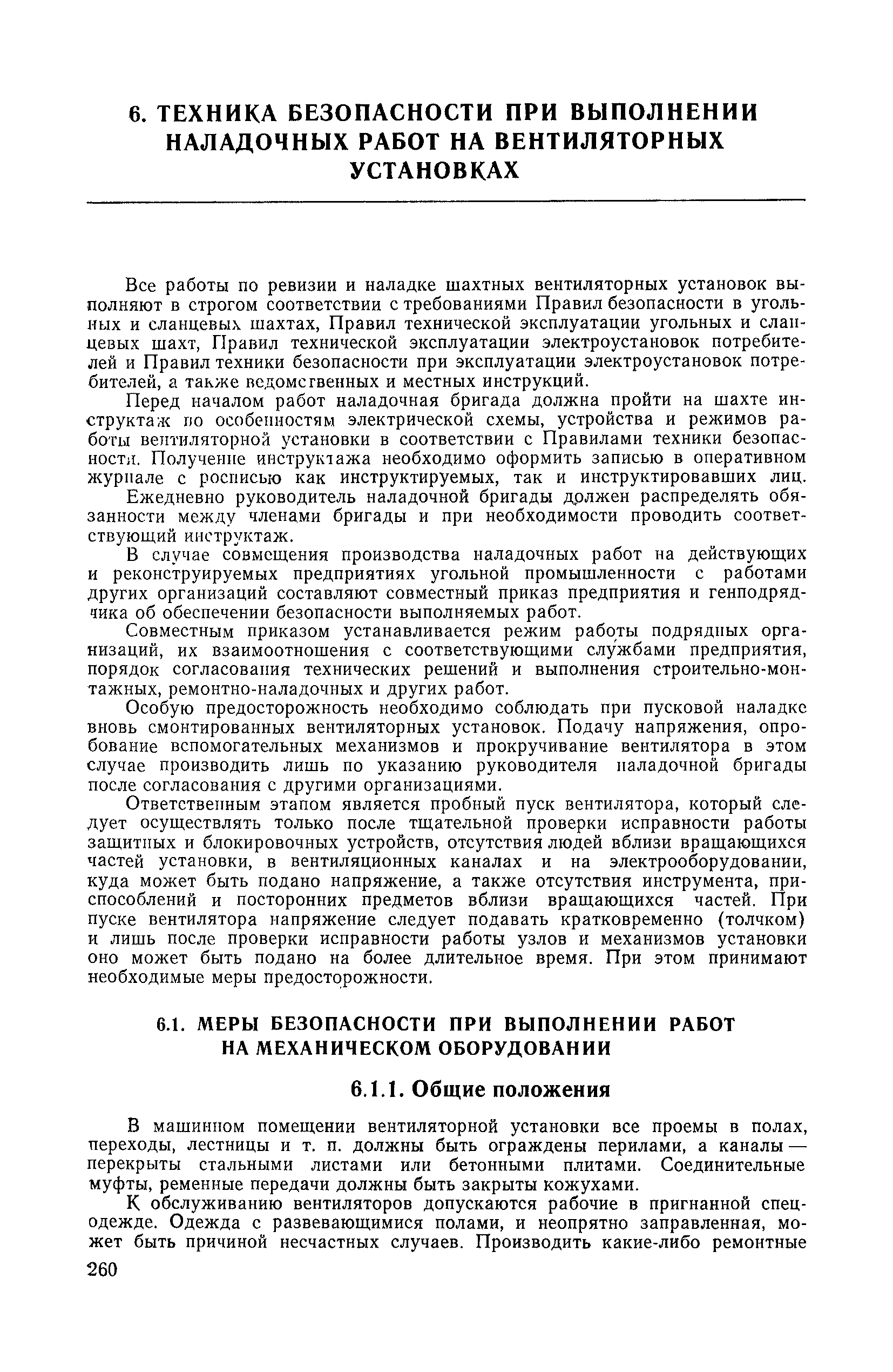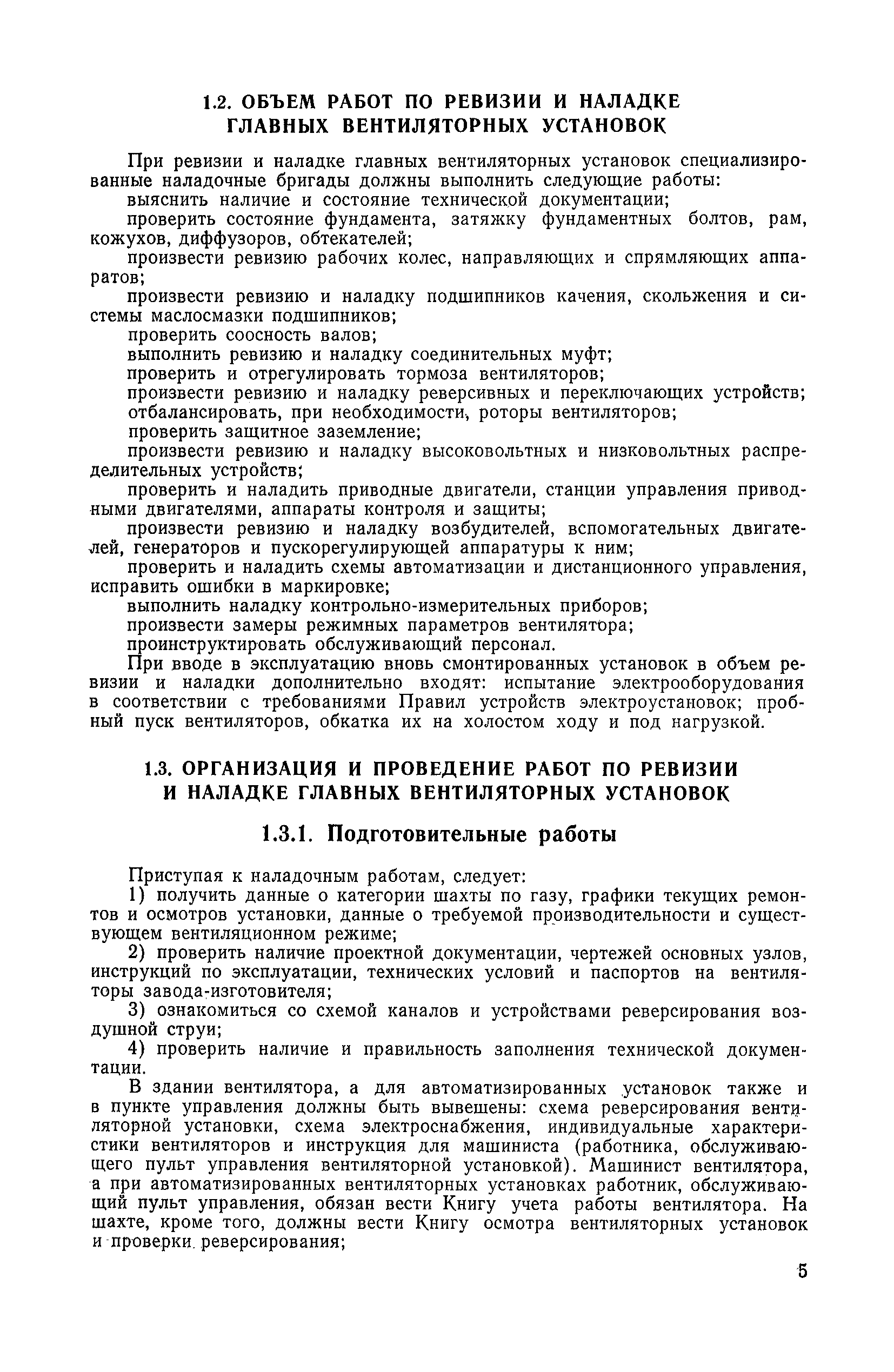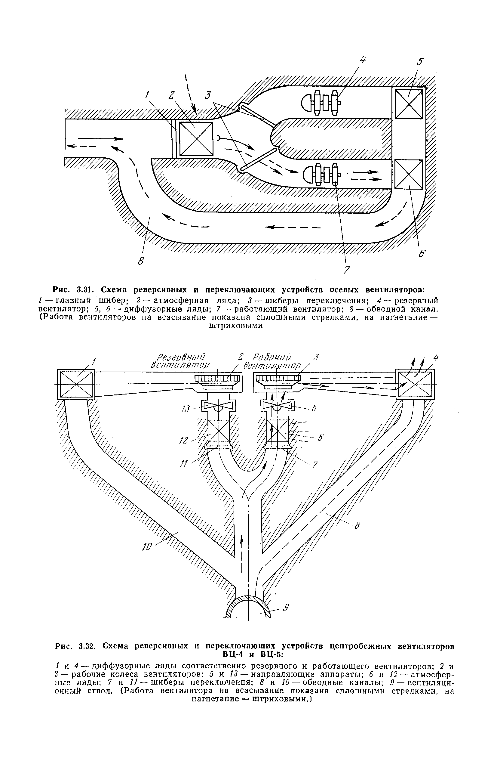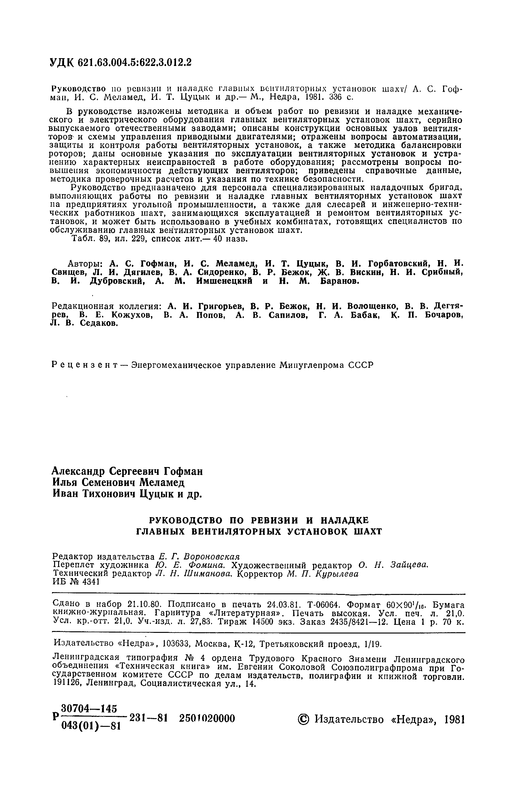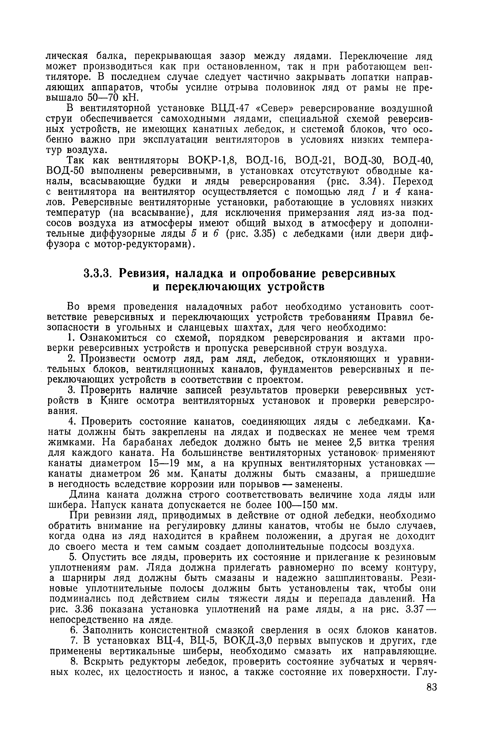 | Оглавление: | 1. Общие положения 1.1. Цель ревизии и наладки главных вентиляторных установок 1.2. Объем работ по ревизии и наладке главных вентиляторных установок 1.3. Организация и проведение работ по ревизии и наладке главных вентиляторных установок 1.3.1. Подготовительные работы 1.3.2, Порядок проведения наладочных работ 1.3.3. Определение режимных параметров главной вентиляторной установки 1.3.4. Оформление отчетно-технической документации 2. Конструкции и параметры вентиляторных установок 2.1. Элементы главной вентиляторной установки шахты 2.2. Осевые вентиляторы 2.3. Центробежные вентиляторы 3. Ревизия и наладка механической части главных вентиляторных установок 3.1. Ревизия и наладка отдельных узлов механической части вентиляторов и пробный пуск 3.1.1. Проверка состояния фундамента, рамы, кожуха, диффузора, коллектора, обтекателя, подшипниковых узлов 3.1.2. Рабочие колеса осевых вентиляторов 3.1.3. Рабочие колеса центробежных вентиляторов 3.1.4. Направляющие и спрямляющие аппараты 3.1.5. Подшипники качения. валы 3.1.6. Подшипники скольжения. Валы 3.1.7. Системы циркуляционной смазки подшипников 3.1.8. Соединительные муфты 3.1.9. Центровка опорных валов 3.1.10. Центровка подвесных валов 3.1.11. Тормозные устройства вентиляторов 3.1.12. Пробный пуск вентиляторов 3.2. Балансировка роторов шахтных вентиляторов 3.2.1. Причины и допустимые величины вибраций 3.2.2. Виброизмерительная аппаратура 3.2.3.. Статическая балансировка 3.2.4. динамическая балансировка 3.3. Ревизия и наладка реверсивных и переключающих устройств 3.3.1. Способы реверсирования воздушной струи и перестановки переключающих устройств 3.3.2. Типовые схемы реверсирования и переключения воздушной струи 3.3.3. Ревизия, наладка и опробование реверсивных и переключающих устройств 4. Ревизия, наладка и испытание электрической части главных вентиляторных установок 4.1. Распределительные устройства напряжением выше 1000 В 4.1.1. Разъединители 4.1.2. Масляные выключатели 4.1.3. Приводы к масляным выключателям 4.1.4. Трансформаторы тока (ТТ) 4.1.5. Трансформаторы напряжения (ТН) 4.2. Распределительные устройства напряжением до 1000 В 4.3. Кабельные линии 4.4. Электрические машины 4.4.1. Внешний осмотр машины и проверка ее состояния 4.4.2. Проверка механической части электрических машин 4.4.3. Измерение сопротивления изоляции обмоток 4.4.4. Измерение сопротивления обмоток постоянному току 4.4.5. Статические преобразователи 4.4.6. Ревизия и испытание электрических машин после монтажа 4.5. Аппаратура управления, защиты и контроля 4.5.1. Высоковольтные реверсоры 4.5.2. Контакторы переменного тока КТ (КТВ) 4 5.3. Автоматические выключатели серий А3100 и АП-50 4.5.4. Реле постоянного и переменного тока 4.5.5. Тормозные электромагниты 4.5.6. Роторные сопротивления и реостаты 4.5.7. Конечные выключатели 4.5.8. Полупроводниковые выпрямительные элементы 4.5.9. Контроль температуры 4.5.10. Электроконтактные манометры 4.6. Схемы управления, защиты н контроля 4.6.1. Вторичные цени 4.6.2. Схемы управления асинхронным приводом 4.6.3. Схемы управления синхронным приводом 4.6.4. Контроль вращения 4.6.5. Контроль температуры подшипников электродвигателей и вентиляторов 4.6.6. Защита приводных электродвигателей 4.7. Схемы и аппаратура дистанционно-автоматизированного управления главными вентиляторными установками 4.7.1. Основные технические требования к автоматизированным установкам 4.7.2. Порядок проведе
