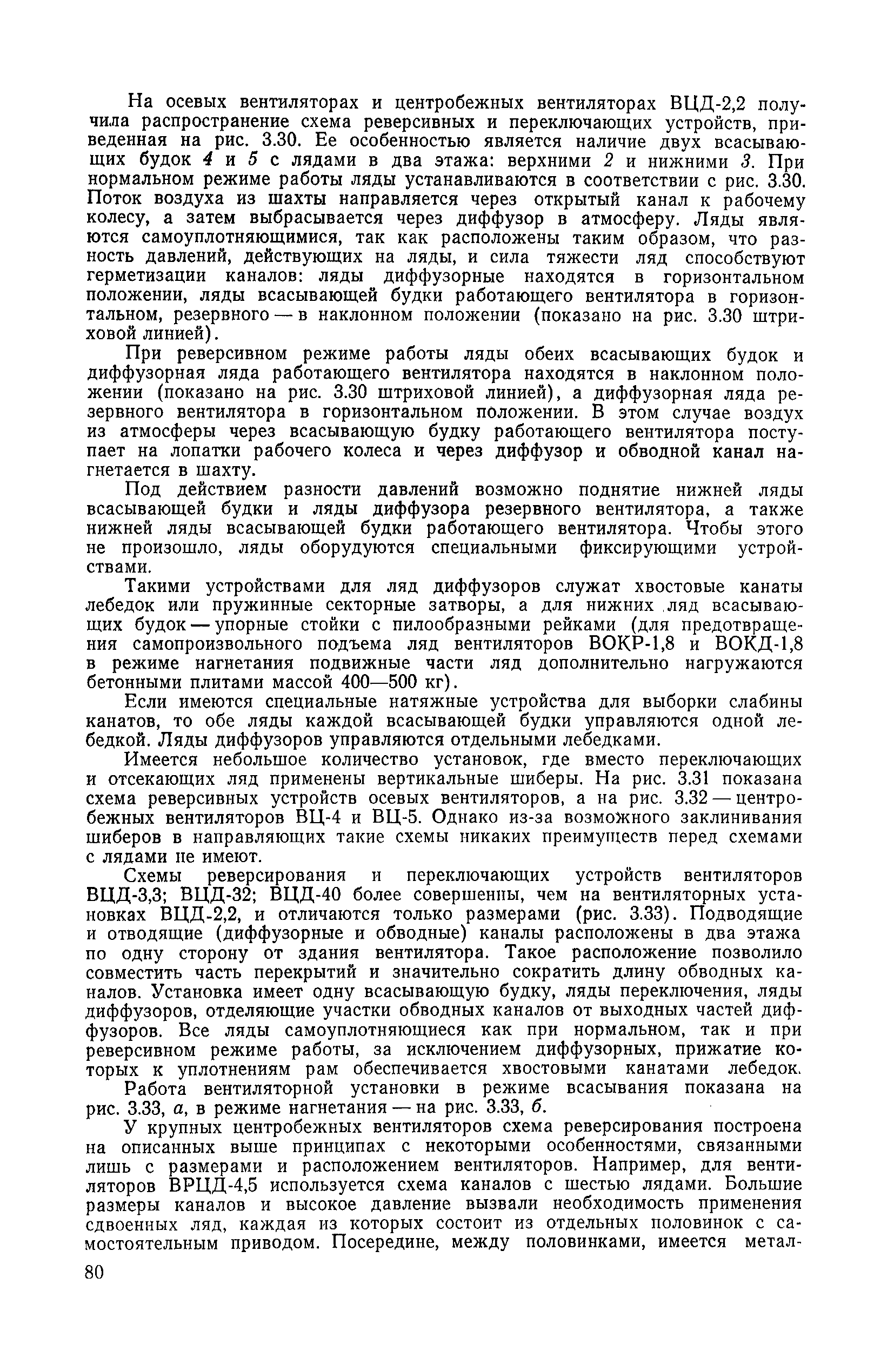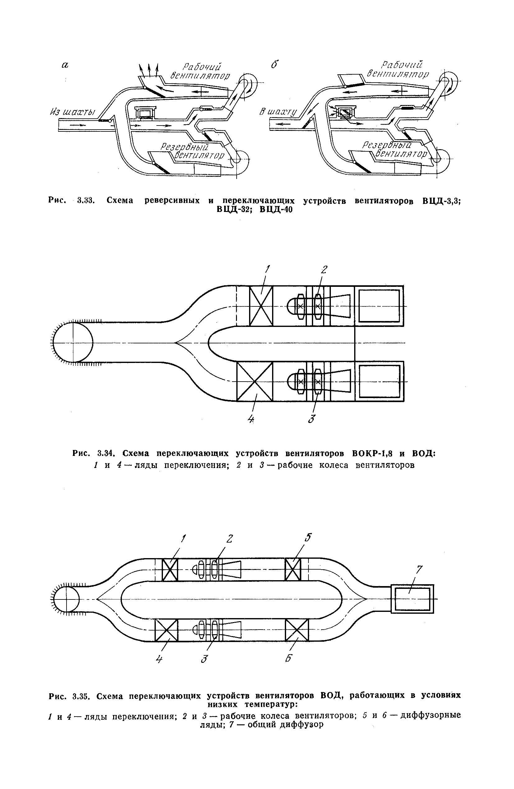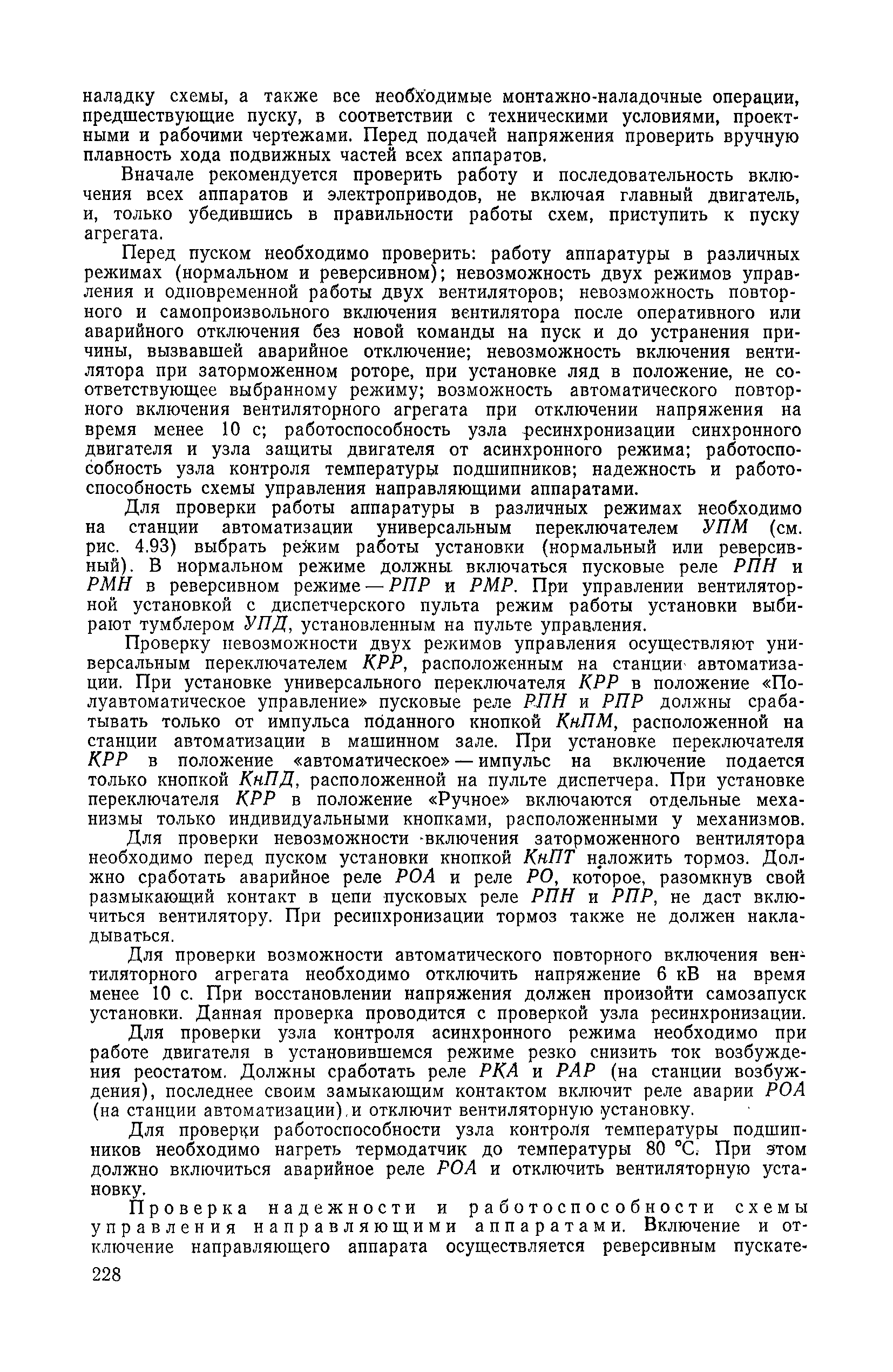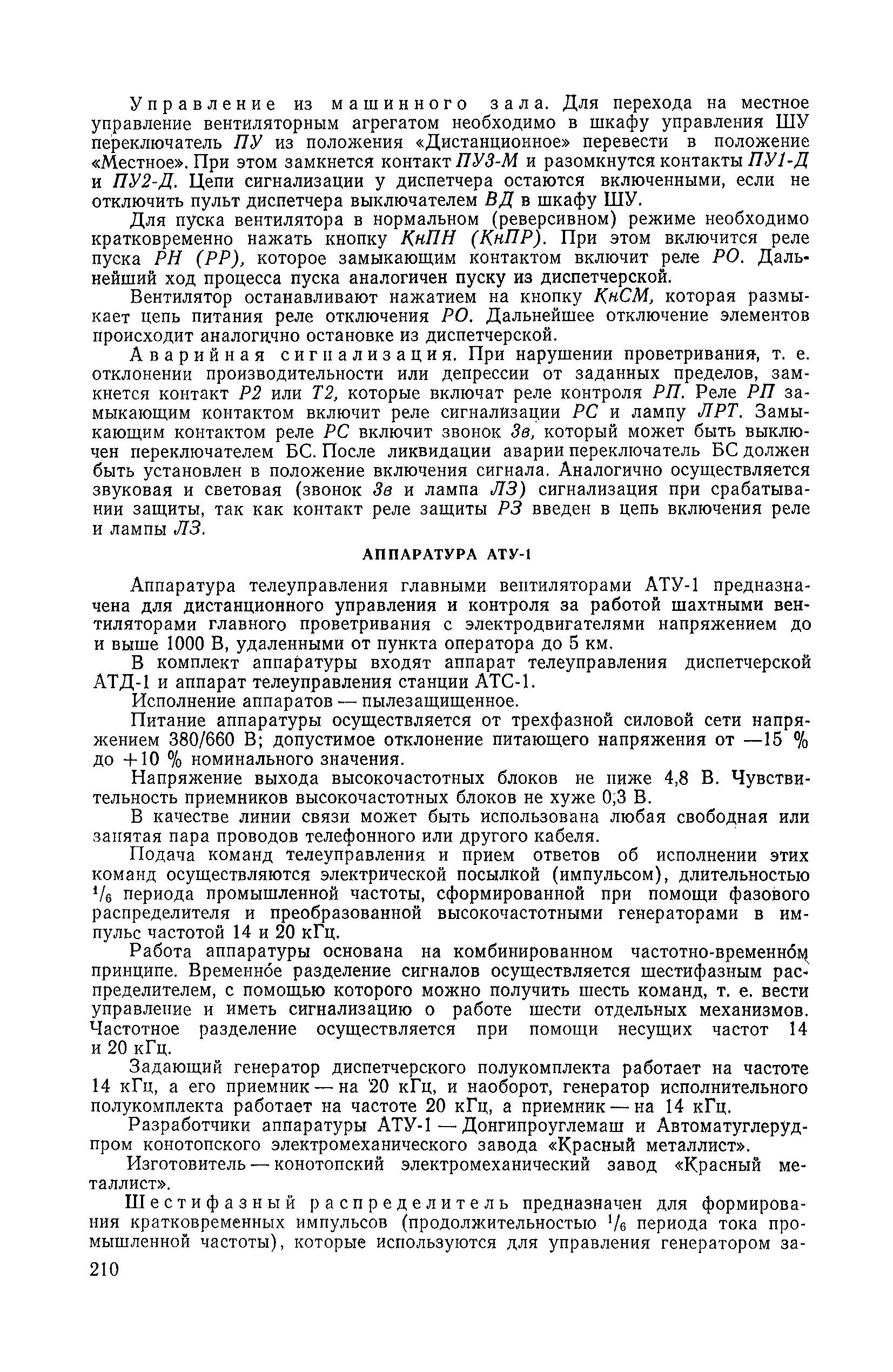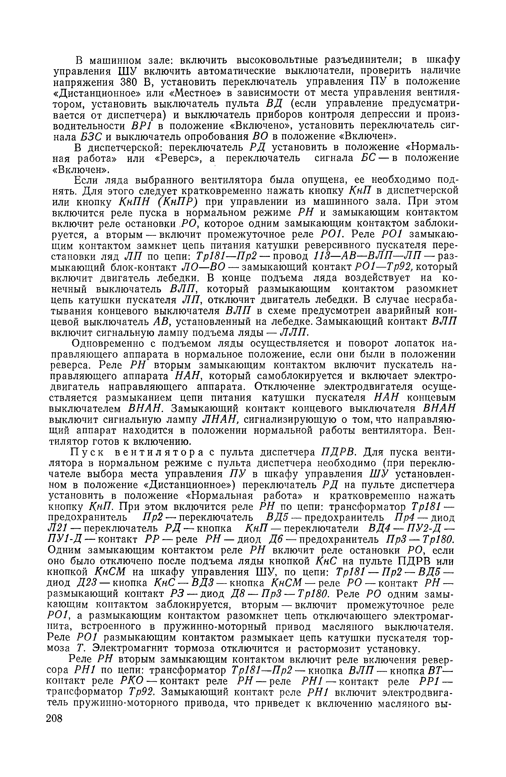 | Оглавление: | 1. Общие положения 1.1. Цель ревизии и наладки главных вентиляторных установок 1.2. Объем работ по ревизии и наладке главных вентиляторных установок 1.3. Организация и проведение работ по ревизии и наладке главных вентиляторных установок 1.3.1. Подготовительные работы 1.3.2, Порядок проведения наладочных работ 1.3.3. Определение режимных параметров главной вентиляторной установки 1.3.4. Оформление отчетно-технической документации 2. Конструкции и параметры вентиляторных установок 2.1. Элементы главной вентиляторной установки шахты 2.2. Осевые вентиляторы 2.3. Центробежные вентиляторы 3. Ревизия и наладка механической части главных вентиляторных установок 3.1. Ревизия и наладка отдельных узлов механической части вентиляторов и пробный пуск 3.1.1. Проверка состояния фундамента, рамы, кожуха, диффузора, коллектора, обтекателя, подшипниковых узлов 3.1.2. Рабочие колеса осевых вентиляторов 3.1.3. Рабочие колеса центробежных вентиляторов 3.1.4. Направляющие и спрямляющие аппараты 3.1.5. Подшипники качения. валы 3.1.6. Подшипники скольжения. Валы 3.1.7. Системы циркуляционной смазки подшипников 3.1.8. Соединительные муфты 3.1.9. Центровка опорных валов 3.1.10. Центровка подвесных валов 3.1.11. Тормозные устройства вентиляторов 3.1.12. Пробный пуск вентиляторов 3.2. Балансировка роторов шахтных вентиляторов 3.2.1. Причины и допустимые величины вибраций 3.2.2. Виброизмерительная аппаратура 3.2.3.. Статическая балансировка 3.2.4. динамическая балансировка 3.3. Ревизия и наладка реверсивных и переключающих устройств 3.3.1. Способы реверсирования воздушной струи и перестановки переключающих устройств 3.3.2. Типовые схемы реверсирования и переключения воздушной струи 3.3.3. Ревизия, наладка и опробование реверсивных и переключающих устройств 4. Ревизия, наладка и испытание электрической части главных вентиляторных установок 4.1. Распределительные устройства напряжением выше 1000 В 4.1.1. Разъединители 4.1.2. Масляные выключатели 4.1.3. Приводы к масляным выключателям 4.1.4. Трансформаторы тока (ТТ) 4.1.5. Трансформаторы напряжения (ТН) 4.2. Распределительные устройства напряжением до 1000 В 4.3. Кабельные линии 4.4. Электрические машины 4.4.1. Внешний осмотр машины и проверка ее состояния 4.4.2. Проверка механической части электрических машин 4.4.3. Измерение сопротивления изоляции обмоток 4.4.4. Измерение сопротивления обмоток постоянному току 4.4.5. Статические преобразователи 4.4.6. Ревизия и испытание электрических машин после монтажа 4.5. Аппаратура управления, защиты и контроля 4.5.1. Высоковольтные реверсоры 4.5.2. Контакторы переменного тока КТ (КТВ) 4 5.3. Автоматические выключатели серий А3100 и АП-50 4.5.4. Реле постоянного и переменного тока 4.5.5. Тормозные электромагниты 4.5.6. Роторные сопротивления и реостаты 4.5.7. Конечные выключатели 4.5.8. Полупроводниковые выпрямительные элементы 4.5.9. Контроль температуры 4.5.10. Электроконтактные манометры 4.6. Схемы управления, защиты н контроля 4.6.1. Вторичные цени 4.6.2. Схемы управления асинхронным приводом 4.6.3. Схемы управления синхронным приводом 4.6.4. Контроль вращения 4.6.5. Контроль температуры подшипников электродвигателей и вентиляторов 4.6.6. Защита приводных электродвигателей 4.7. Схемы и аппаратура дистанционно-автоматизированного управления главными вентиляторными установками 4.7.1. Основные технические требования к автоматизированным установкам 4.7.2. Порядок проведе