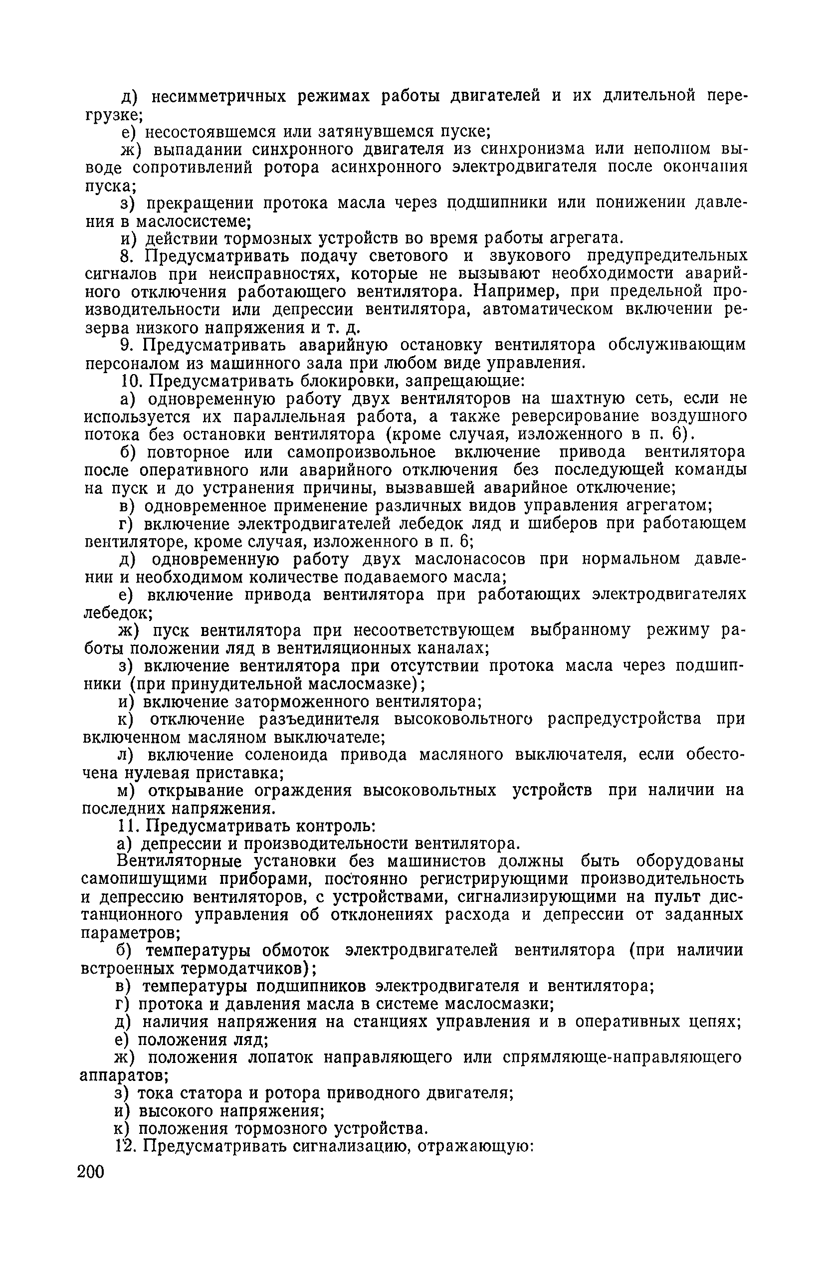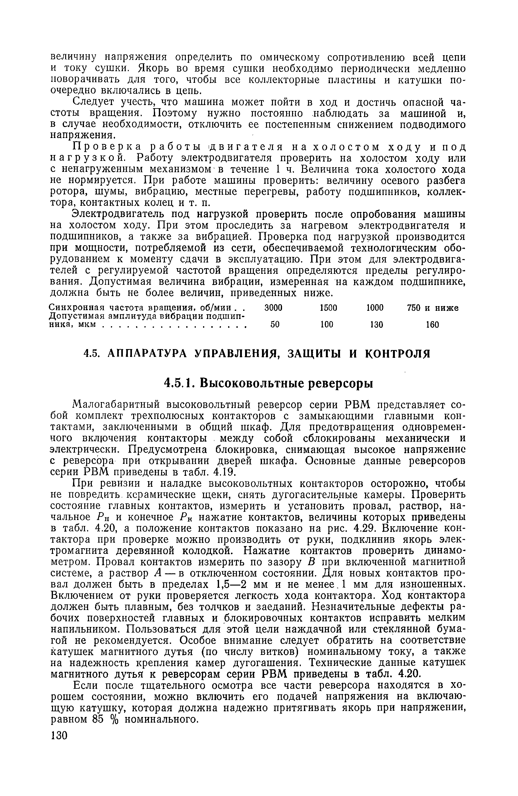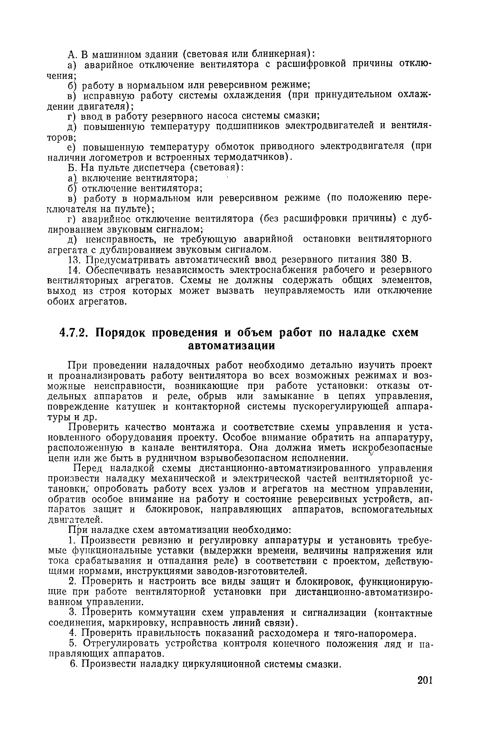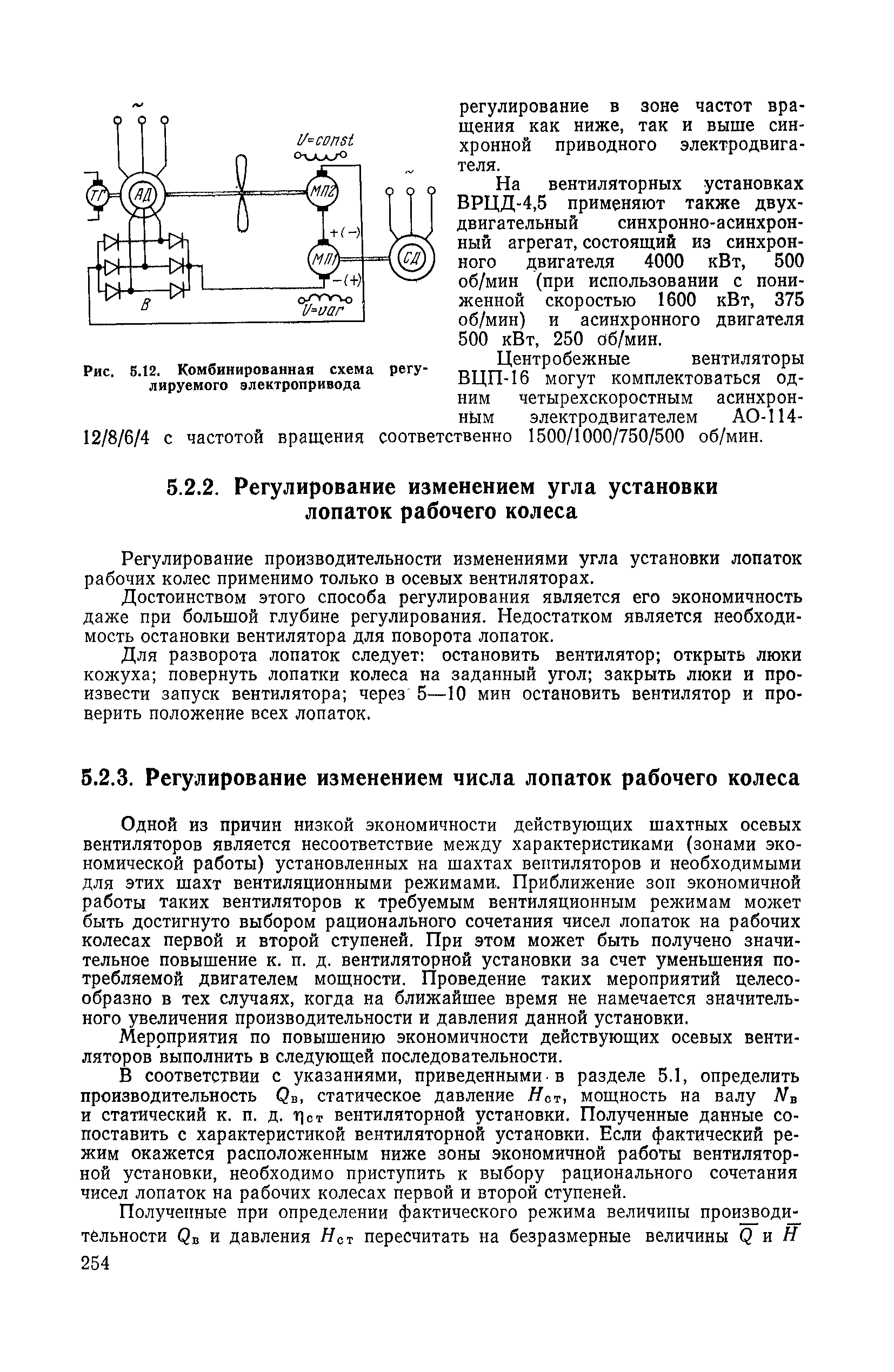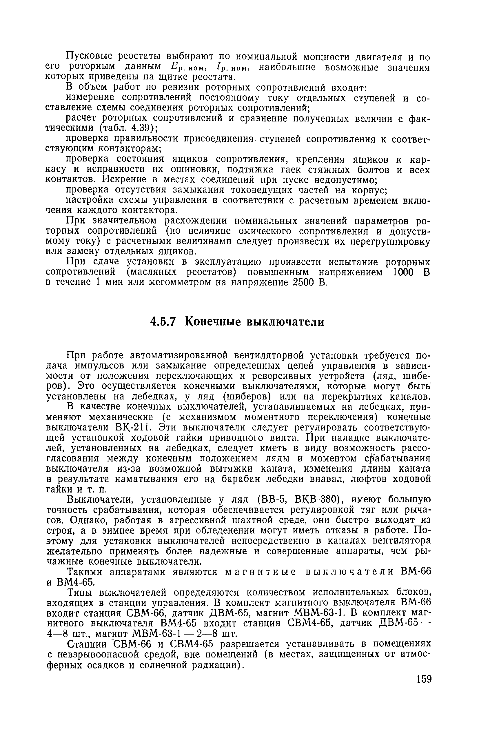 | Оглавление: | 1. Общие положения 1.1. Цель ревизии и наладки главных вентиляторных установок 1.2. Объем работ по ревизии и наладке главных вентиляторных установок 1.3. Организация и проведение работ по ревизии и наладке главных вентиляторных установок 1.3.1. Подготовительные работы 1.3.2, Порядок проведения наладочных работ 1.3.3. Определение режимных параметров главной вентиляторной установки 1.3.4. Оформление отчетно-технической документации 2. Конструкции и параметры вентиляторных установок 2.1. Элементы главной вентиляторной установки шахты 2.2. Осевые вентиляторы 2.3. Центробежные вентиляторы 3. Ревизия и наладка механической части главных вентиляторных установок 3.1. Ревизия и наладка отдельных узлов механической части вентиляторов и пробный пуск 3.1.1. Проверка состояния фундамента, рамы, кожуха, диффузора, коллектора, обтекателя, подшипниковых узлов 3.1.2. Рабочие колеса осевых вентиляторов 3.1.3. Рабочие колеса центробежных вентиляторов 3.1.4. Направляющие и спрямляющие аппараты 3.1.5. Подшипники качения. валы 3.1.6. Подшипники скольжения. Валы 3.1.7. Системы циркуляционной смазки подшипников 3.1.8. Соединительные муфты 3.1.9. Центровка опорных валов 3.1.10. Центровка подвесных валов 3.1.11. Тормозные устройства вентиляторов 3.1.12. Пробный пуск вентиляторов 3.2. Балансировка роторов шахтных вентиляторов 3.2.1. Причины и допустимые величины вибраций 3.2.2. Виброизмерительная аппаратура 3.2.3.. Статическая балансировка 3.2.4. динамическая балансировка 3.3. Ревизия и наладка реверсивных и переключающих устройств 3.3.1. Способы реверсирования воздушной струи и перестановки переключающих устройств 3.3.2. Типовые схемы реверсирования и переключения воздушной струи 3.3.3. Ревизия, наладка и опробование реверсивных и переключающих устройств 4. Ревизия, наладка и испытание электрической части главных вентиляторных установок 4.1. Распределительные устройства напряжением выше 1000 В 4.1.1. Разъединители 4.1.2. Масляные выключатели 4.1.3. Приводы к масляным выключателям 4.1.4. Трансформаторы тока (ТТ) 4.1.5. Трансформаторы напряжения (ТН) 4.2. Распределительные устройства напряжением до 1000 В 4.3. Кабельные линии 4.4. Электрические машины 4.4.1. Внешний осмотр машины и проверка ее состояния 4.4.2. Проверка механической части электрических машин 4.4.3. Измерение сопротивления изоляции обмоток 4.4.4. Измерение сопротивления обмоток постоянному току 4.4.5. Статические преобразователи 4.4.6. Ревизия и испытание электрических машин после монтажа 4.5. Аппаратура управления, защиты и контроля 4.5.1. Высоковольтные реверсоры 4.5.2. Контакторы переменного тока КТ (КТВ) 4 5.3. Автоматические выключатели серий А3100 и АП-50 4.5.4. Реле постоянного и переменного тока 4.5.5. Тормозные электромагниты 4.5.6. Роторные сопротивления и реостаты 4.5.7. Конечные выключатели 4.5.8. Полупроводниковые выпрямительные элементы 4.5.9. Контроль температуры 4.5.10. Электроконтактные манометры 4.6. Схемы управления, защиты н контроля 4.6.1. Вторичные цени 4.6.2. Схемы управления асинхронным приводом 4.6.3. Схемы управления синхронным приводом 4.6.4. Контроль вращения 4.6.5. Контроль температуры подшипников электродвигателей и вентиляторов 4.6.6. Защита приводных электродвигателей 4.7. Схемы и аппаратура дистанционно-автоматизированного управления главными вентиляторными установками 4.7.1. Основные технические требования к автоматизированным установкам 4.7.2. Порядок проведе