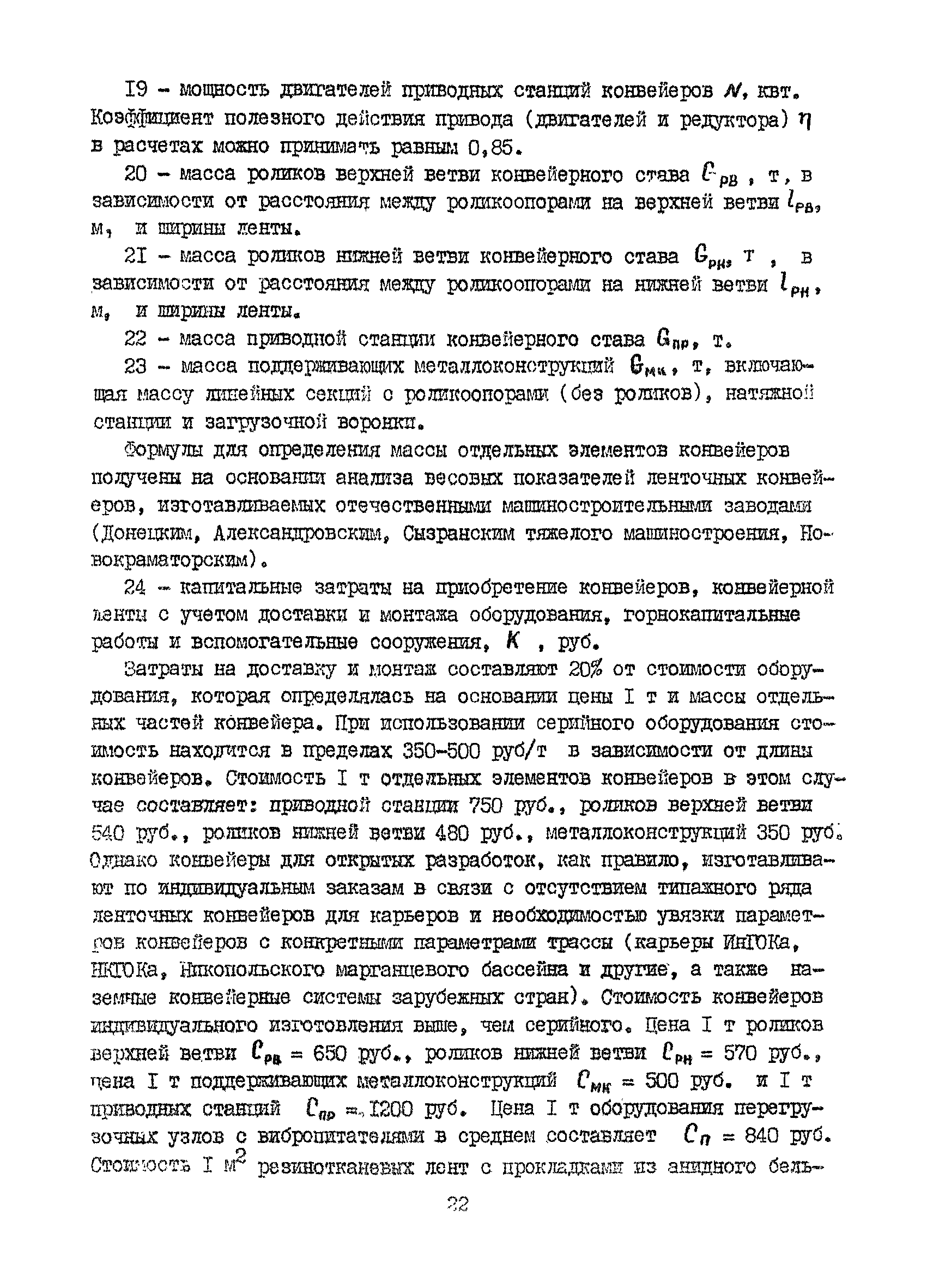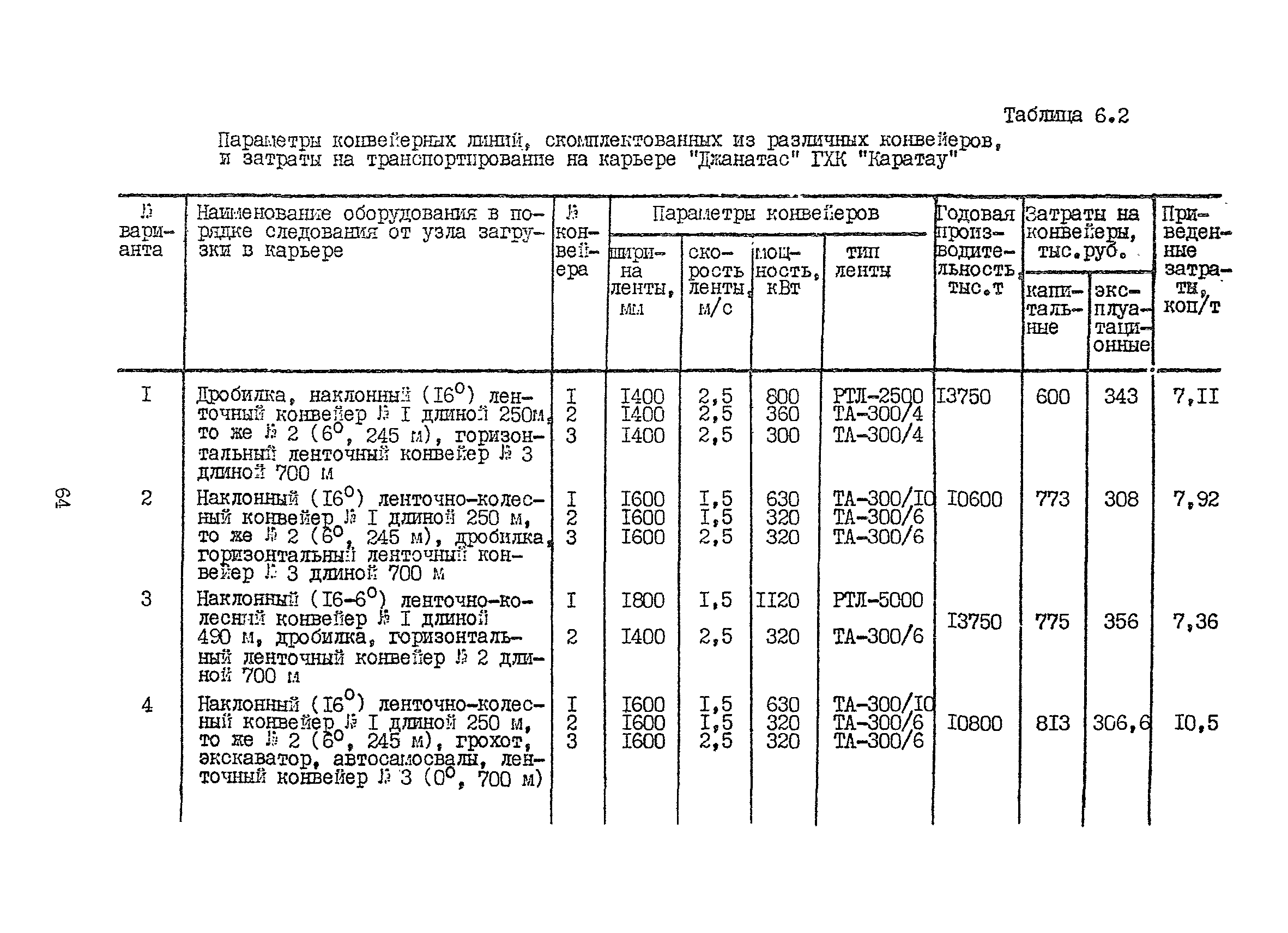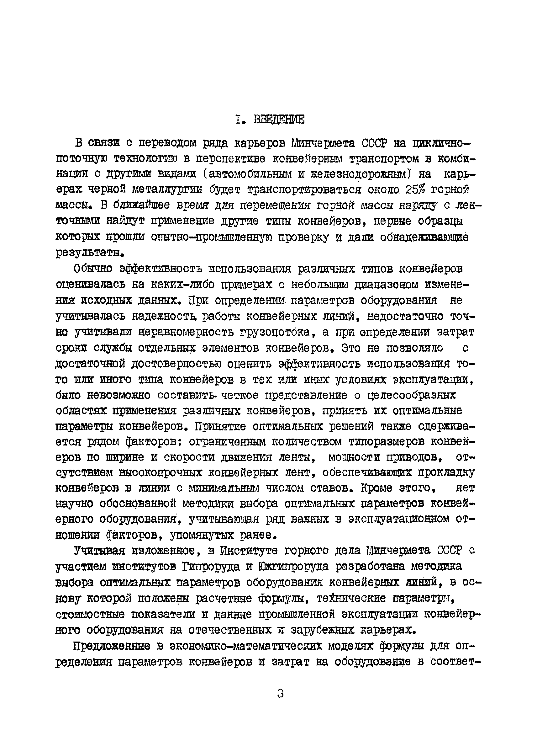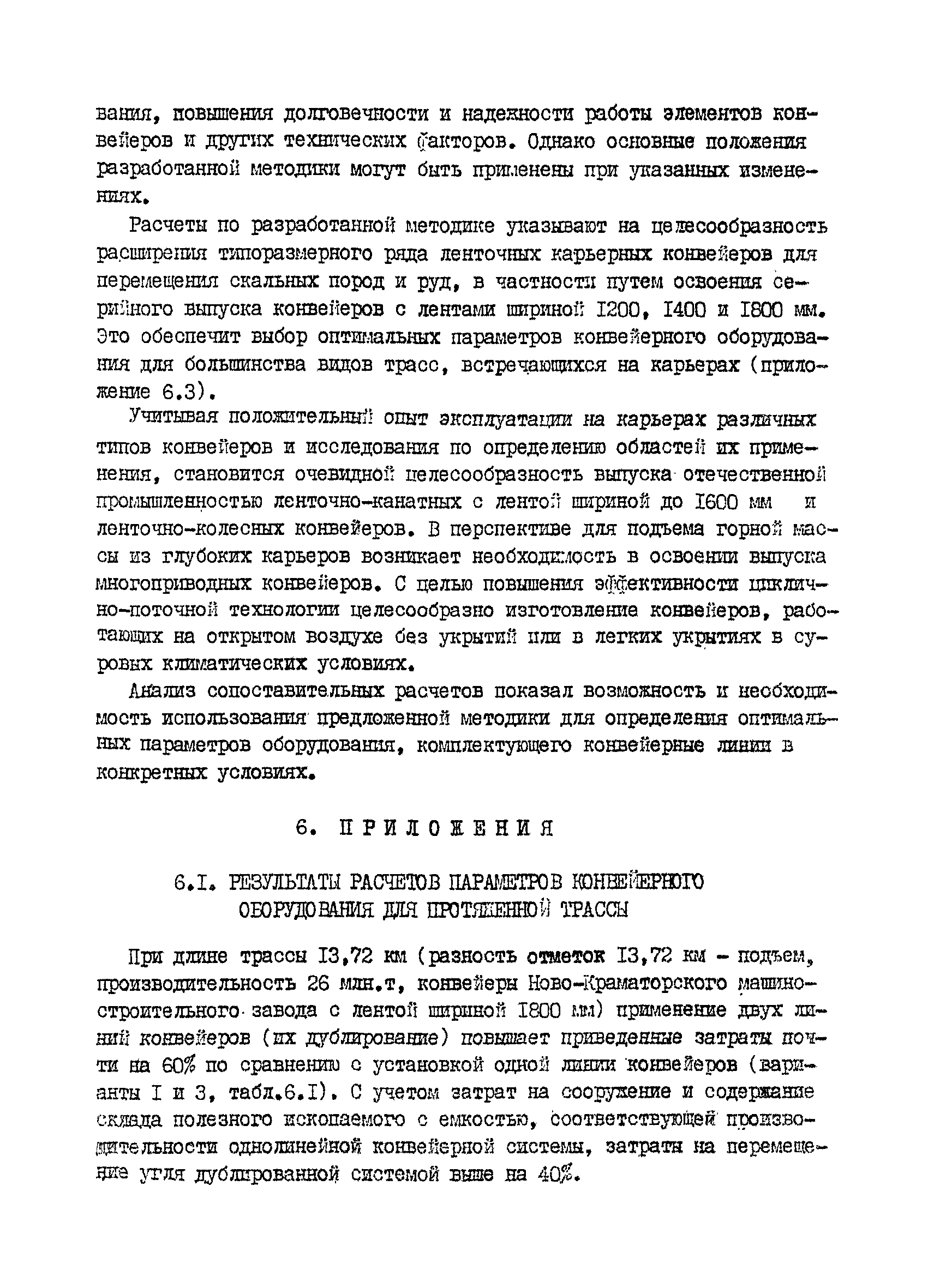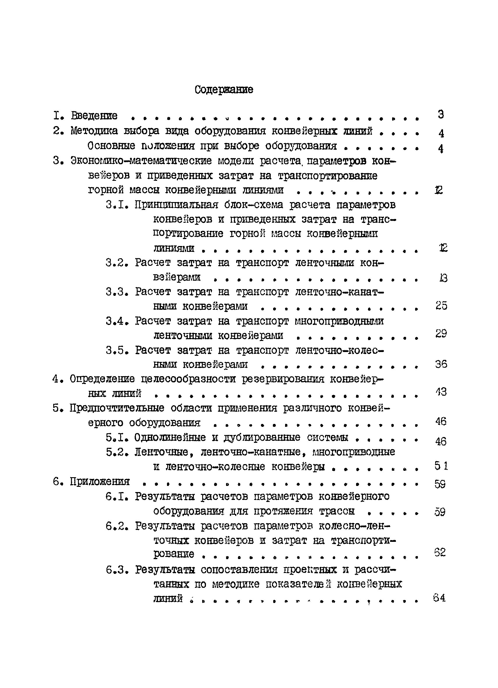 | Оглавление: | 1. Введение 2. Методика выбора вида оборудования конвейерных линий Основные положения при выборе оборудования 3. Экономико-математические модели расчета, параметров конвейеров и приведенных затрат на транспортирование горной массы конвейерными линиями 3.1. Принципиальная блок-схема расчета параметров конвейеров и приведенных затрат на транспортирование горной массы конвейерными линиями 3.2. Расчет затрат на транспорт ленточными конвейерами 3.3. Расчет затрат на транспорт ленточно-канатными конвейерами 3.4. Расчет затрат на транспорт многоприводными ленточными конвейерами 3.5. Расчет затрат на транспорт ленточно-колесными конвейерами 4. Определение целесообразности резервирования конвейерных линий 5. Предпочтительные области применения различного конвейерного оборудования 5.1. Однолинейные и дублированные системы 5.2. Ленточные, ленточно-канатные, многоприводные и ленточно-колесные конвейер 6. Приложения 6.1. Результаты расчетов параметров конвейерного оборудования для протяжения трассы 6.2. Результаты расчетов параметров колесно-ленточных конвейеров и затрат на транспортирование 6.3. Результаты сопоставления проектных и рассчитанных по методике показателей конвейерных линий |