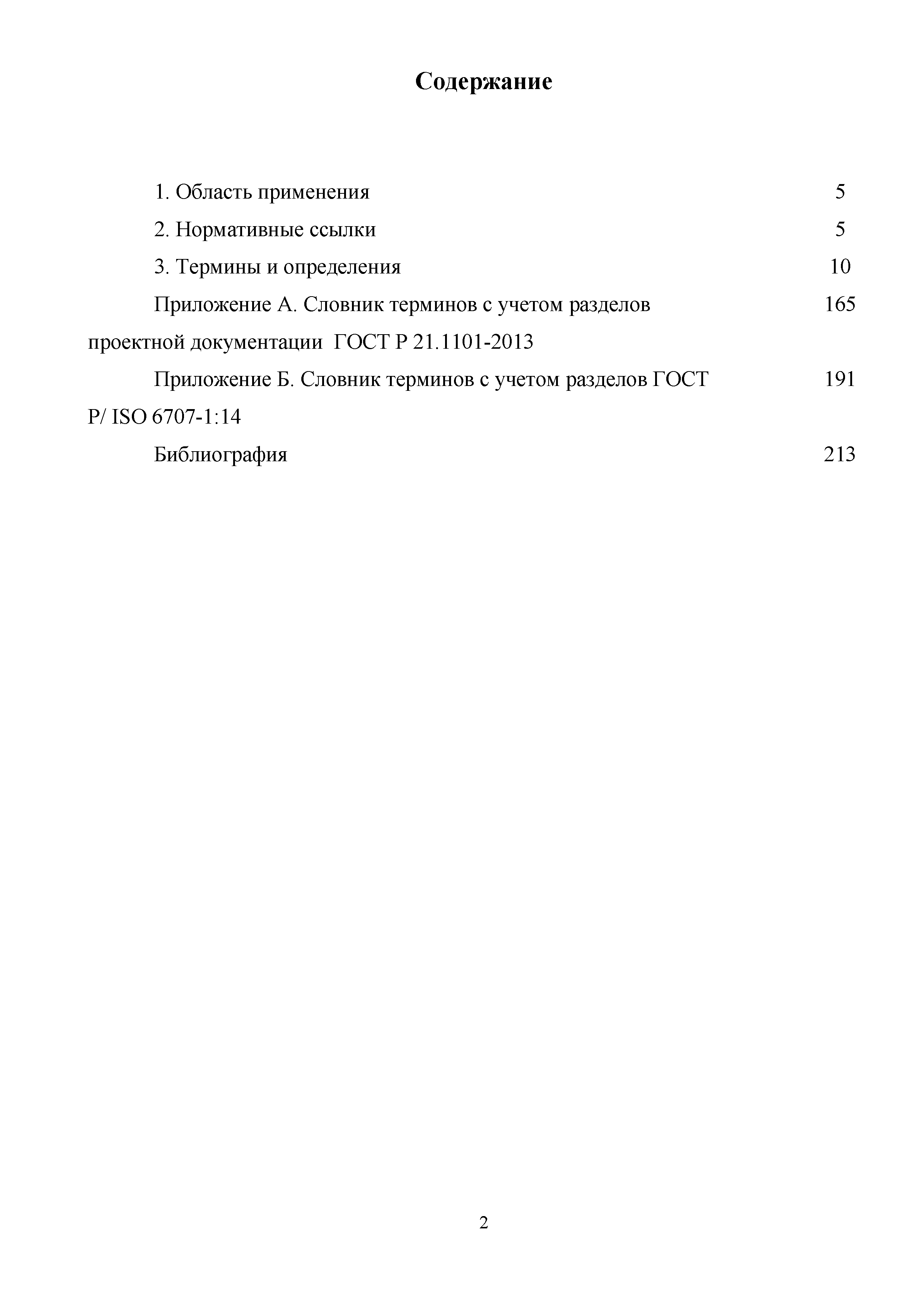 1 Область применения 2 Нормативные ссылки 3 Термины и определения Приложение А. Словник терминов с учетом разделов проектной документации ГОСТ Р 21.1101-2013 Приложение Б. Словник терминов с учетом разделов ГОСТ Р/ISO 6707-1:14 Библиография