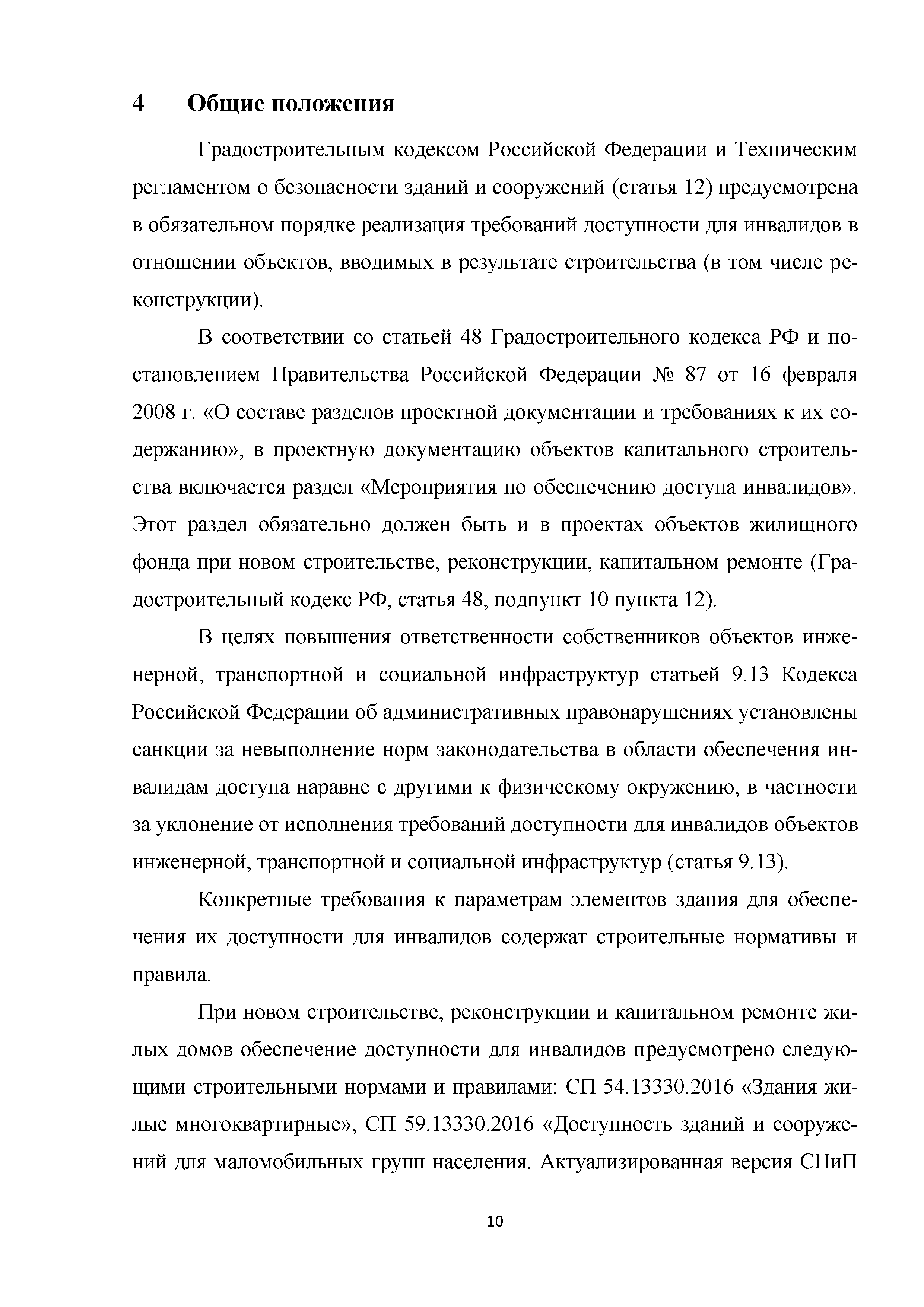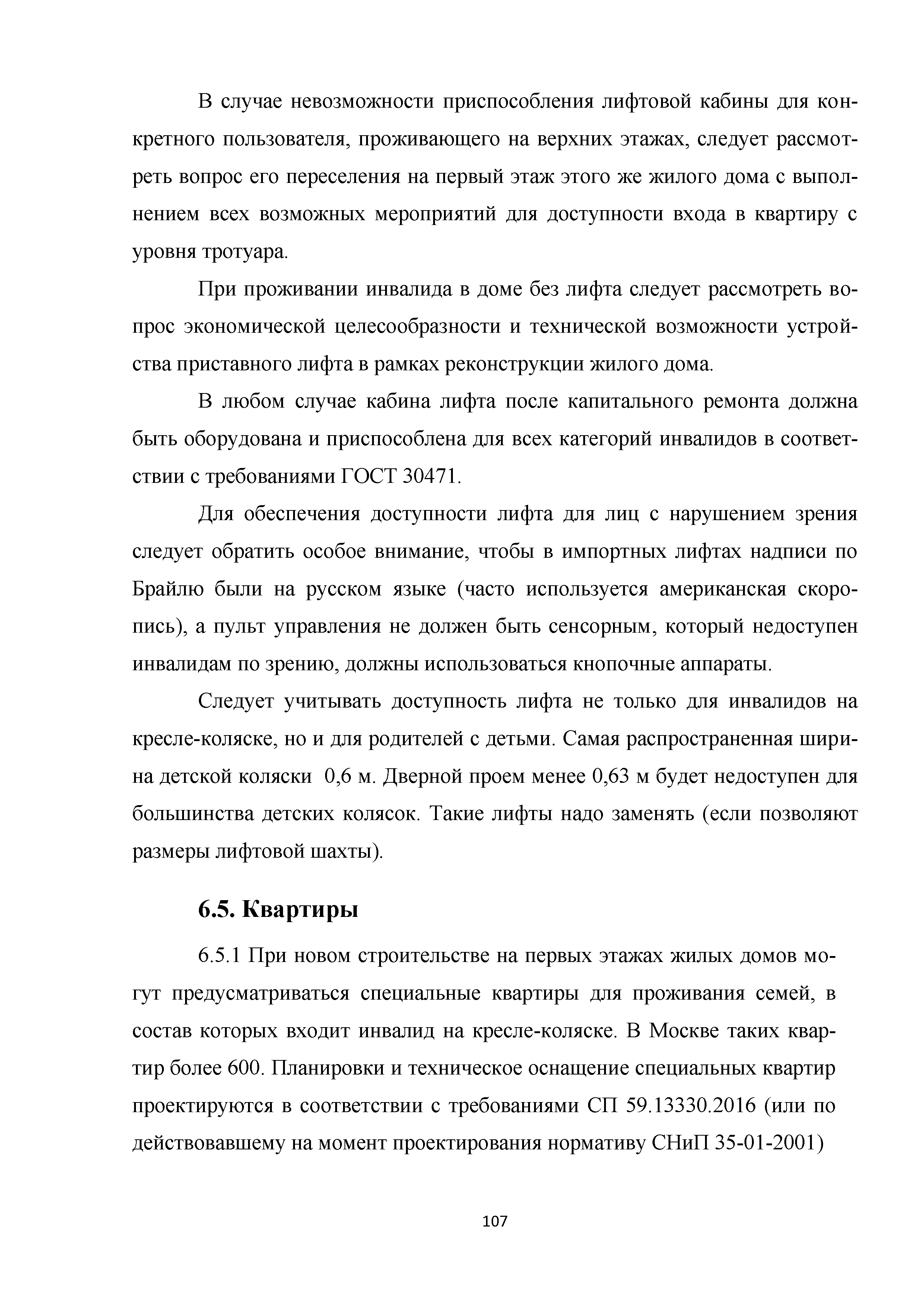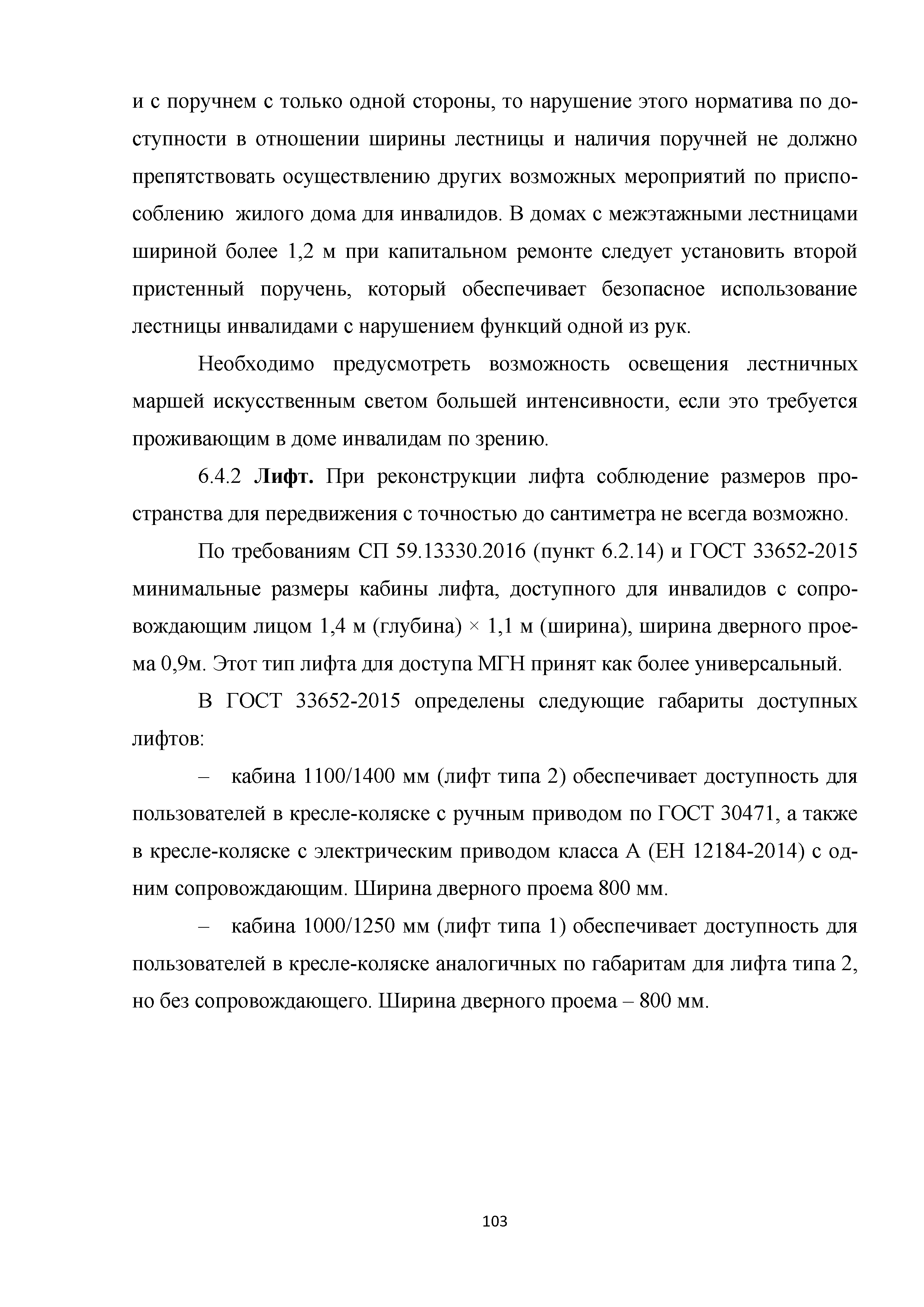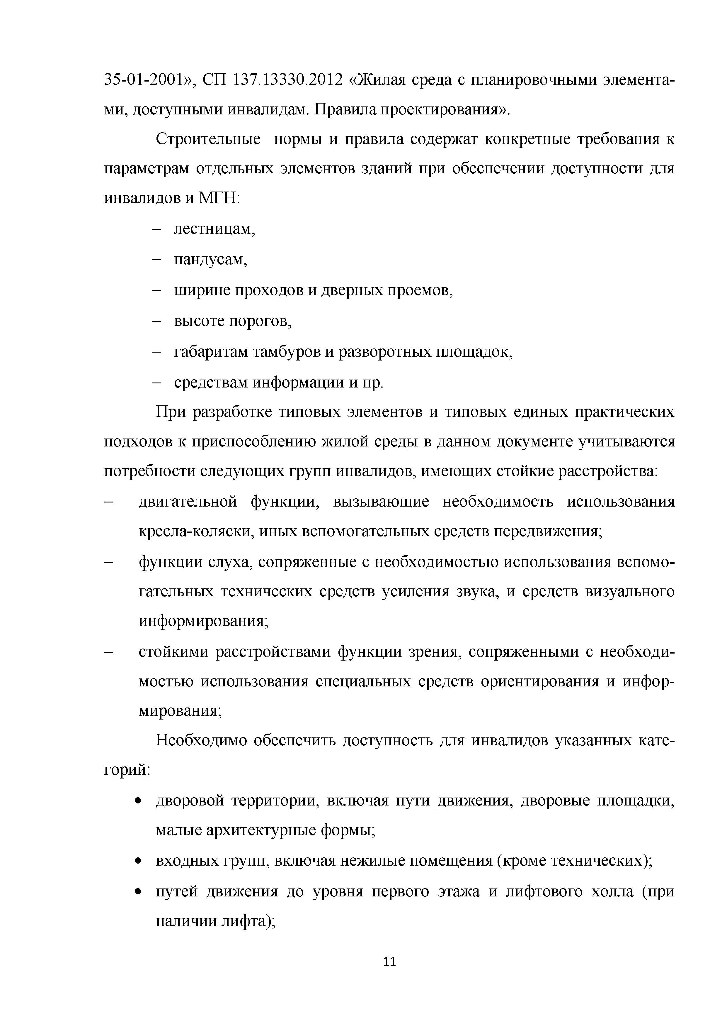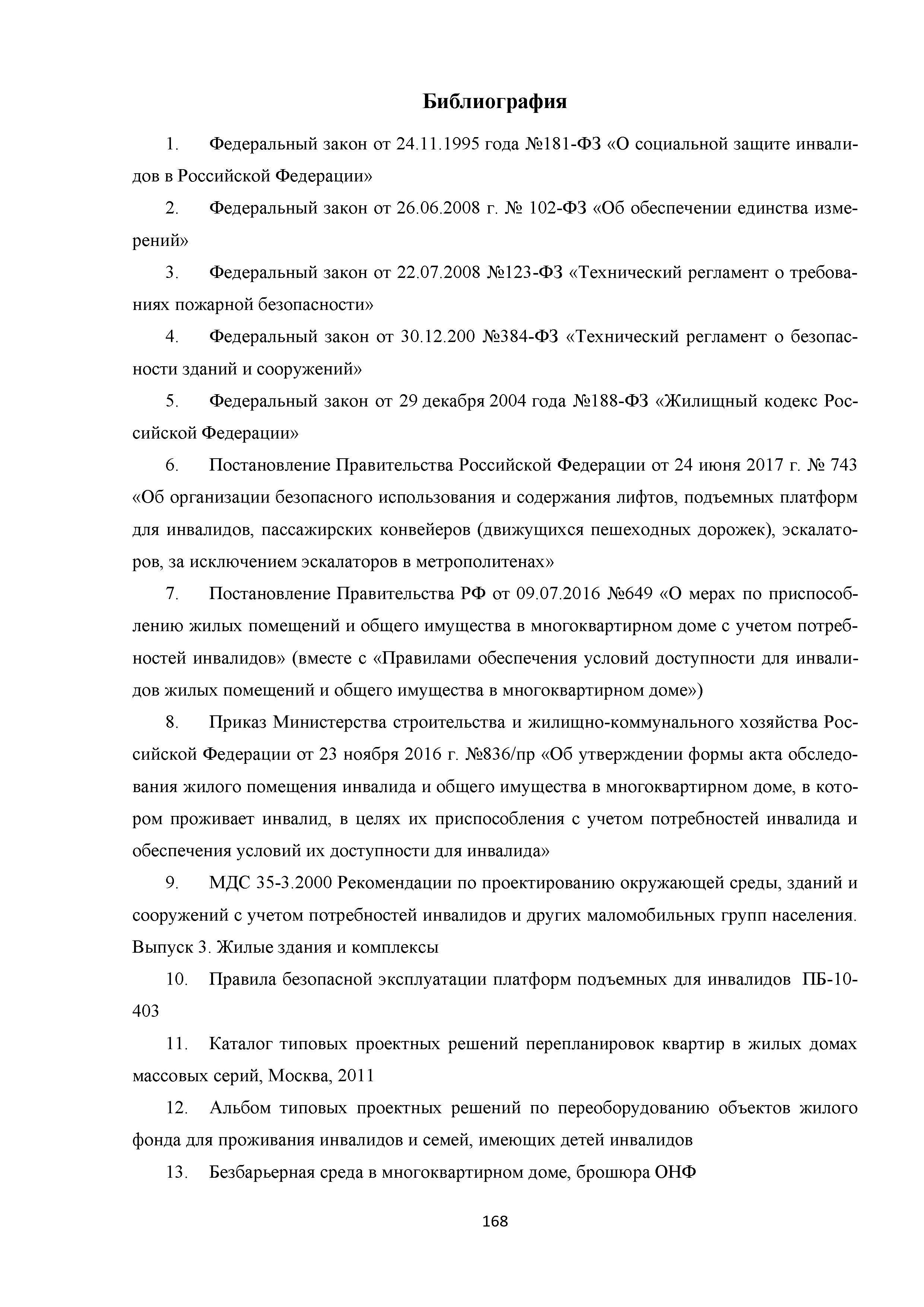 | | Нормативные ссылки: |   МДС 35-3.2000 «Рекомендации по проектированию окружающей среды, зданий и сооружений с учетом потребностей инвалидов и других маломобильных групп населения. Вып. 3. "Жилые здания и комплексы"»  Федеральный закон 181-ФЗ «О социальной защите инвалидов в Российской Федерации» ГОСТ Р 51633-2000 «Устройства и приспособления реабилитационные, используемые инвалидами в жилых помещениях. Общие технические требования» Кодекс «Жилищный кодекс Российской Федерации»  ПБ 10-403-01 «Правила устройства и безопасной эксплуатации платформ подъемных для инвалидов»  ГОСТ Р 52289-2004 «Технические средства организации дорожного движения. Правила применения дорожных знаков, разметки, светофоров, дорожных ограждений и направляющих устройств»  ГОСТ Р 52290-2004 «Технические средства организации дорожного движения. Знаки дорожные. Общие технические требования»  ГОСТ Р 52875-2007 «Указатели тактильные наземные для инвалидов по зрению. Технические требования»  Технический регламент «Технический регламент о требованиях пожарной безопасности»  Федеральный закон 102-ФЗ «Об обеспечении единства измерений» Технический регламент «Технический регламент о безопасности зданий и сооружений»  СП 1.13130.2009 «Системы противопожарной защиты. Эвакуационные пути и выходы»  ГОСТ Р 12.2.143-2009 «Система стандартов безопасности труда. Системы фотолюминесцентные эвакуационные. Требования и методы контроля»  СП 137.13330.2012 «Жилая среда с планировочными элементами, доступными инвалидам. Правила проектирования»  СП 136.13330.2012 «Здания и сооружения. Общие положения проектирования с учетом доступности для маломобильных групп населения» ГОСТ Р 55641-2013 «Платформы подъемные для инвалидов и других маломобильных групп населения. Диспетчерский контроль. Общие технические требования» ГОСТ Р 55555-2013 «Платформы подъемные для инвалидов и других маломобильных групп населения. Требования безопасности и доступности. Часть 1. Платформы подъемные с вертикальным перемещением» ГОСТ Р 55556-2013 «Платформы подъемные для инвалидов и других маломобильных групп населения. Требования безопасности и доступности. Часть 2. Платформы подъемные с наклонным перемещением» ГОСТ Р 55642-2013 «Платформы подъемные для инвалидов и других маломобильных групп населения. Правила и методы исследований (испытаний) и измерений. Правила отбора образцов» ГОСТ Р 51671-2015 «Средства связи и информации технические общего пользования, доступные для инвалидов. Классификация. Требования доступности и безопасности»  ГОСТ 33652-2015 «Лифты пассажирские. Технические требования доступности, включая доступность для инвалидов и других маломобильных групп населения»  ГОСТ 12.4.026-2015 «Система стандартов безопасности труда. Цвета сигнальные, знаки безопасности и разметка сигнальная. Назначение и правила применения. Общие технические требования и характеристики. Методы испытаний»  Постановление 649 «О мерах по приспособлению жилых помещений и общего имущества в многоквартирном доме с учетом потребностей инвалидов» Типовые проектные решения «Альбом типовых проектных решений по переоборудованию объектов жилого фонда для проживания инвалидов и семей, имеющих детей-инвалидов»  СП 59.13330.2016 «Доступность зданий и сооружений для маломобильных групп населения»  «Акт обследования жилого помещения инвалида и общего имущества в многоквартир