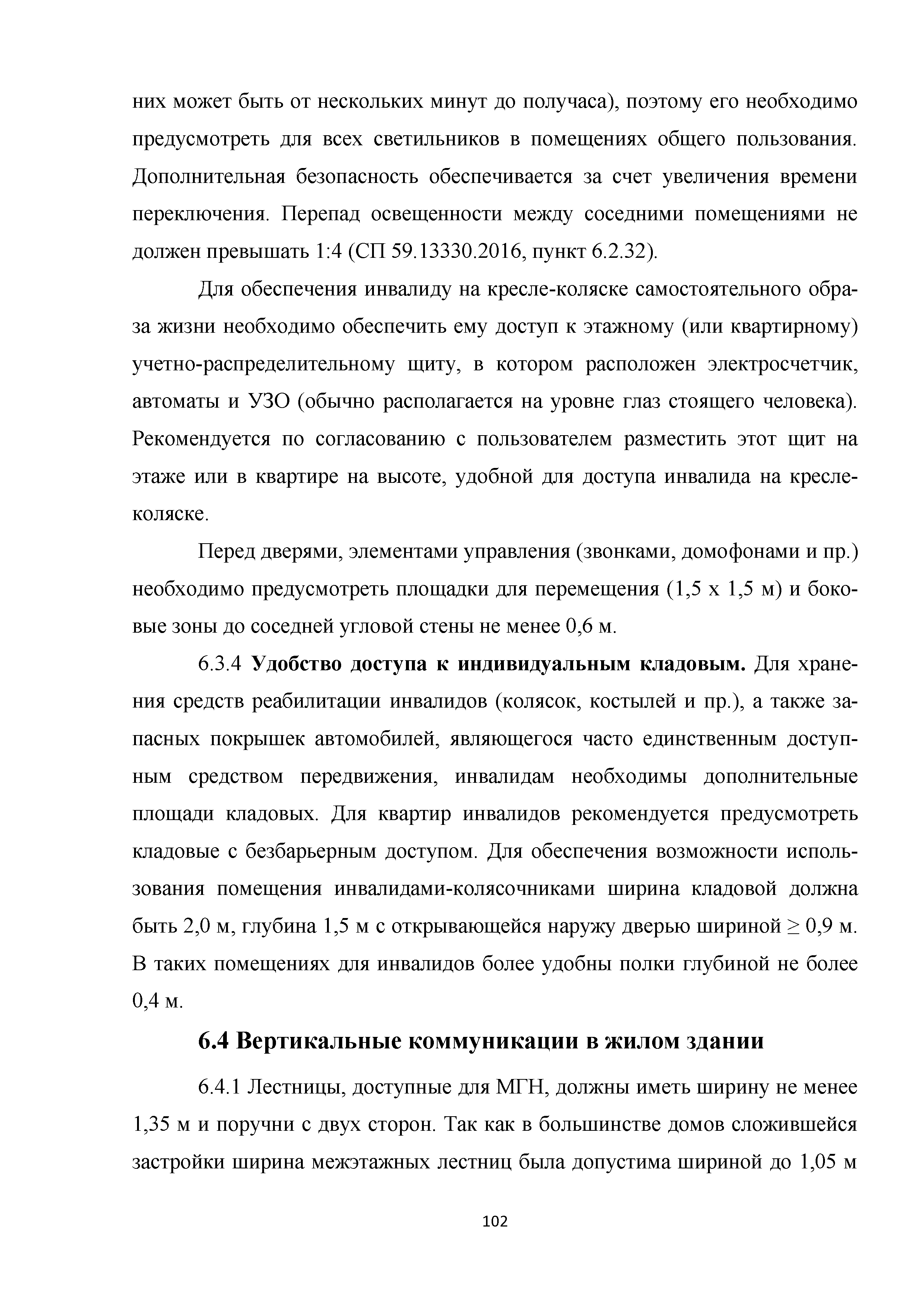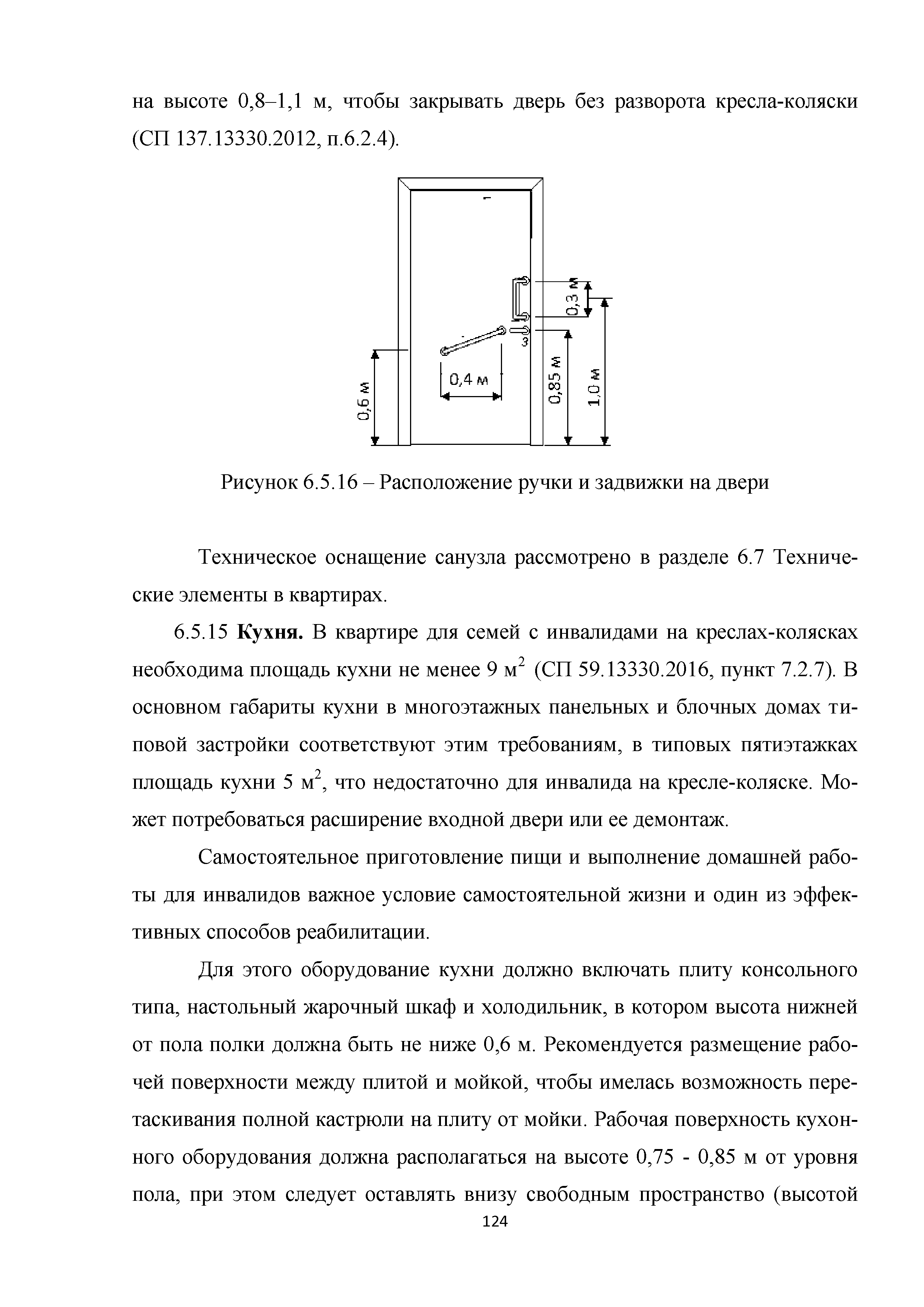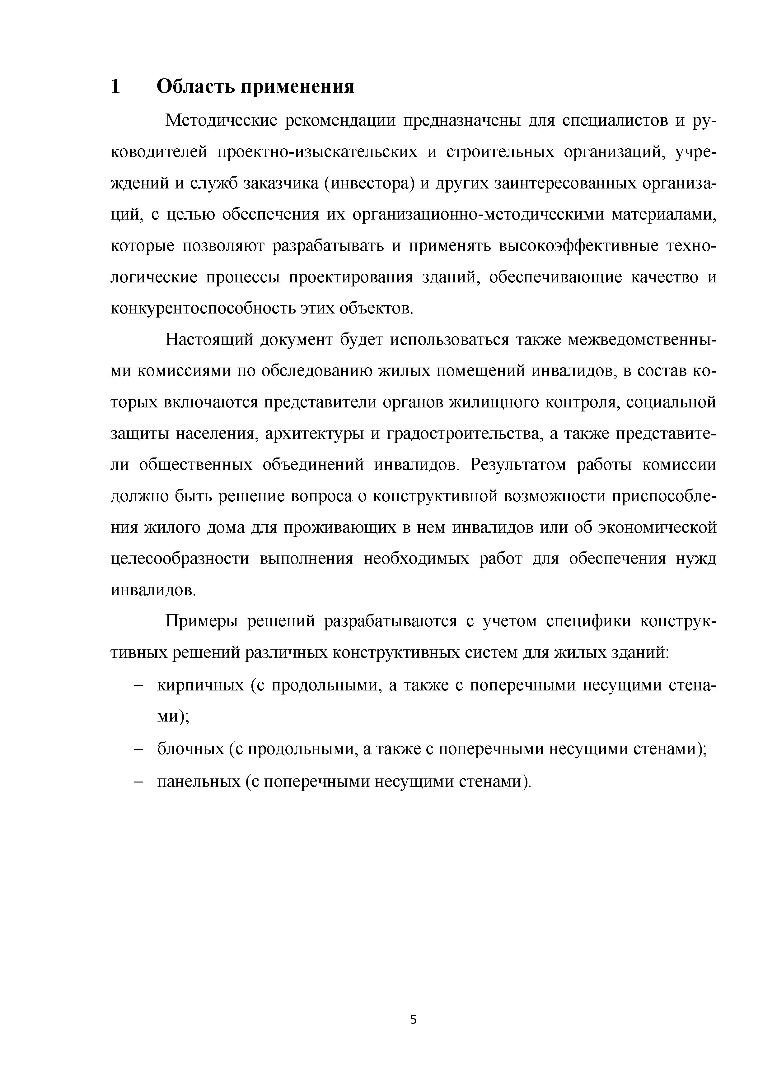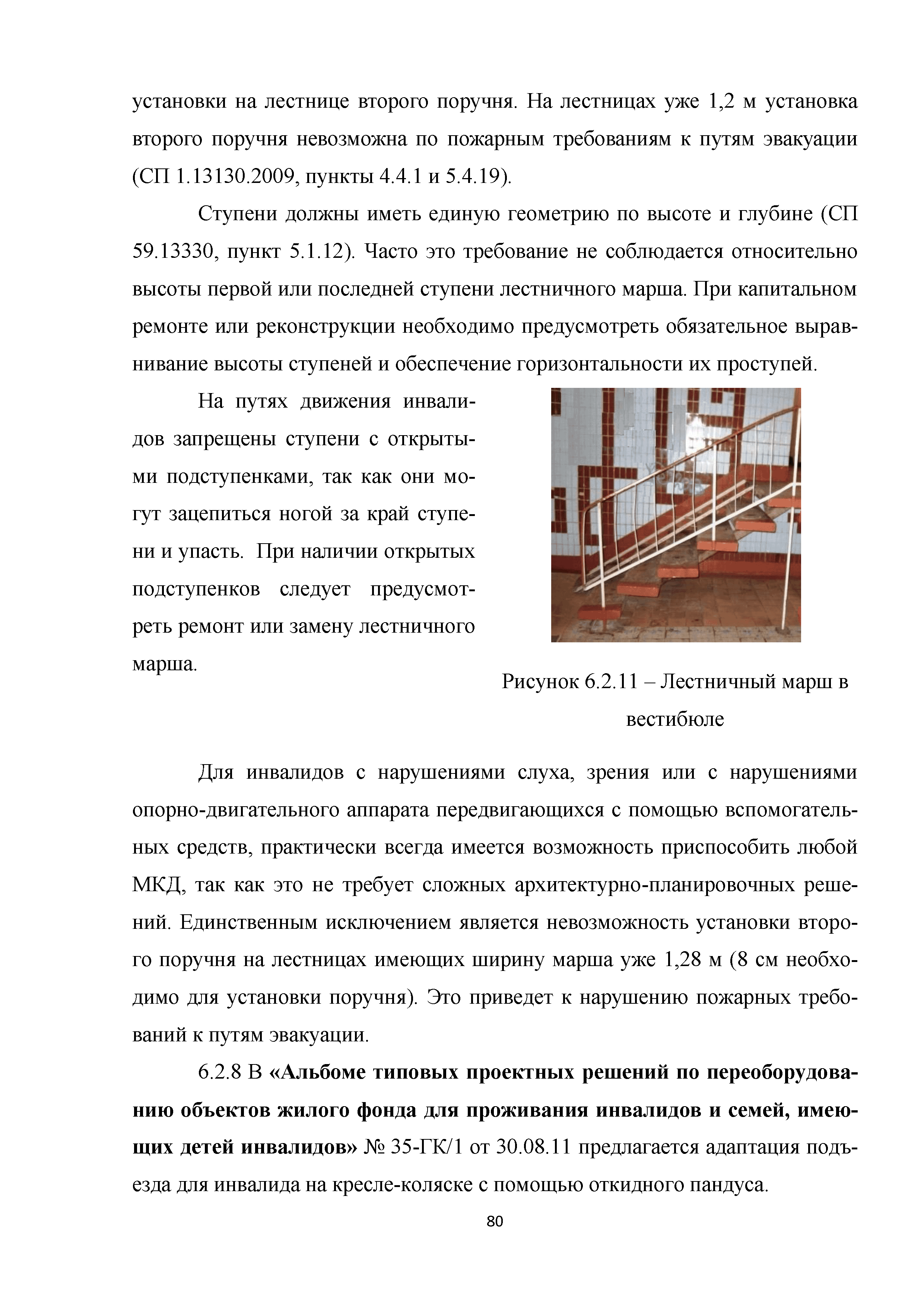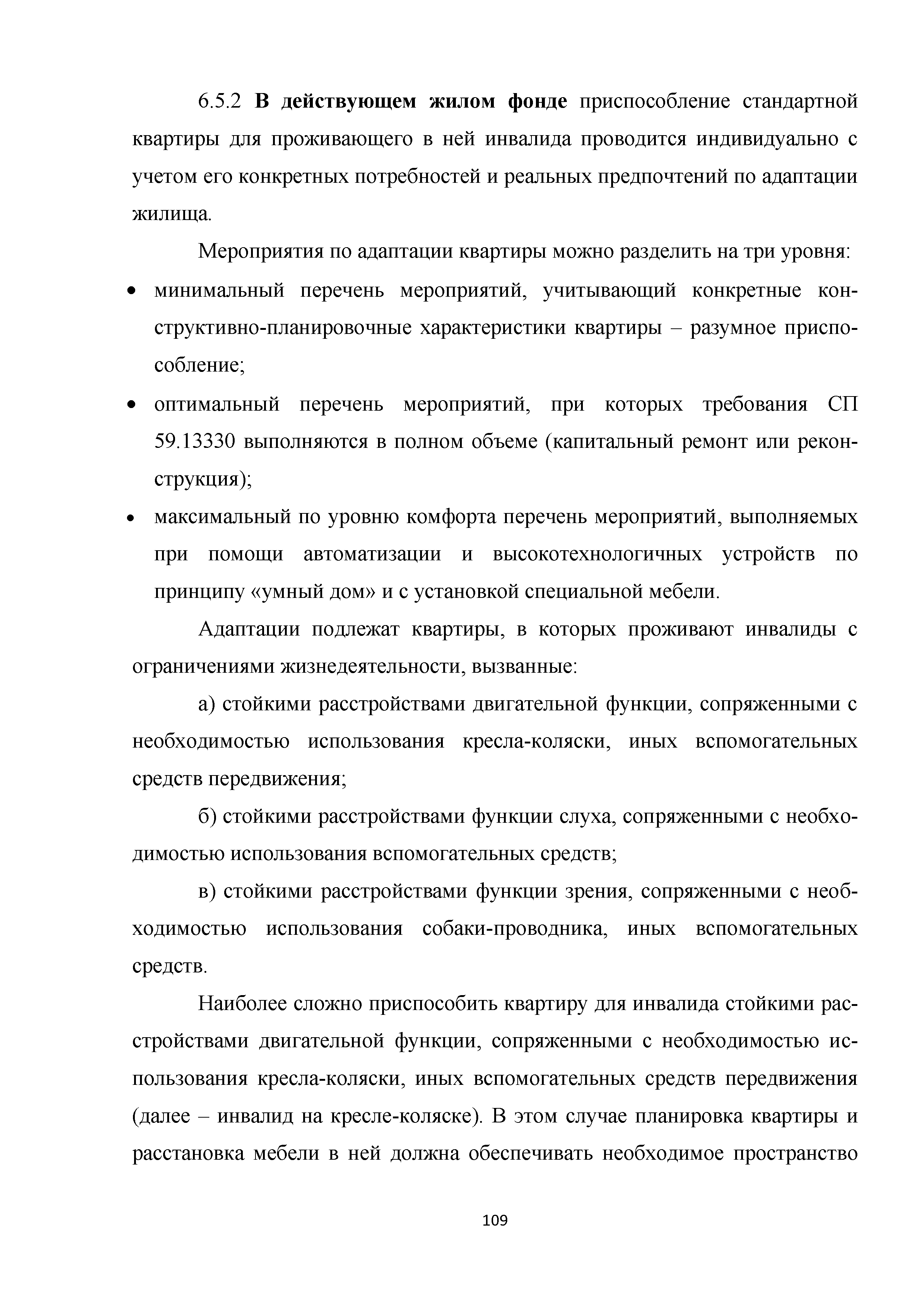 | | Нормативные ссылки: |   МДС 35-3.2000 «Рекомендации по проектированию окружающей среды, зданий и сооружений с учетом потребностей инвалидов и других маломобильных групп населения. Вып. 3. "Жилые здания и комплексы"»  Федеральный закон 181-ФЗ «О социальной защите инвалидов в Российской Федерации» ГОСТ Р 51633-2000 «Устройства и приспособления реабилитационные, используемые инвалидами в жилых помещениях. Общие технические требования» Кодекс «Жилищный кодекс Российской Федерации»  ПБ 10-403-01 «Правила устройства и безопасной эксплуатации платформ подъемных для инвалидов»  ГОСТ Р 52289-2004 «Технические средства организации дорожного движения. Правила применения дорожных знаков, разметки, светофоров, дорожных ограждений и направляющих устройств»  ГОСТ Р 52290-2004 «Технические средства организации дорожного движения. Знаки дорожные. Общие технические требования»  ГОСТ Р 52875-2007 «Указатели тактильные наземные для инвалидов по зрению. Технические требования»  Технический регламент «Технический регламент о требованиях пожарной безопасности»  Федеральный закон 102-ФЗ «Об обеспечении единства измерений» Технический регламент «Технический регламент о безопасности зданий и сооружений»  СП 1.13130.2009 «Системы противопожарной защиты. Эвакуационные пути и выходы»  ГОСТ Р 12.2.143-2009 «Система стандартов безопасности труда. Системы фотолюминесцентные эвакуационные. Требования и методы контроля»  СП 137.13330.2012 «Жилая среда с планировочными элементами, доступными инвалидам. Правила проектирования»  СП 136.13330.2012 «Здания и сооружения. Общие положения проектирования с учетом доступности для маломобильных групп населения» ГОСТ Р 55641-2013 «Платформы подъемные для инвалидов и других маломобильных групп населения. Диспетчерский контроль. Общие технические требования» ГОСТ Р 55555-2013 «Платформы подъемные для инвалидов и других маломобильных групп населения. Требования безопасности и доступности. Часть 1. Платформы подъемные с вертикальным перемещением» ГОСТ Р 55556-2013 «Платформы подъемные для инвалидов и других маломобильных групп населения. Требования безопасности и доступности. Часть 2. Платформы подъемные с наклонным перемещением» ГОСТ Р 55642-2013 «Платформы подъемные для инвалидов и других маломобильных групп населения. Правила и методы исследований (испытаний) и измерений. Правила отбора образцов» ГОСТ Р 51671-2015 «Средства связи и информации технические общего пользования, доступные для инвалидов. Классификация. Требования доступности и безопасности»  ГОСТ 33652-2015 «Лифты пассажирские. Технические требования доступности, включая доступность для инвалидов и других маломобильных групп населения»  ГОСТ 12.4.026-2015 «Система стандартов безопасности труда. Цвета сигнальные, знаки безопасности и разметка сигнальная. Назначение и правила применения. Общие технические требования и характеристики. Методы испытаний»  Постановление 649 «О мерах по приспособлению жилых помещений и общего имущества в многоквартирном доме с учетом потребностей инвалидов» Типовые проектные решения «Альбом типовых проектных решений по переоборудованию объектов жилого фонда для проживания инвалидов и семей, имеющих детей-инвалидов»  СП 59.13330.2016 «Доступность зданий и сооружений для маломобильных групп населения»  «Акт обследования жилого помещения инвалида и общего имущества в многоквартир