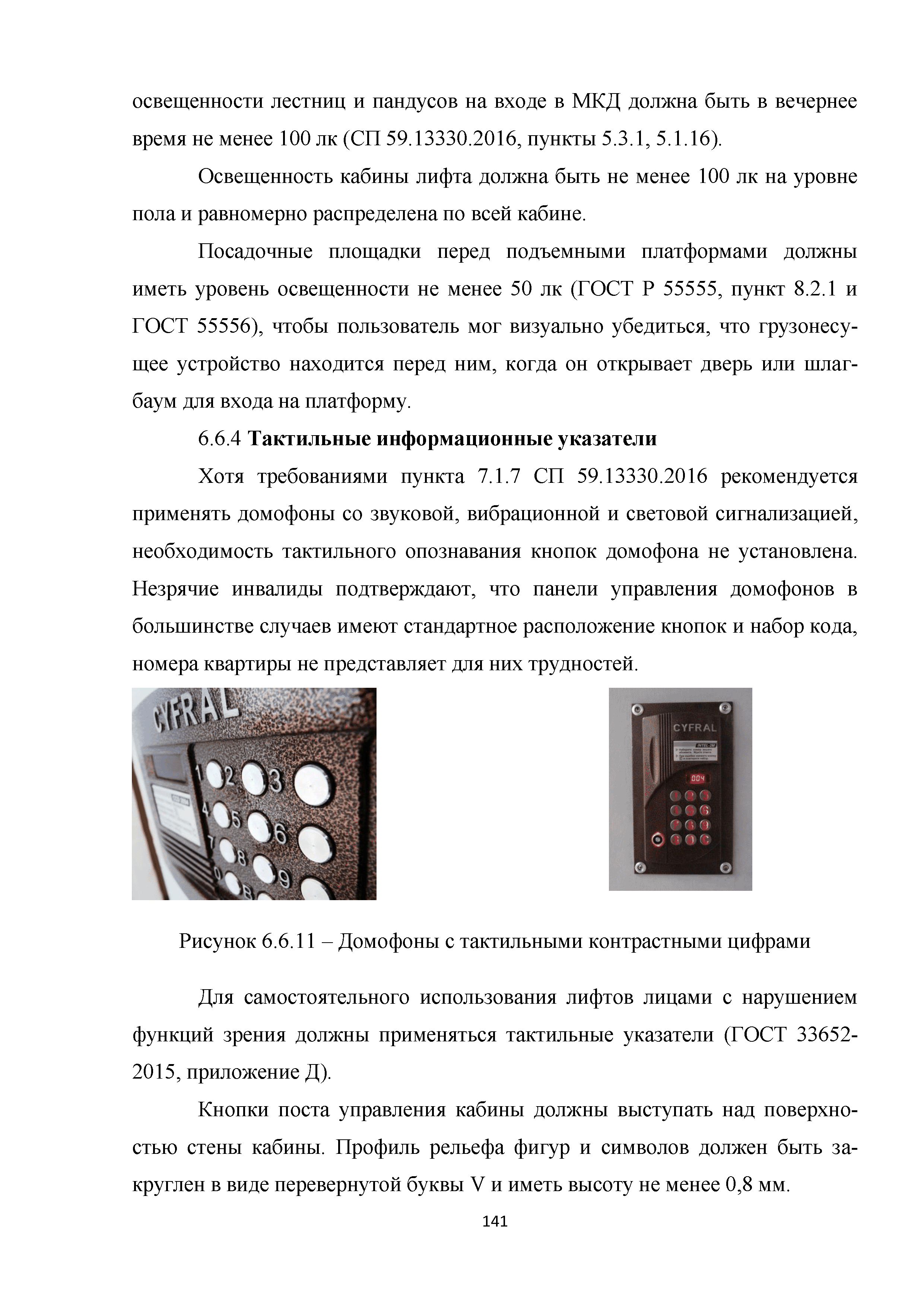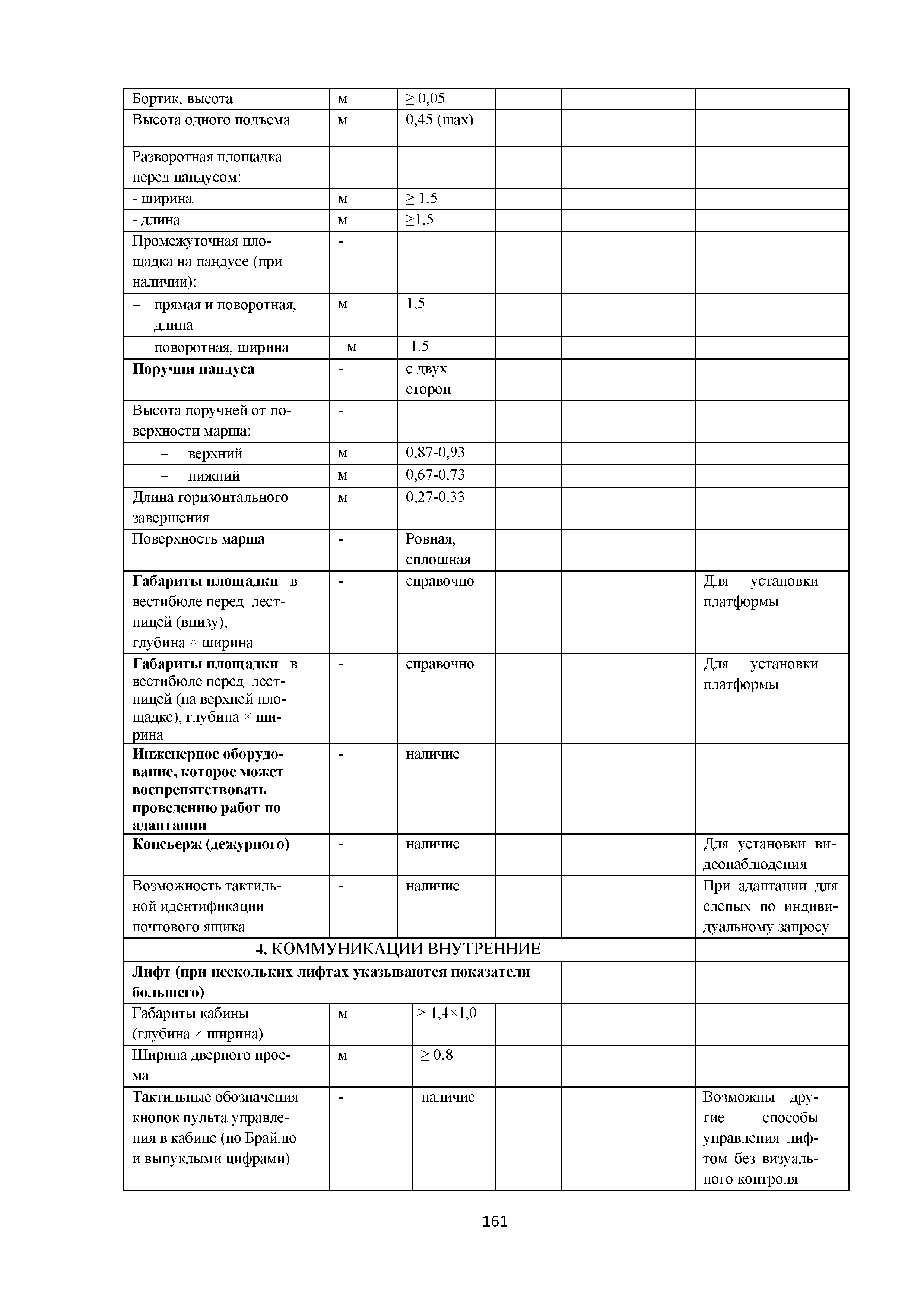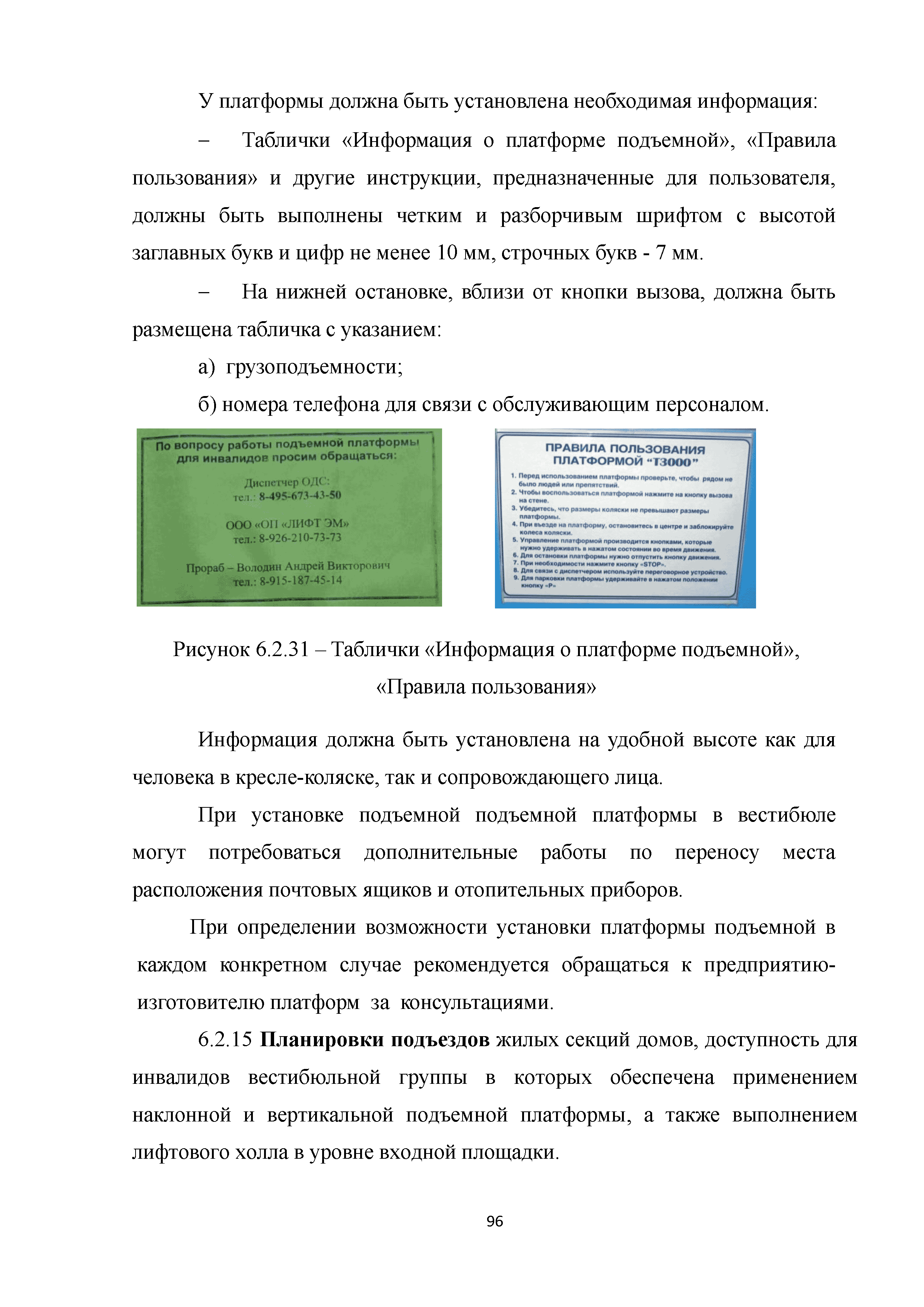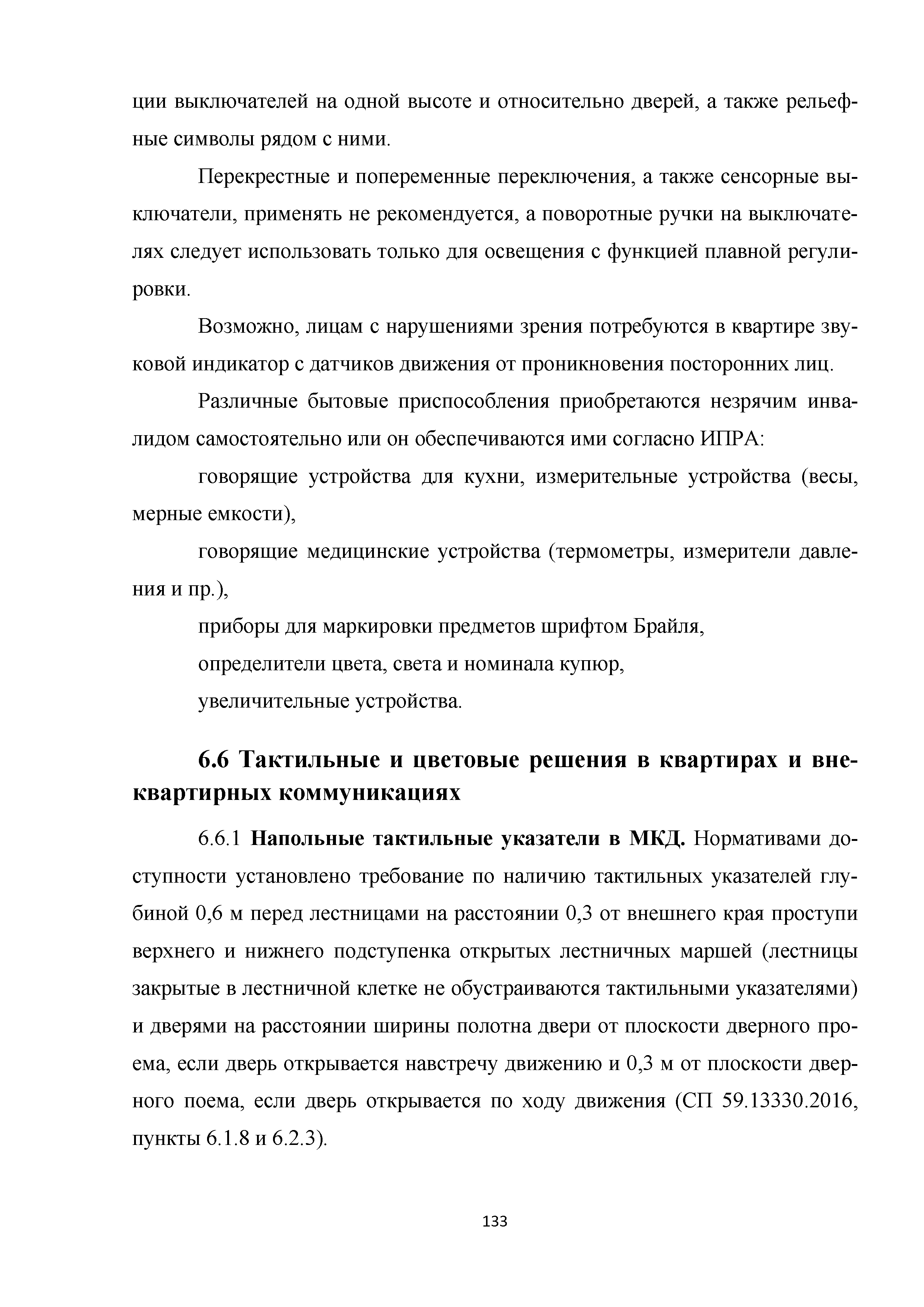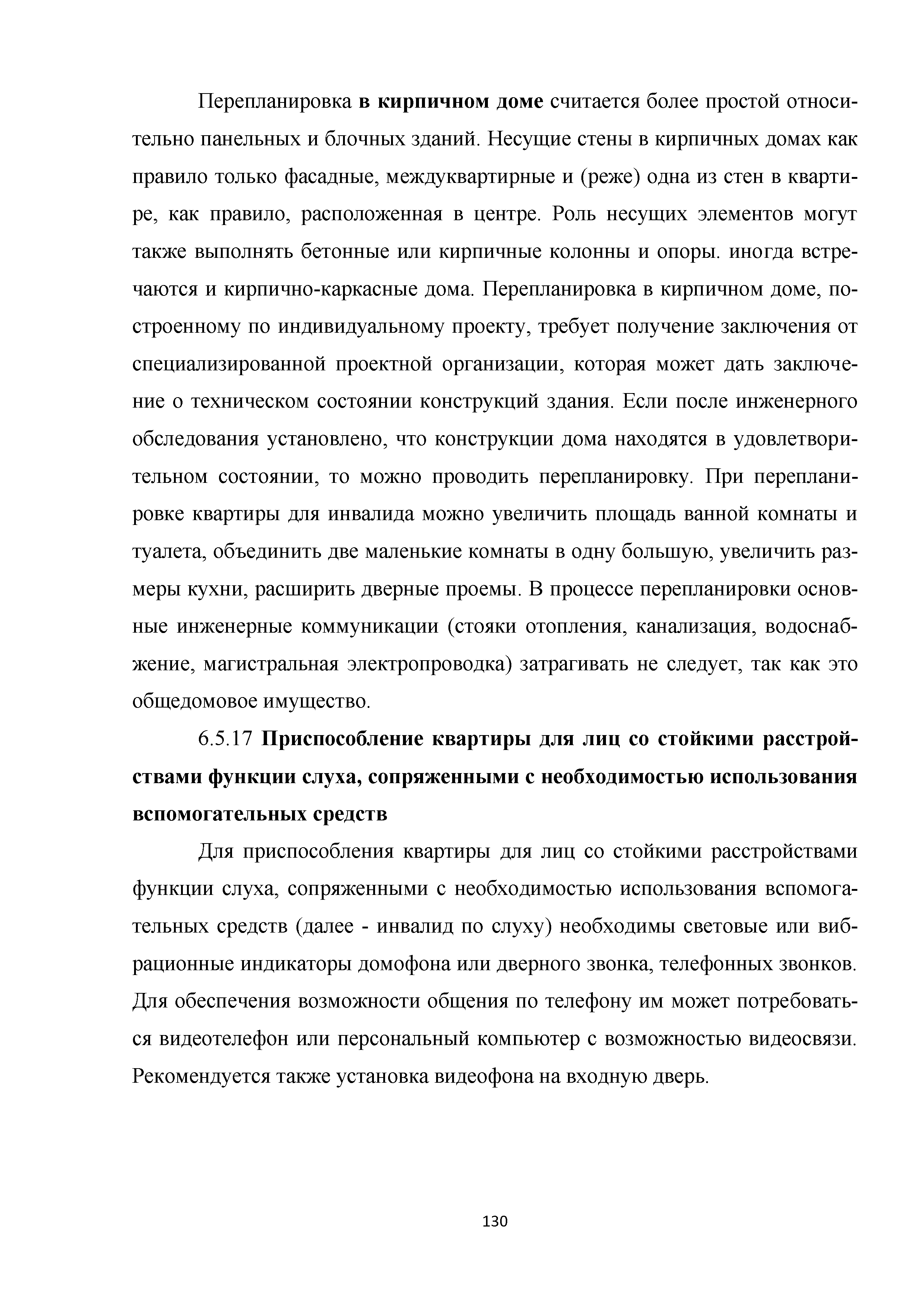 | | Нормативные ссылки: |   МДС 35-3.2000 «Рекомендации по проектированию окружающей среды, зданий и сооружений с учетом потребностей инвалидов и других маломобильных групп населения. Вып. 3. "Жилые здания и комплексы"»  Федеральный закон 181-ФЗ «О социальной защите инвалидов в Российской Федерации» ГОСТ Р 51633-2000 «Устройства и приспособления реабилитационные, используемые инвалидами в жилых помещениях. Общие технические требования» Кодекс «Жилищный кодекс Российской Федерации»  ПБ 10-403-01 «Правила устройства и безопасной эксплуатации платформ подъемных для инвалидов»  ГОСТ Р 52289-2004 «Технические средства организации дорожного движения. Правила применения дорожных знаков, разметки, светофоров, дорожных ограждений и направляющих устройств»  ГОСТ Р 52290-2004 «Технические средства организации дорожного движения. Знаки дорожные. Общие технические требования»  ГОСТ Р 52875-2007 «Указатели тактильные наземные для инвалидов по зрению. Технические требования»  Технический регламент «Технический регламент о требованиях пожарной безопасности»  Федеральный закон 102-ФЗ «Об обеспечении единства измерений» Технический регламент «Технический регламент о безопасности зданий и сооружений»  СП 1.13130.2009 «Системы противопожарной защиты. Эвакуационные пути и выходы»  ГОСТ Р 12.2.143-2009 «Система стандартов безопасности труда. Системы фотолюминесцентные эвакуационные. Требования и методы контроля»  СП 137.13330.2012 «Жилая среда с планировочными элементами, доступными инвалидам. Правила проектирования»  СП 136.13330.2012 «Здания и сооружения. Общие положения проектирования с учетом доступности для маломобильных групп населения» ГОСТ Р 55641-2013 «Платформы подъемные для инвалидов и других маломобильных групп населения. Диспетчерский контроль. Общие технические требования» ГОСТ Р 55555-2013 «Платформы подъемные для инвалидов и других маломобильных групп населения. Требования безопасности и доступности. Часть 1. Платформы подъемные с вертикальным перемещением» ГОСТ Р 55556-2013 «Платформы подъемные для инвалидов и других маломобильных групп населения. Требования безопасности и доступности. Часть 2. Платформы подъемные с наклонным перемещением» ГОСТ Р 55642-2013 «Платформы подъемные для инвалидов и других маломобильных групп населения. Правила и методы исследований (испытаний) и измерений. Правила отбора образцов» ГОСТ Р 51671-2015 «Средства связи и информации технические общего пользования, доступные для инвалидов. Классификация. Требования доступности и безопасности»  ГОСТ 33652-2015 «Лифты пассажирские. Технические требования доступности, включая доступность для инвалидов и других маломобильных групп населения»  ГОСТ 12.4.026-2015 «Система стандартов безопасности труда. Цвета сигнальные, знаки безопасности и разметка сигнальная. Назначение и правила применения. Общие технические требования и характеристики. Методы испытаний»  Постановление 649 «О мерах по приспособлению жилых помещений и общего имущества в многоквартирном доме с учетом потребностей инвалидов» Типовые проектные решения «Альбом типовых проектных решений по переоборудованию объектов жилого фонда для проживания инвалидов и семей, имеющих детей-инвалидов»  СП 59.13330.2016 «Доступность зданий и сооружений для маломобильных групп населения»  «Акт обследования жилого помещения инвалида и общего имущества в многоквартир