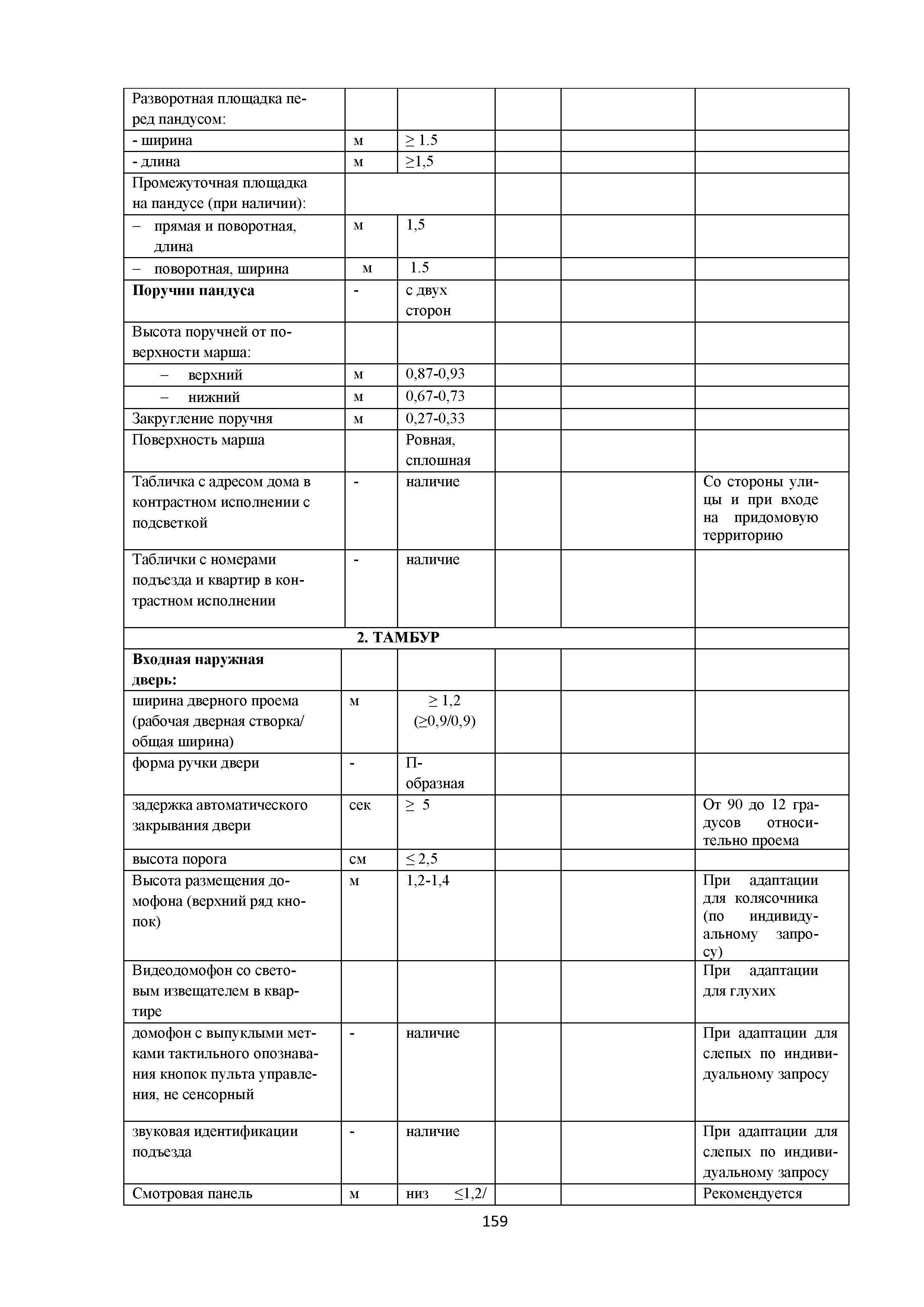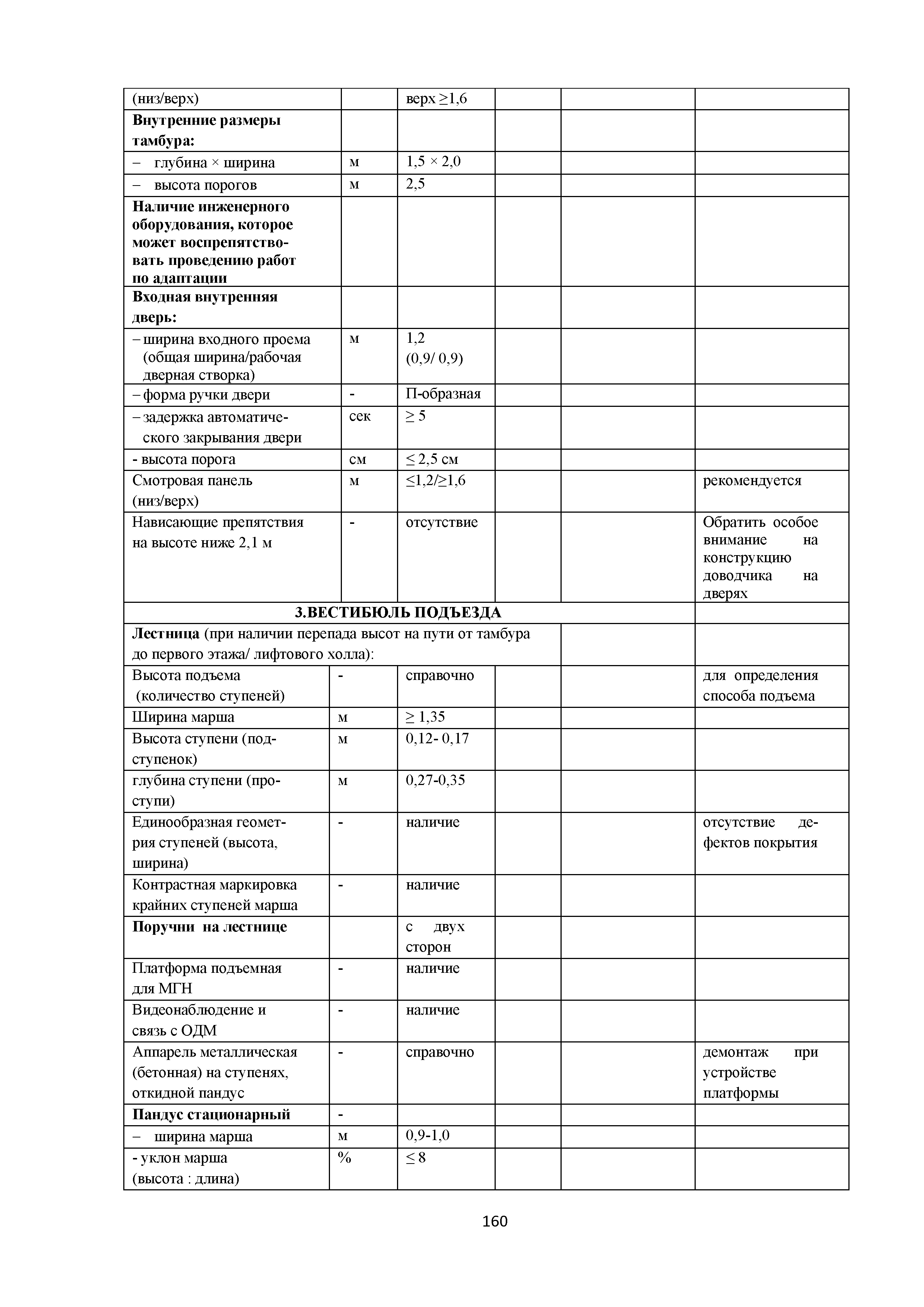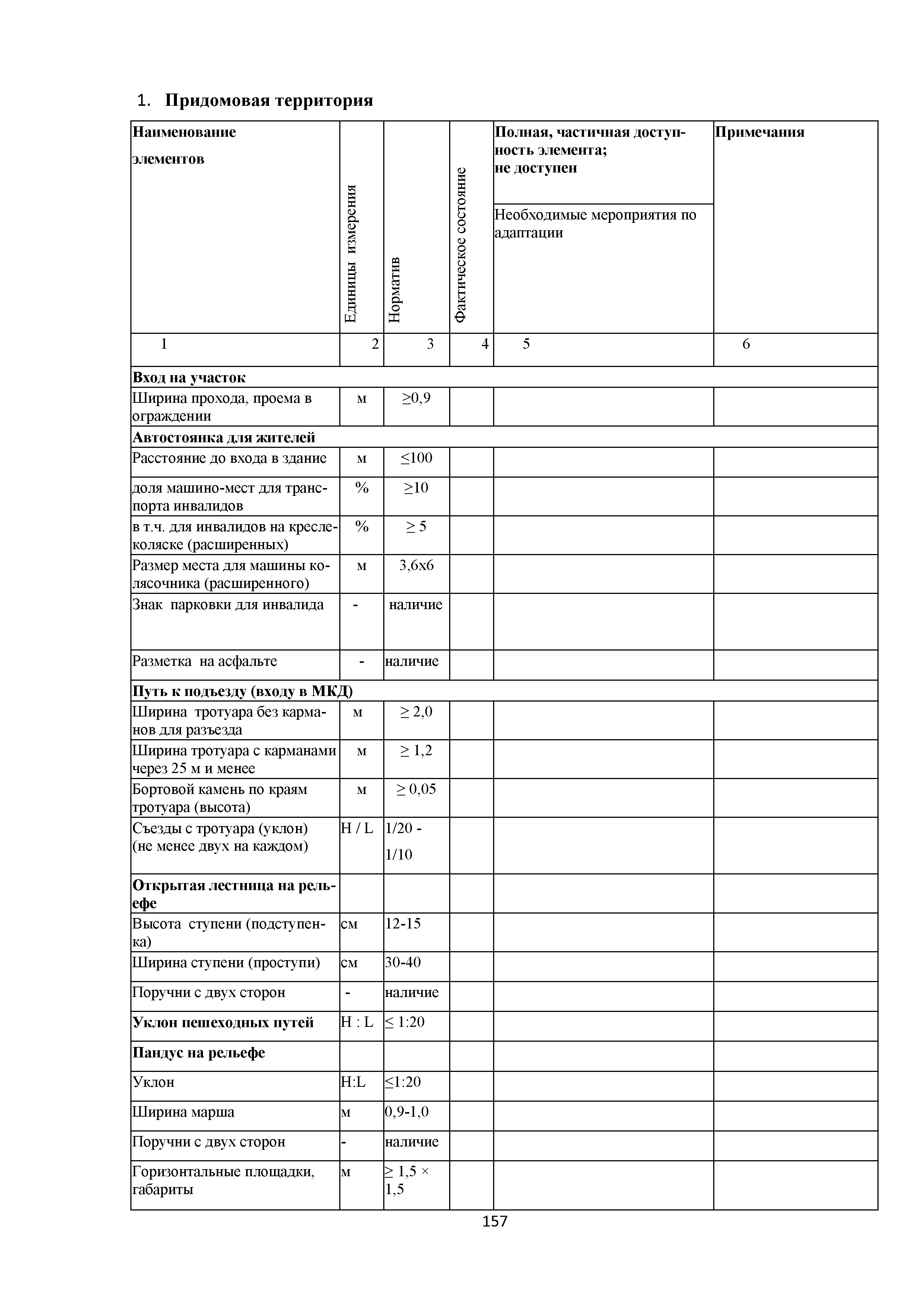 Методическое пособие. Приспособление, реконструкция, капитальный ремонт жилых многоквартирных зданий с обеспечением их доступности для маломобильных групп населения| Статус: | действует | | Название рус.: | Методическое пособие. Приспособление, реконструкция, капитальный ремонт жилых многоквартирных зданий с обеспечением их доступности для маломобильных групп населения | | Дата добавления в базу: | 01.01.2019 | | Дата актуализации: | 01.01.2021 | | Область применения: | Методические рекомендации предназначены для специалистов и руководителей проектно-изыскательских и строительных организаций, учреждений и служб заказчика (инвестора) и других заинтересованных организаций, с целью обеспечения их организационно-методическими материалами, которые позволяют разрабатывать и применять высокоэффективные технологические процессы проектирования зданий, обеспечивающие качество и конкурентоспособность этих объектов | | Оглавление: | Введение 1. Область применения 2. Нормативные ссылки 3. Термины и определения 4. Общие положения 5. Придомовая территория 6. Помещения и их элементы 6.1. Крыльцо. Лестницы и пандусы 6.2. Вестибюльно-входная группа 6.3. Внеквартирные помещения в жилом здании 6.4. Вертикальные коммуникации в жилом здании 6.5. Квартиры 6.6. Тактильные и цветовые решения в квартирах и внеквартирных коммуникациях 6.7. Технические элементы в квартирах Приложение А. Анкета обследования жилого помещения инвалида и общего имущества в многоквартирном доме, в котором проживает инвалид, в целях их приспособления с учетом потребностей инвалида и обеспечения условий их доступности для инвалида Приложение Б. Планировки квартир для инвалидов на 1-м этаже Библиография | | Разработан: | ООО Институт общественных зданий ФАУ Федеральный центр нормирования, стандартизации и оценки соответствия в строительстве СК ДТСЗН города Москвы