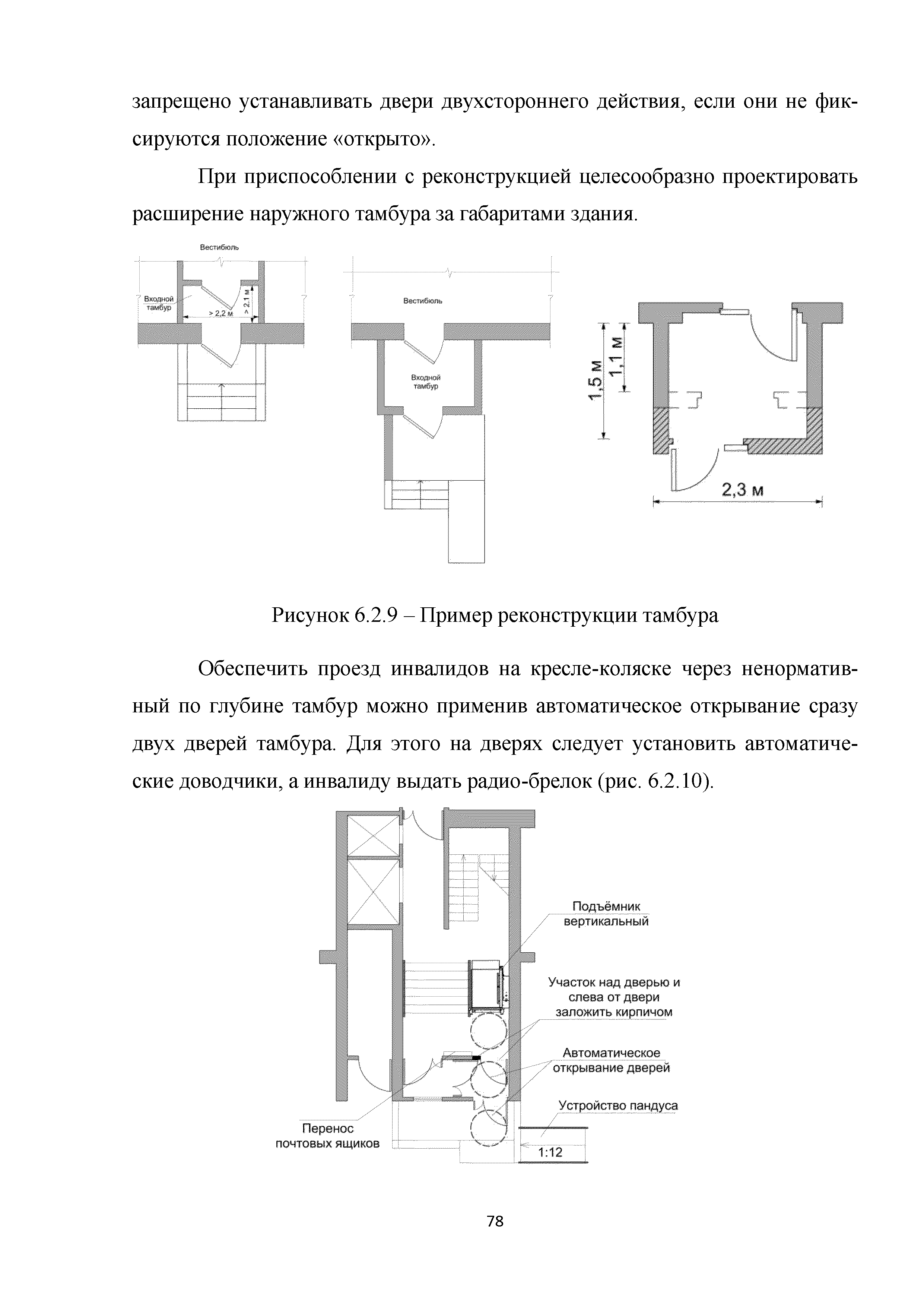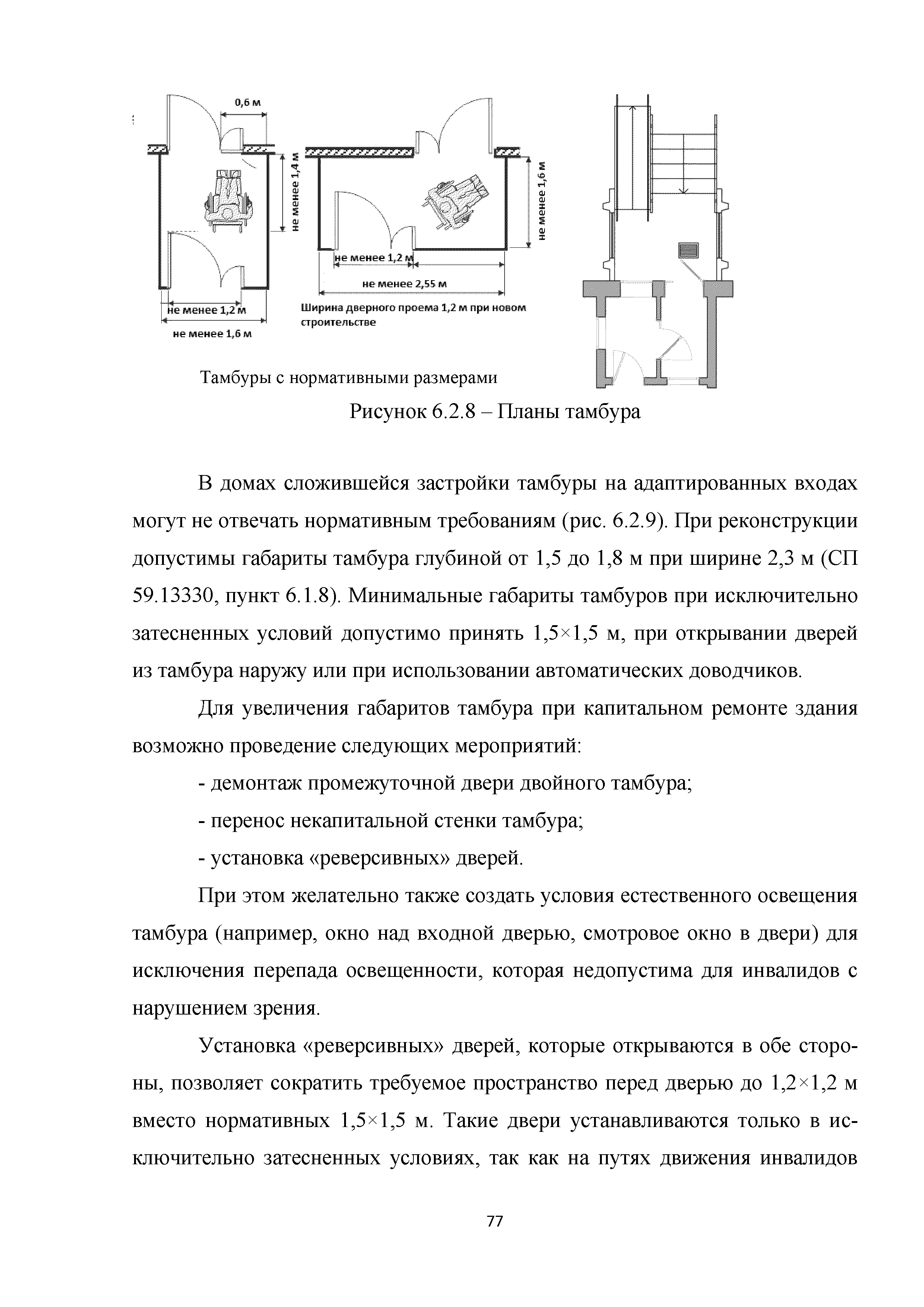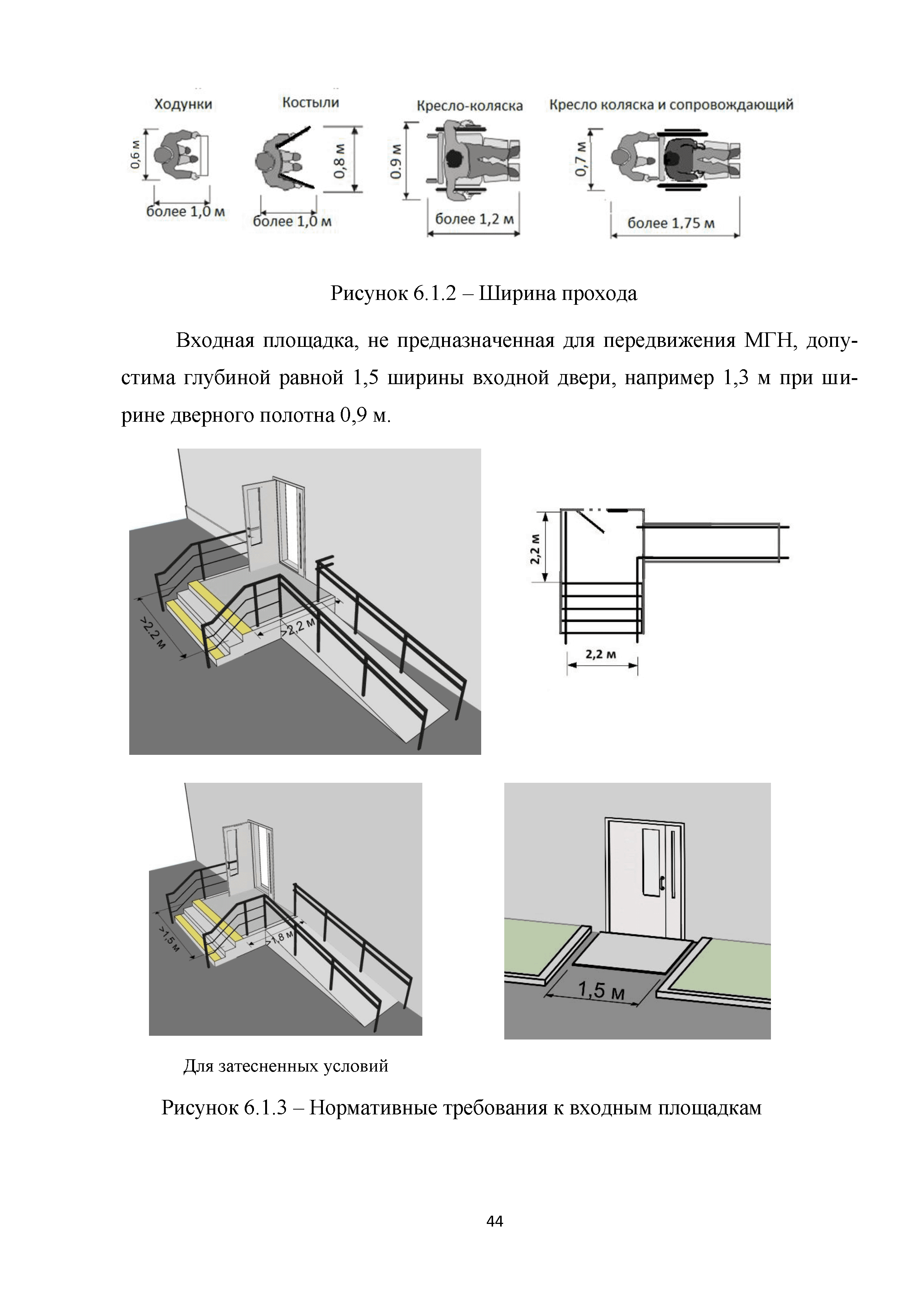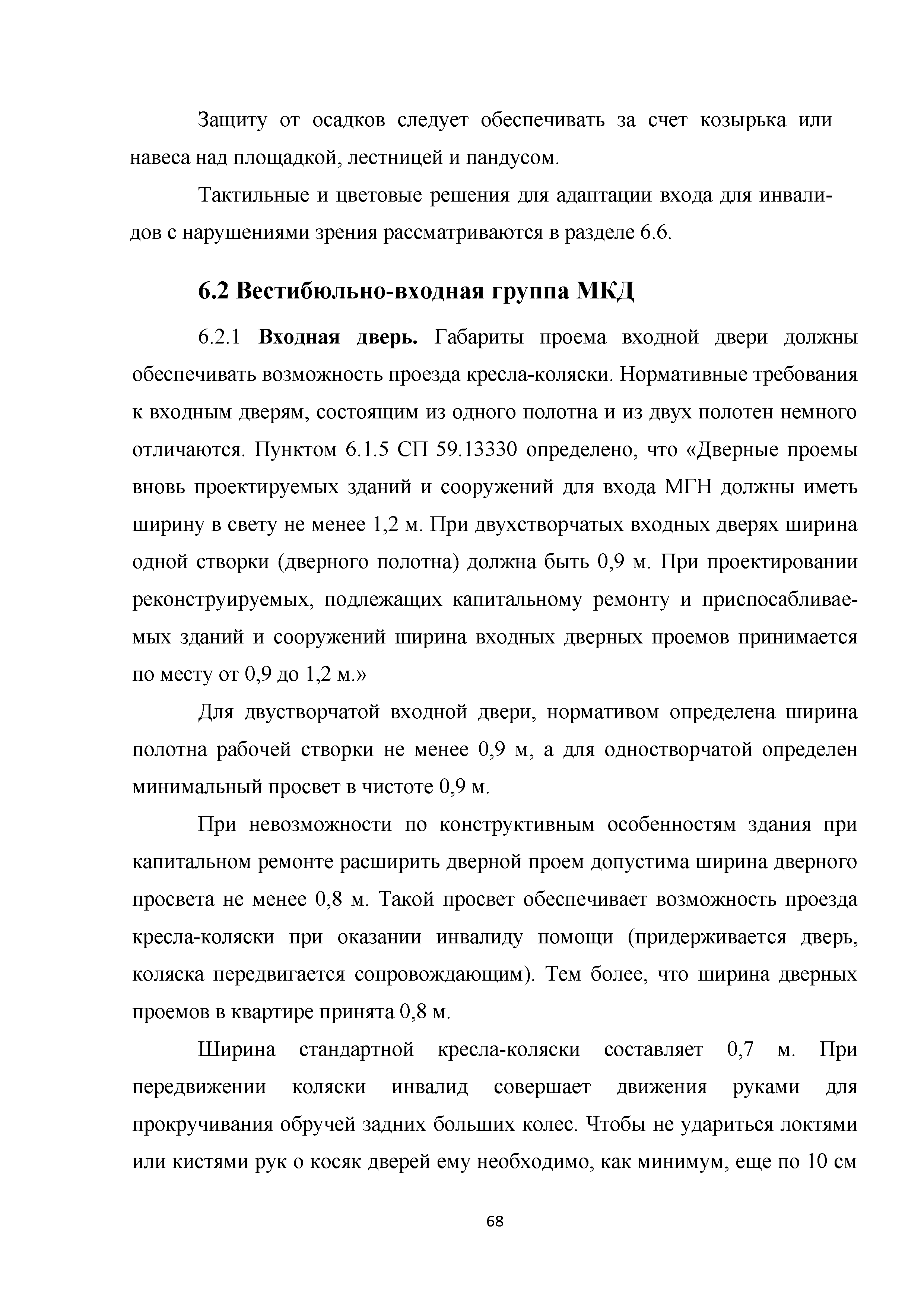 Методическое пособие. Приспособление, реконструкция, капитальный ремонт жилых многоквартирных зданий с обеспечением их доступности для маломобильных групп населения| Статус: | действует | | Название рус.: | Методическое пособие. Приспособление, реконструкция, капитальный ремонт жилых многоквартирных зданий с обеспечением их доступности для маломобильных групп населения | | Дата добавления в базу: | 01.01.2019 | | Дата актуализации: | 01.01.2021 | | Область применения: | Методические рекомендации предназначены для специалистов и руководителей проектно-изыскательских и строительных организаций, учреждений и служб заказчика (инвестора) и других заинтересованных организаций, с целью обеспечения их организационно-методическими материалами, которые позволяют разрабатывать и применять высокоэффективные технологические процессы проектирования зданий, обеспечивающие качество и конкурентоспособность этих объектов | | Оглавление: | Введение 1. Область применения 2. Нормативные ссылки 3. Термины и определения 4. Общие положения 5. Придомовая территория 6. Помещения и их элементы 6.1. Крыльцо. Лестницы и пандусы 6.2. Вестибюльно-входная группа 6.3. Внеквартирные помещения в жилом здании 6.4. Вертикальные коммуникации в жилом здании 6.5. Квартиры 6.6. Тактильные и цветовые решения в квартирах и внеквартирных коммуникациях 6.7. Технические элементы в квартирах Приложение А. Анкета обследования жилого помещения инвалида и общего имущества в многоквартирном доме, в котором проживает инвалид, в целях их приспособления с учетом потребностей инвалида и обеспечения условий их доступности для инвалида Приложение Б. Планировки квартир для инвалидов на 1-м этаже Библиография | | Разработан: | ООО Институт общественных зданий ФАУ Федеральный центр нормирования, стандартизации и оценки соответствия в строительстве СК ДТСЗН города Москвы