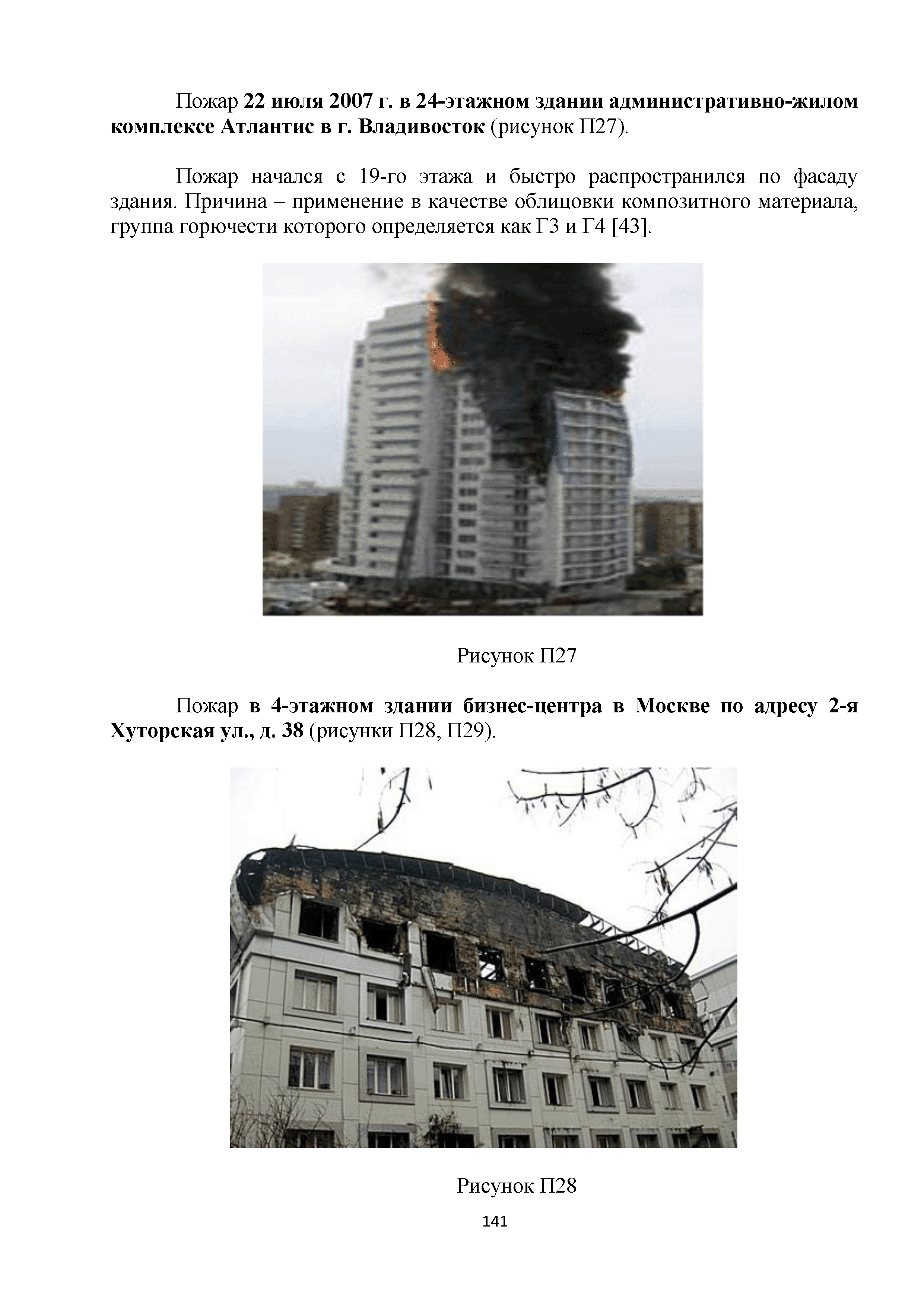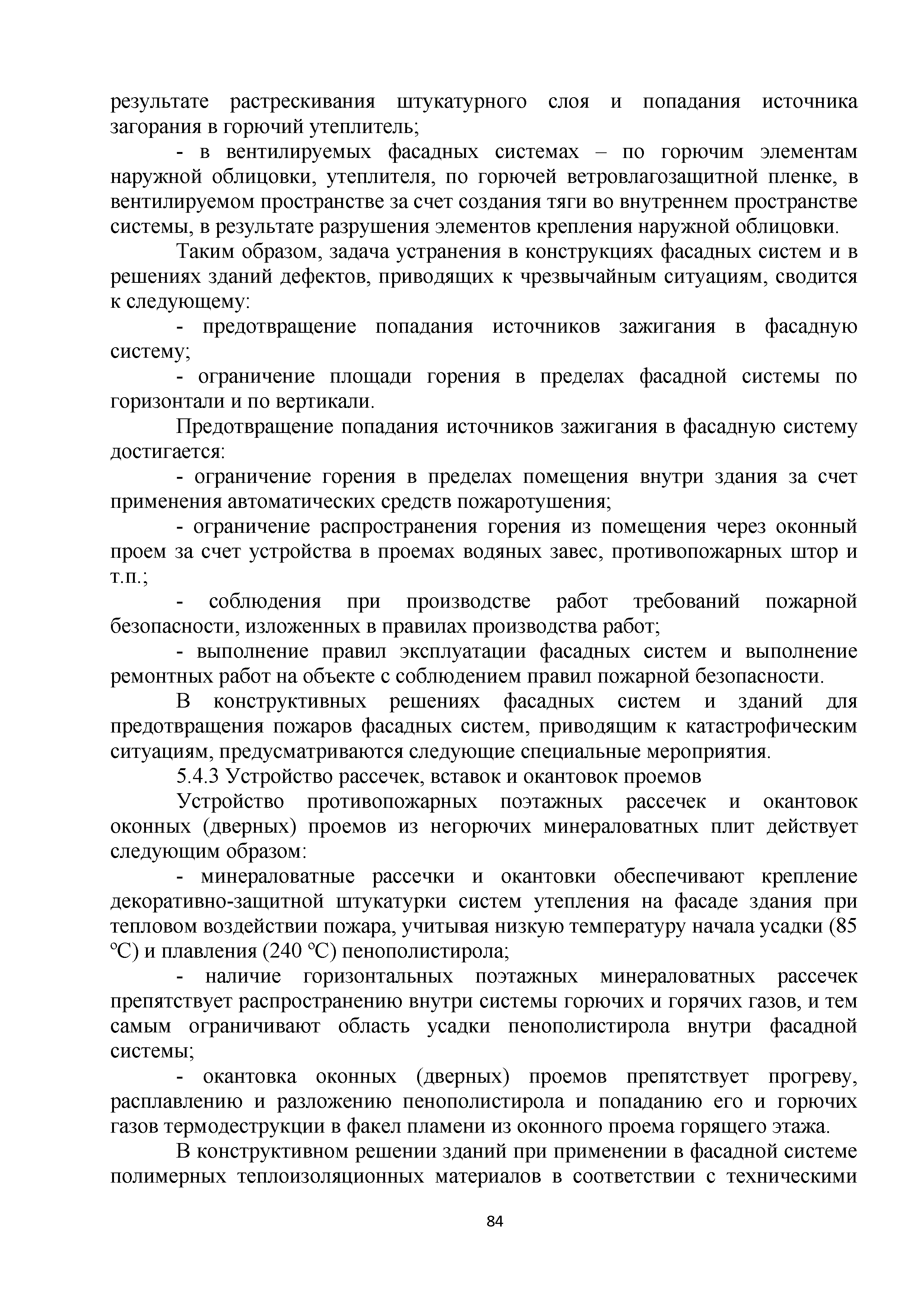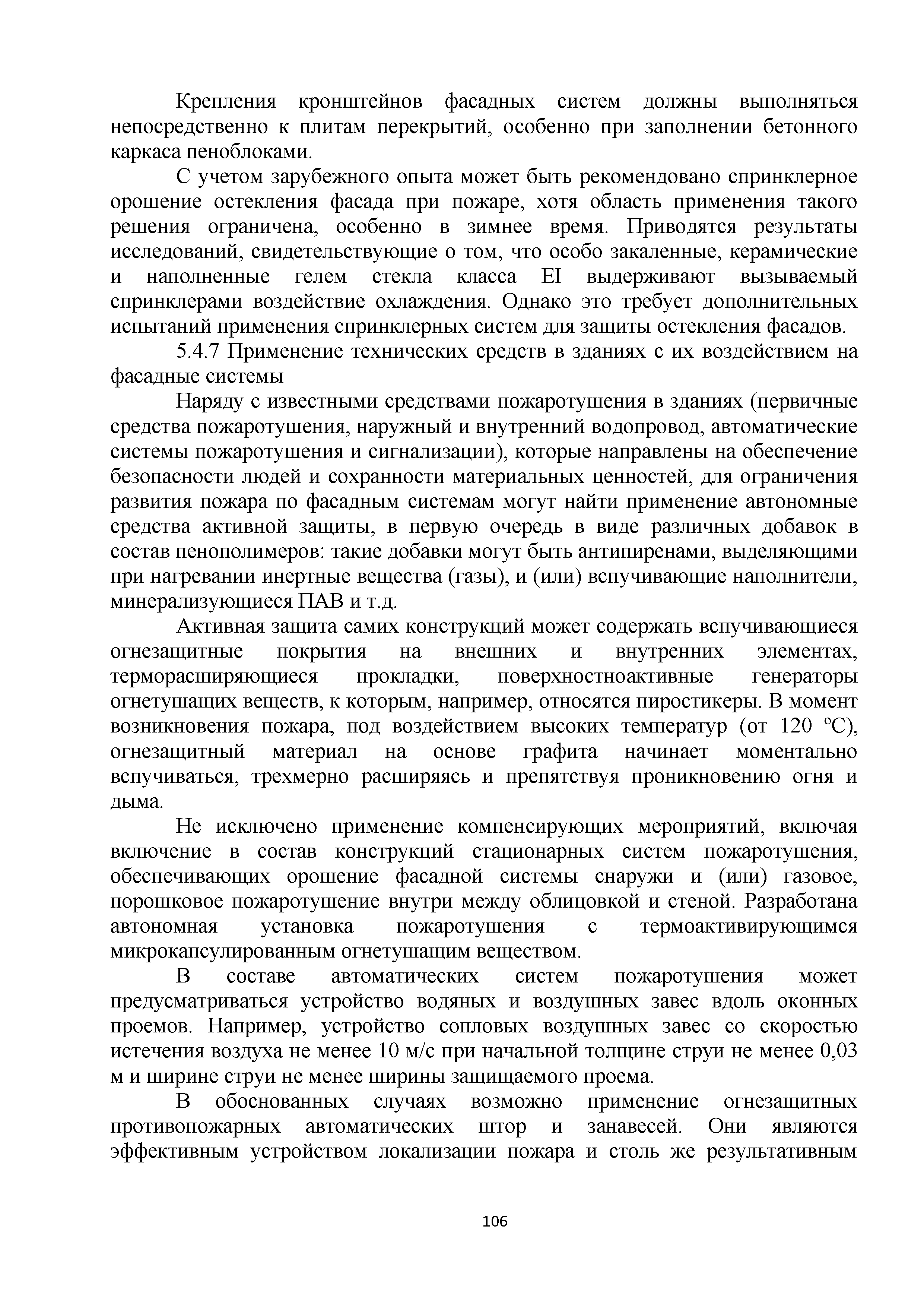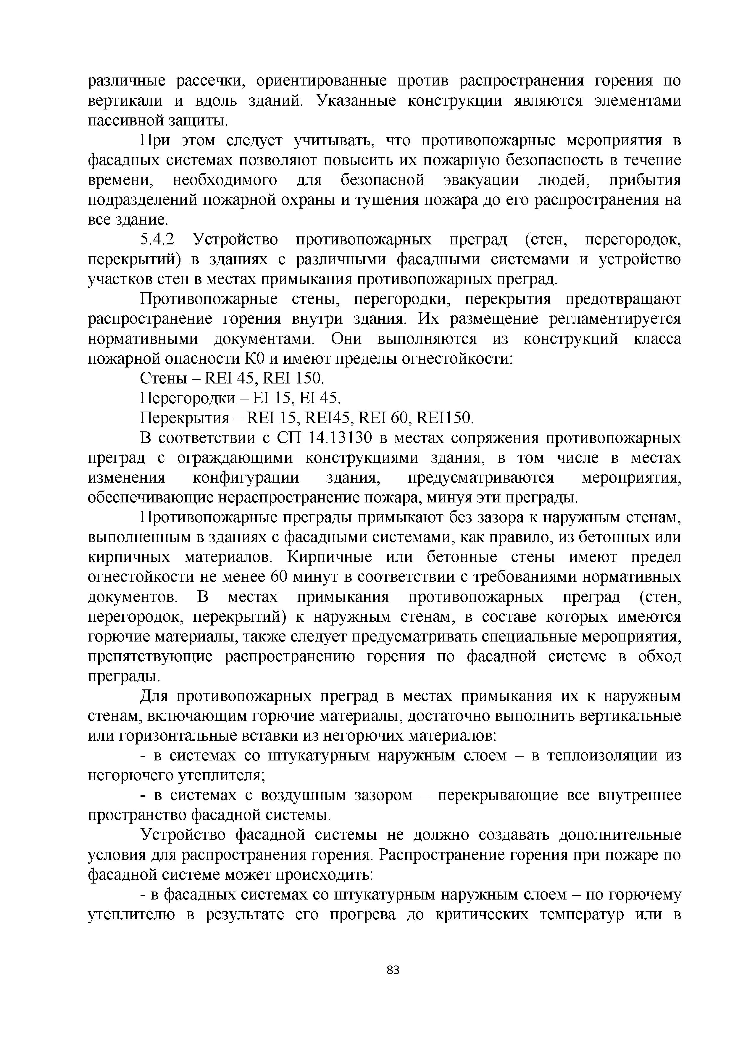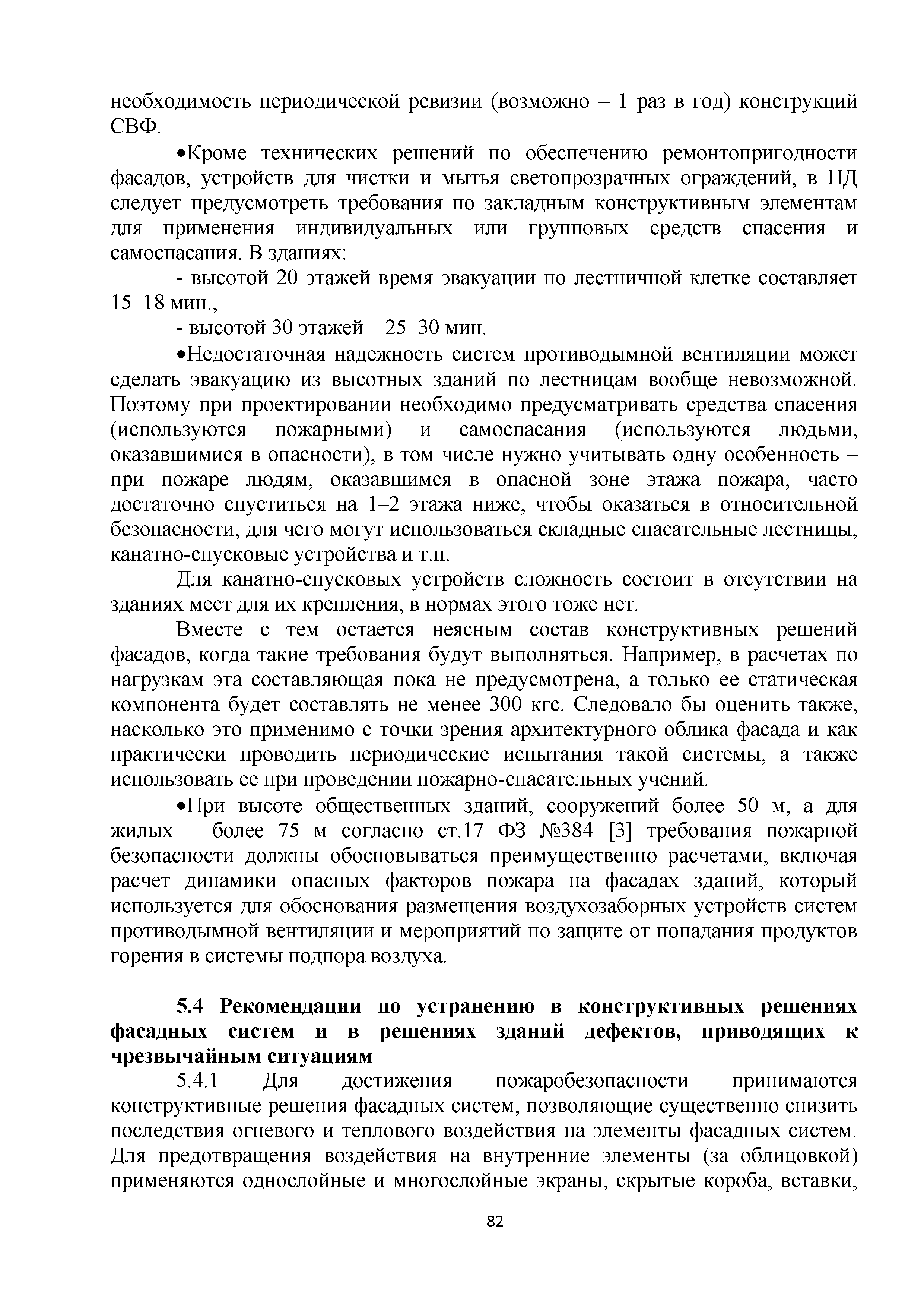 | Оглавление: | Введение 1. Область применения 2. Нормативные ссылки 3. Термины и определения 4. Область применения фасадных систем в зданиях с различными объемно-планировочными и конструктивными решениями фасадных систем с различными материалами и конструктивными решениями с учетом предложений по снижению пожарной опасности 4.1. Оценка пожарной опасности строительных объектов 4.2. Факторы, определяющие поведение фасадных систем при различных объемно-планировочных и конструктивных решениях 4.3. Предложения по области применения фасадных систем 4.4. Требованиями к фасадным системам, направленные на выполнение условий безопасности в соответствии с Федеральными законами № 384-ФЗ и № 123-ФЗ 5. Решения фасадных систем, отвечающих требованиям безопасности в соответствии с Федеральными законами № 384-ФЗ и № 123-ФЗ 5.1. Системы фасадные теплоизоляционные с наружными защитно-декоративными штукатурными слоями (СФТК) и композитными облицовками 5.2. Системы фасадные навесные с воздушным зазором 5.3. Остекление в фасадных системах 5.4. Рекомендации по устранению в конструктивных решениях фасадных систем и в решениях зданий дефектов, приводящих к чрезвычайным ситуациям 5.5. Требования к выполнению монтажных работ 5.6. Требования при эксплуатации зданий Приложение. Примеры пожаров в зданиях с облицовкой наружных стен фасадными системами Библиография |