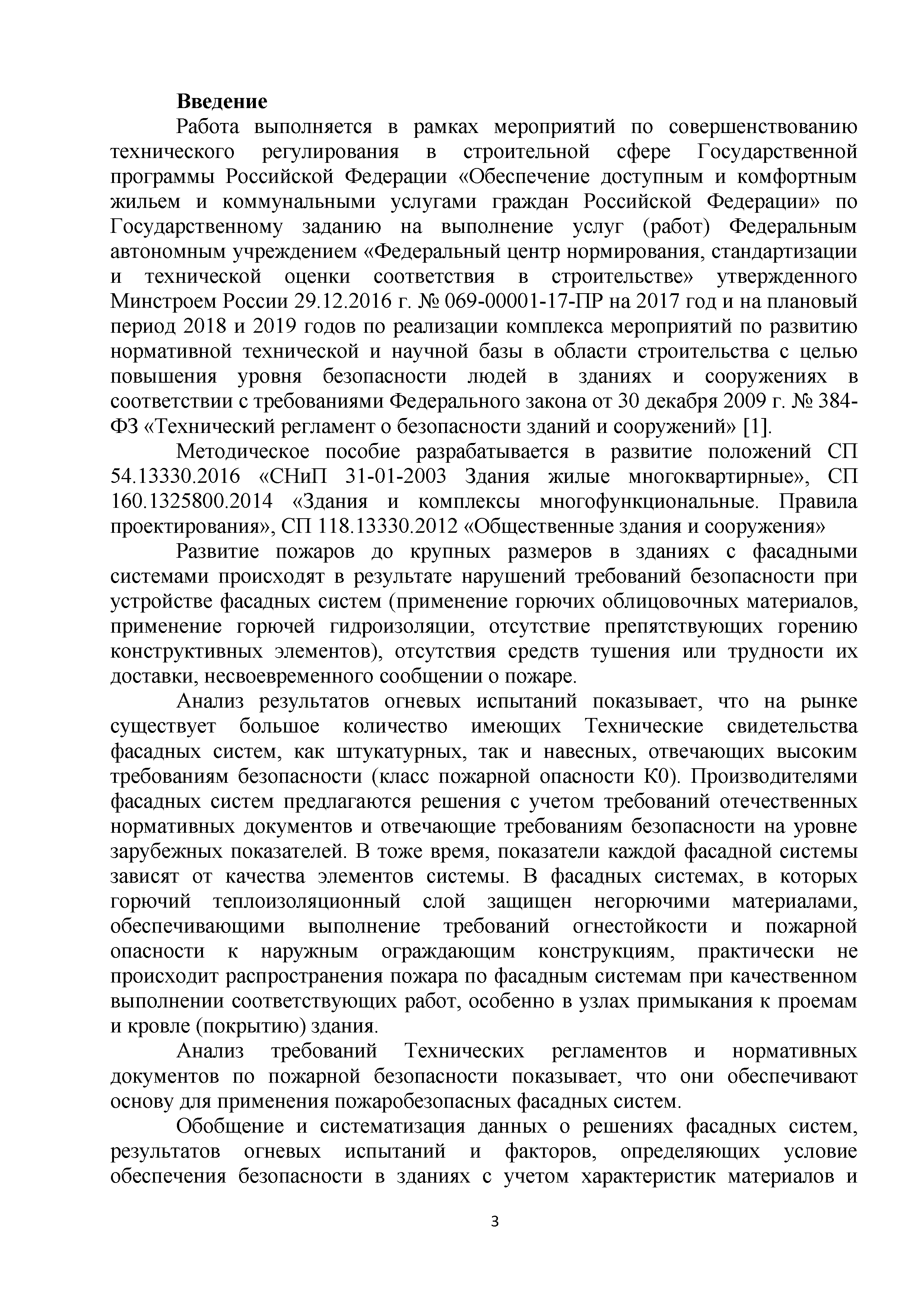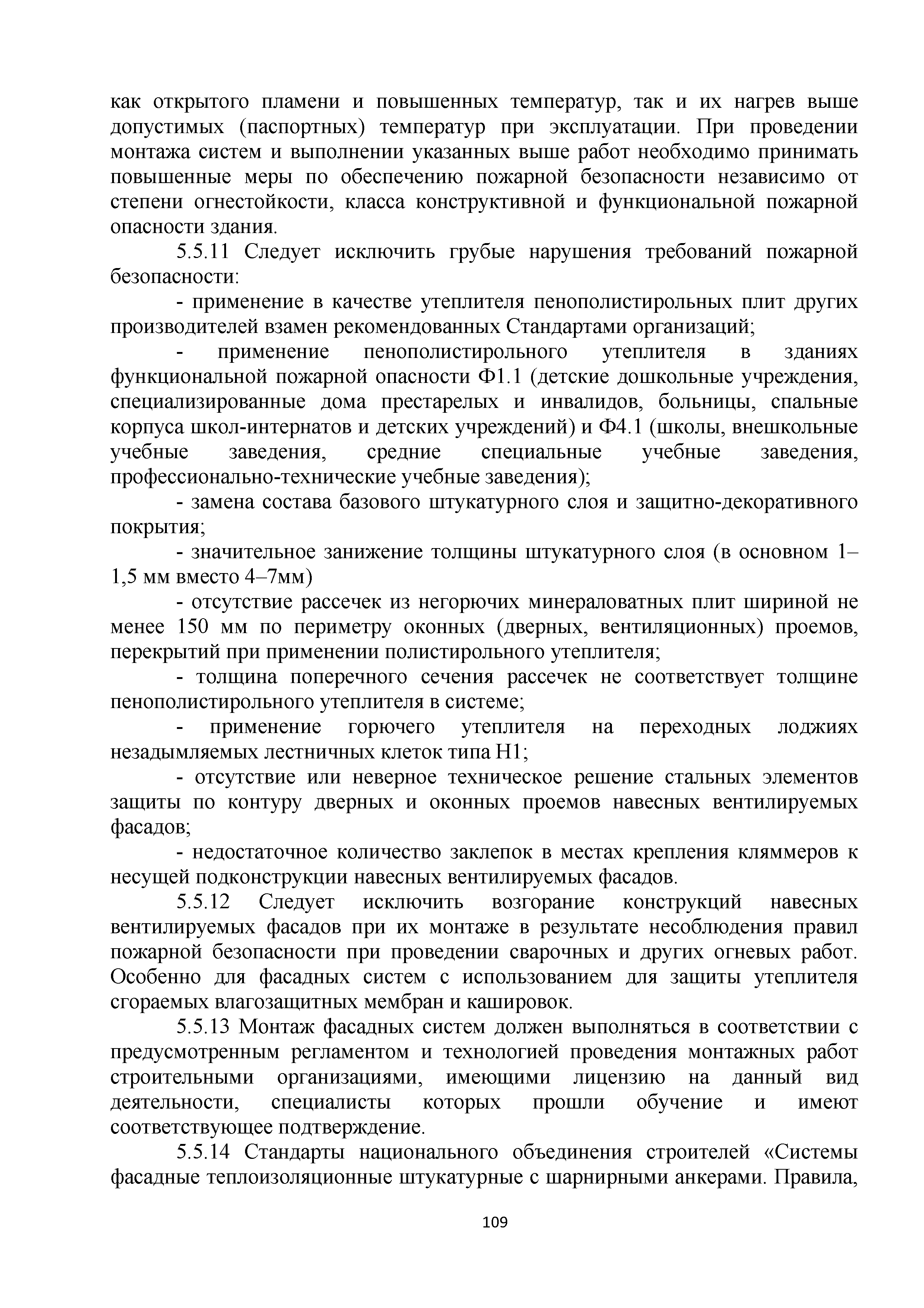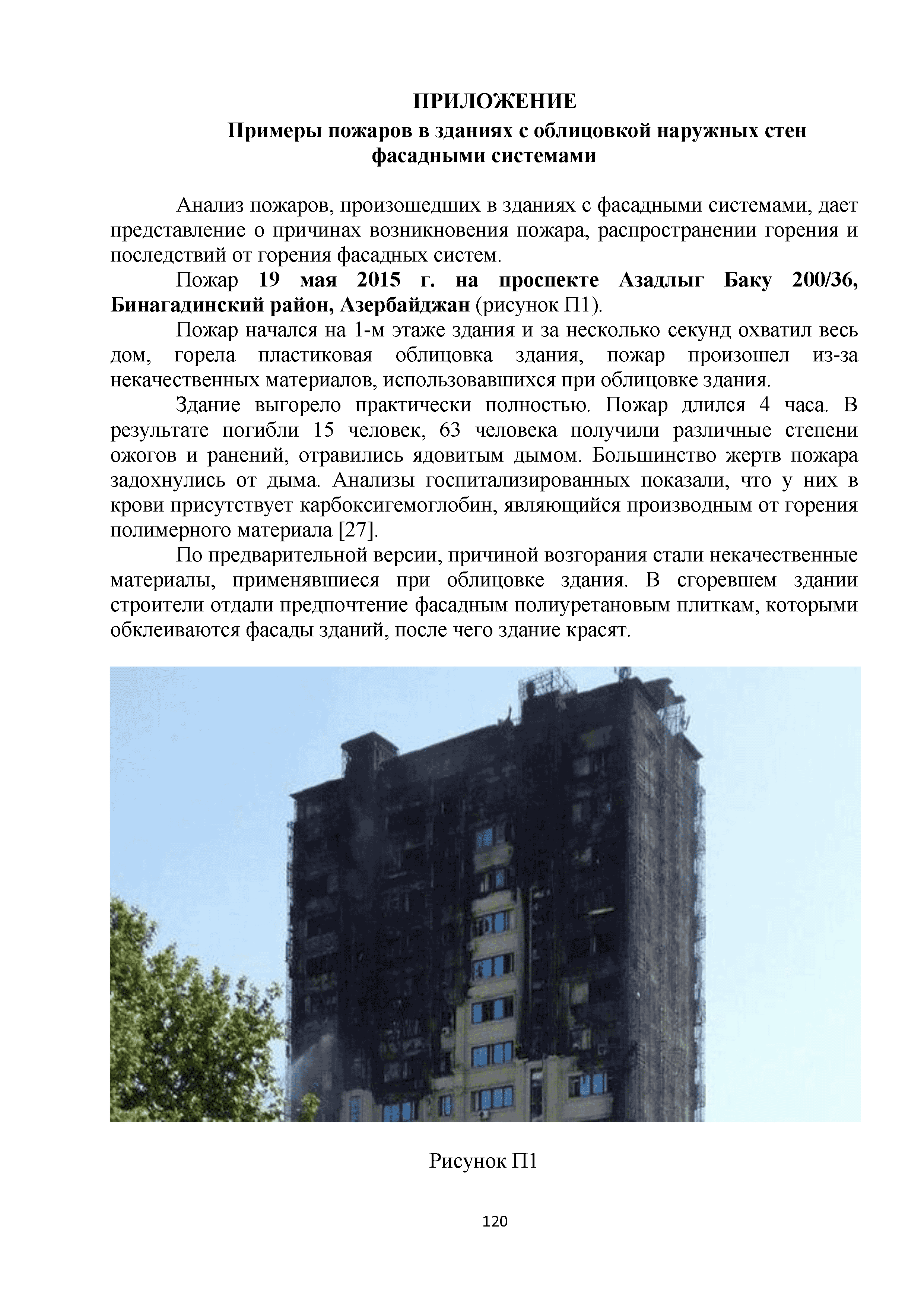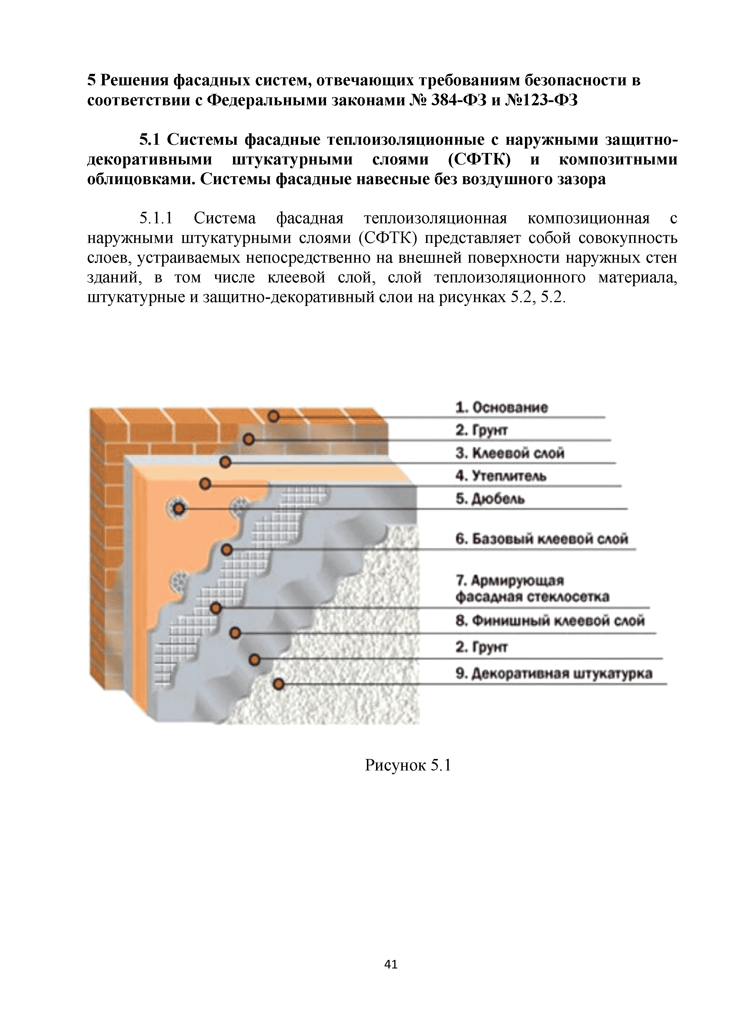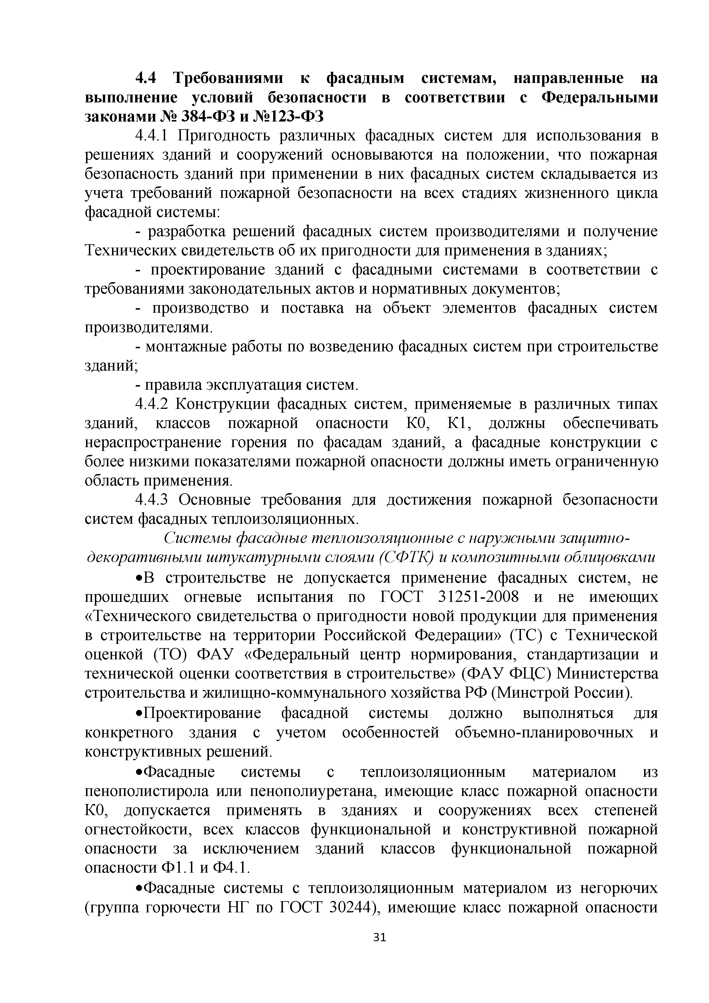 | Оглавление: | Введение 1. Область применения 2. Нормативные ссылки 3. Термины и определения 4. Область применения фасадных систем в зданиях с различными объемно-планировочными и конструктивными решениями фасадных систем с различными материалами и конструктивными решениями с учетом предложений по снижению пожарной опасности 4.1. Оценка пожарной опасности строительных объектов 4.2. Факторы, определяющие поведение фасадных систем при различных объемно-планировочных и конструктивных решениях 4.3. Предложения по области применения фасадных систем 4.4. Требованиями к фасадным системам, направленные на выполнение условий безопасности в соответствии с Федеральными законами № 384-ФЗ и № 123-ФЗ 5. Решения фасадных систем, отвечающих требованиям безопасности в соответствии с Федеральными законами № 384-ФЗ и № 123-ФЗ 5.1. Системы фасадные теплоизоляционные с наружными защитно-декоративными штукатурными слоями (СФТК) и композитными облицовками 5.2. Системы фасадные навесные с воздушным зазором 5.3. Остекление в фасадных системах 5.4. Рекомендации по устранению в конструктивных решениях фасадных систем и в решениях зданий дефектов, приводящих к чрезвычайным ситуациям 5.5. Требования к выполнению монтажных работ 5.6. Требования при эксплуатации зданий Приложение. Примеры пожаров в зданиях с облицовкой наружных стен фасадными системами Библиография |