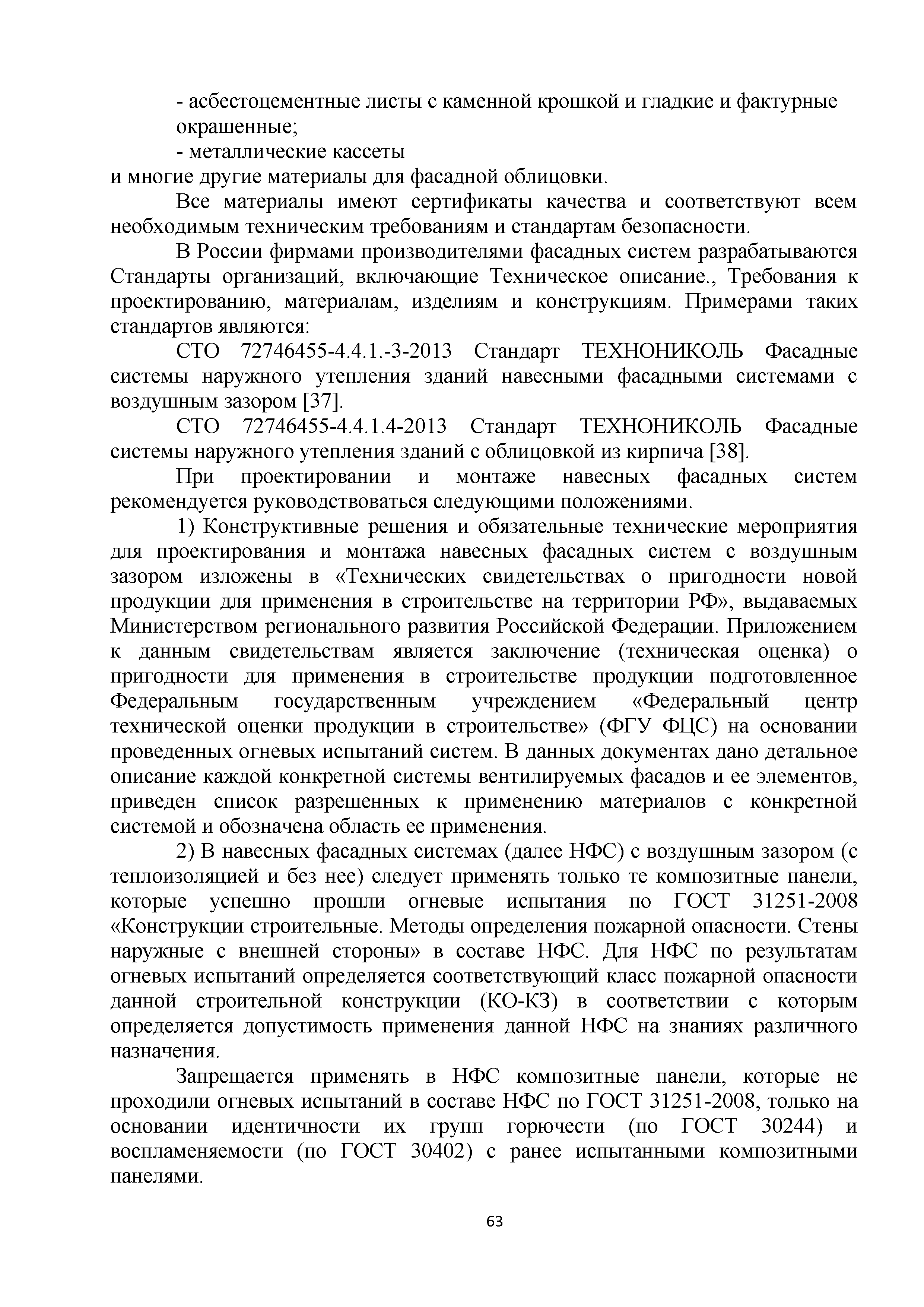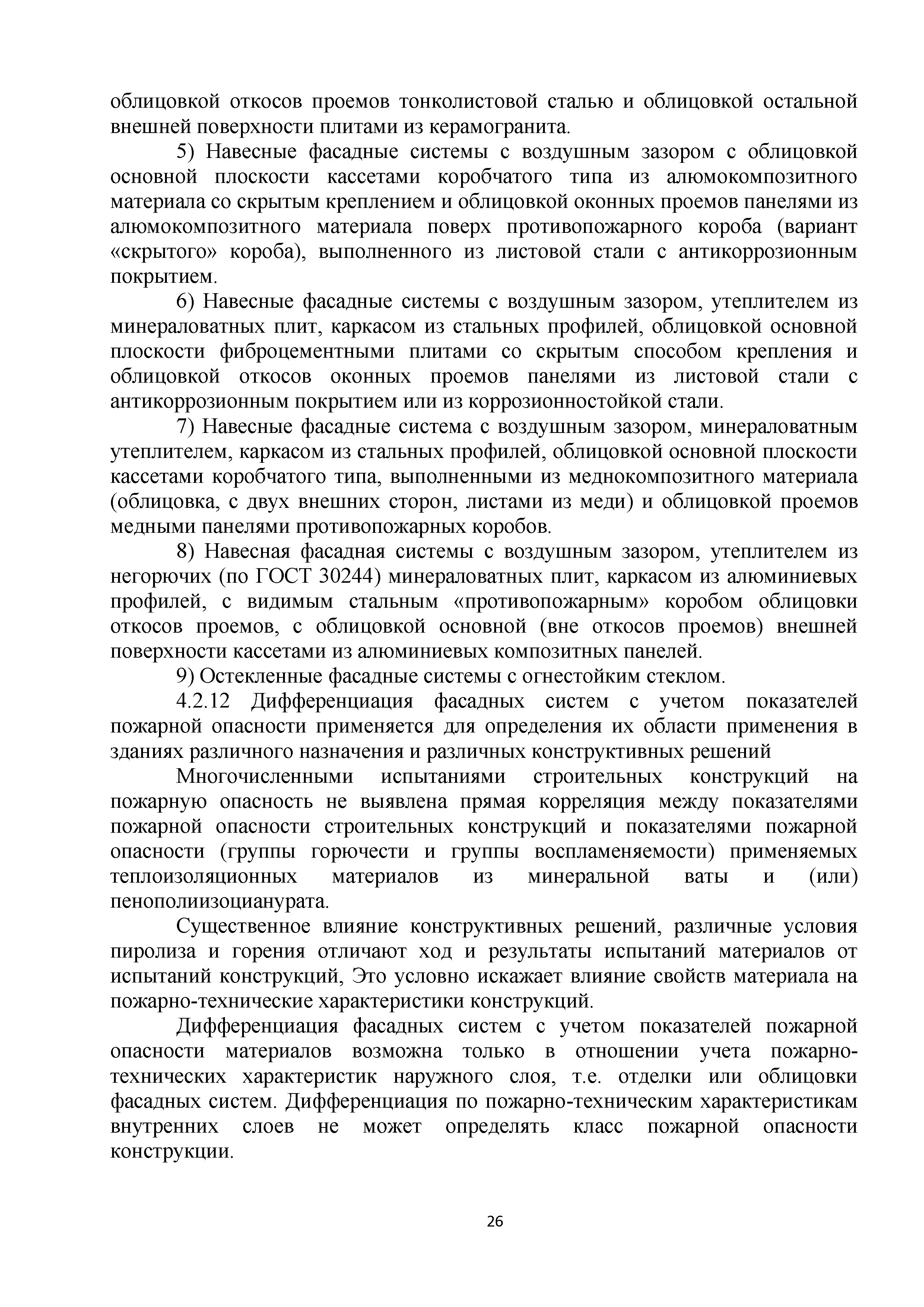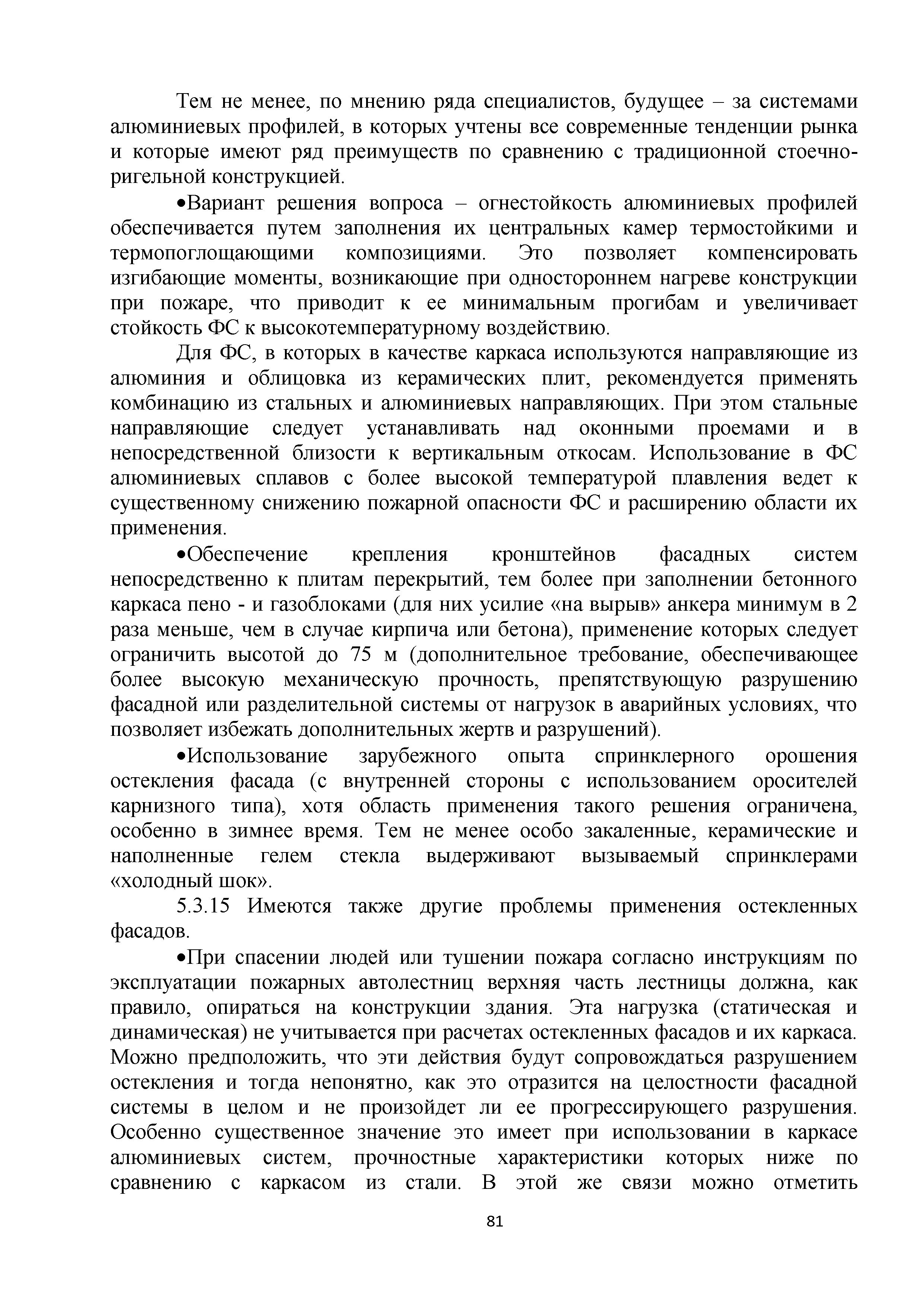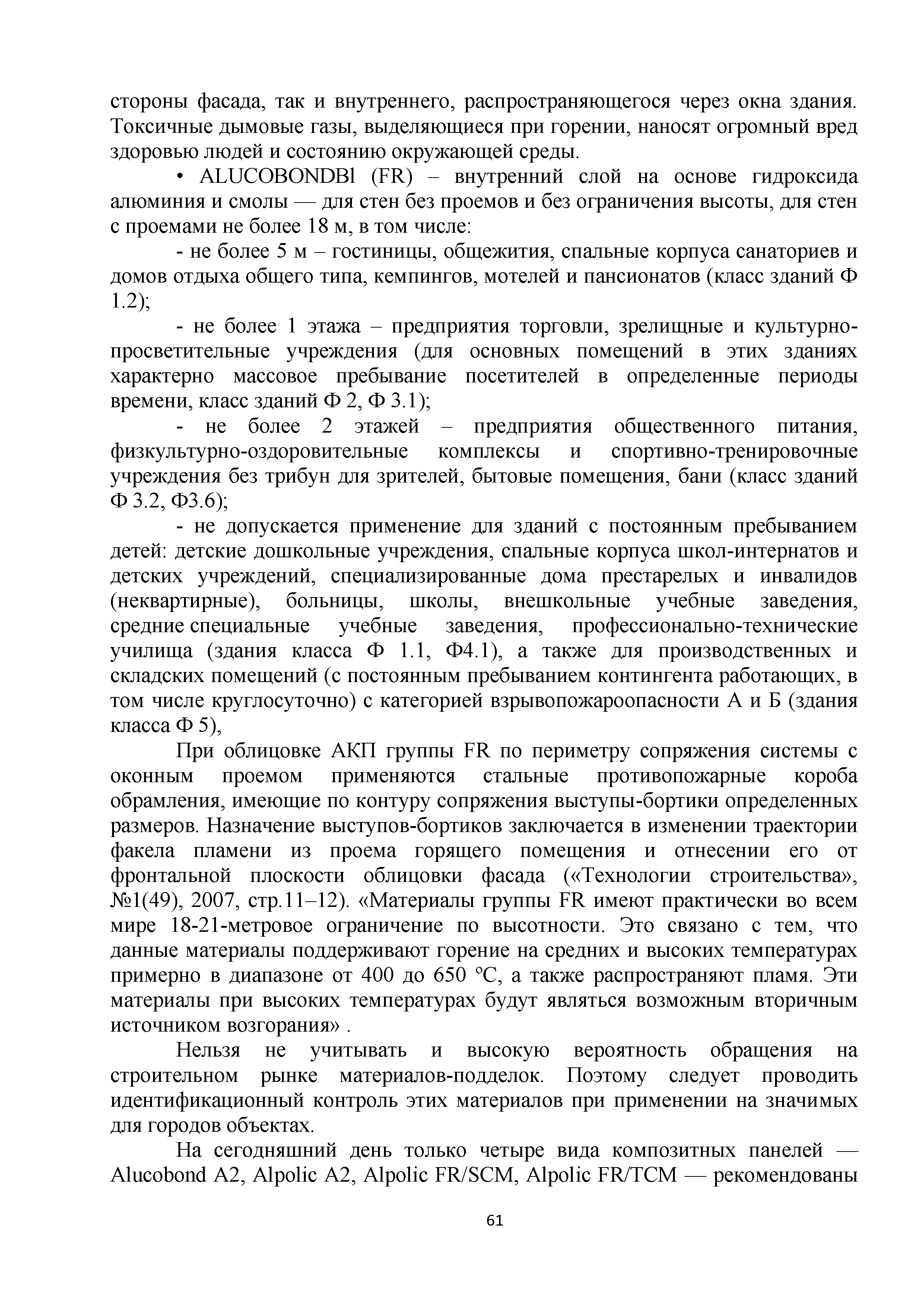 | Оглавление: | Введение 1. Область применения 2. Нормативные ссылки 3. Термины и определения 4. Область применения фасадных систем в зданиях с различными объемно-планировочными и конструктивными решениями фасадных систем с различными материалами и конструктивными решениями с учетом предложений по снижению пожарной опасности 4.1. Оценка пожарной опасности строительных объектов 4.2. Факторы, определяющие поведение фасадных систем при различных объемно-планировочных и конструктивных решениях 4.3. Предложения по области применения фасадных систем 4.4. Требованиями к фасадным системам, направленные на выполнение условий безопасности в соответствии с Федеральными законами № 384-ФЗ и № 123-ФЗ 5. Решения фасадных систем, отвечающих требованиям безопасности в соответствии с Федеральными законами № 384-ФЗ и № 123-ФЗ 5.1. Системы фасадные теплоизоляционные с наружными защитно-декоративными штукатурными слоями (СФТК) и композитными облицовками 5.2. Системы фасадные навесные с воздушным зазором 5.3. Остекление в фасадных системах 5.4. Рекомендации по устранению в конструктивных решениях фасадных систем и в решениях зданий дефектов, приводящих к чрезвычайным ситуациям 5.5. Требования к выполнению монтажных работ 5.6. Требования при эксплуатации зданий Приложение. Примеры пожаров в зданиях с облицовкой наружных стен фасадными системами Библиография |