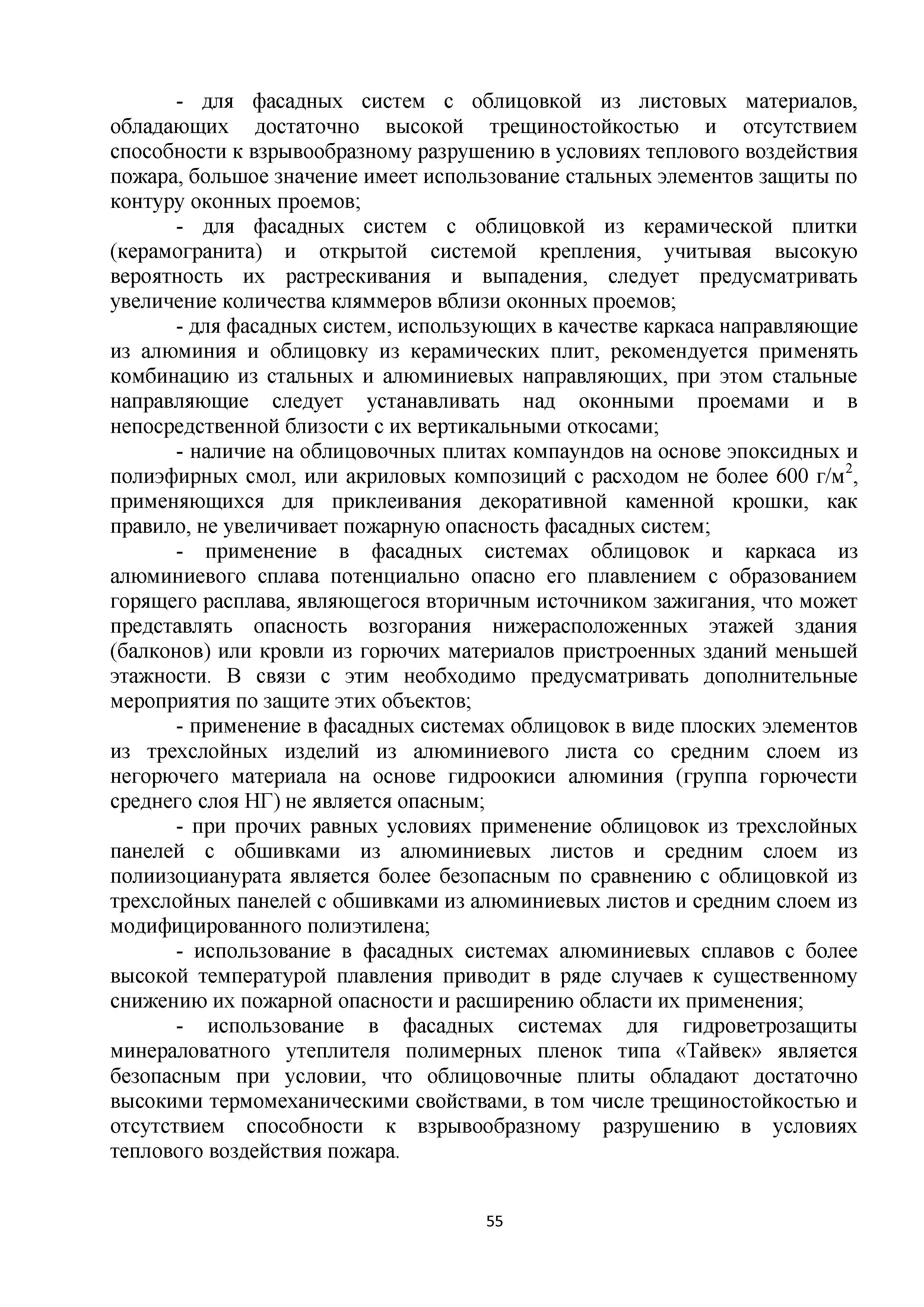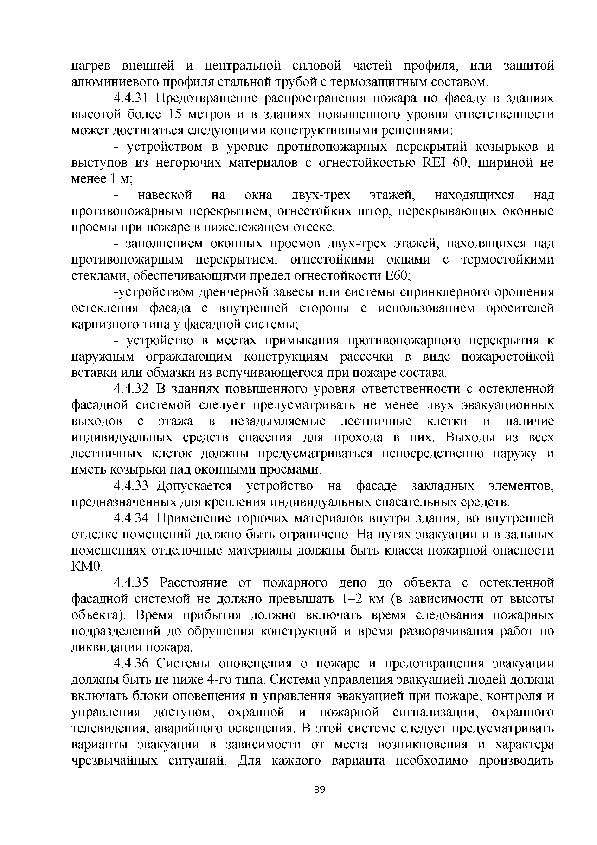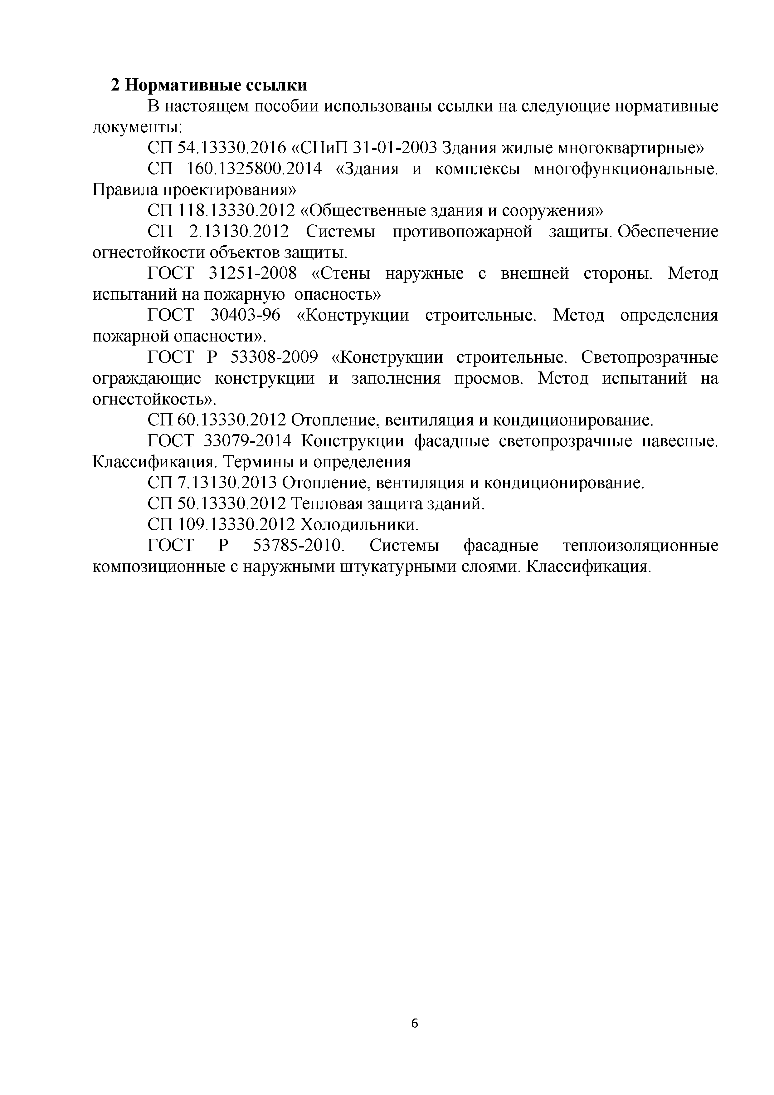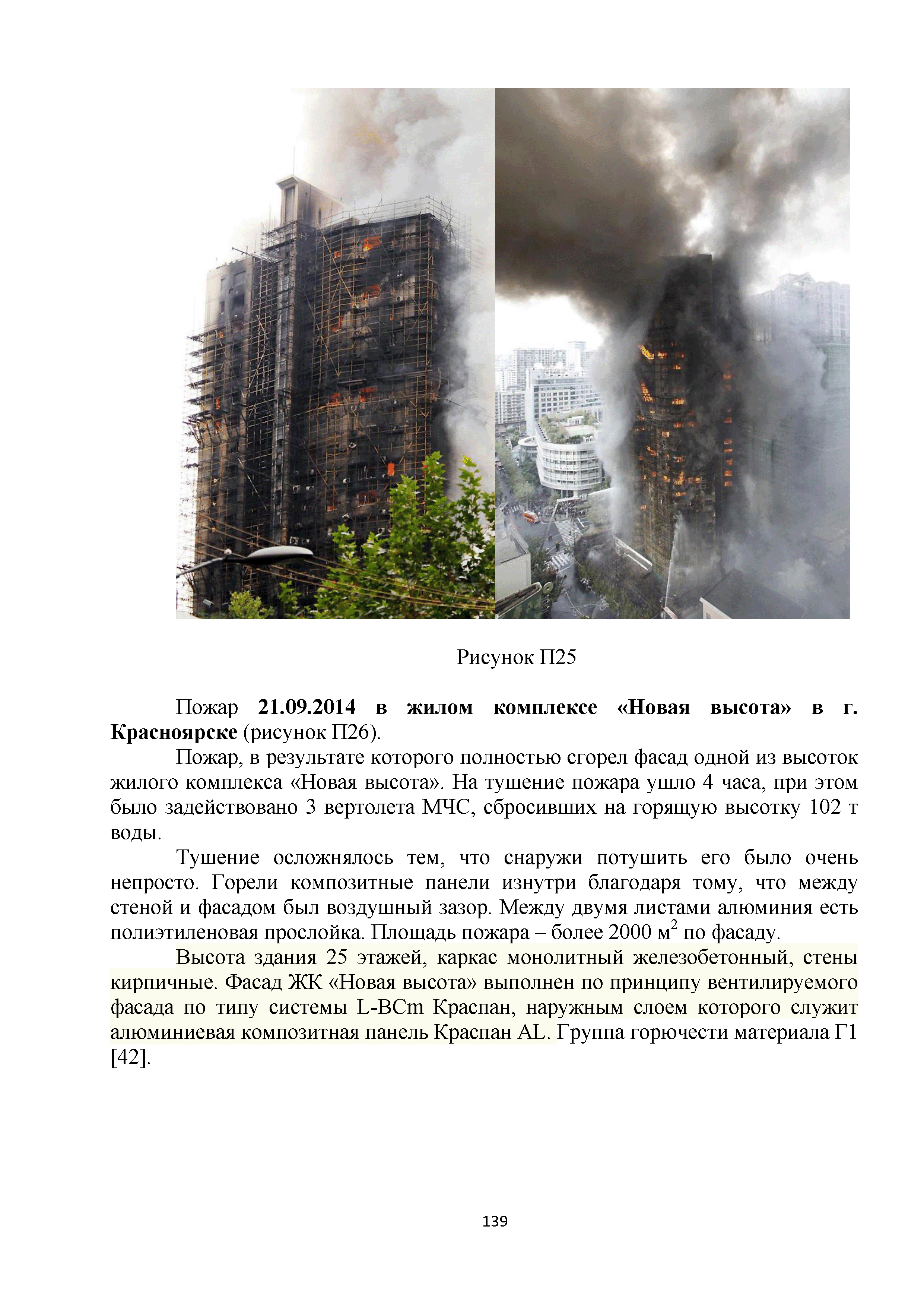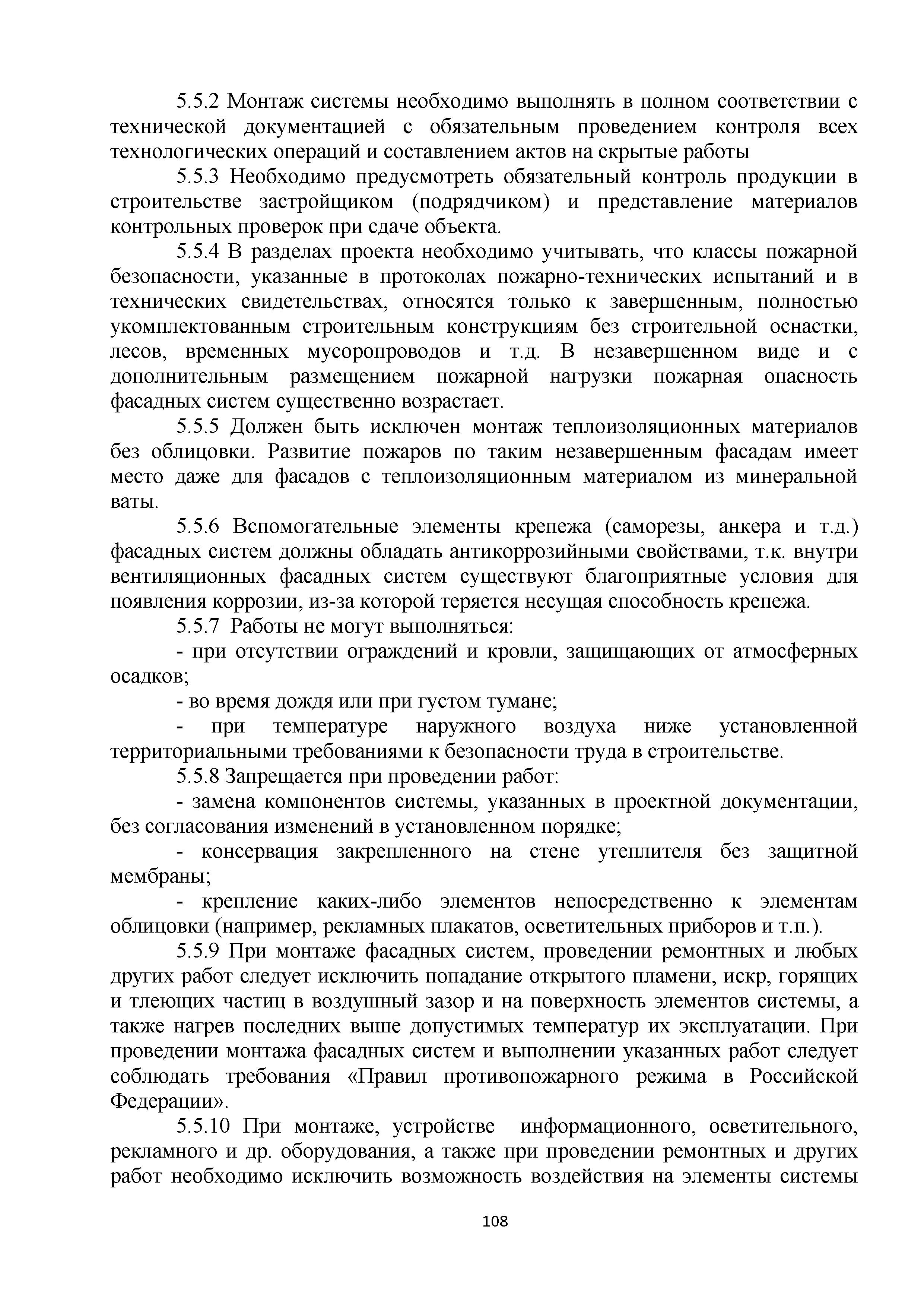 | Оглавление: | Введение 1. Область применения 2. Нормативные ссылки 3. Термины и определения 4. Область применения фасадных систем в зданиях с различными объемно-планировочными и конструктивными решениями фасадных систем с различными материалами и конструктивными решениями с учетом предложений по снижению пожарной опасности 4.1. Оценка пожарной опасности строительных объектов 4.2. Факторы, определяющие поведение фасадных систем при различных объемно-планировочных и конструктивных решениях 4.3. Предложения по области применения фасадных систем 4.4. Требованиями к фасадным системам, направленные на выполнение условий безопасности в соответствии с Федеральными законами № 384-ФЗ и № 123-ФЗ 5. Решения фасадных систем, отвечающих требованиям безопасности в соответствии с Федеральными законами № 384-ФЗ и № 123-ФЗ 5.1. Системы фасадные теплоизоляционные с наружными защитно-декоративными штукатурными слоями (СФТК) и композитными облицовками 5.2. Системы фасадные навесные с воздушным зазором 5.3. Остекление в фасадных системах 5.4. Рекомендации по устранению в конструктивных решениях фасадных систем и в решениях зданий дефектов, приводящих к чрезвычайным ситуациям 5.5. Требования к выполнению монтажных работ 5.6. Требования при эксплуатации зданий Приложение. Примеры пожаров в зданиях с облицовкой наружных стен фасадными системами Библиография |