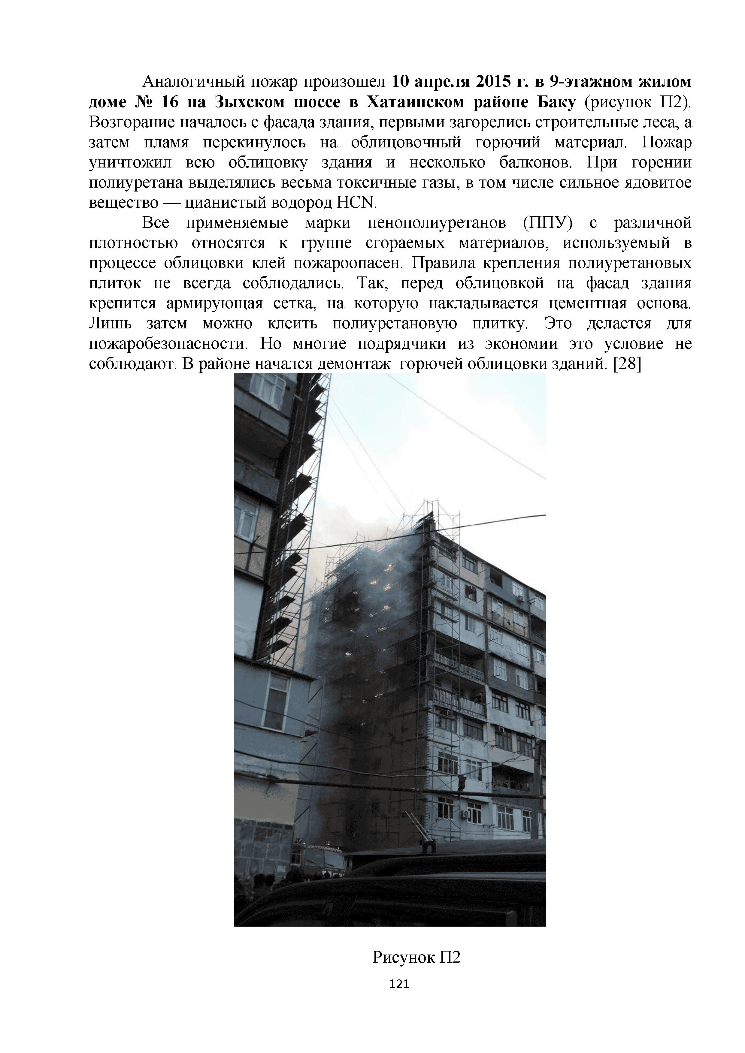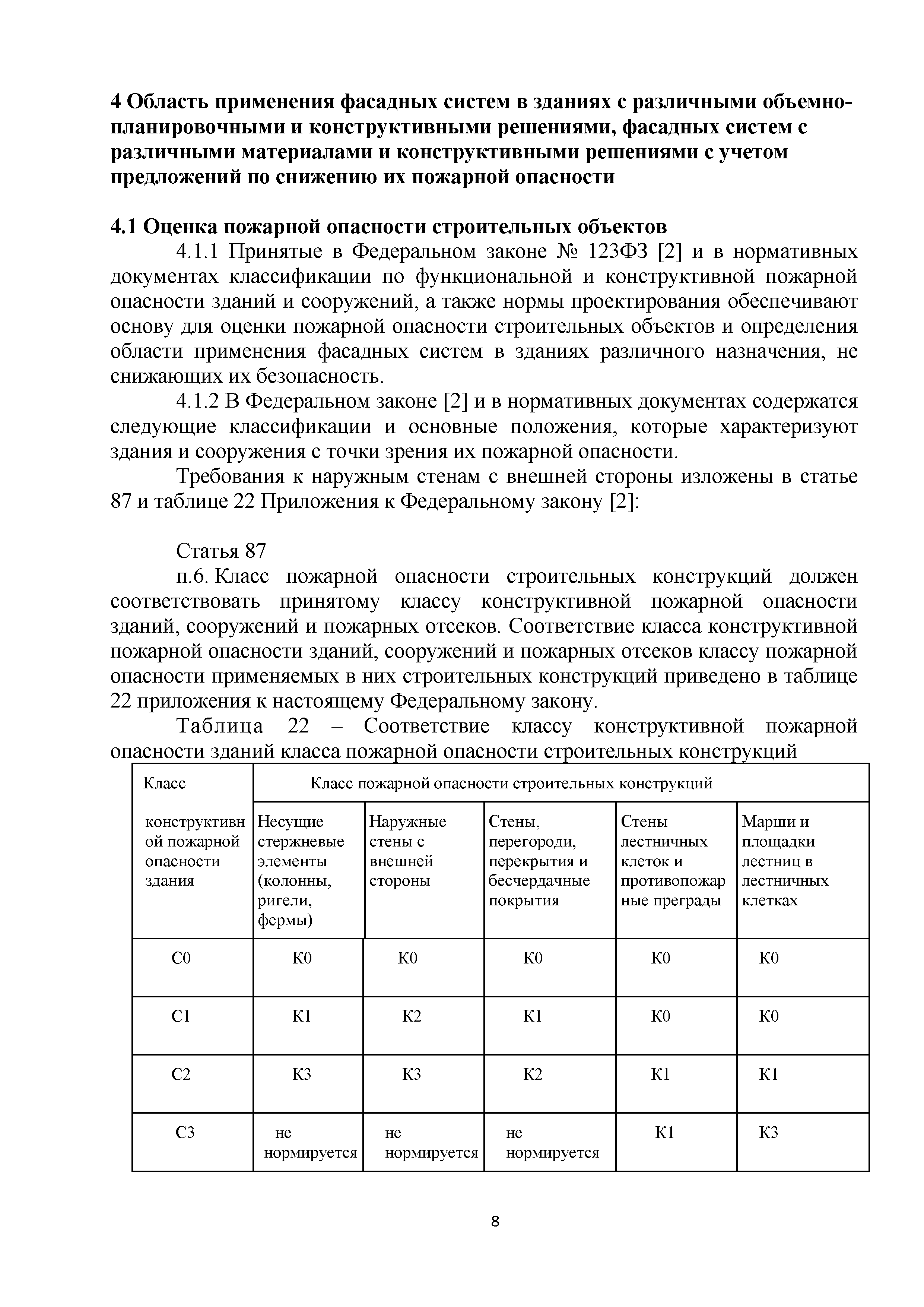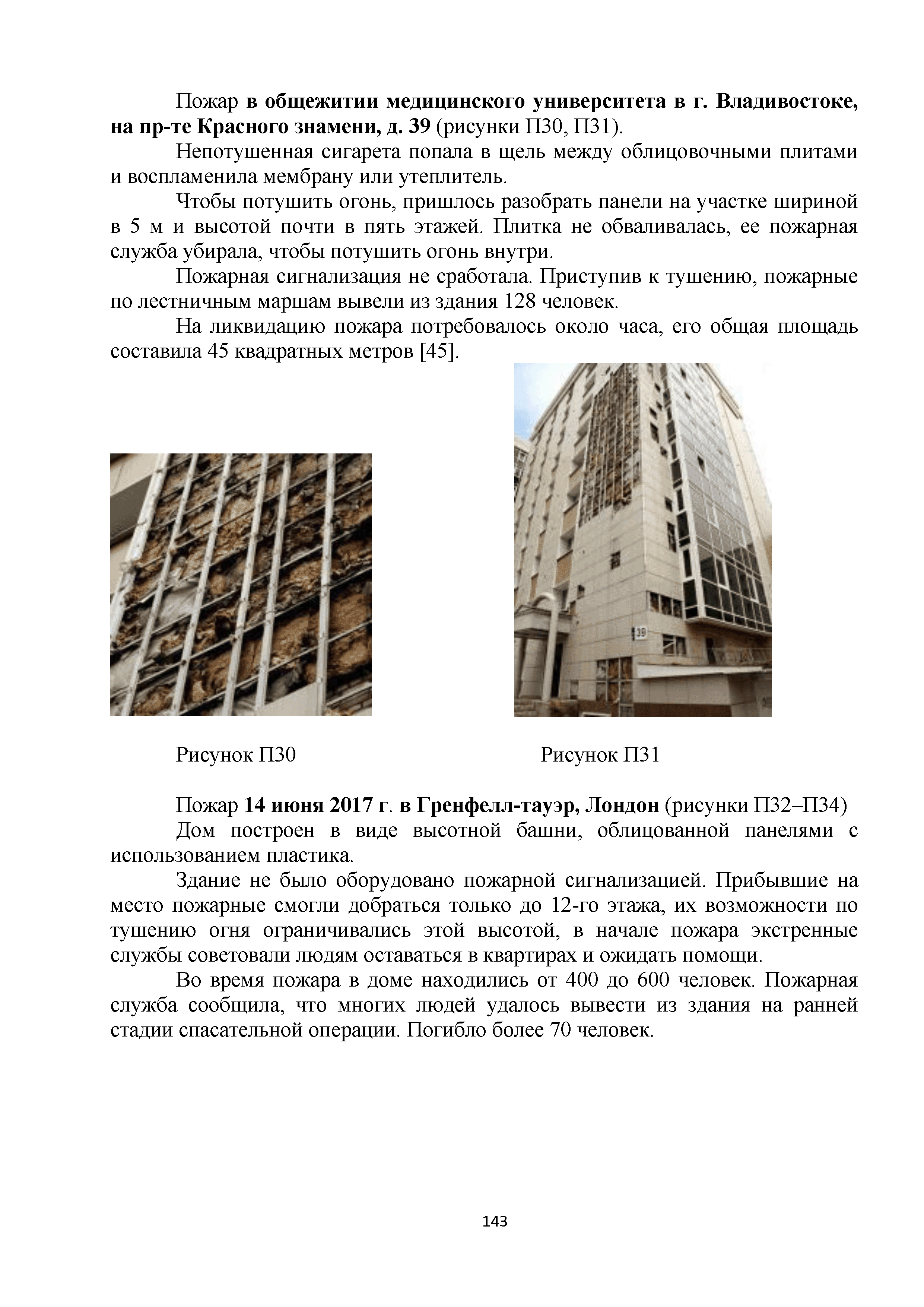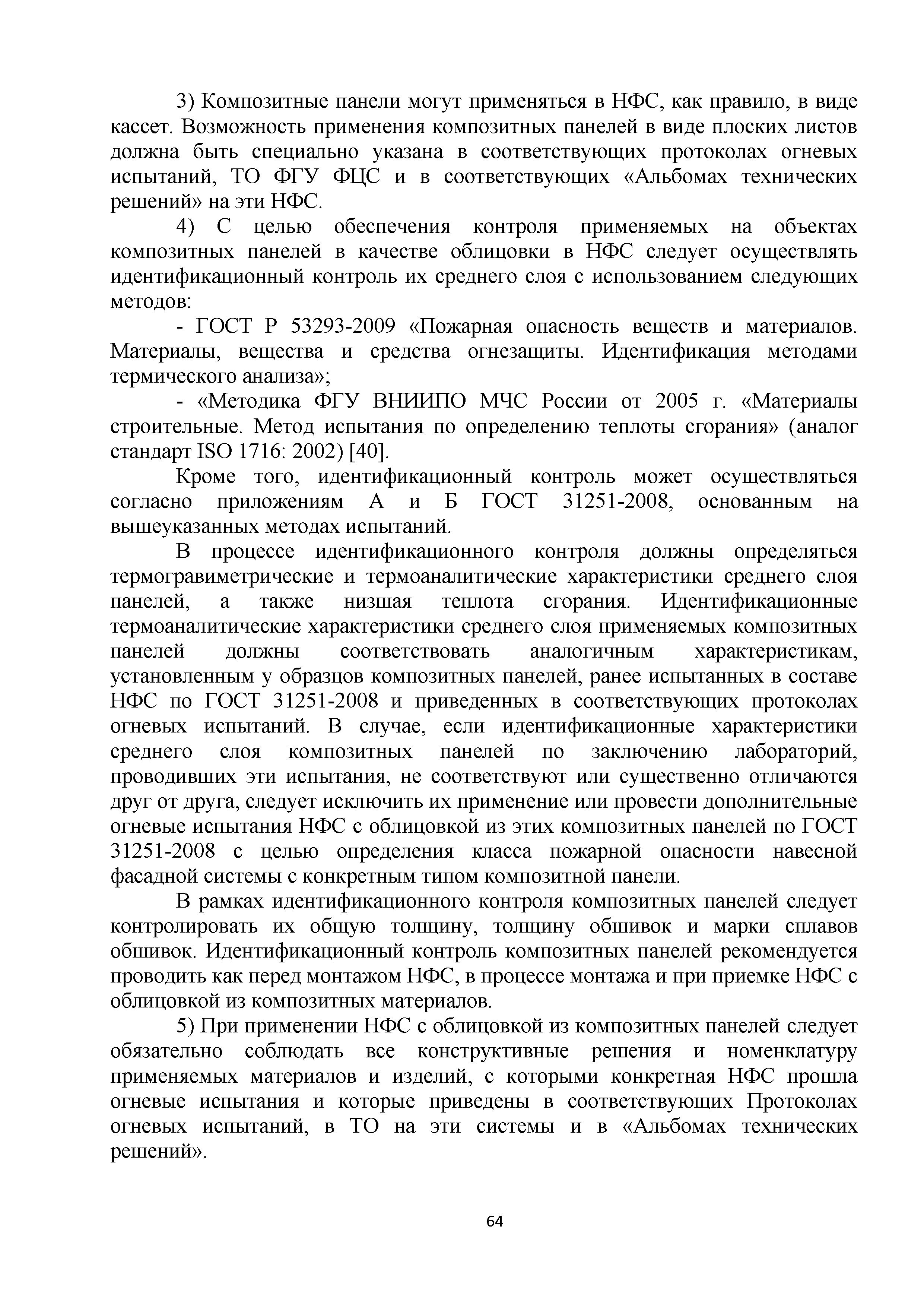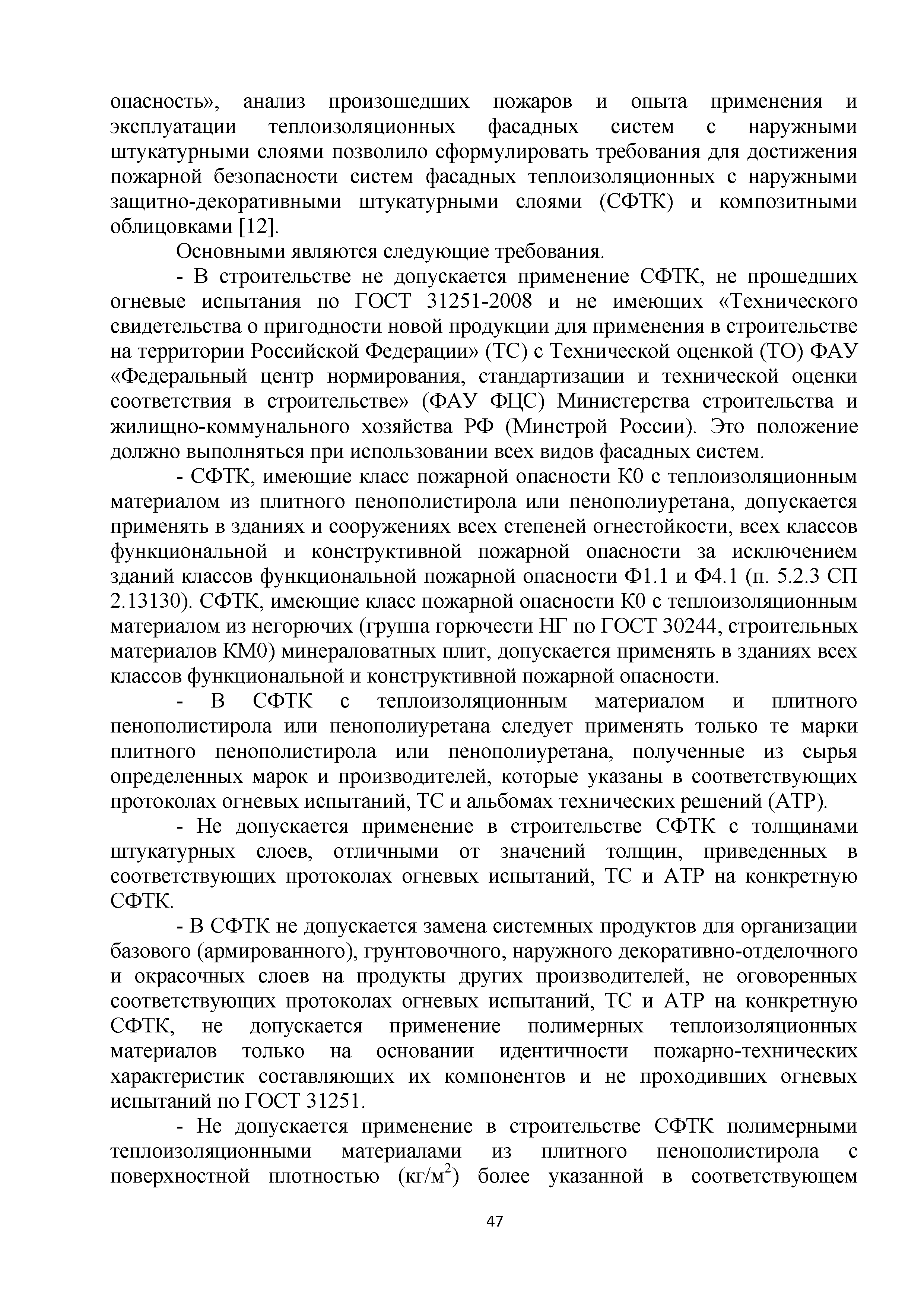| Оглавление: | Введение 1. Область применения 2. Нормативные ссылки 3. Термины и определения 4. Область применения фасадных систем в зданиях с различными объемно-планировочными и конструктивными решениями фасадных систем с различными материалами и конструктивными решениями с учетом предложений по снижению пожарной опасности 4.1. Оценка пожарной опасности строительных объектов 4.2. Факторы, определяющие поведение фасадных систем при различных объемно-планировочных и конструктивных решениях 4.3. Предложения по области применения фасадных систем 4.4. Требованиями к фасадным системам, направленные на выполнение условий безопасности в соответствии с Федеральными законами № 384-ФЗ и № 123-ФЗ 5. Решения фасадных систем, отвечающих требованиям безопасности в соответствии с Федеральными законами № 384-ФЗ и № 123-ФЗ 5.1. Системы фасадные теплоизоляционные с наружными защитно-декоративными штукатурными слоями (СФТК) и композитными облицовками 5.2. Системы фасадные навесные с воздушным зазором 5.3. Остекление в фасадных системах 5.4. Рекомендации по устранению в конструктивных решениях фасадных систем и в решениях зданий дефектов, приводящих к чрезвычайным ситуациям 5.5. Требования к выполнению монтажных работ 5.6. Требования при эксплуатации зданий Приложение. Примеры пожаров в зданиях с облицовкой наружных стен фасадными системами Библиография |