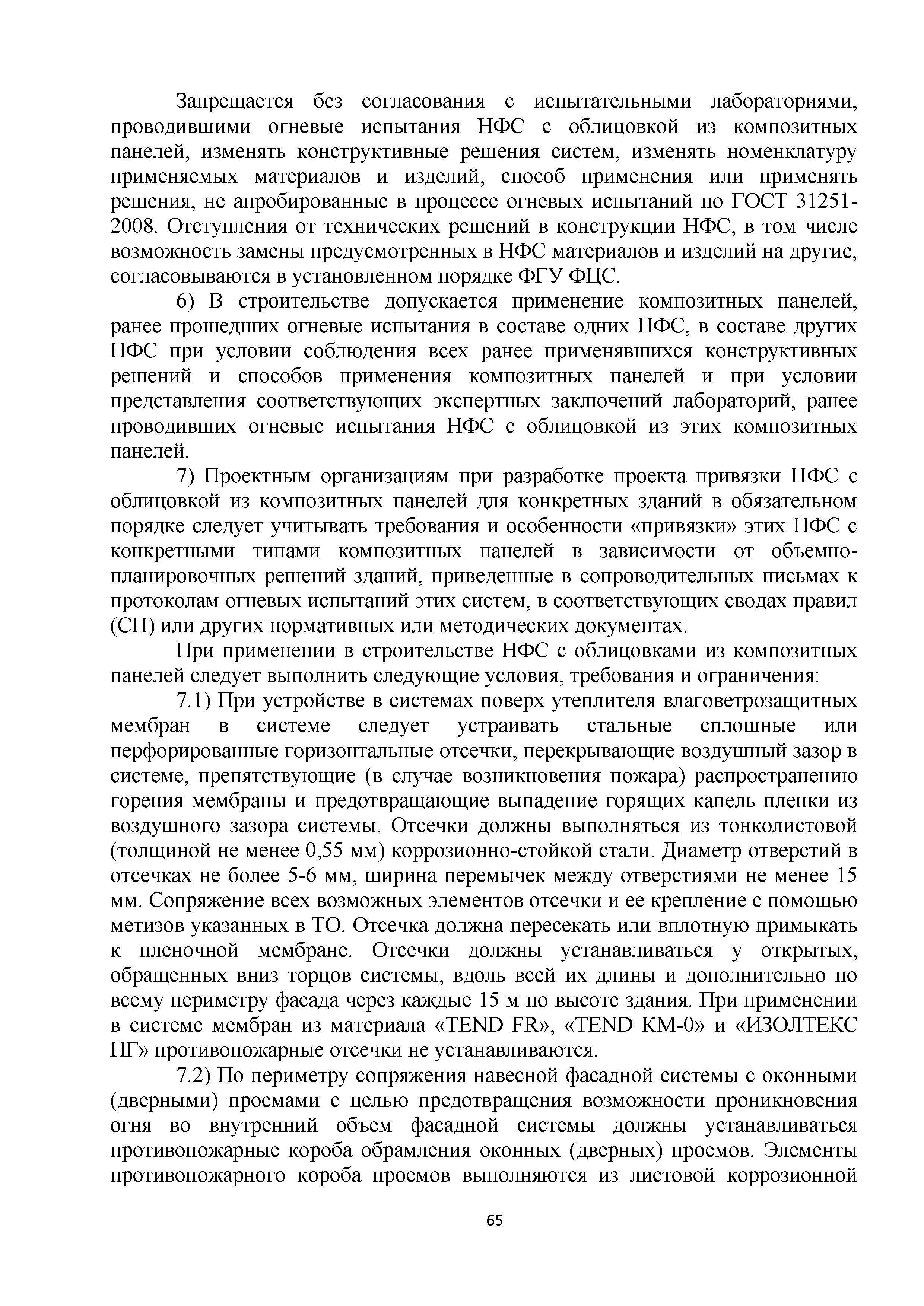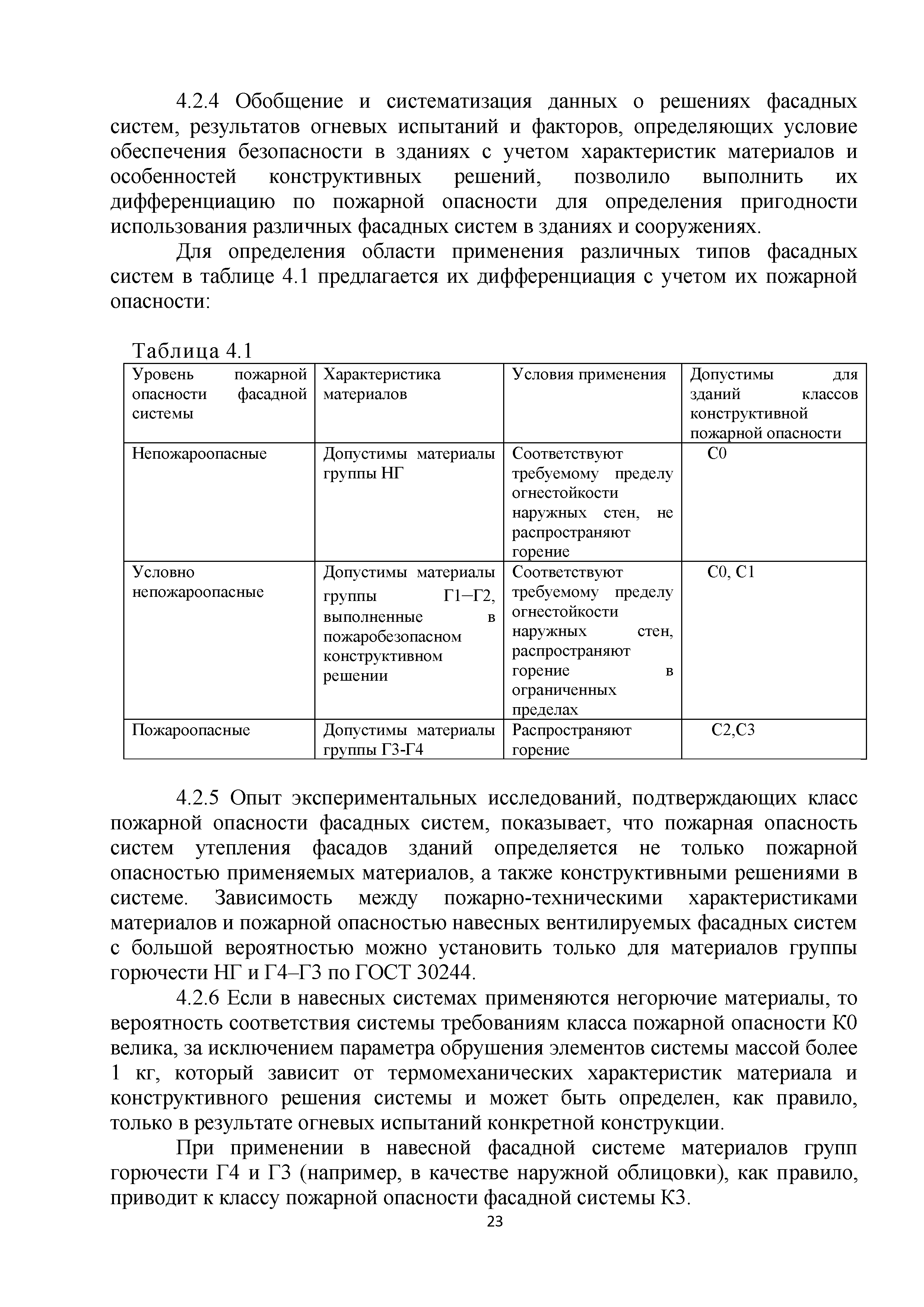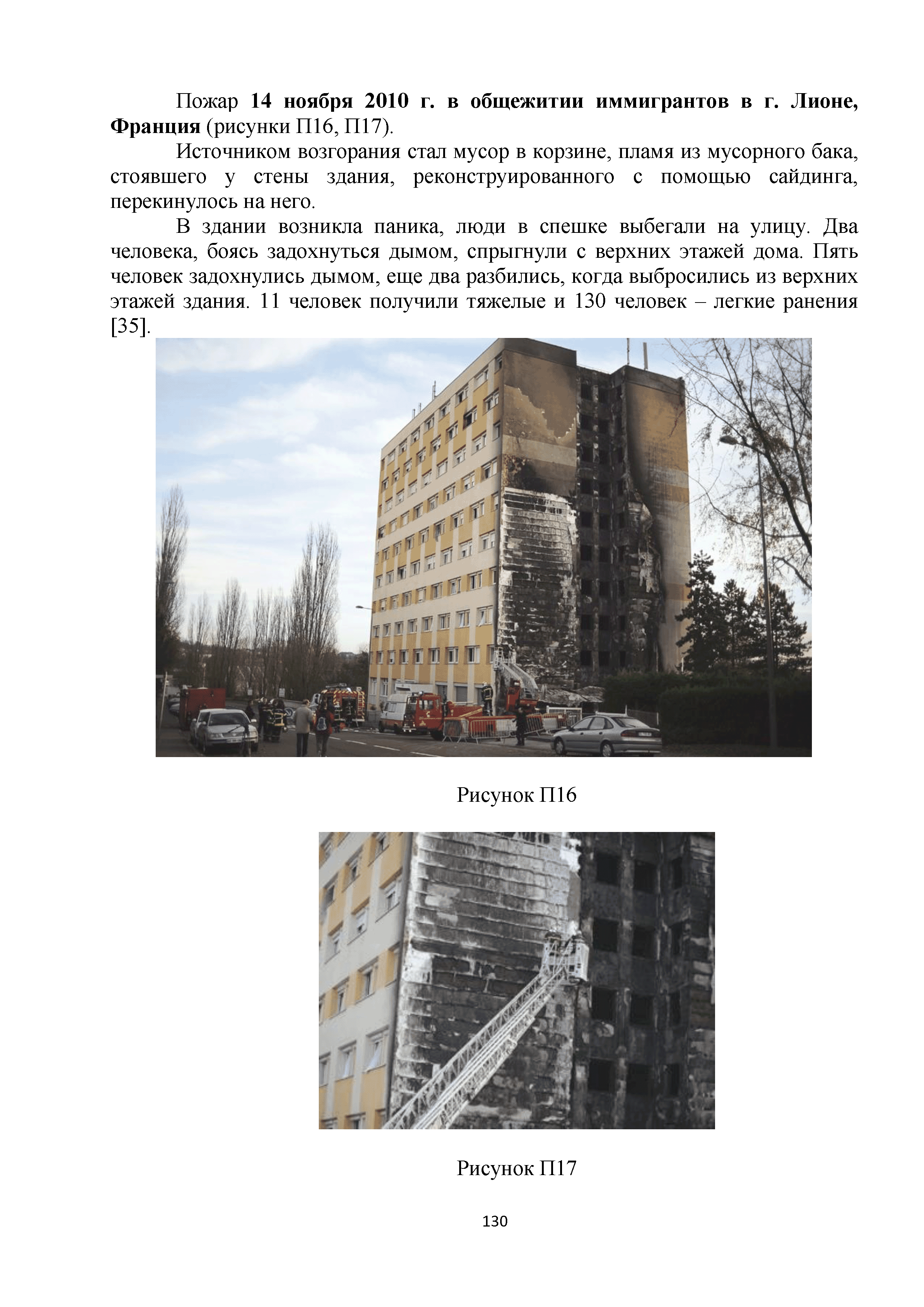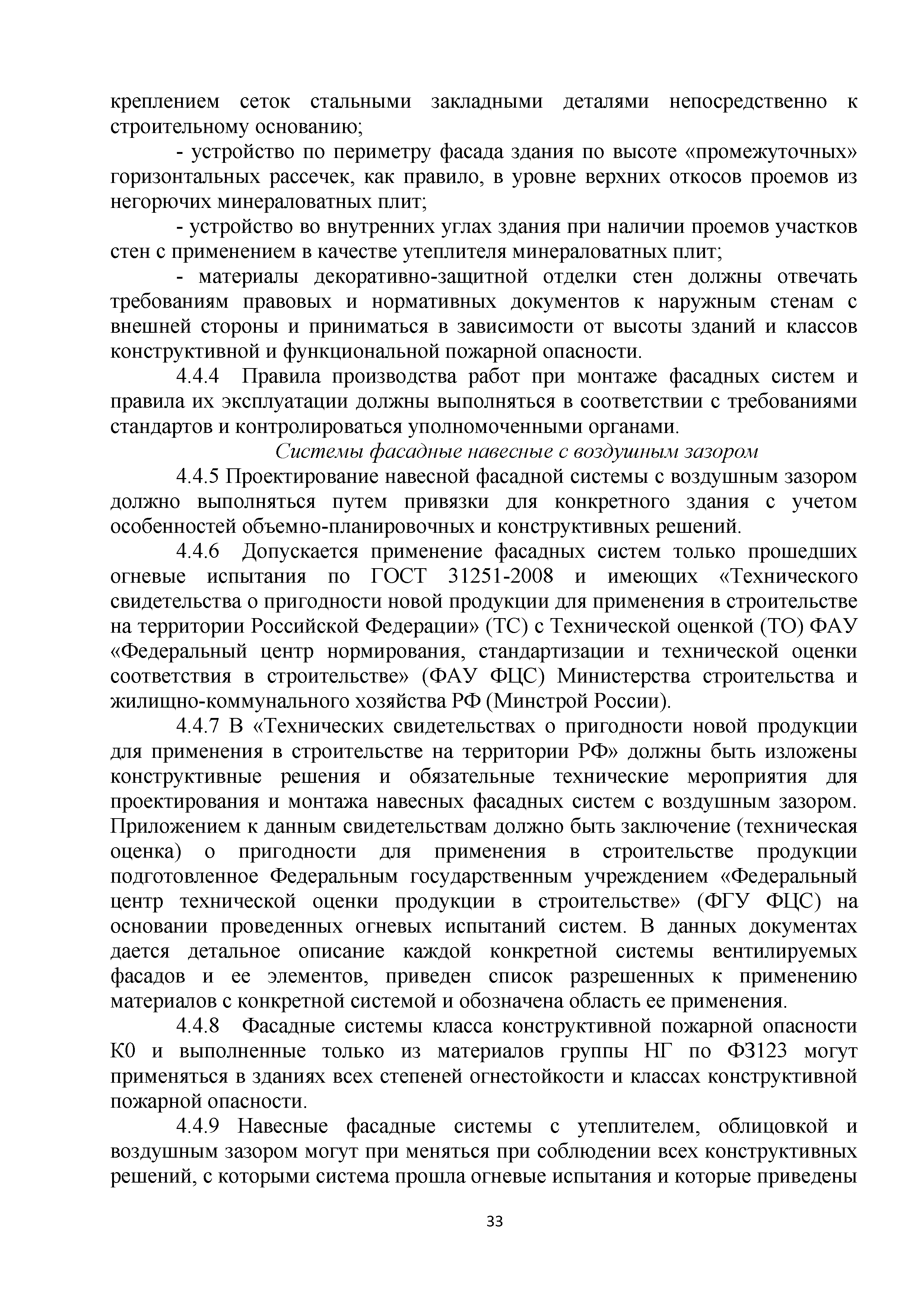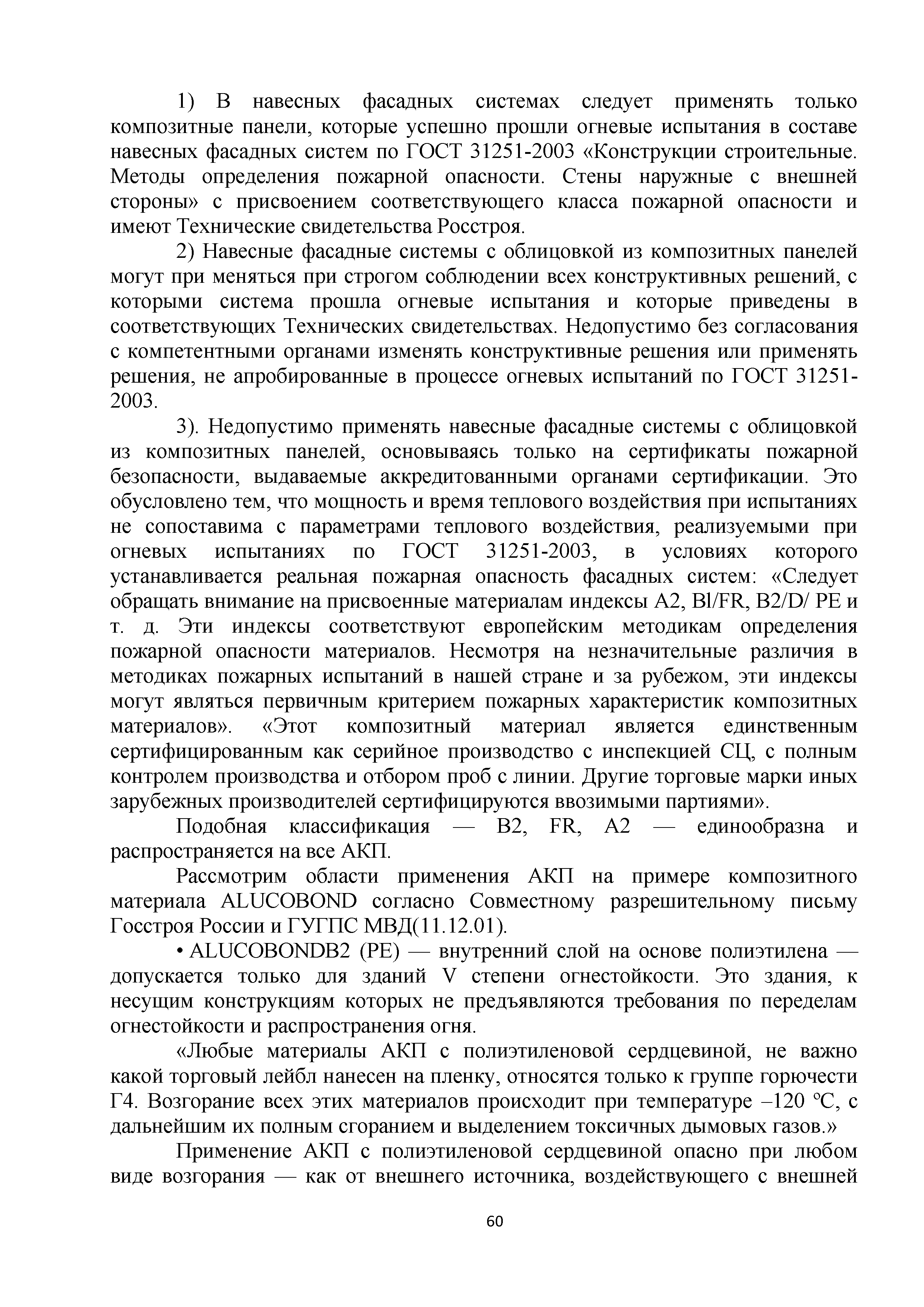 | Оглавление: | Введение 1. Область применения 2. Нормативные ссылки 3. Термины и определения 4. Область применения фасадных систем в зданиях с различными объемно-планировочными и конструктивными решениями фасадных систем с различными материалами и конструктивными решениями с учетом предложений по снижению пожарной опасности 4.1. Оценка пожарной опасности строительных объектов 4.2. Факторы, определяющие поведение фасадных систем при различных объемно-планировочных и конструктивных решениях 4.3. Предложения по области применения фасадных систем 4.4. Требованиями к фасадным системам, направленные на выполнение условий безопасности в соответствии с Федеральными законами № 384-ФЗ и № 123-ФЗ 5. Решения фасадных систем, отвечающих требованиям безопасности в соответствии с Федеральными законами № 384-ФЗ и № 123-ФЗ 5.1. Системы фасадные теплоизоляционные с наружными защитно-декоративными штукатурными слоями (СФТК) и композитными облицовками 5.2. Системы фасадные навесные с воздушным зазором 5.3. Остекление в фасадных системах 5.4. Рекомендации по устранению в конструктивных решениях фасадных систем и в решениях зданий дефектов, приводящих к чрезвычайным ситуациям 5.5. Требования к выполнению монтажных работ 5.6. Требования при эксплуатации зданий Приложение. Примеры пожаров в зданиях с облицовкой наружных стен фасадными системами Библиография |