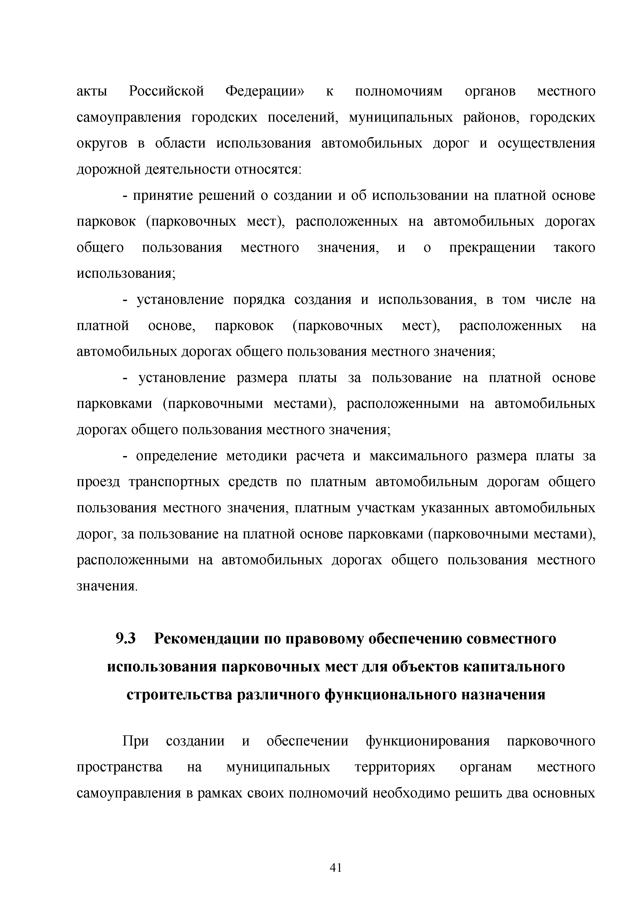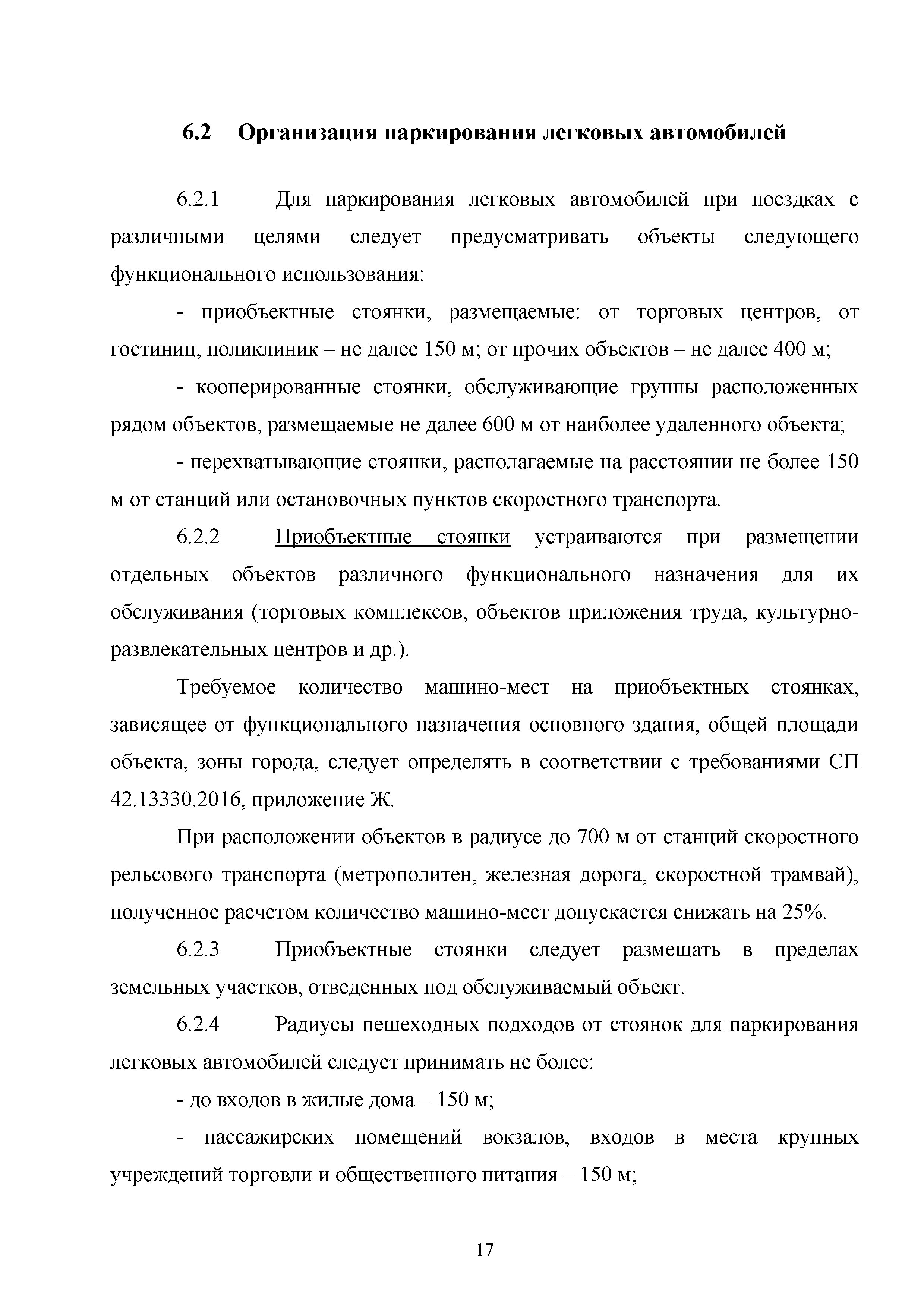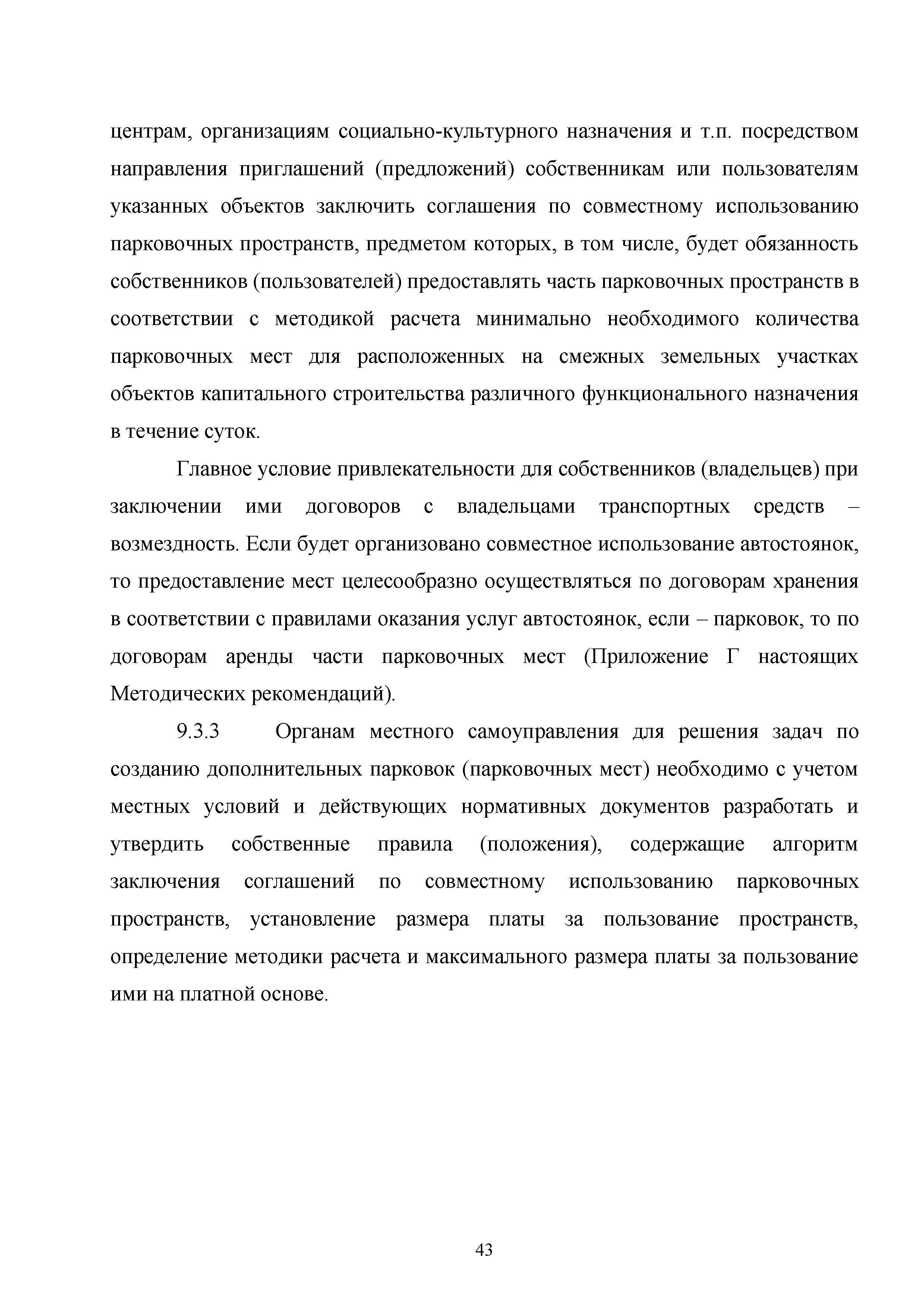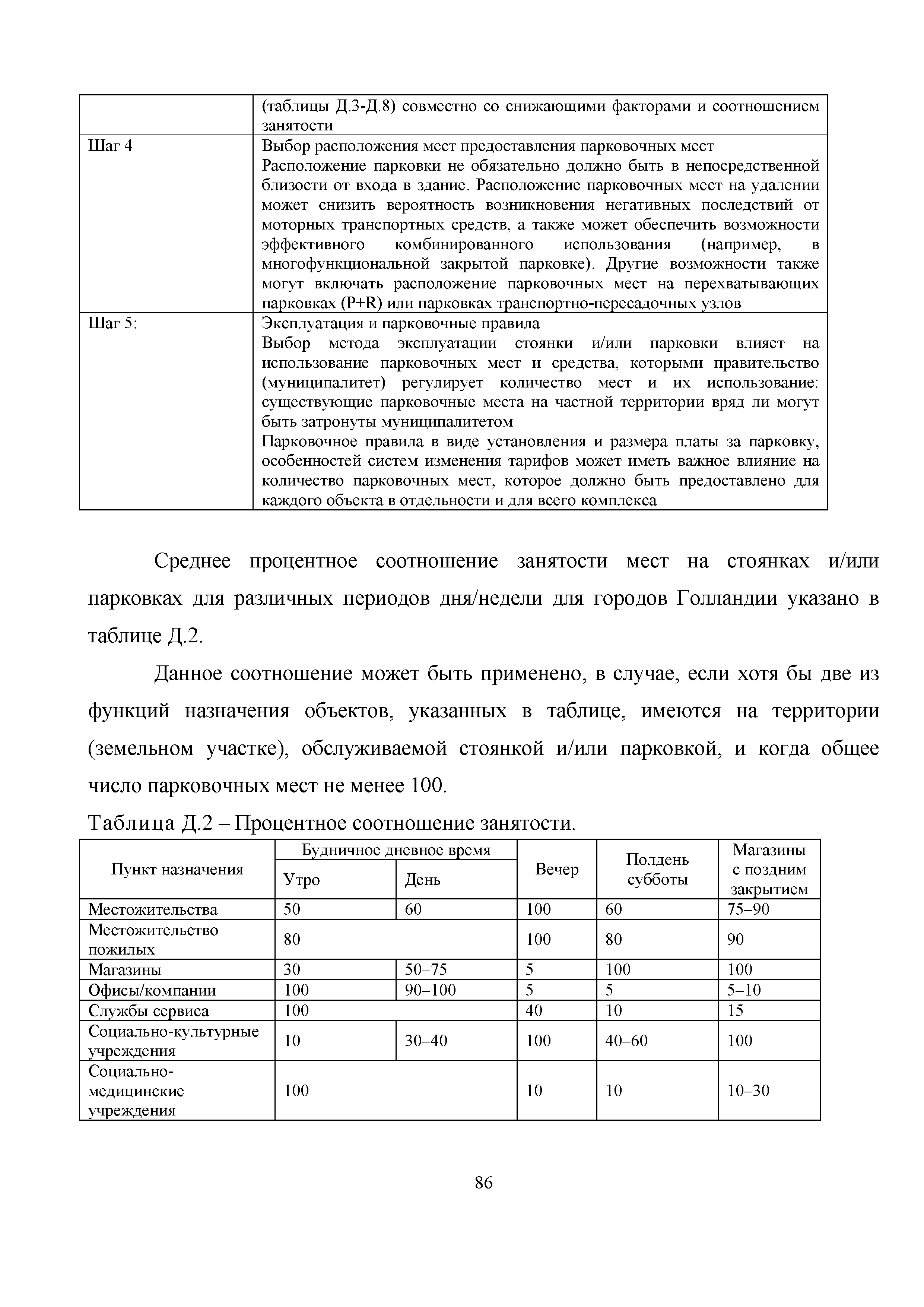 | Оглавление: | 1. Введение 2. Область применения 3. Нормативные ссылки 4. Термины и определения 5. Общие положения 6. Классификация, функциональные характеристики, основные параметры совместного использования парковочных мест, пустующих в течение значительной части суток, для объектов капитального строительства различного функционального назначения 6.1. Организация хранения легковых автомобилей 6.2. Организация паркирования легковых автомобилей 6.3. Типы гаражно-стояночных объектов 6.4. Повышение эффективности использования машино-мест. Классификация ситуаций 7. Методика расчета минимально необходимого количества парковочных мест для расположенных на смежных земельных участках объектов капитального строительства различного функционального назначения 8. Требования к организации совместного использования парковочных мест 8.1. Эффект экономии машино-мест за счет увеличения оборачиваемости одного машино-места 8.2. Эффект экономии машино-мест за счет совместного пользования гаражно-стояночных объектов (кооперированные стоянки) 8.3. Комплексные решения по организации кооперированных стоянок многофункционального назначения 9. Рекомендации по правовому обеспечению совместного использования парковочных мест для объектов капитального строительства различного функционального назначения 9.1. Правовые положения, регулирующие понятие автостоянок, парковок 9.2. Правовое регулирование деятельности автостоянок и парковок 9.3. Рекомендации по правовому обеспечению совместного использования парковочных мест для объектов капитального строительства функционального назначения Приложение А. Пример расчета Приложение Б. Примеры подготовленных материалов натурных обследований аналогичных объектов для расчета требуемого количества машино-мест Приложение В. Договор оказания услуг по хранению автомототранспортного средства на автостоянке Приложение Г. Договор аренды парковочного места Приложение Д (справочное). Результаты анализа отечественного и зарубежного опыта по повышению эффективности использования машино-мест в городах Список используемой литературы |