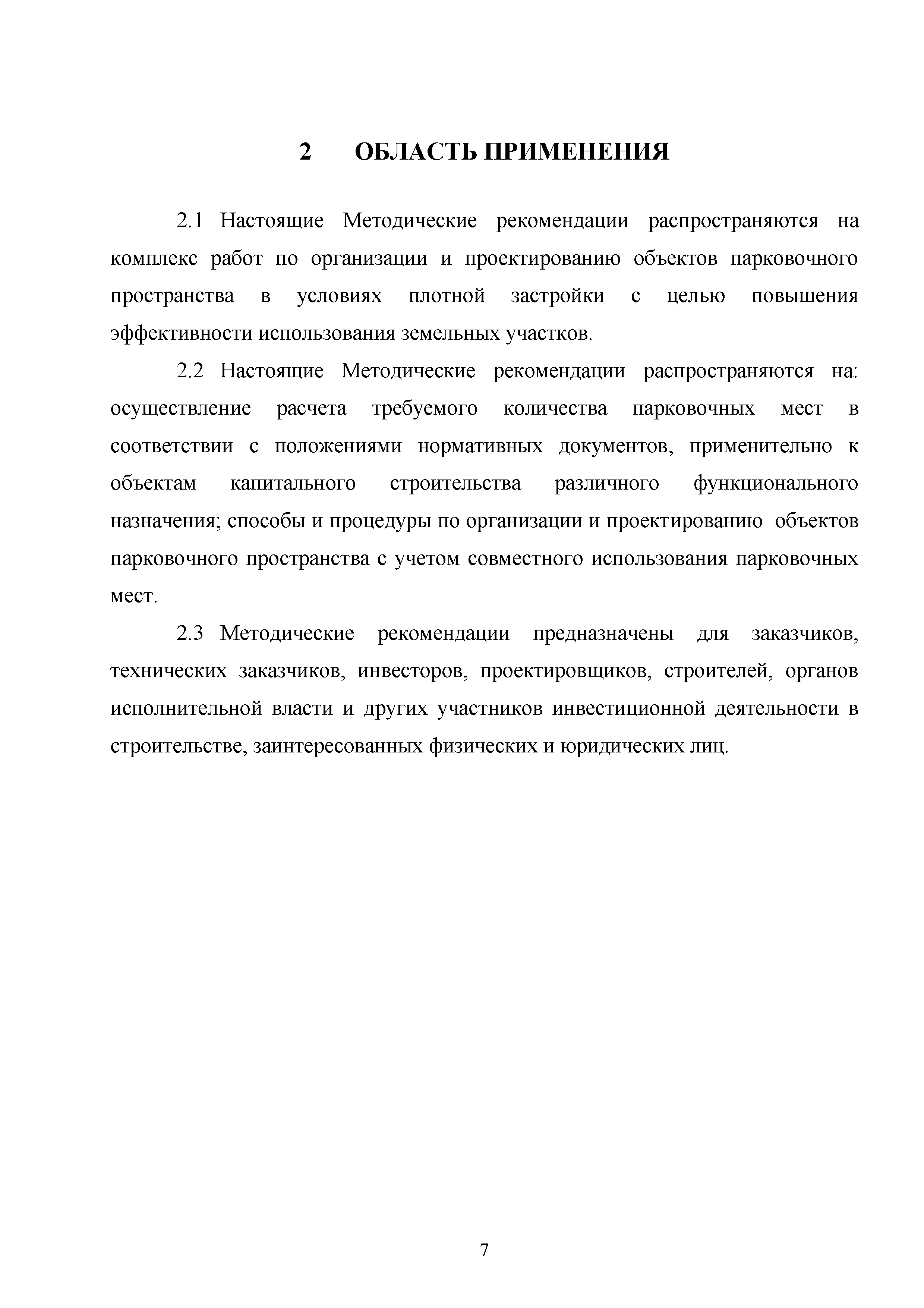 | Область применения: | Методические рекомендации распространяются на комплекс работ по организации и проектированию объектов парковочного пространства в условиях плотной застройки с целью повышения эффективности использования земельных участков и предназначены для заказчиков, технических заказчиков, инвесторов, проектировщиков, строителей, органов исполнительной власти и других участников инвестиционной деятельности в строительстве, заинтересованных физических и юридических лиц. Методические рекомендации распространяются на: осуществление расчета требуемого количества парковочных мест в соответствии с положениями нормативных документов, применительно к объектам капитального строительства различного функционального назначения, способы и процедуры по организации и проектированию объектов парковочного пространства с учетом совместного использования парковочных мест. |