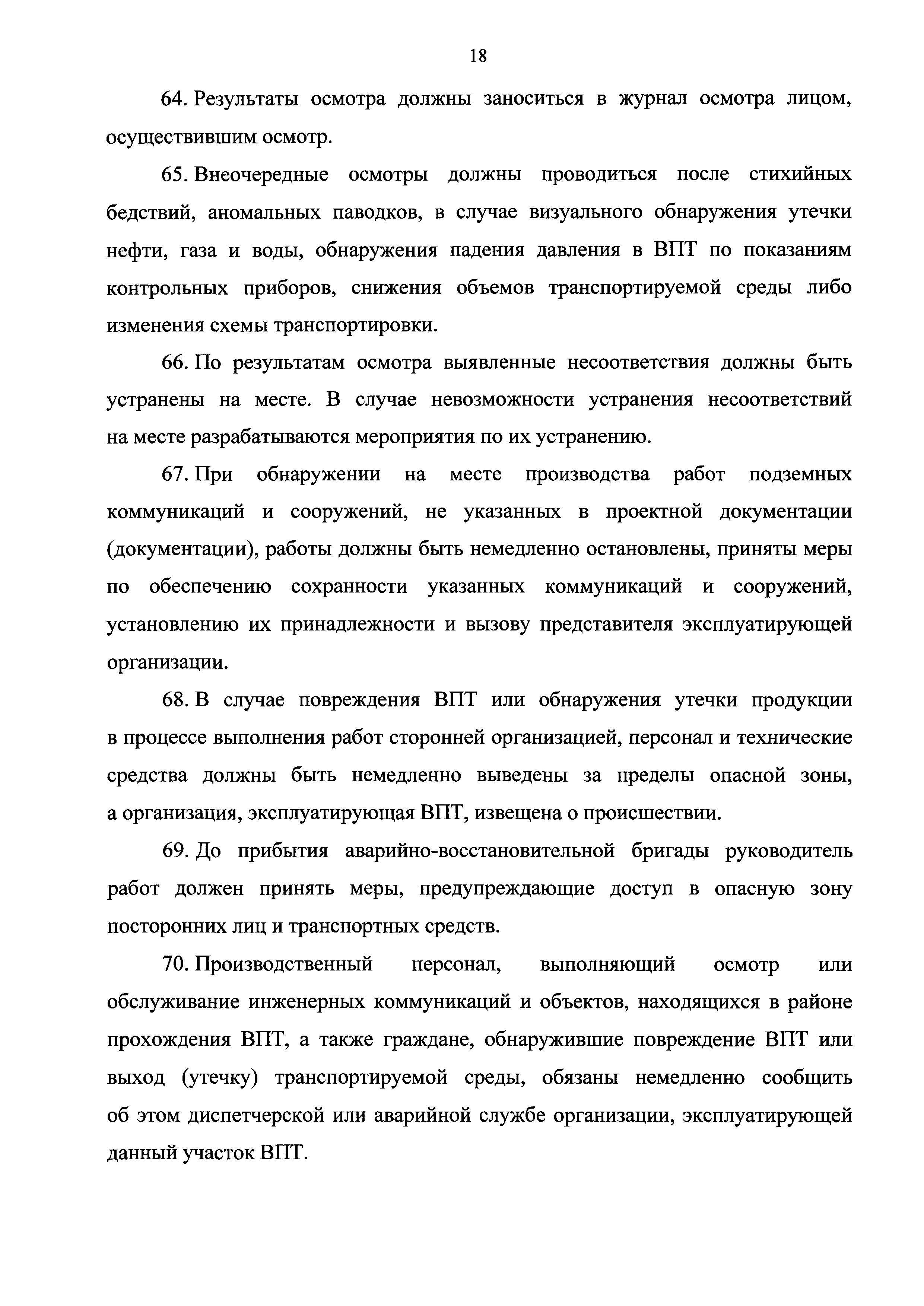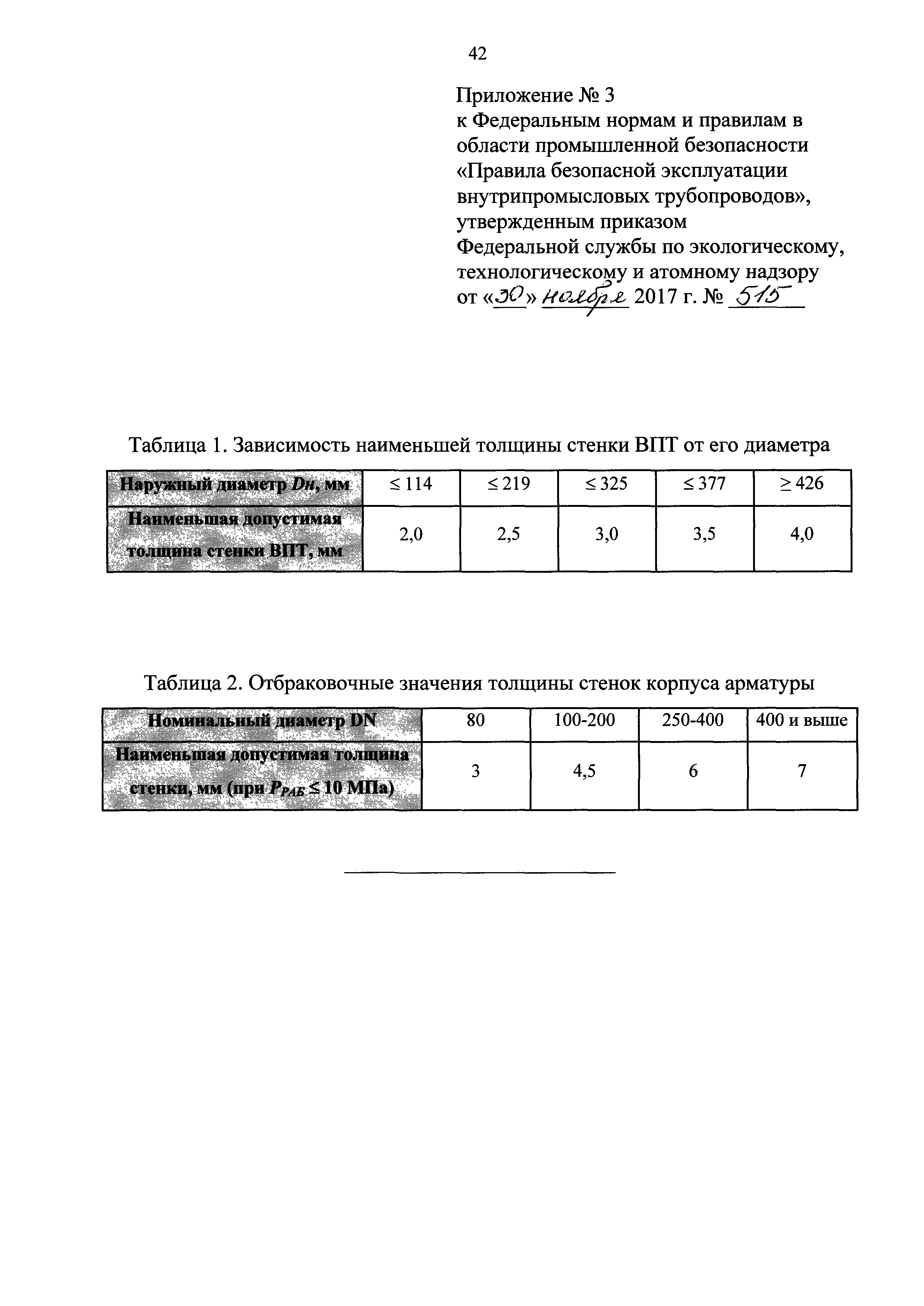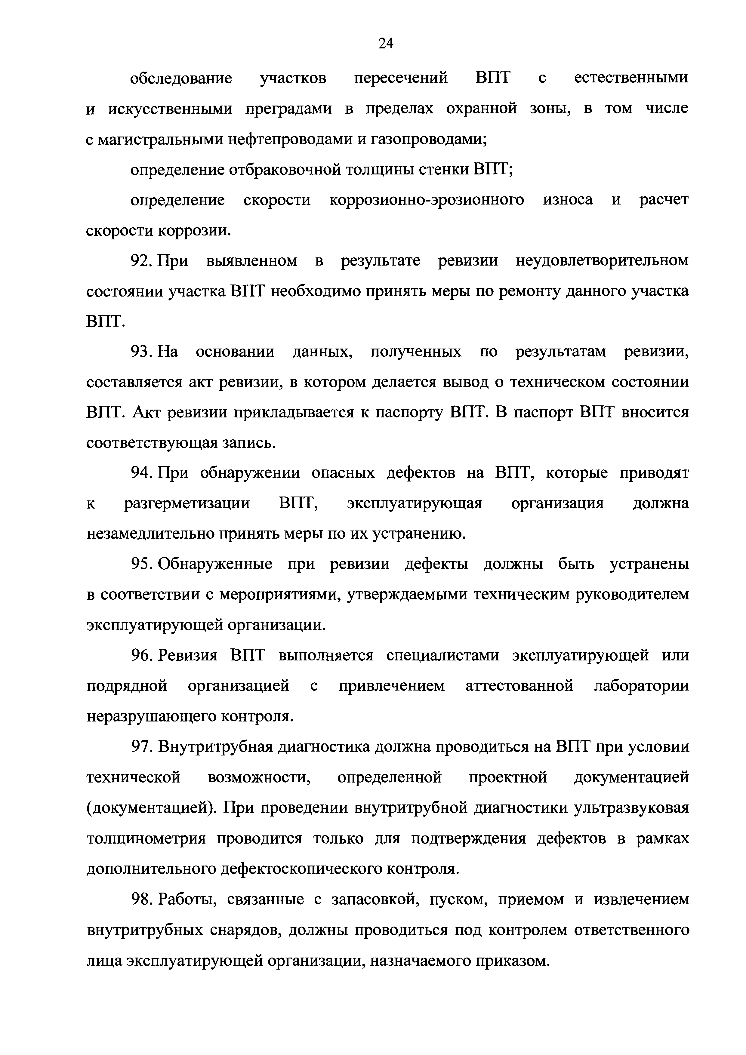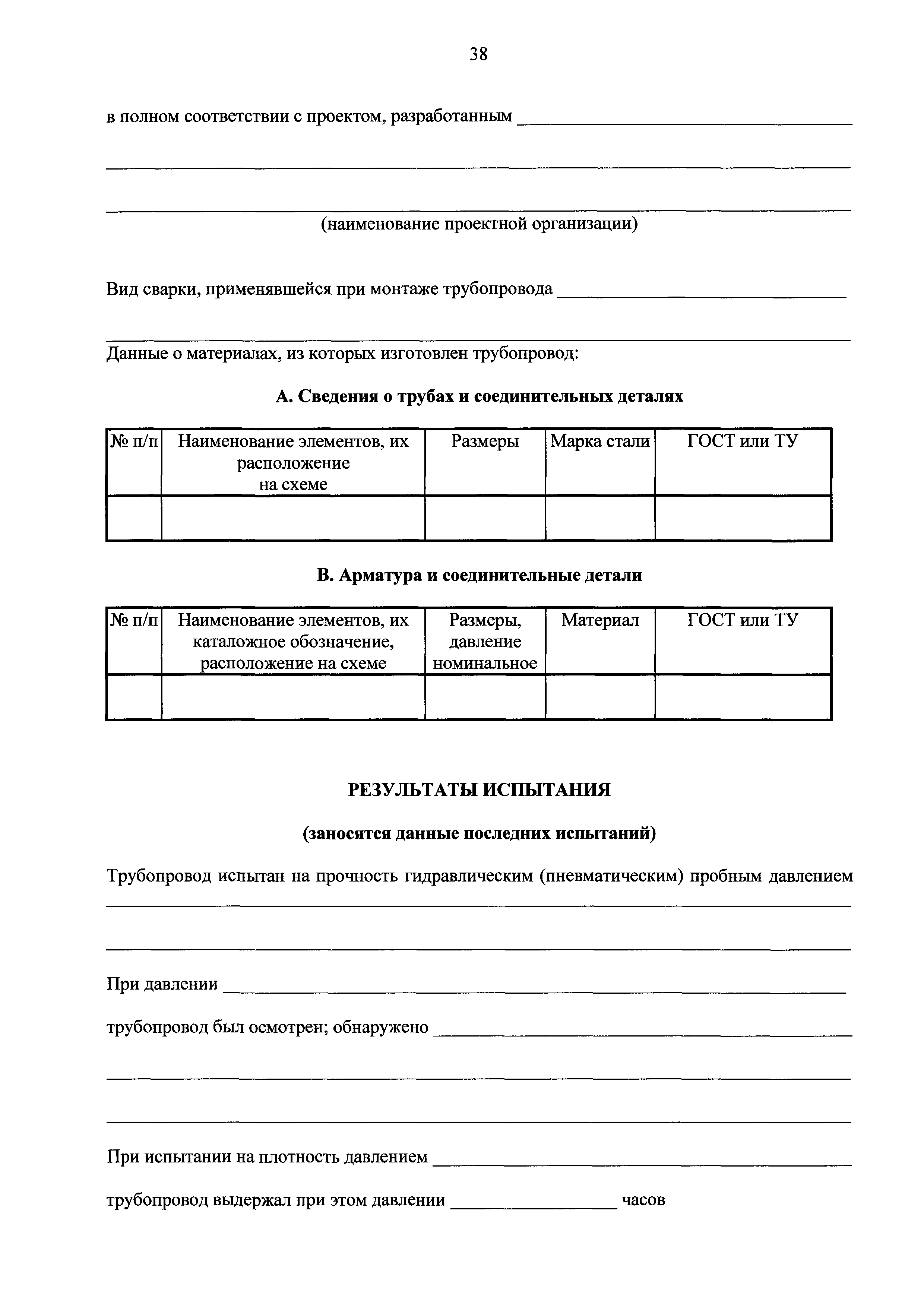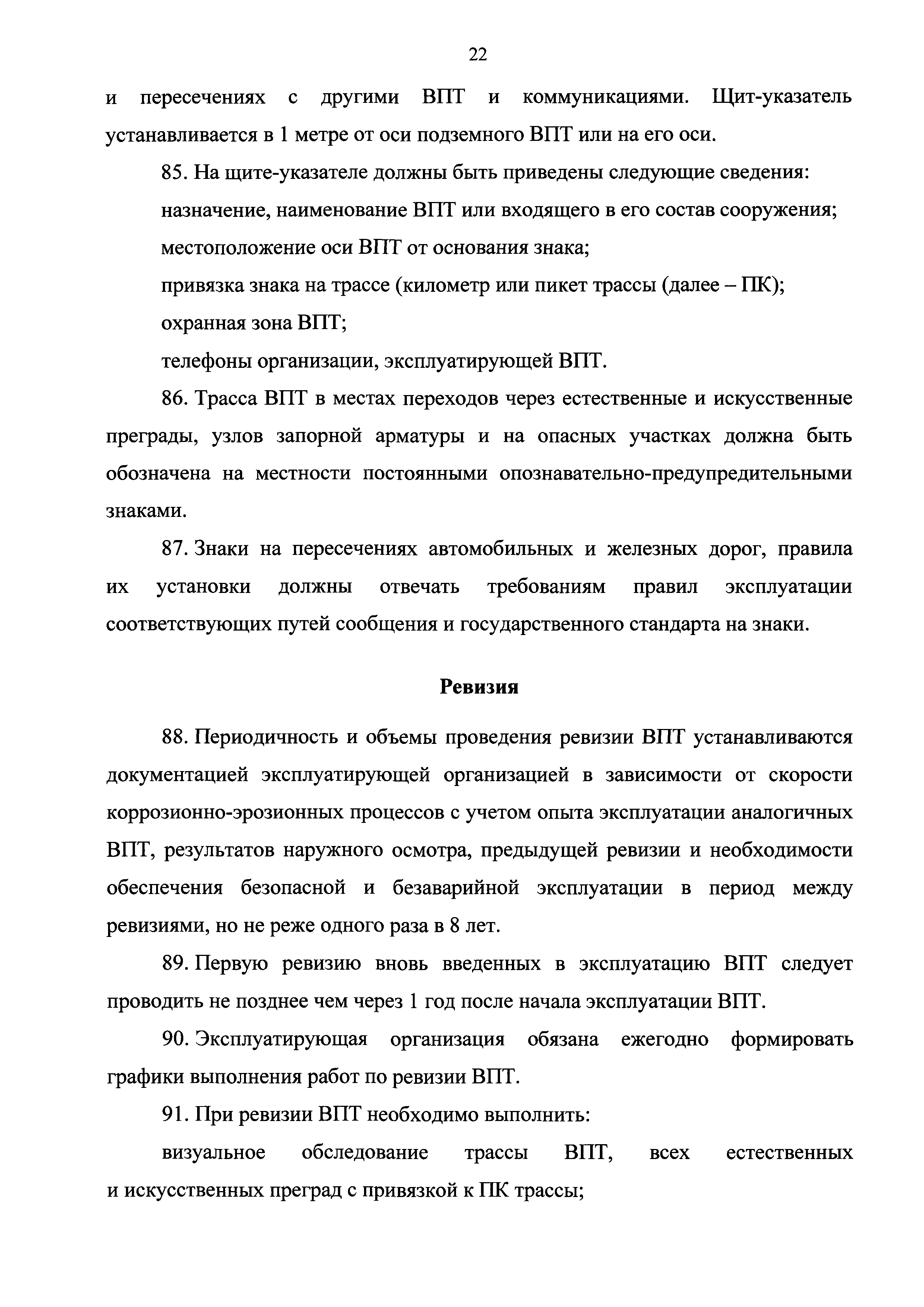 | Оглавление: | I. Общие положения II. Общие требования к разработке технологического процесса III. Требования при проектировании IV. Требования при строительстве, реконструкции, техническом перевооружении и капитальном ремонте V. Требования при вводе в эксплуатацию VI. Требования при эксплуатации Паспорт и технологический регламент на эксплуатацию внутрипромыслового водопровода Техническое обслуживание внутрипромыслового водопровода Осмотр трассы внутрипромыслового водопровода Обслуживание технических устройств внутрипромыслового водопровода Обслуживание средств электрохимической защиты Обозначение трассы внутрипромыслового водопровода на местности Ревизия Обследование переходов через естественные и искусственные преграды Обработка труб и деталей внутрипромыслового водопровода Периодические испытания внутрипромыслового водопровода Очистка внутрипромыслового водопровода Ремонт внутрипромыслового водопровода VI. Требования к выводу из эксплуатации, консервации и ликвидации внутрипромыслового водопровода VII. Перечень документации по эксплуатации Приложение № 1 Паспорт внутрипромыслового водопровода Приложение № 2 Расчет критической толщины стенки и деталей внутрипромыслового водопровода Приложение № 3 |