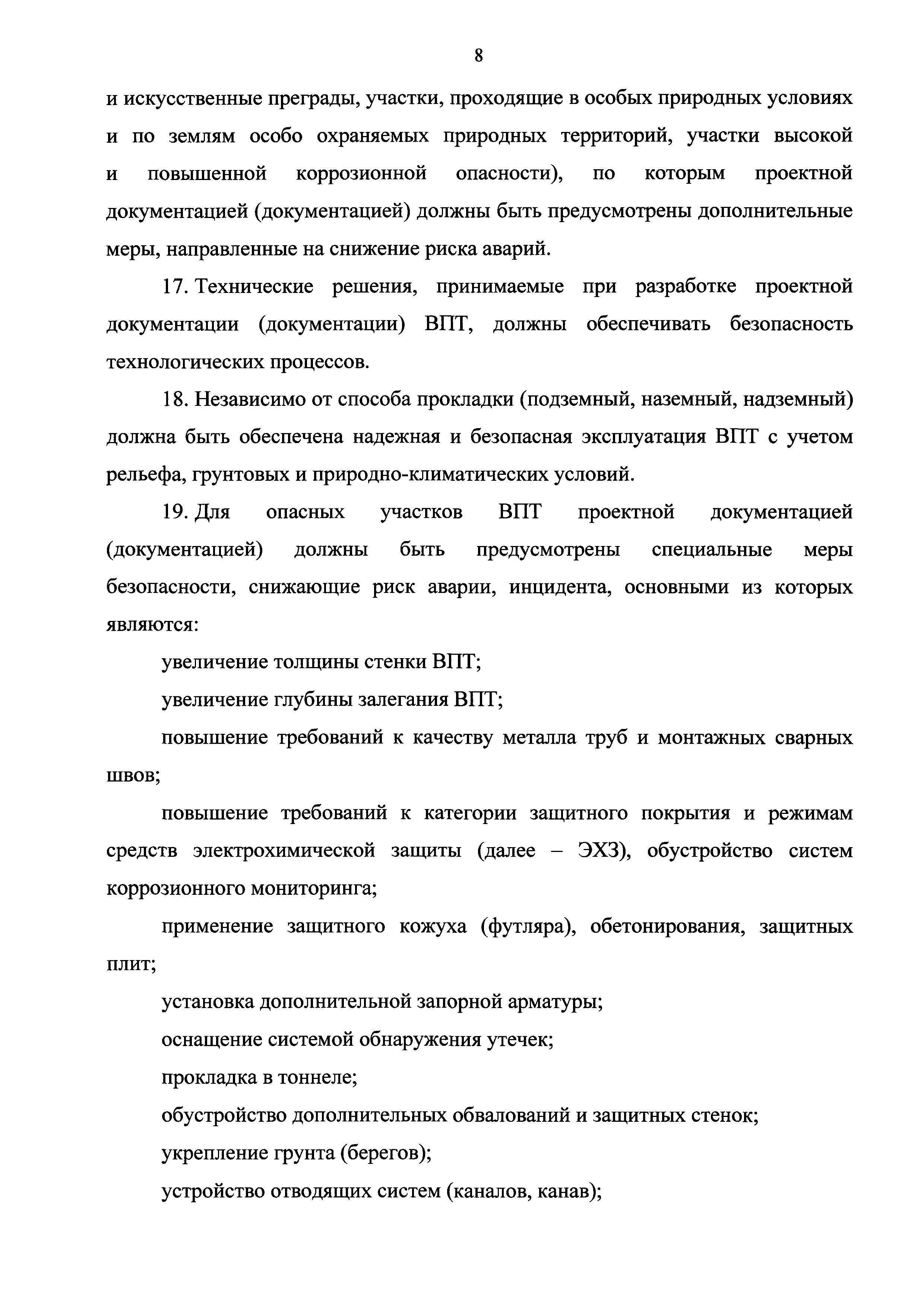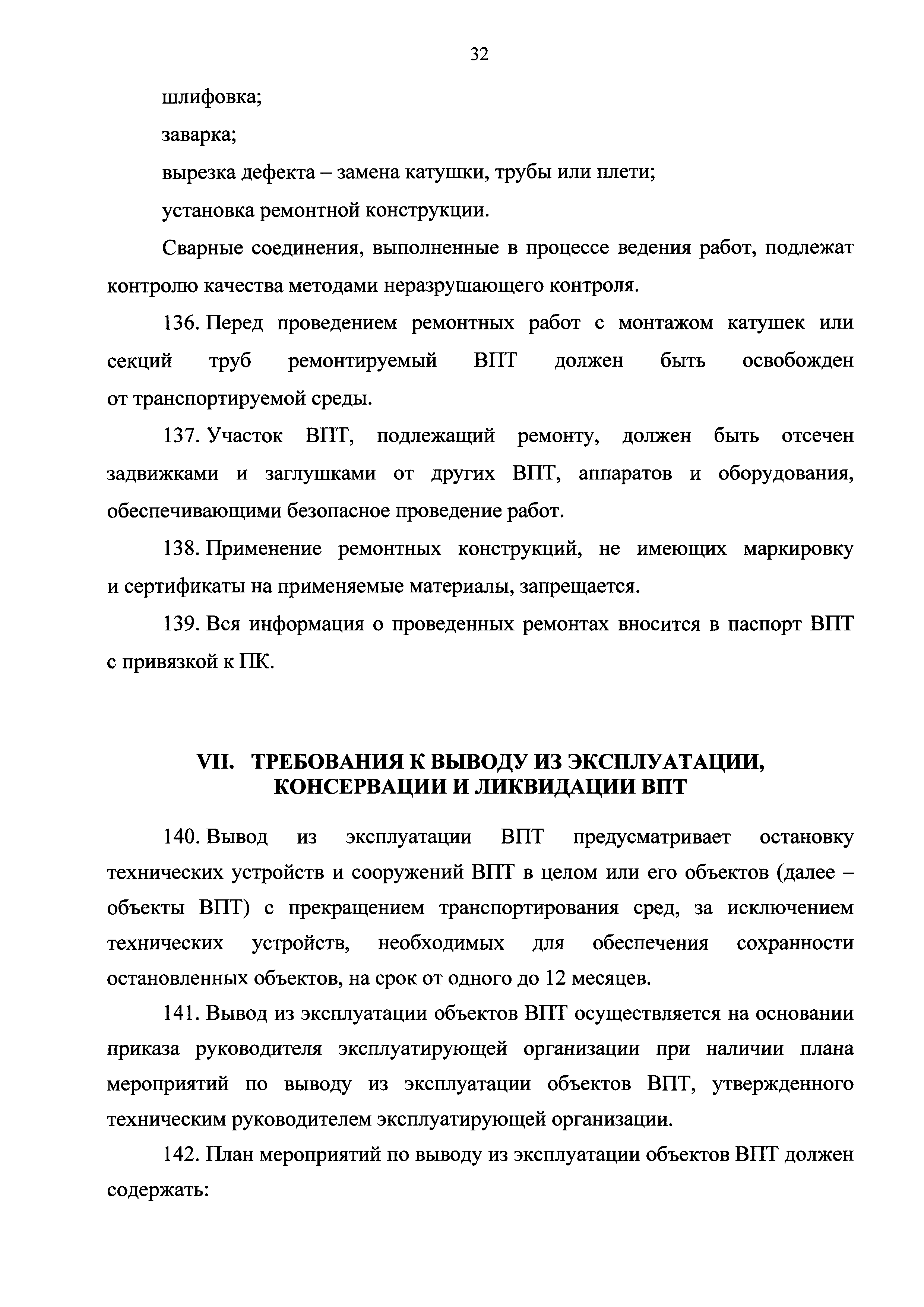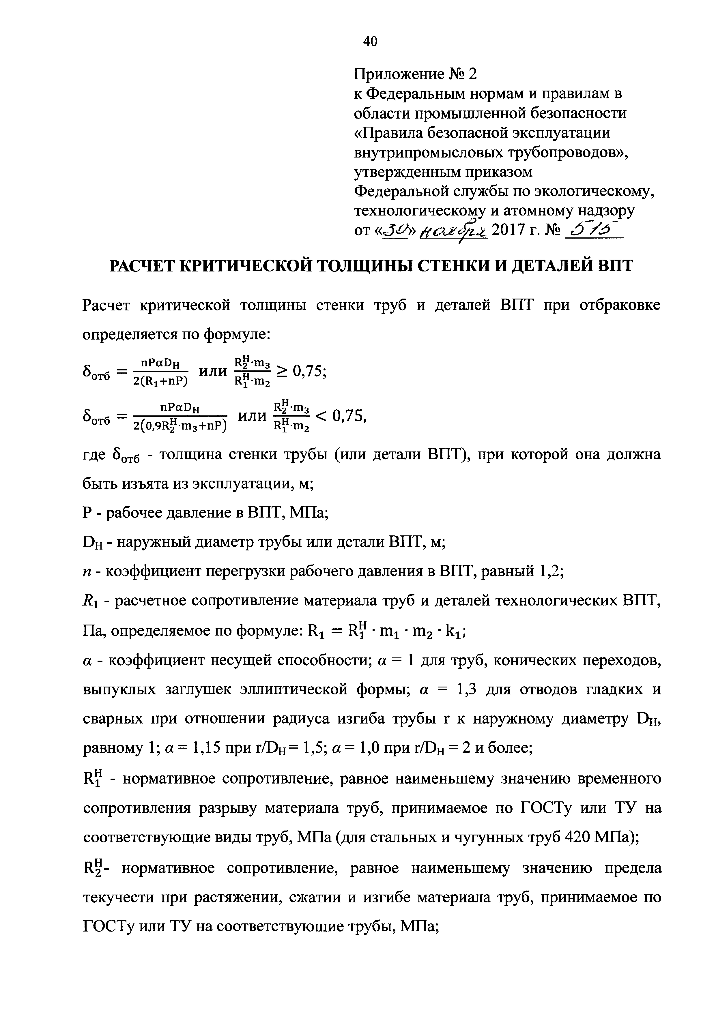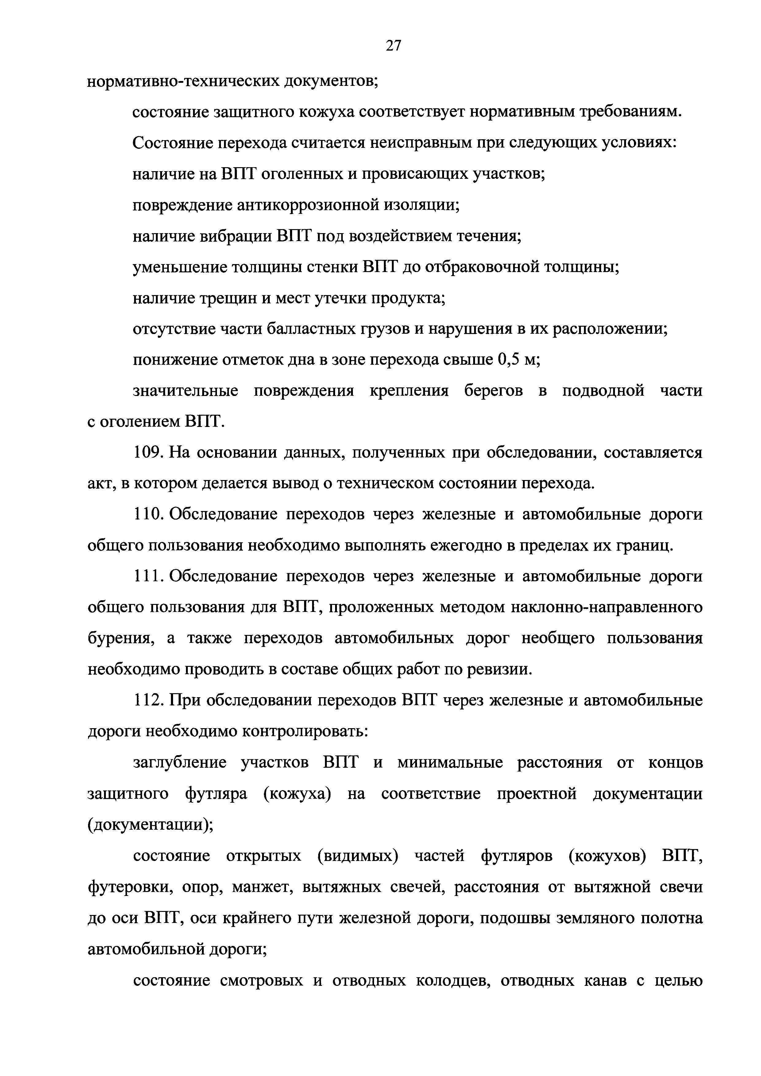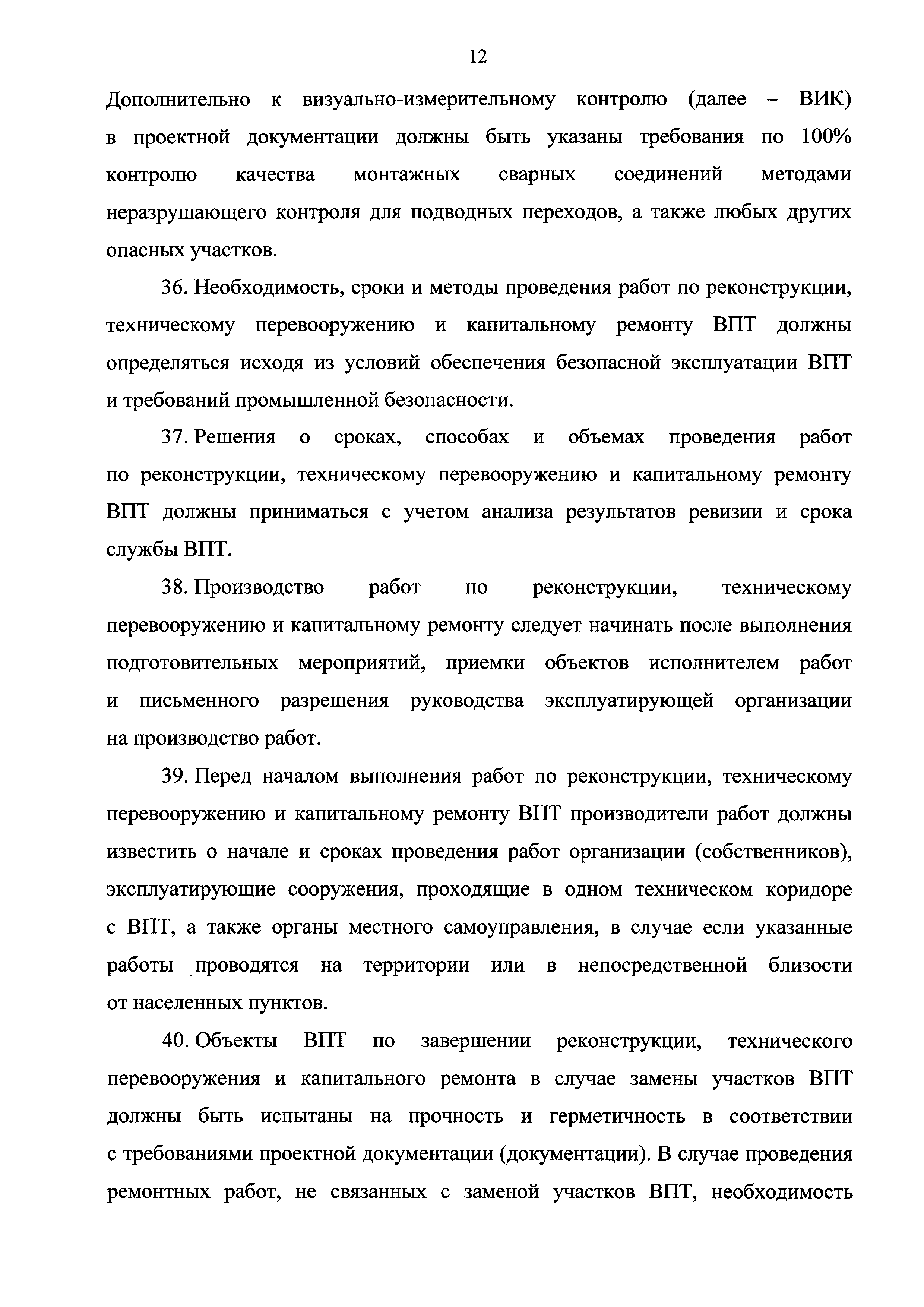 | Оглавление: | I. Общие положения II. Общие требования к разработке технологического процесса III. Требования при проектировании IV. Требования при строительстве, реконструкции, техническом перевооружении и капитальном ремонте V. Требования при вводе в эксплуатацию VI. Требования при эксплуатации Паспорт и технологический регламент на эксплуатацию внутрипромыслового водопровода Техническое обслуживание внутрипромыслового водопровода Осмотр трассы внутрипромыслового водопровода Обслуживание технических устройств внутрипромыслового водопровода Обслуживание средств электрохимической защиты Обозначение трассы внутрипромыслового водопровода на местности Ревизия Обследование переходов через естественные и искусственные преграды Обработка труб и деталей внутрипромыслового водопровода Периодические испытания внутрипромыслового водопровода Очистка внутрипромыслового водопровода Ремонт внутрипромыслового водопровода VI. Требования к выводу из эксплуатации, консервации и ликвидации внутрипромыслового водопровода VII. Перечень документации по эксплуатации Приложение № 1 Паспорт внутрипромыслового водопровода Приложение № 2 Расчет критической толщины стенки и деталей внутрипромыслового водопровода Приложение № 3 |