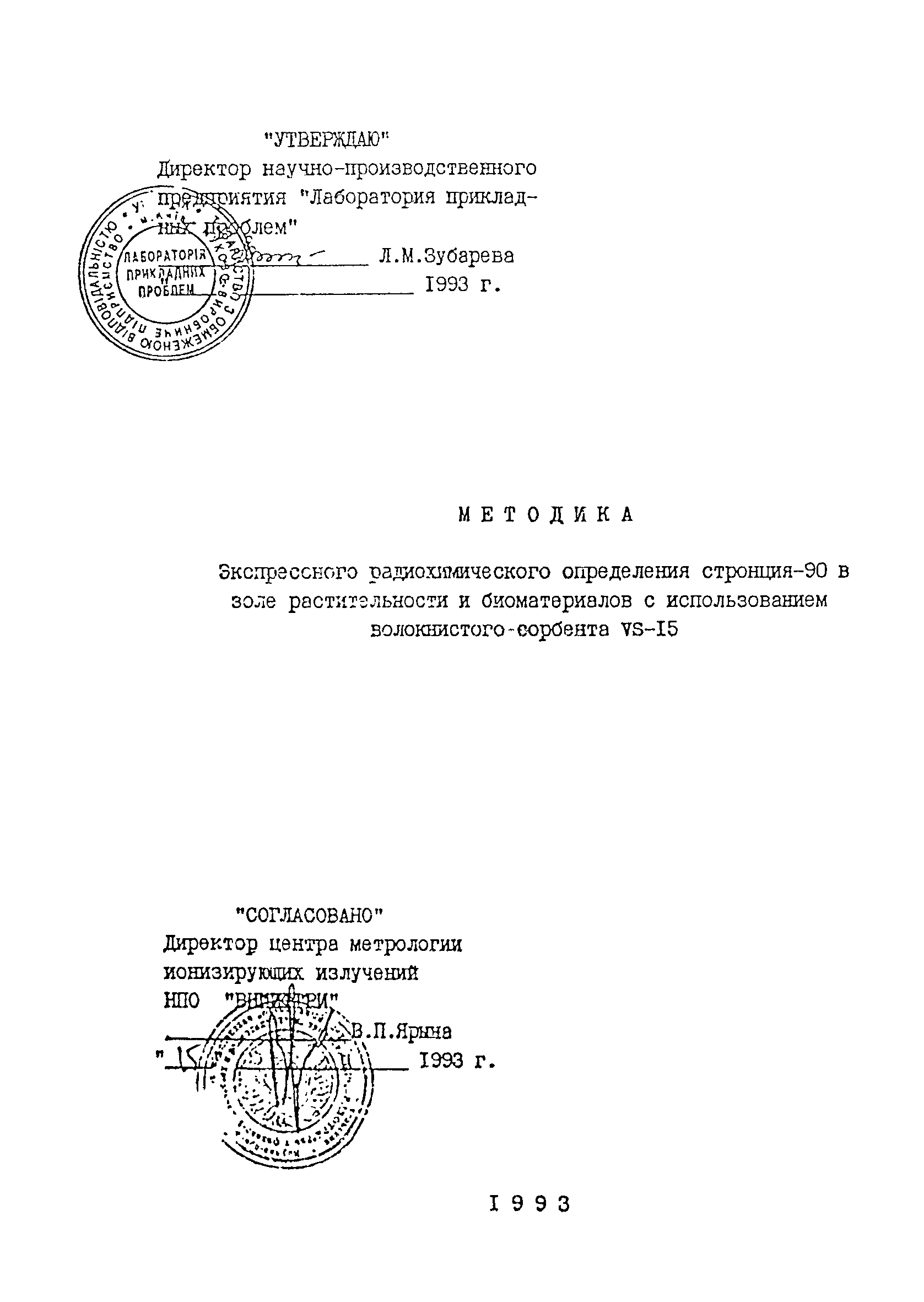 | Название рус.: | Методика экспрессного радиохимического определения стронция-90 в золе растительности и биоматериалов в использованием волокнистого сорбента VS-15 |
