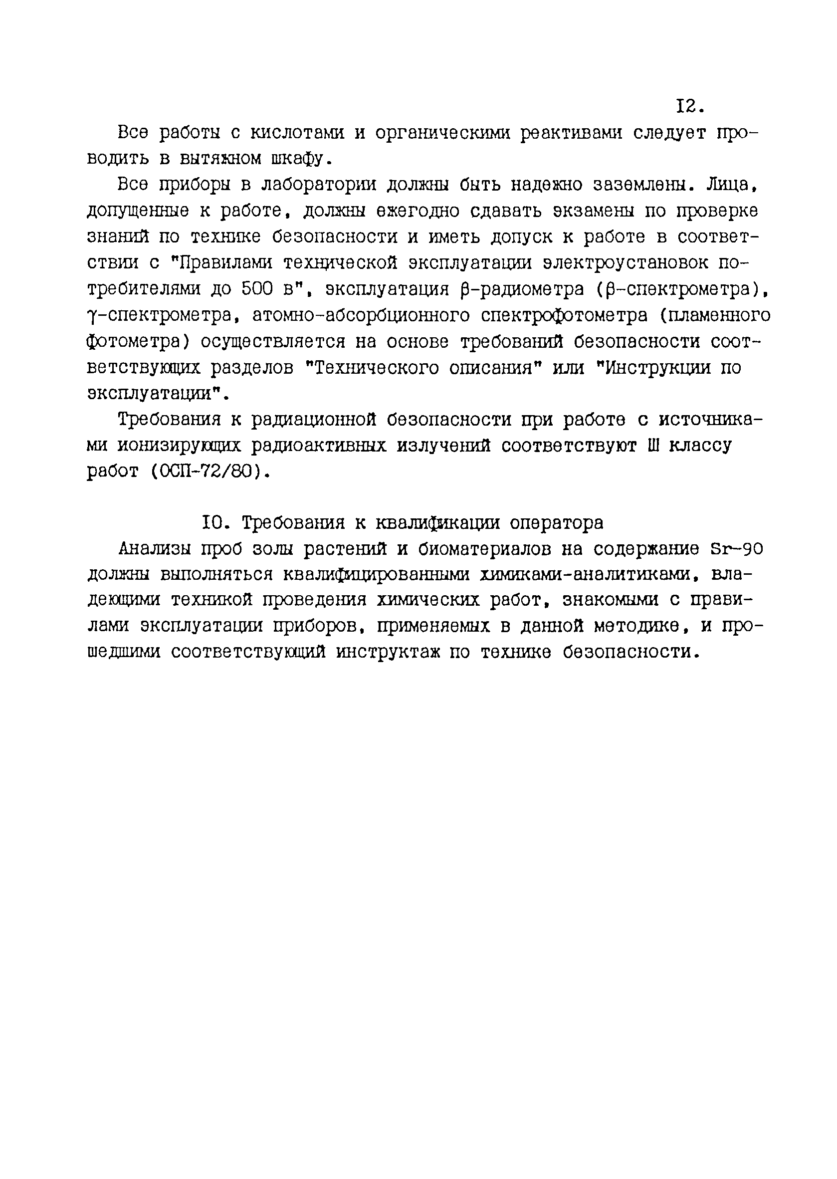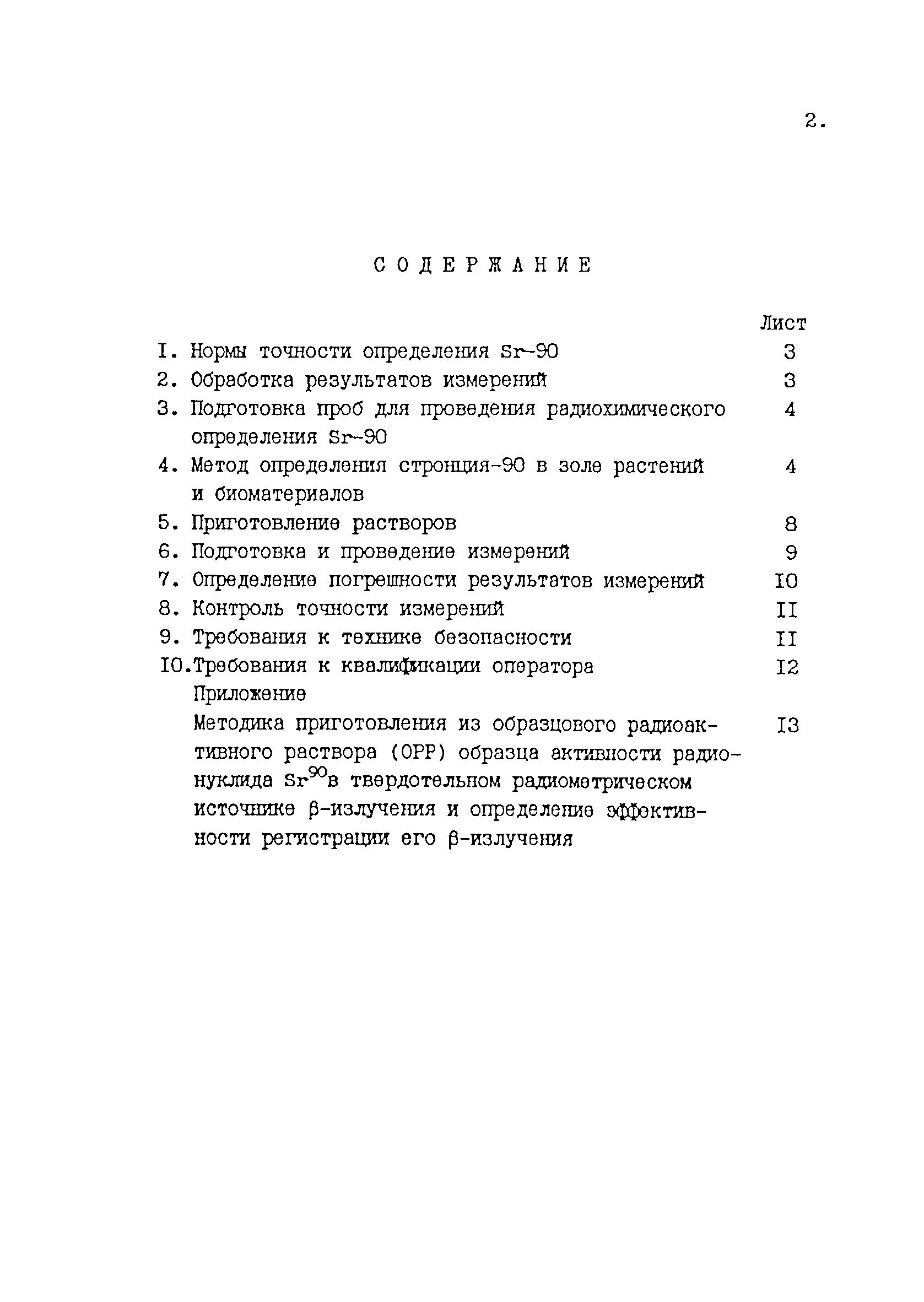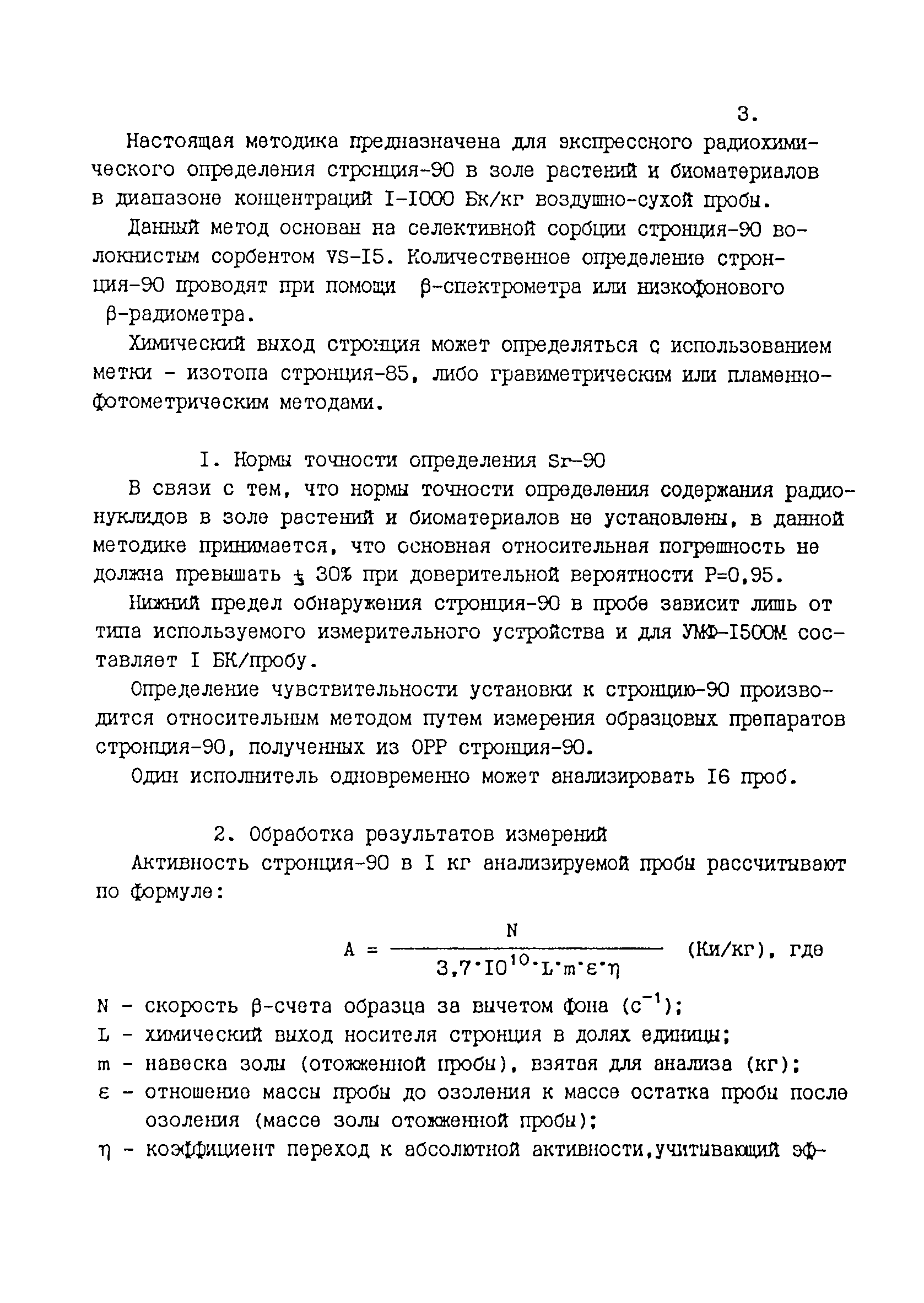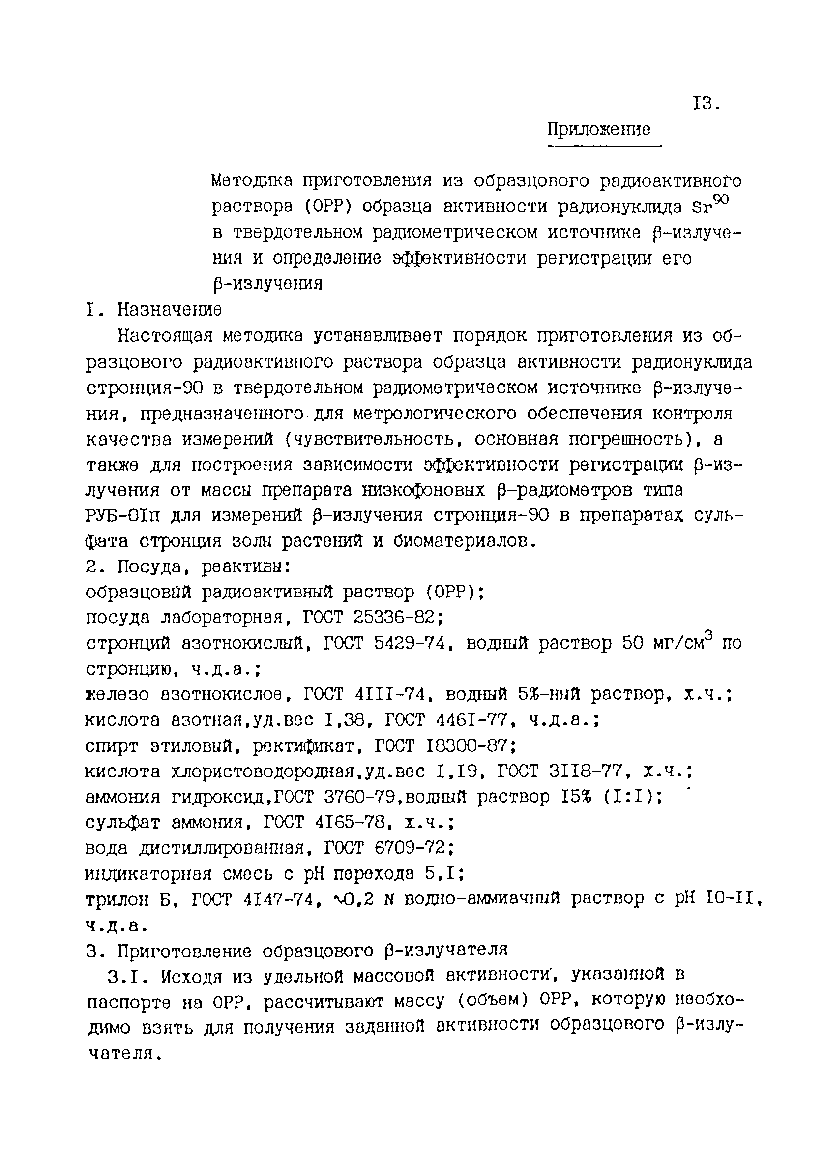 | Оглавление: | 1. Нормы точности определения Sr-90 2. Обработка результатов измерений 3. Подготовка проб для проведения радиохимического определения Sr-90 4. Метод определения стронция-90 в золе растений и биоматериалов 5. Приготовление растворов 6. Подготовка и проведение измерений 7. Определение погрешности результатов измерений 8. Контроль точности измерений 9. Требования к технике безопасности 10. Требования к квалификации оператора Приложение Методика приготовления из образцового радиоактивного раствора (ОРР) образца активности радионуклида Sr90 твердотельном радиометрическом источнике бета-излучения и определение эффективности регистрация его бета-излучения |