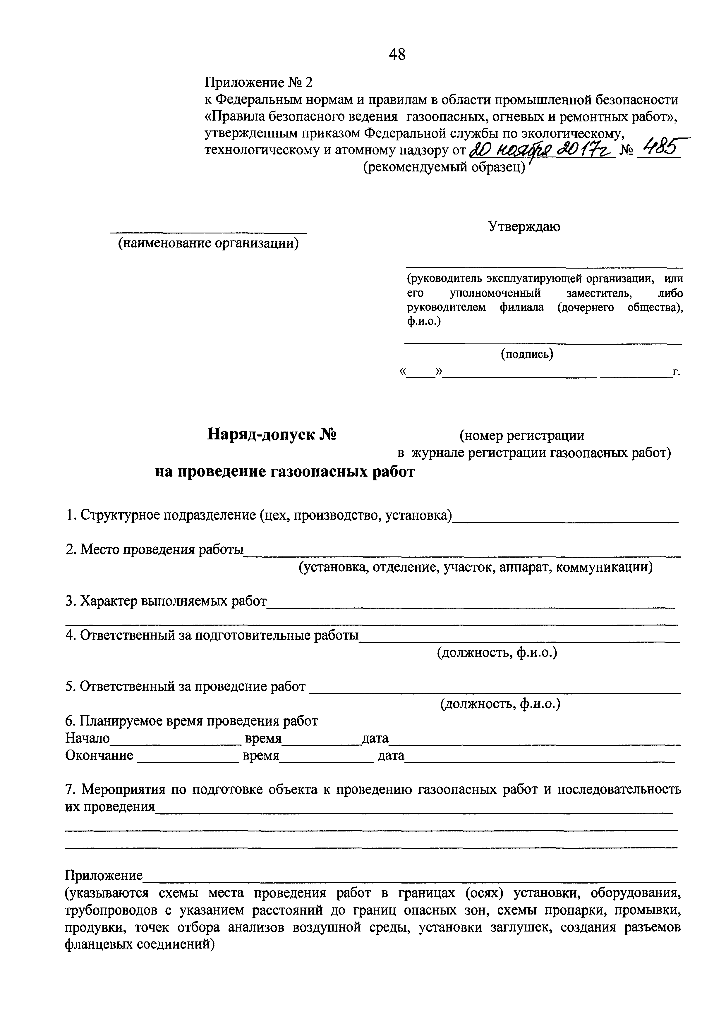 Наряд-допуск на проведение газоопасных работ| Статус: | действует | | Название рус.: | Наряд-допуск на проведение газоопасных работ | | Дата добавления в базу: | 01.01.2019 | | Дата актуализации: | 01.01.2021 | | Дата введения: | 13.06.2018 | | Утверждён: | 20.11.2017 Федеральная служба по экологическому, технологическому и атомному надзору (485)
