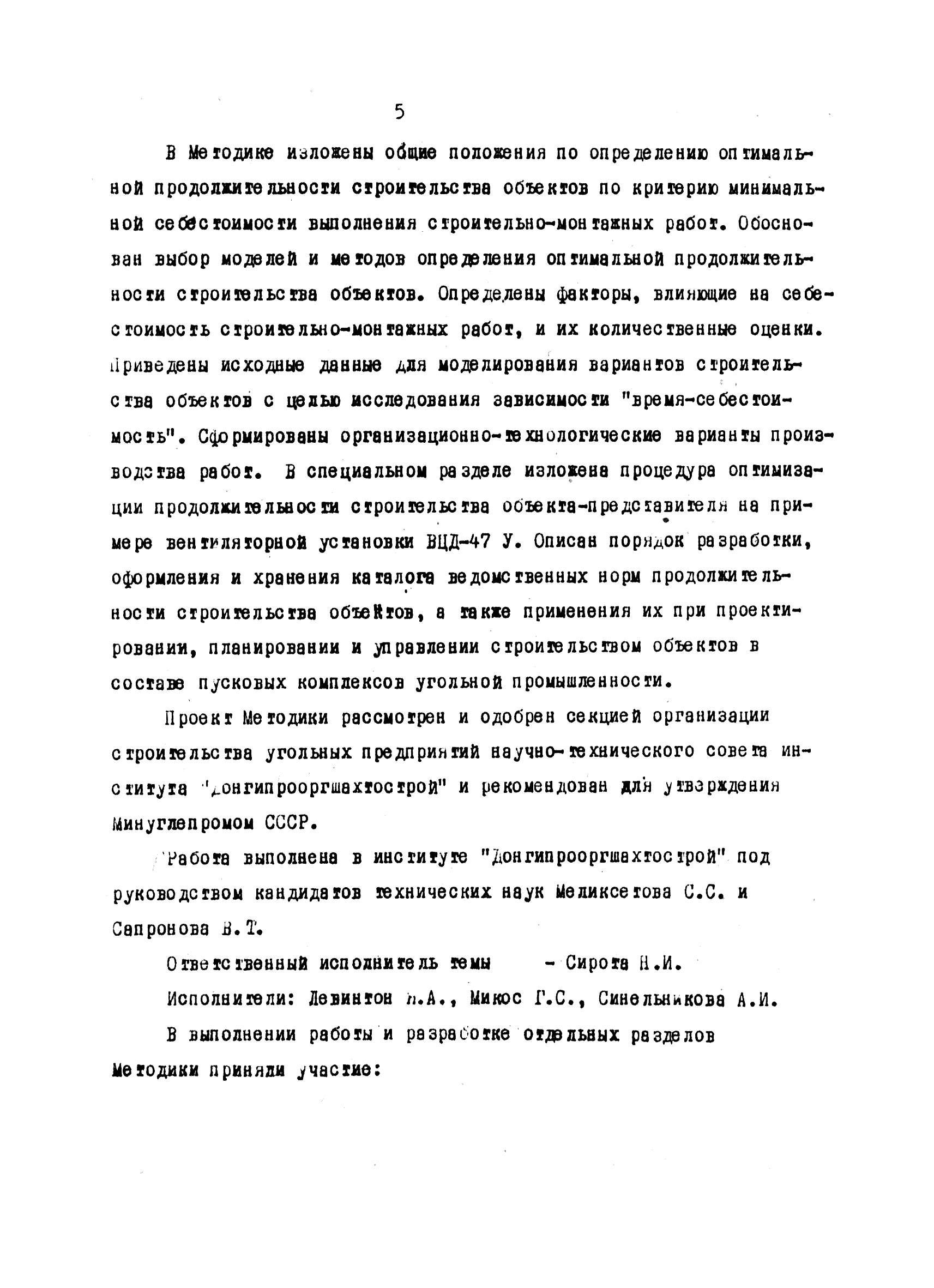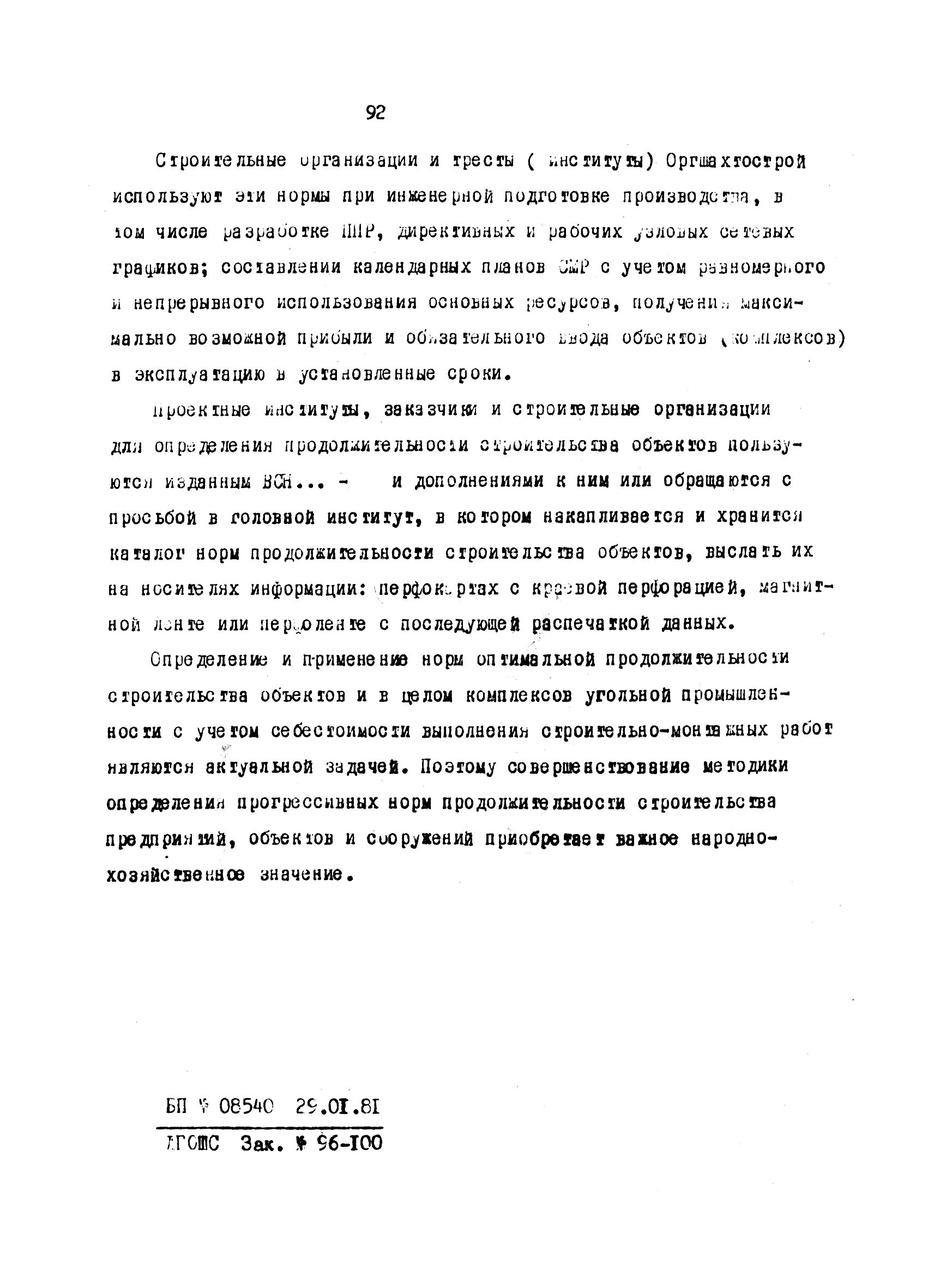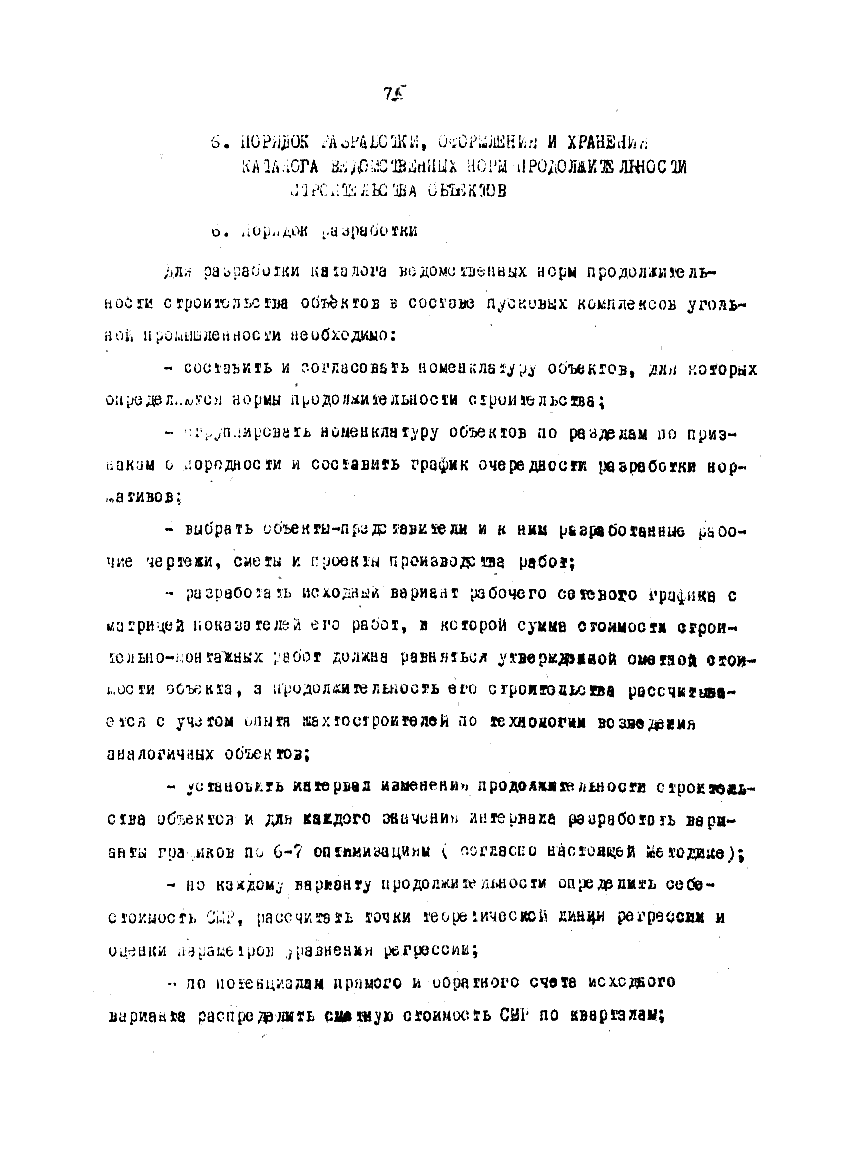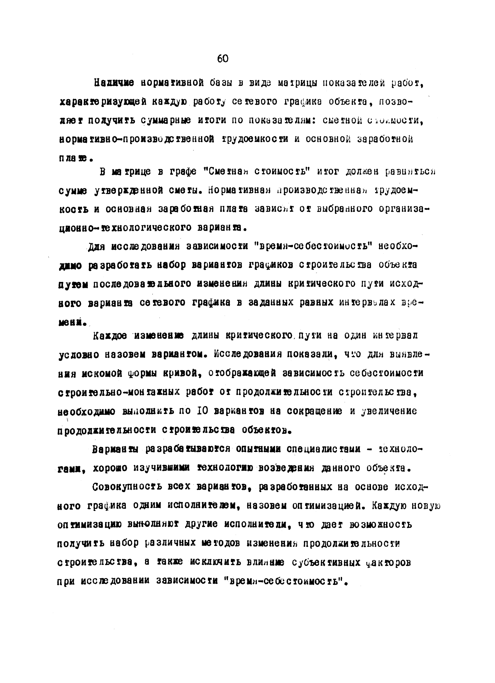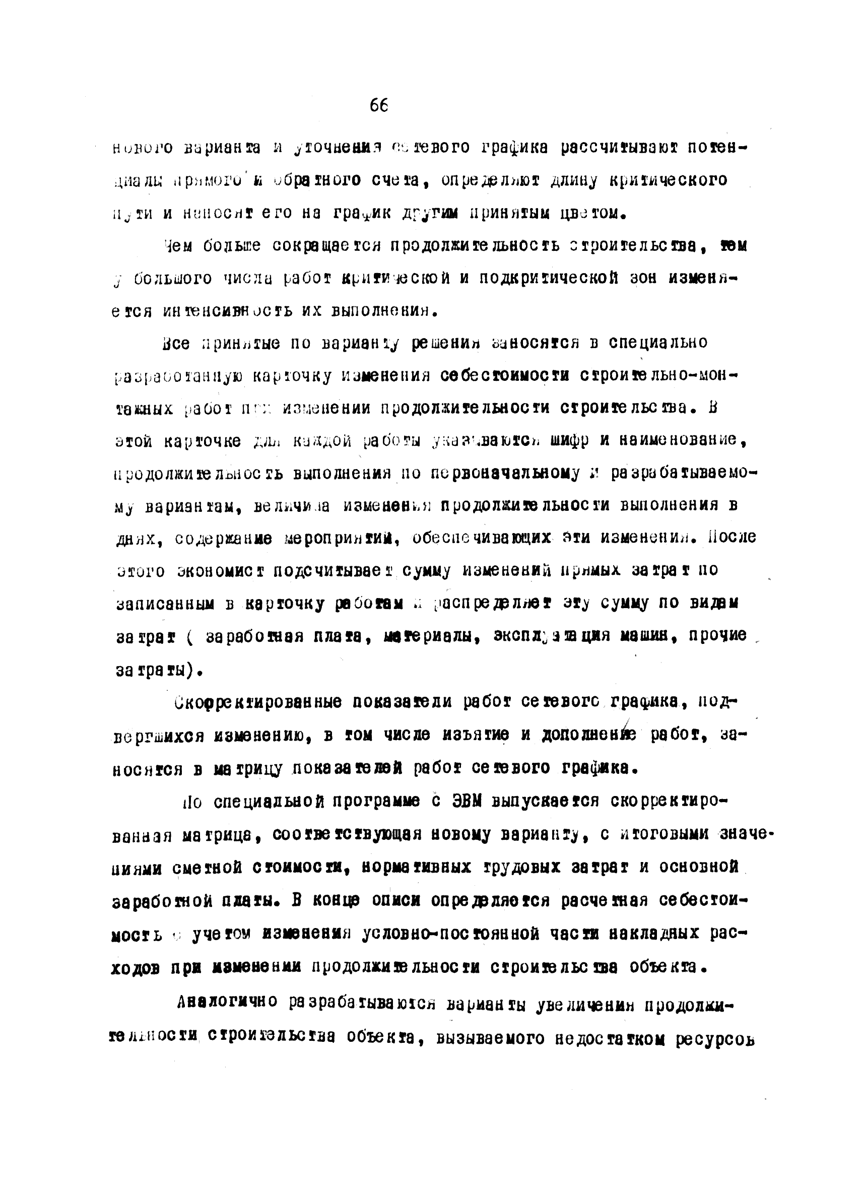 | Оглавление: | Введение 1 Основные положения 2 Анализ факторов, влияющих на себестоимость строительно-монтажных работ 2.1 Определение факторов 2.2 Количественная оценка факторов 3 Модель и исходные данные для исследования зависимости себестоимости строительно-монтажных работ от продолжительности строительства объектов 3.1 Этапы и их модели 3.2 Разработка моделей по этапам 3.3 Нормативная база 3.4 Описание блок-схемы формирования нормативной базы 4 Оптимизация продолжительности строительства объекта по критерию минимальной себестоимости строительно-монтажных работ 4.1 Формирование организационно-технологических вариантов 4.2 Определение изменения себестоимости строительства по вариантам 4.3 Процедура составления (разработки) вариантов 5 Математическое обеспечение расчетов на ЭВМ 5.1 Специальный пакет программ 5.2 Стандартный пакет программ 5.3 Краткая характеристика метода определения функциональной зависимости 6 Порядок разработки, оформления и хранения каталога ведомственных норм продолжительности строительства объектов 6.1 Порядок разработки 6.2 Оформление каталога 6.3 Хранение каталога 7 Порядок применения норм продолжительности строительства объектов в составе пусковых комплексов угольной промышленности |